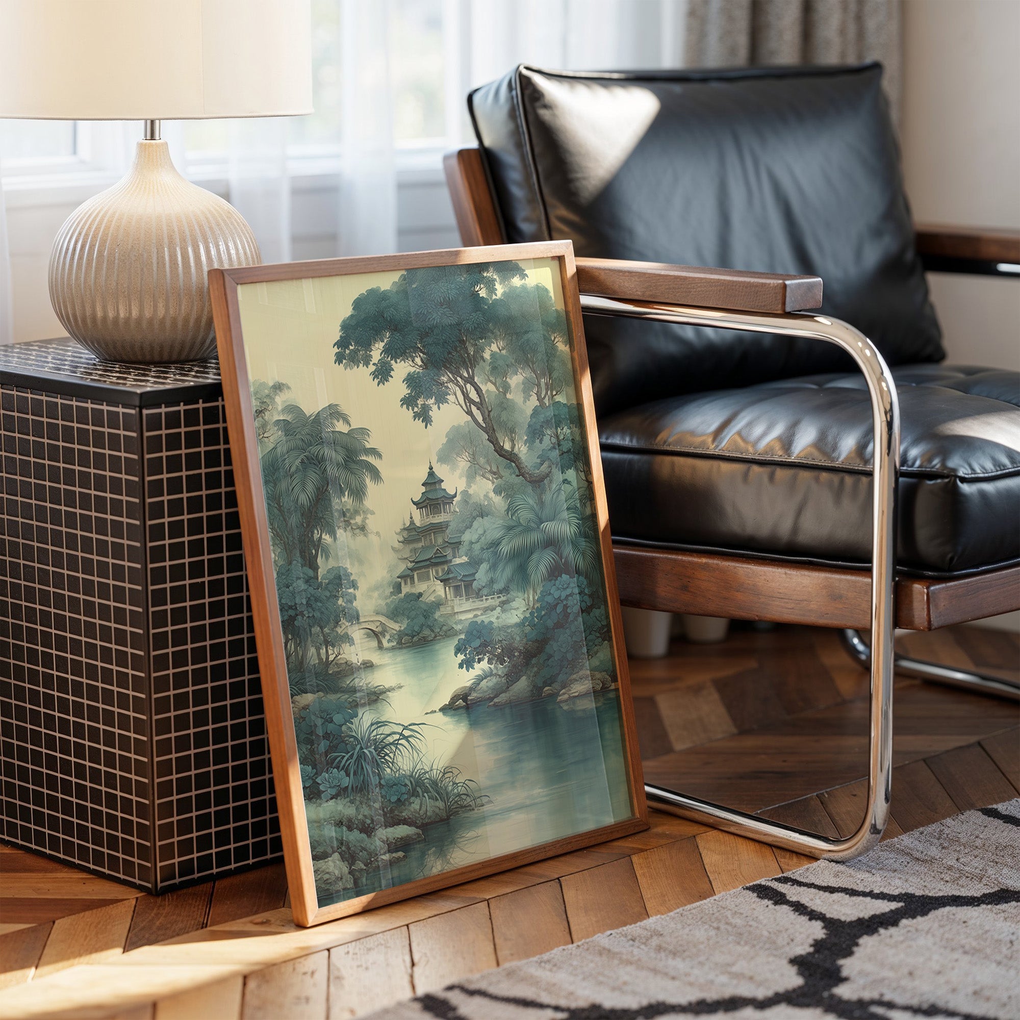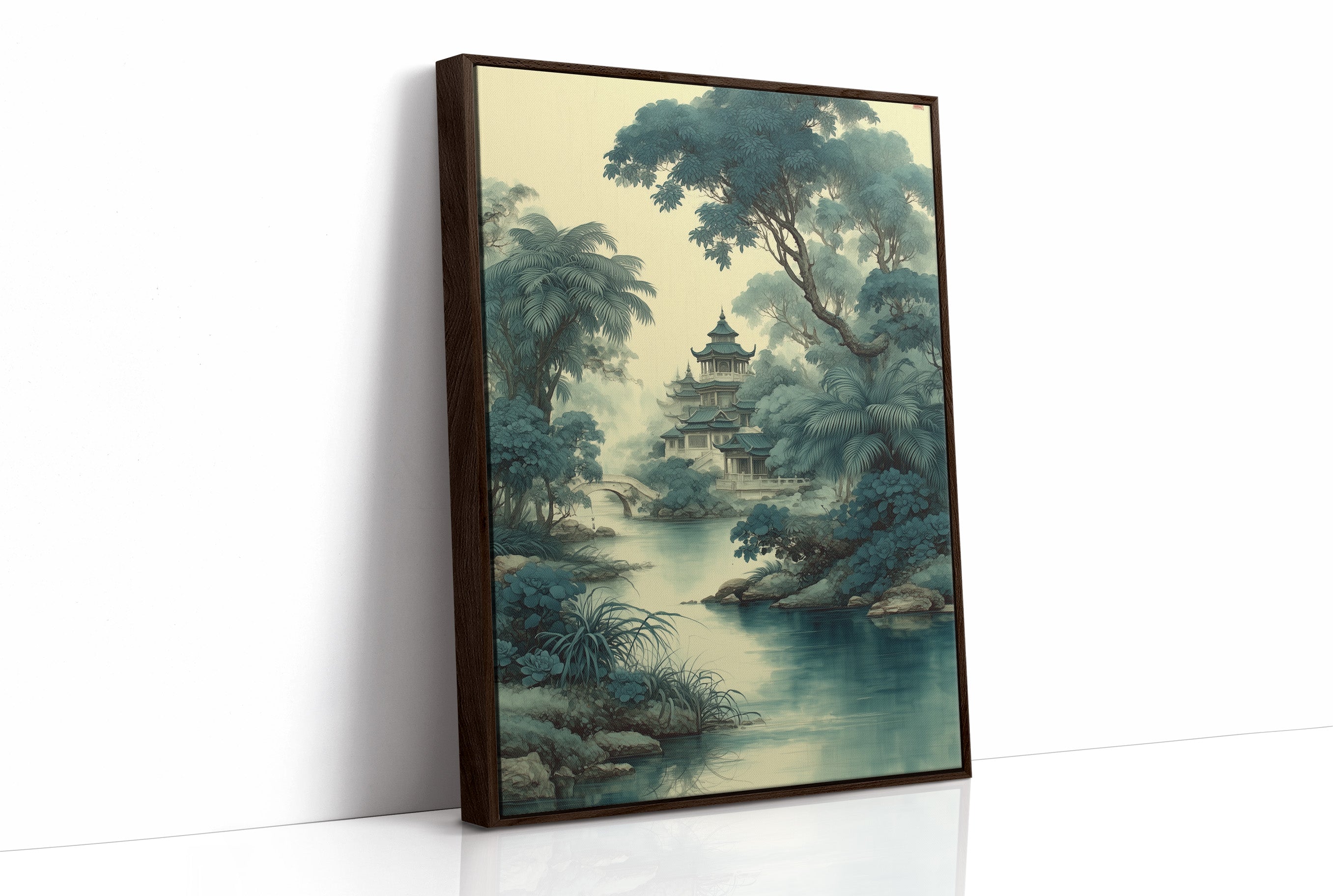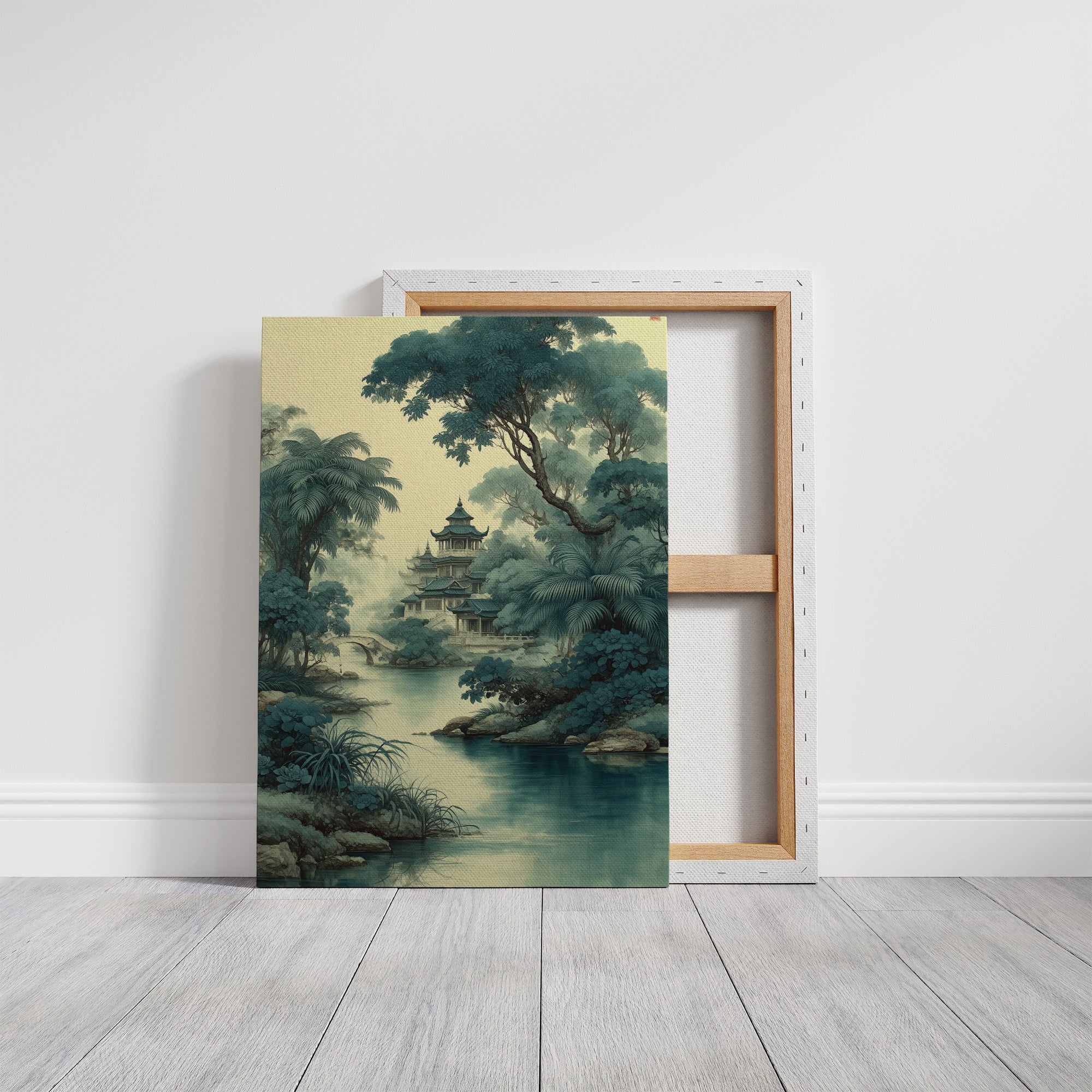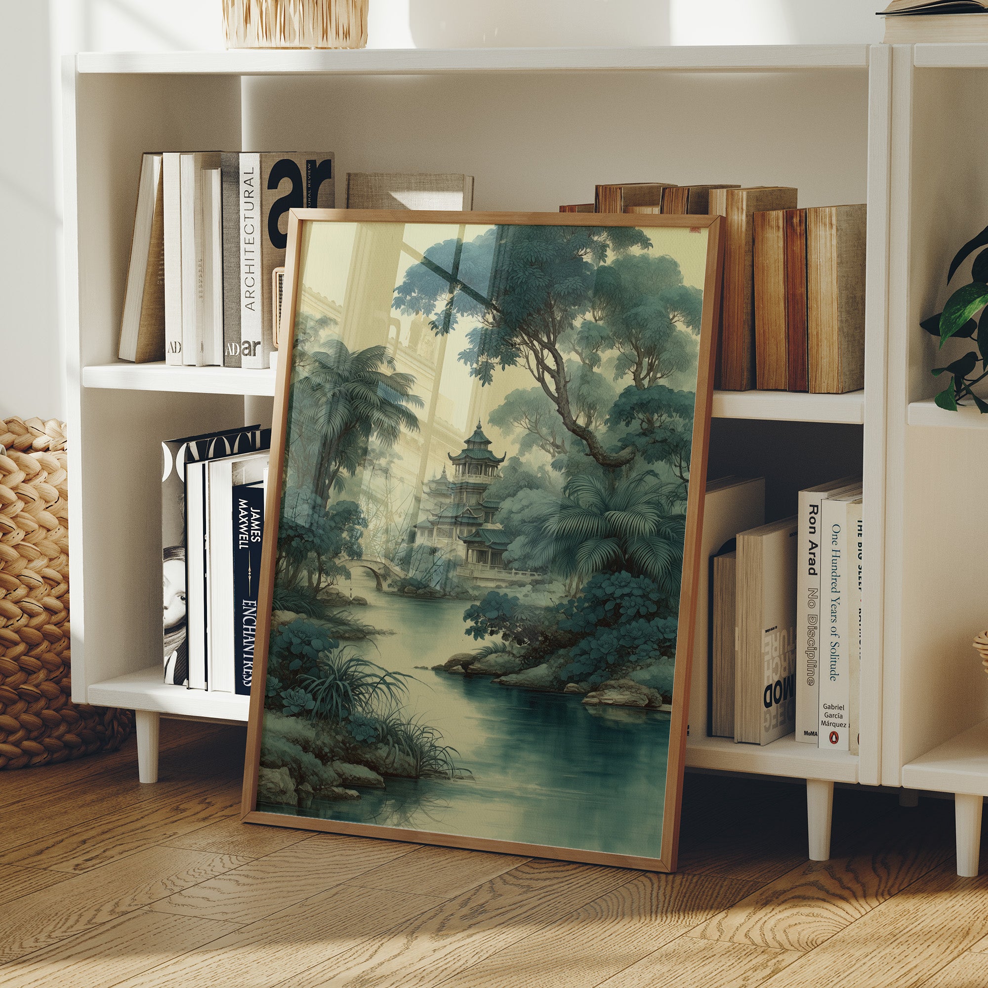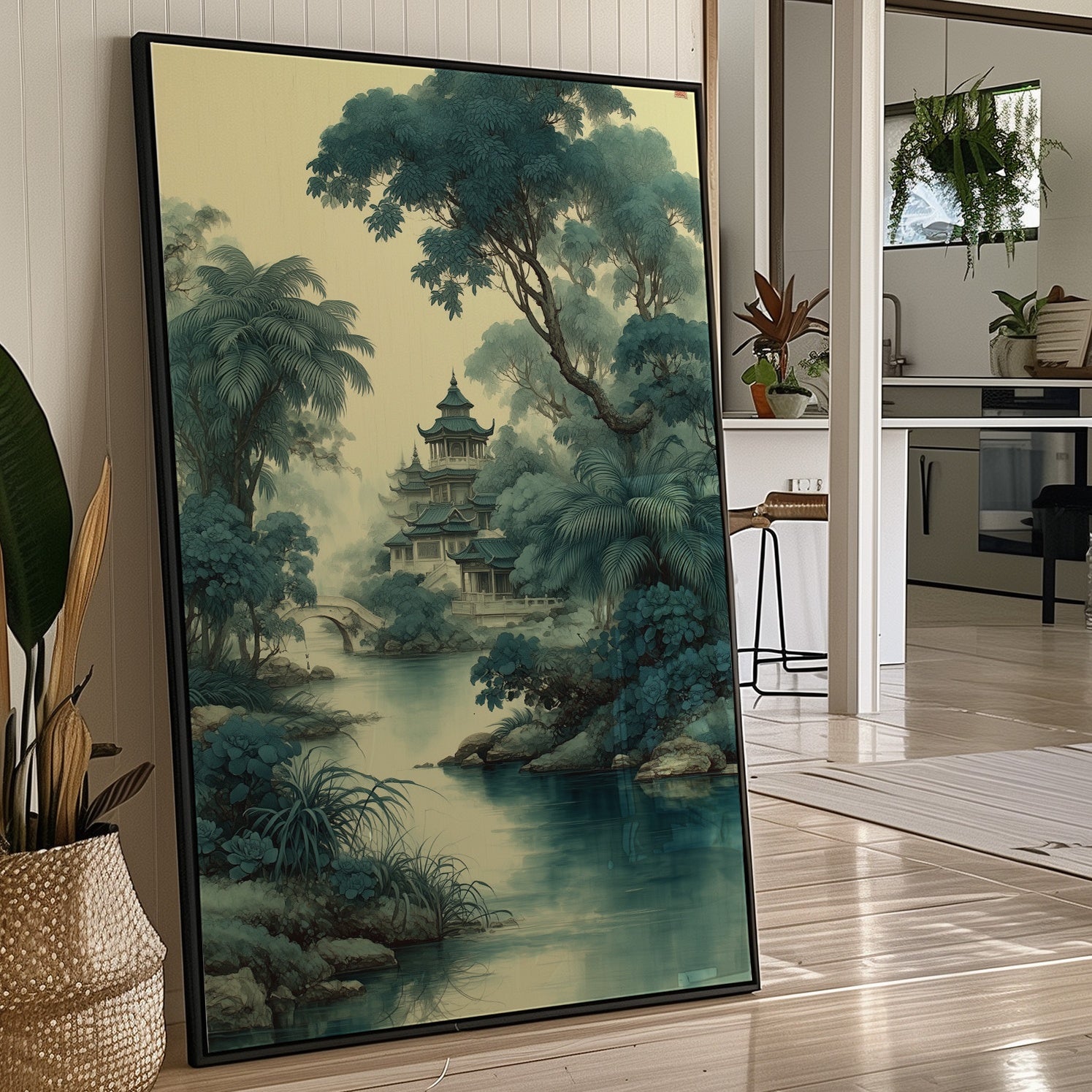Mist clings to emerald branches as a tranquil river winds through a mystical Asian landscape. Deep teal foliage frames an ornate pagoda, its tiered architecture rising gracefully against a soft golden sky. The composition balances lush tropical elements with serene waters, creating a harmonious scene where nature and human craftsmanship exist in perfect equilibrium. This piece brings contemplative serenity to any room, particularly suited for a reading nook or meditation space where its peaceful energy can be fully appreciated.