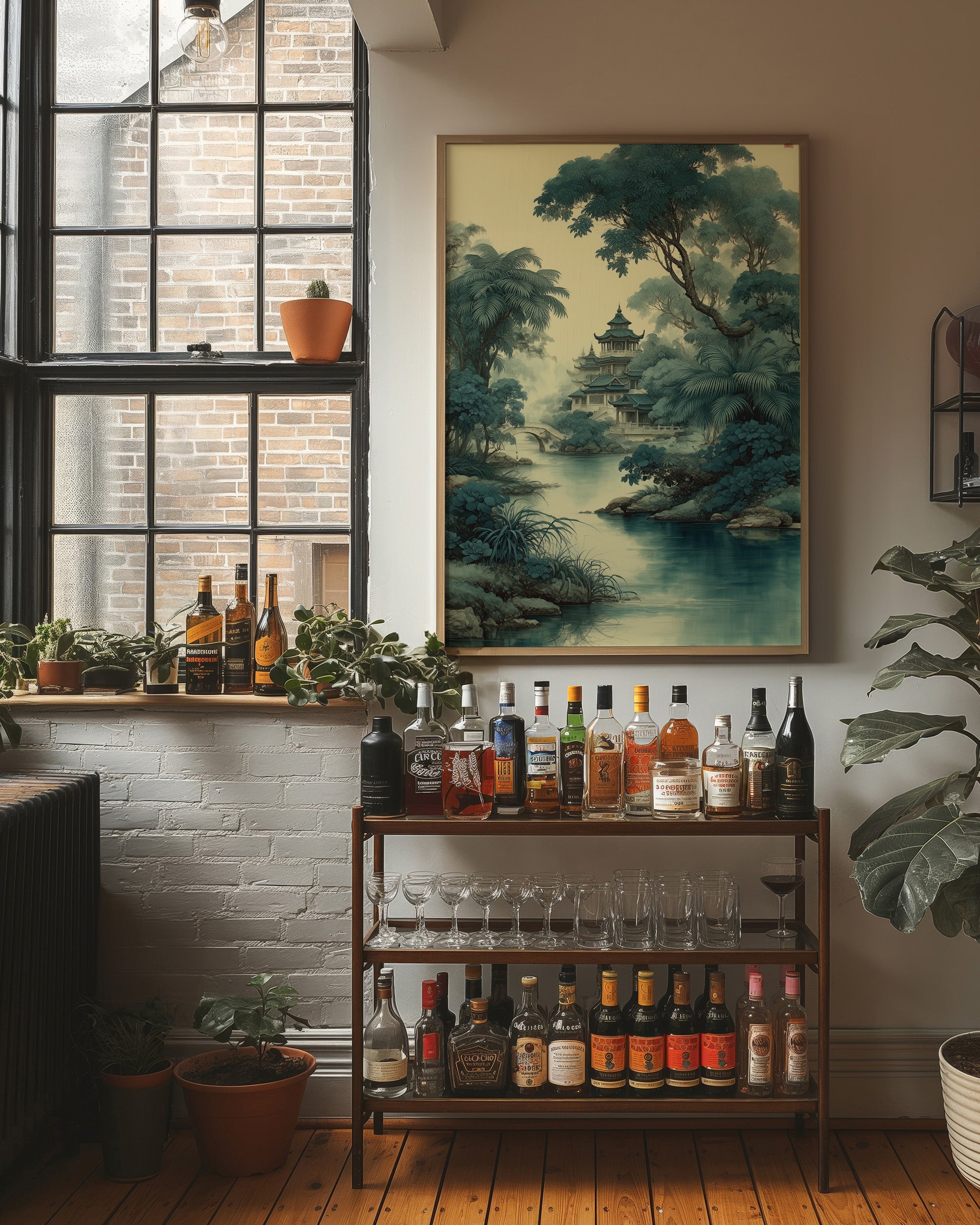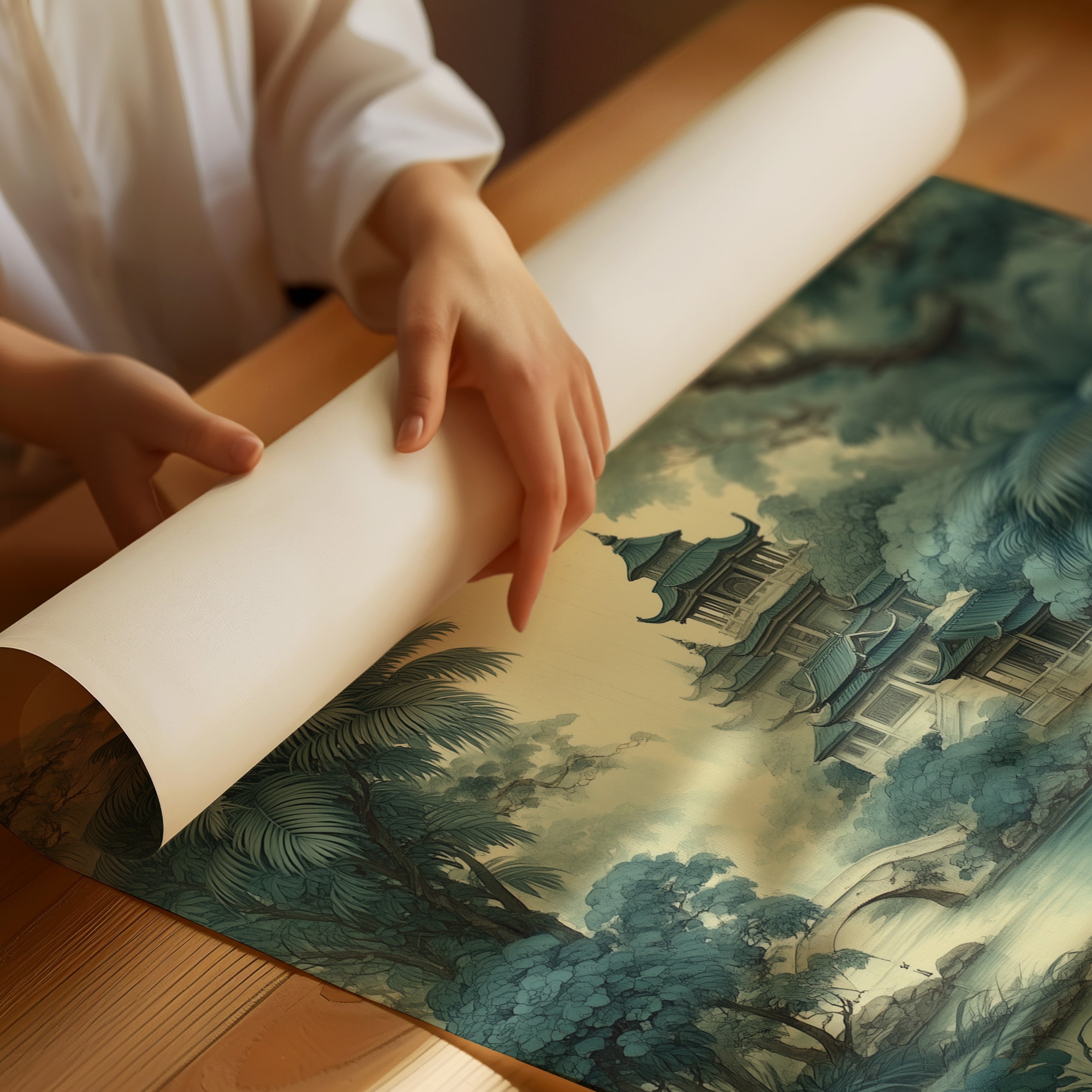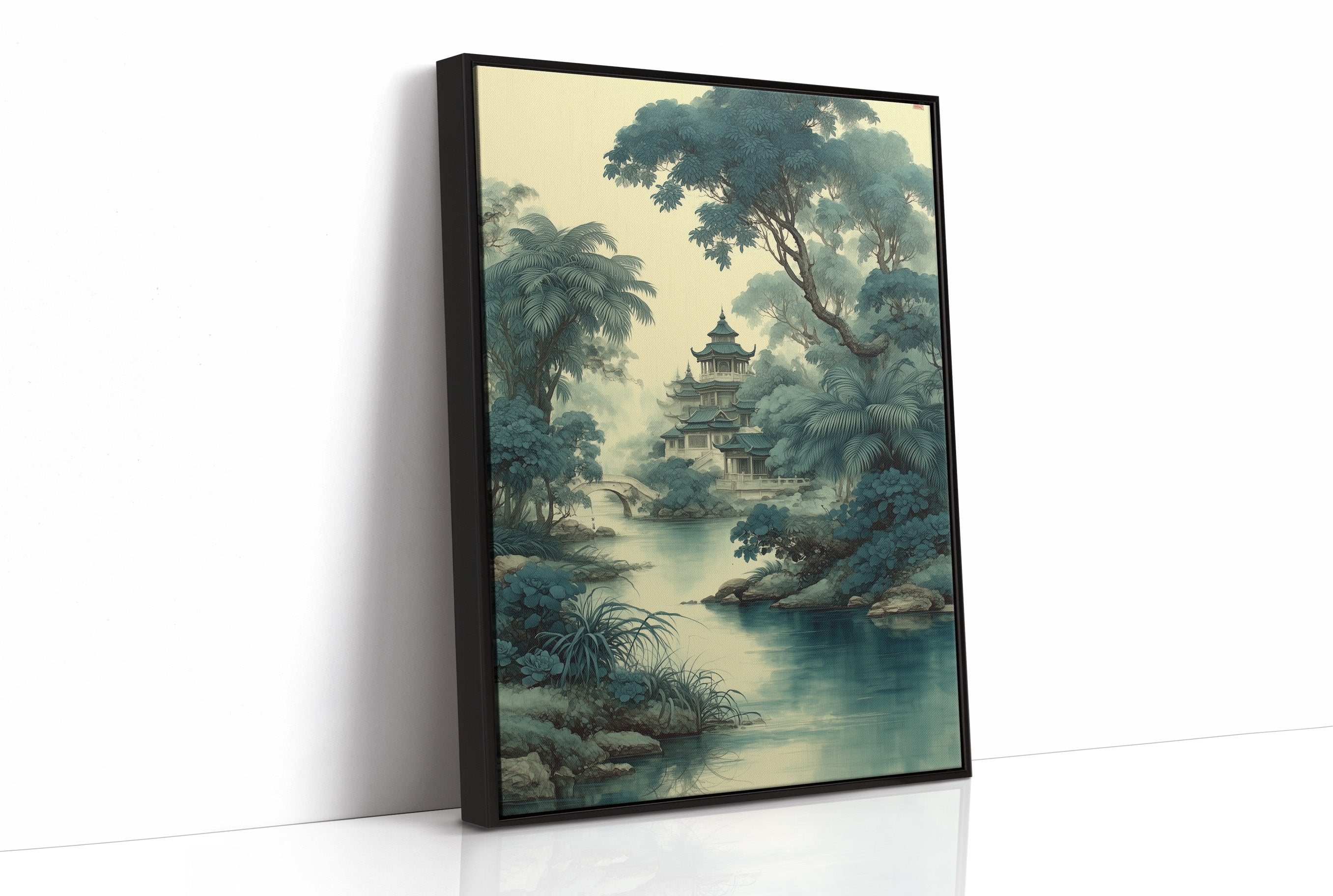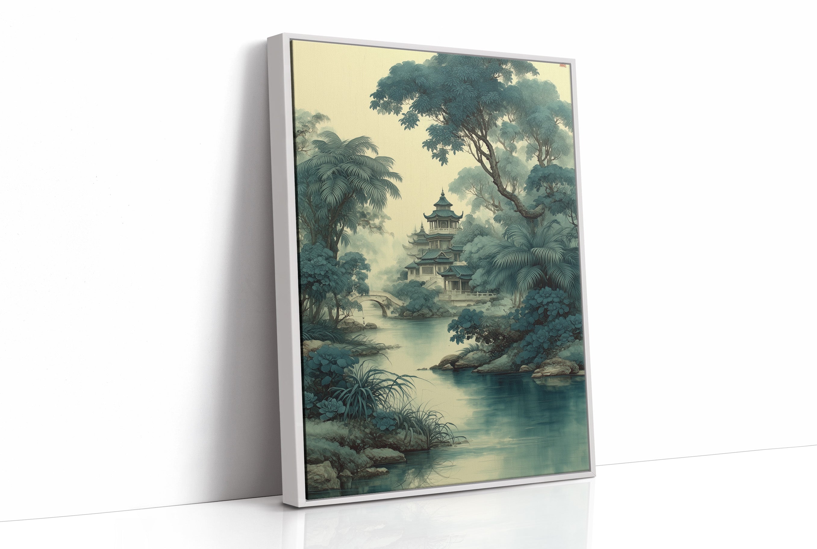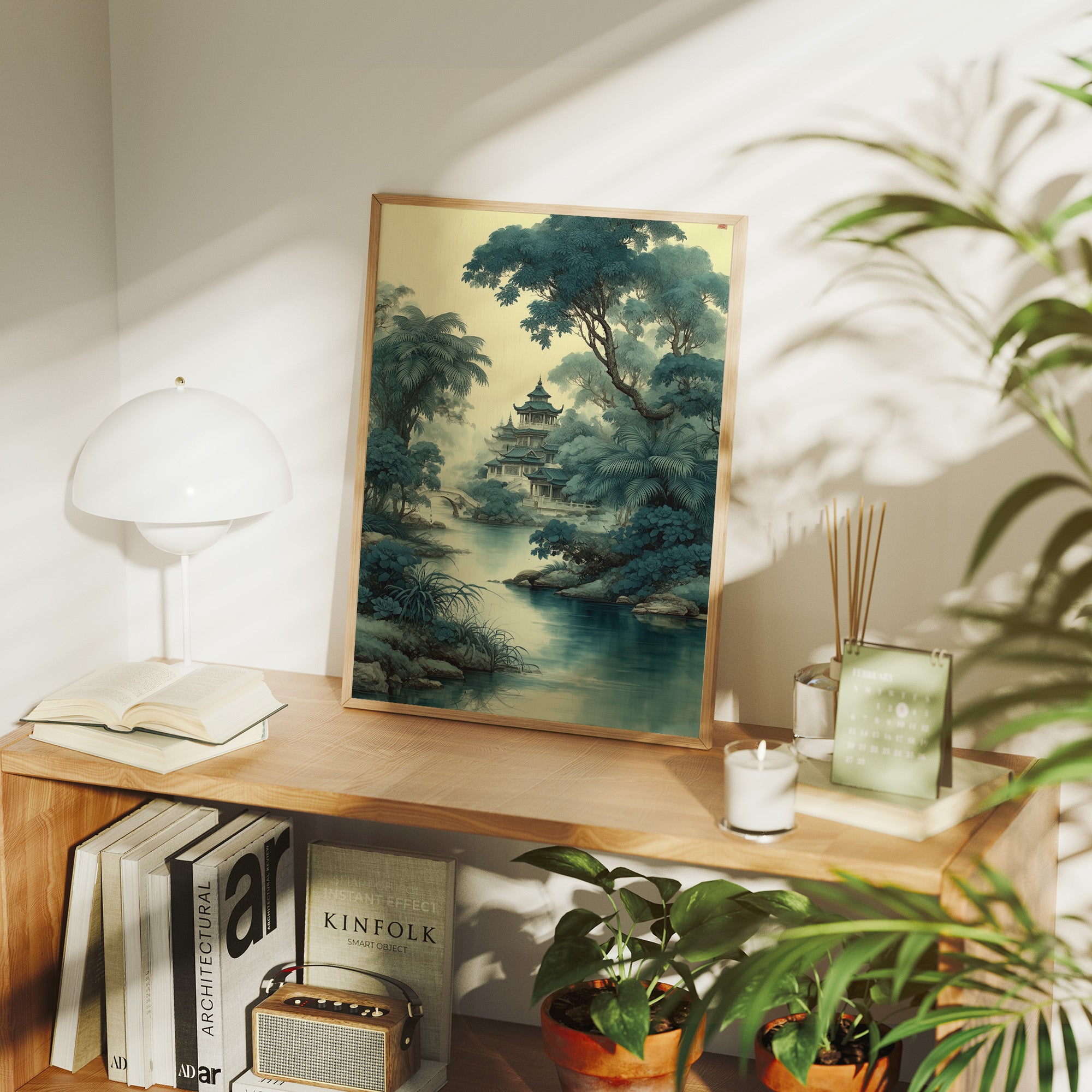 Mist clings to emerald branches as a tranquil river winds through a mystical Asian landscape. Deep teal foliage frames an ornate pagoda, its tiered architecture rising gracefully against a soft golden sky. The composition balances lush tropical elements with serene waters, creating a harmonious scene where nature and human craftsmanship exist in perfect equilibrium. This piece brings contemplative serenity to any room, particularly suited for a reading nook or meditation space where its peaceful energy can be fully appreciated.