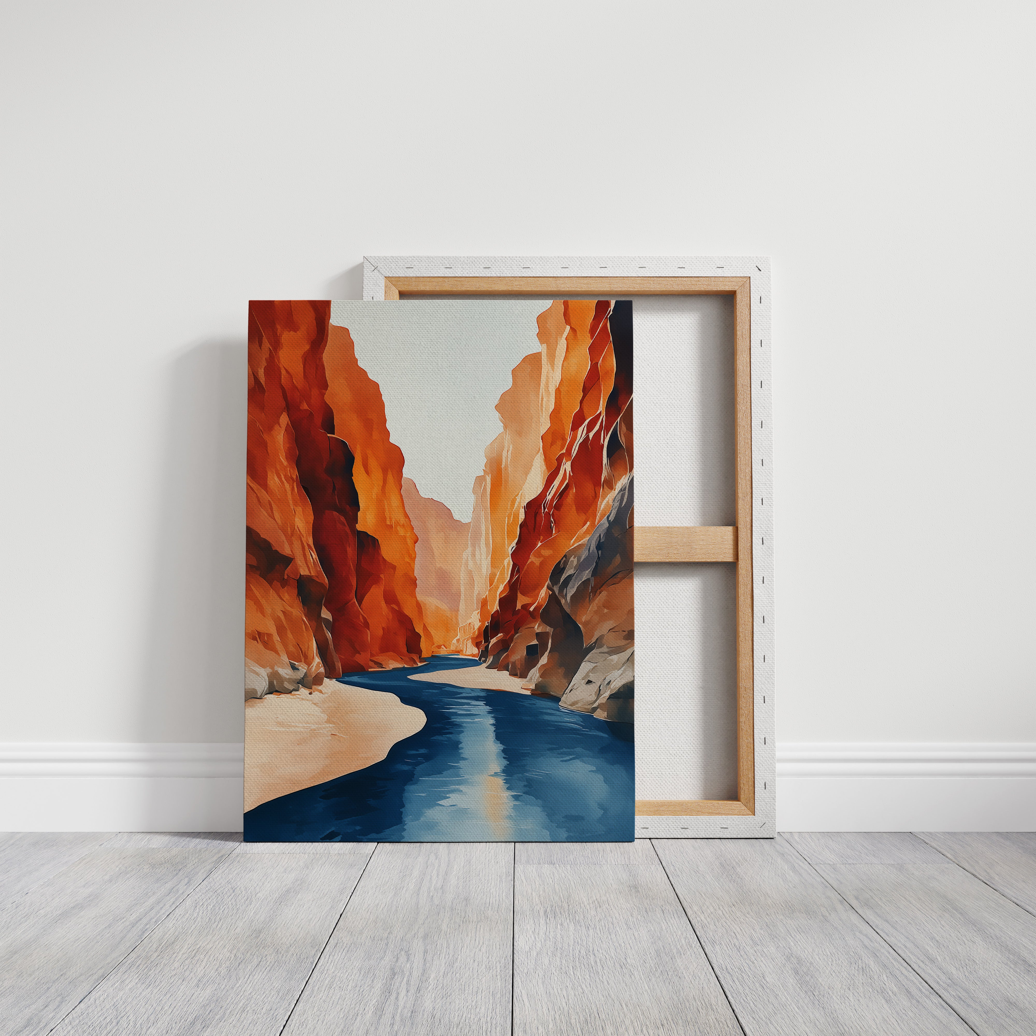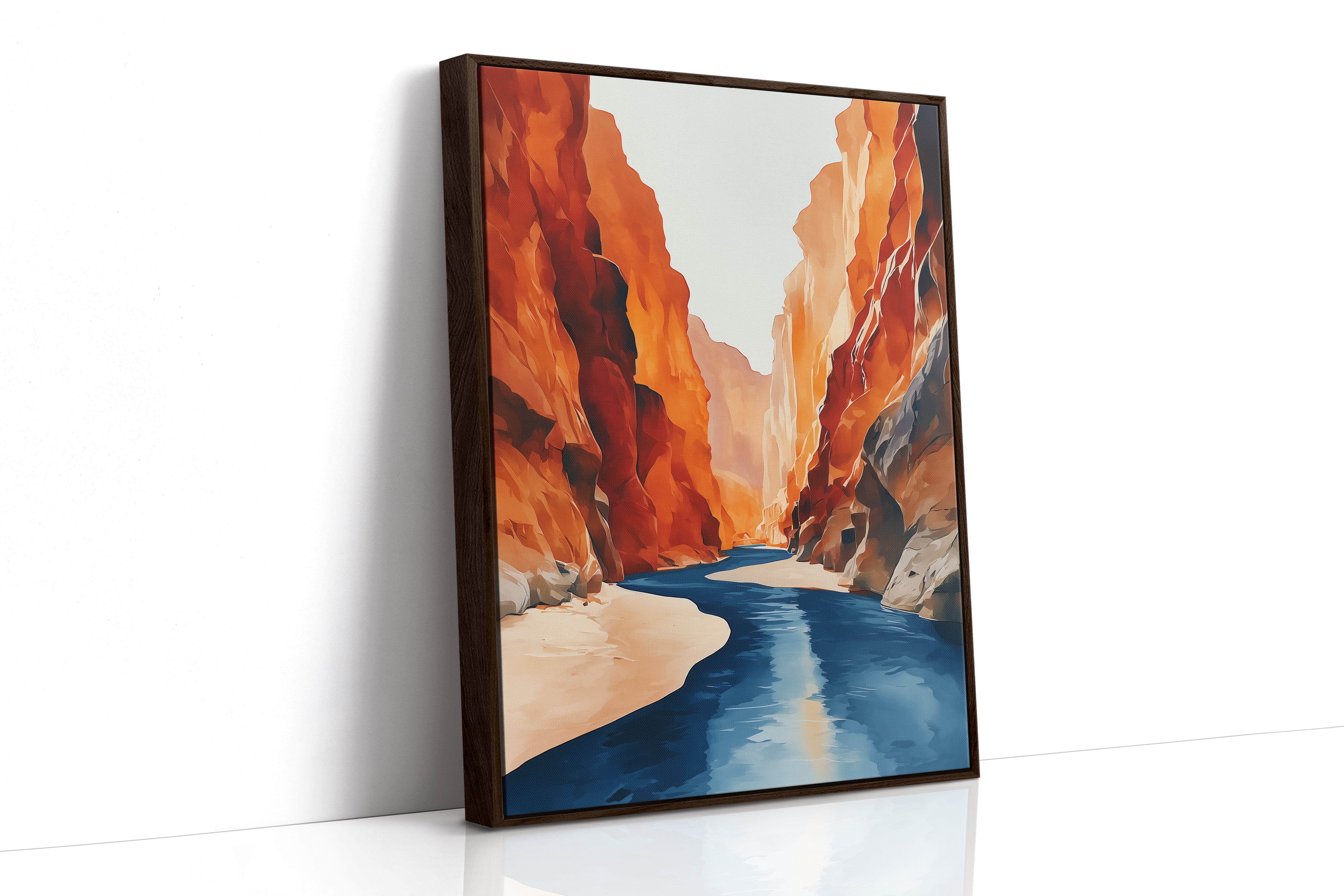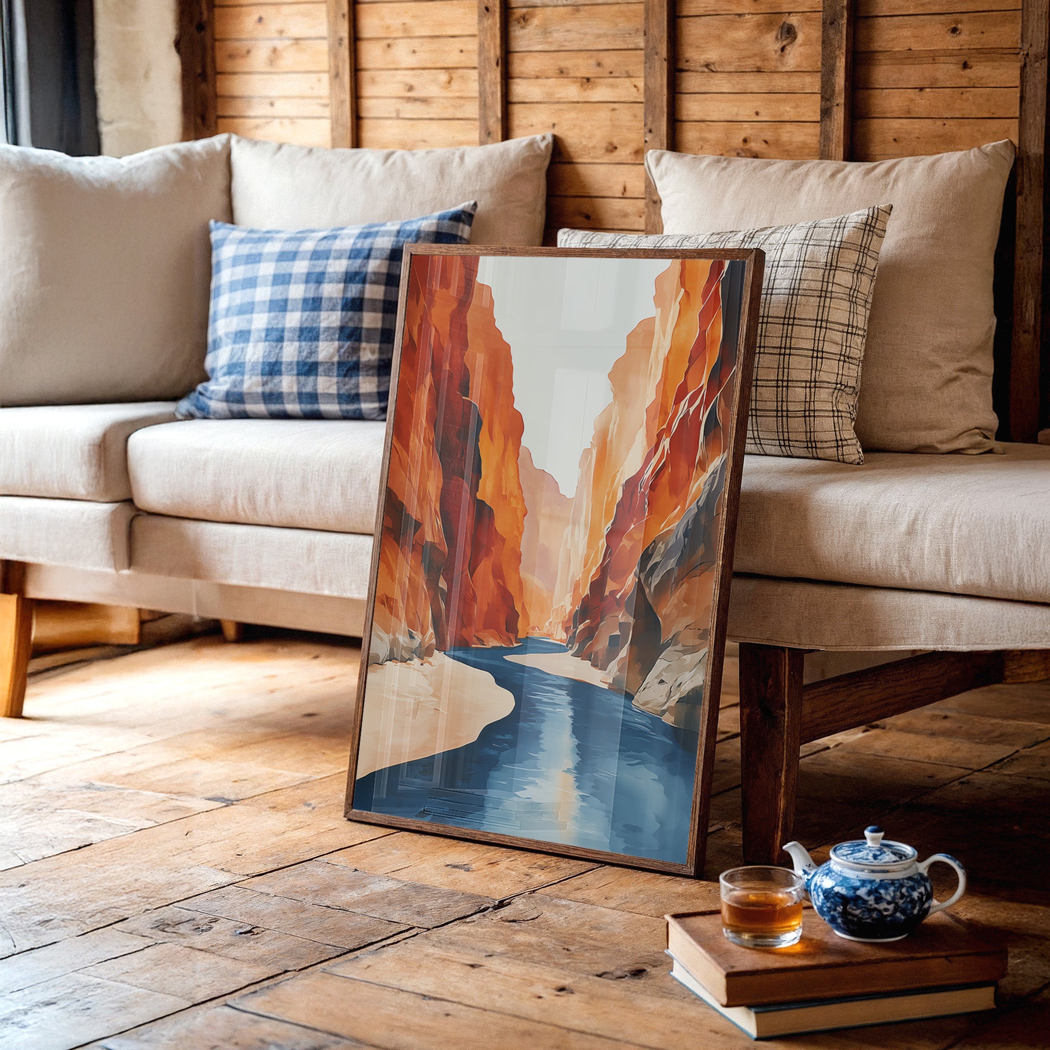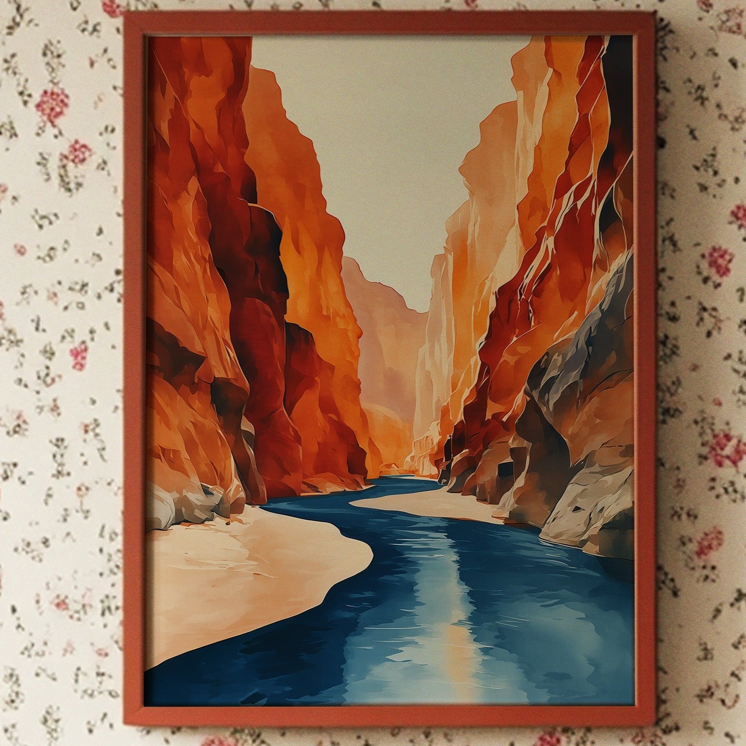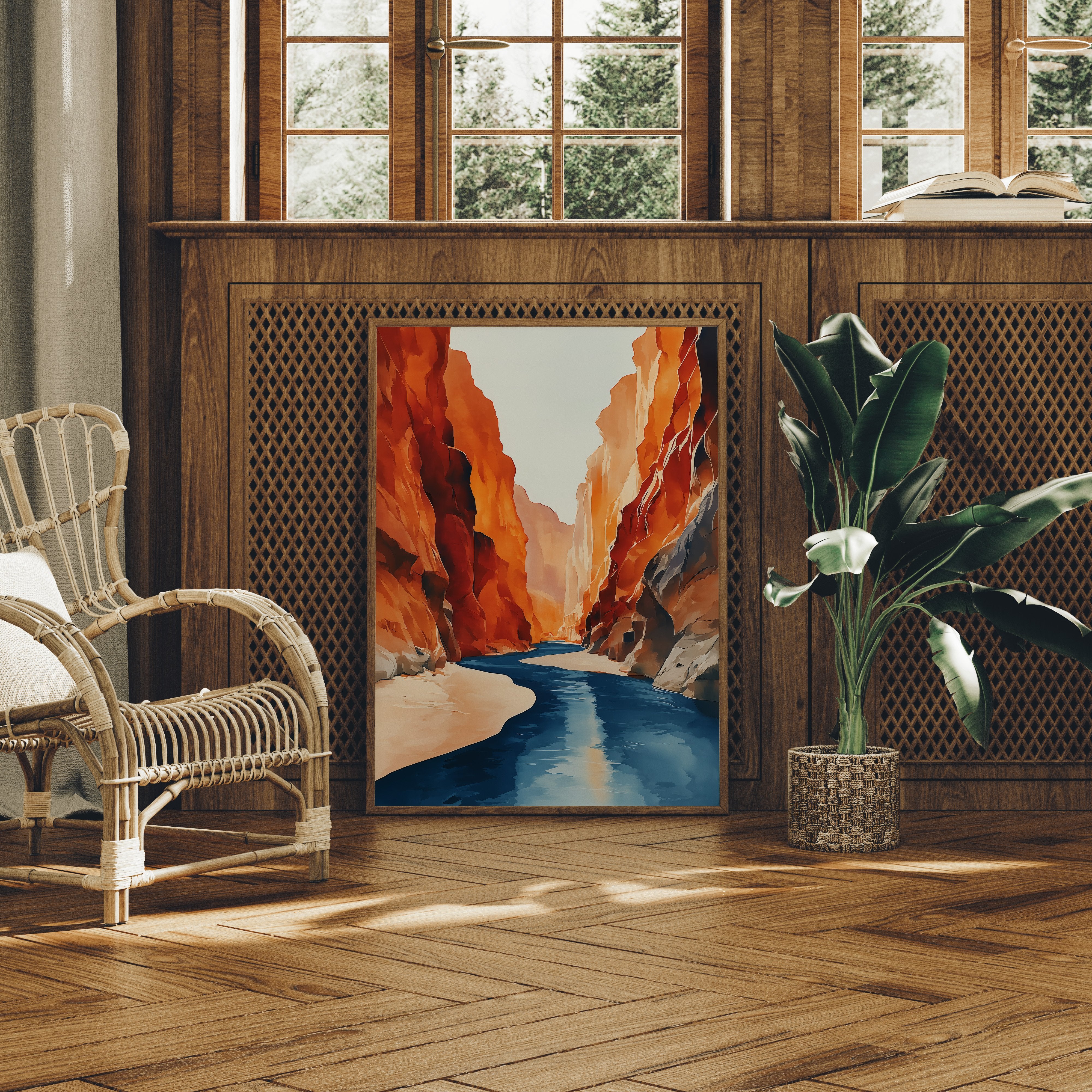 Time stands still where sapphire waters curve through towering walls of burnt orange sandstone. This striking piece from our Contemporary collection captures nature's most dramatic architecture. Smooth river bends contrast against rugged canyon walls, creating a mesmerizing dance of light and shadow. Deep blues mirror the sky above while warm desert tones tell stories of geological epochs past. Perfect for spaces that yearn for bold statement pieces, from modern living rooms to meditation spaces. Each viewing reveals new details in the intricate interplay of water and stone.