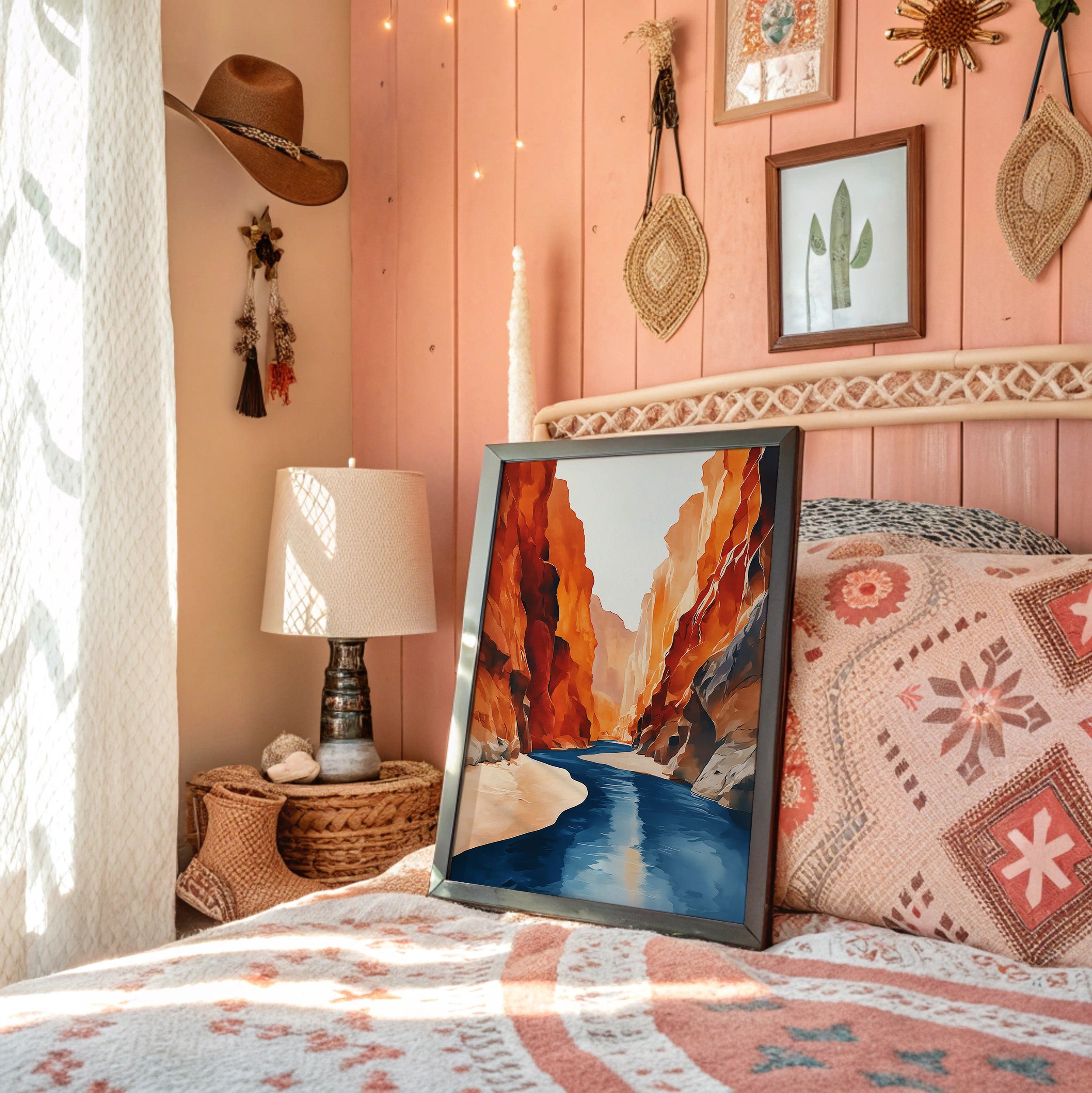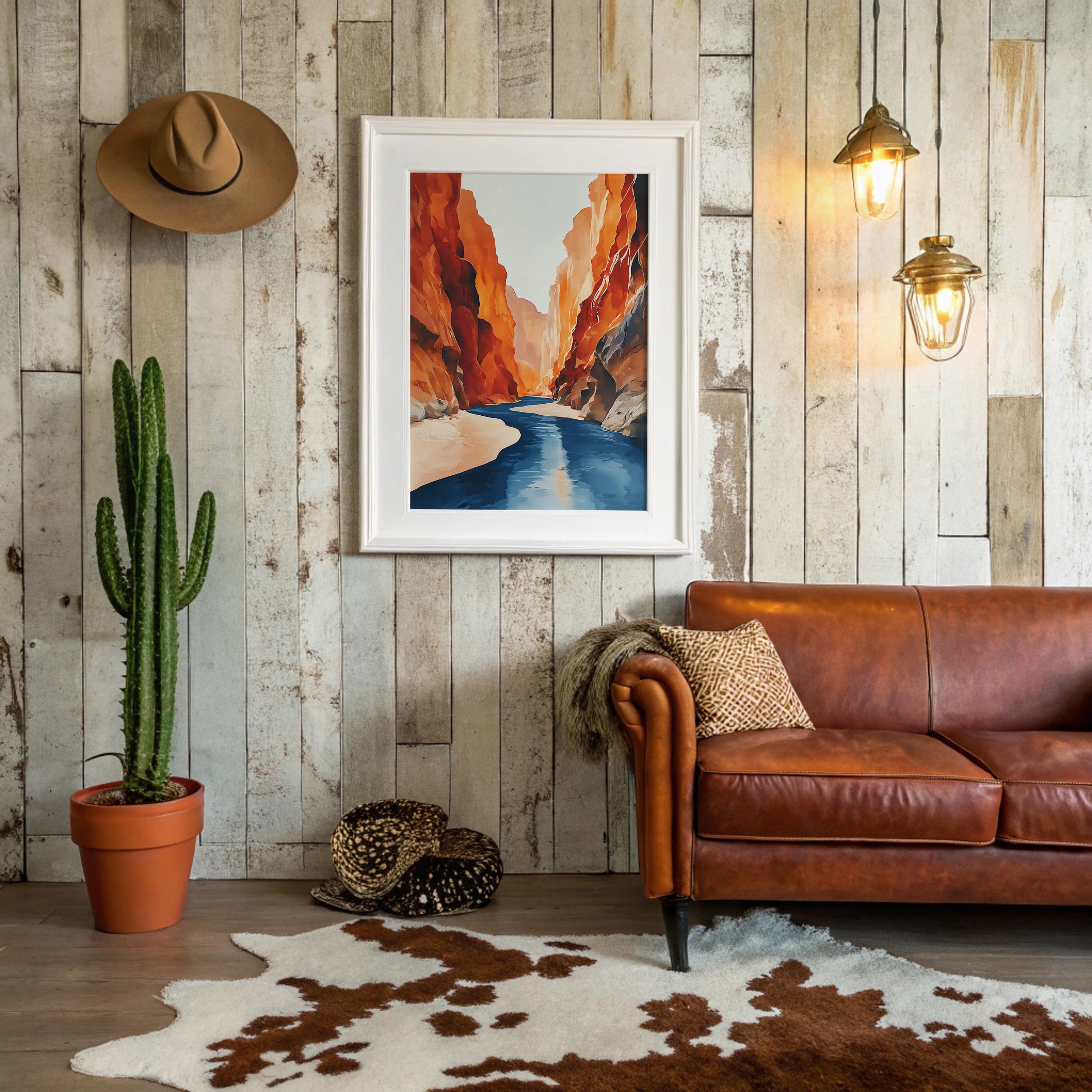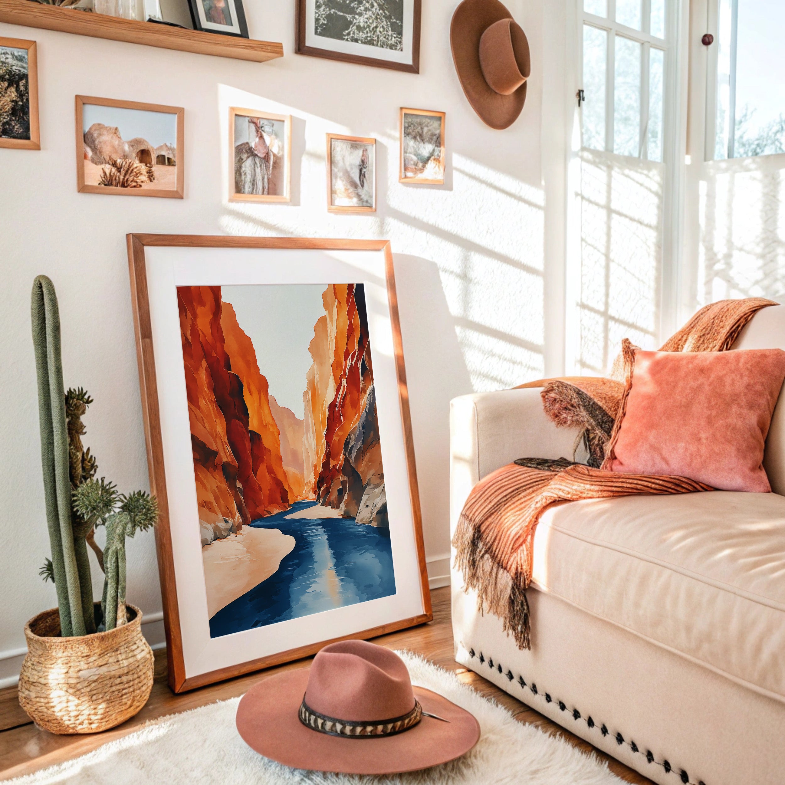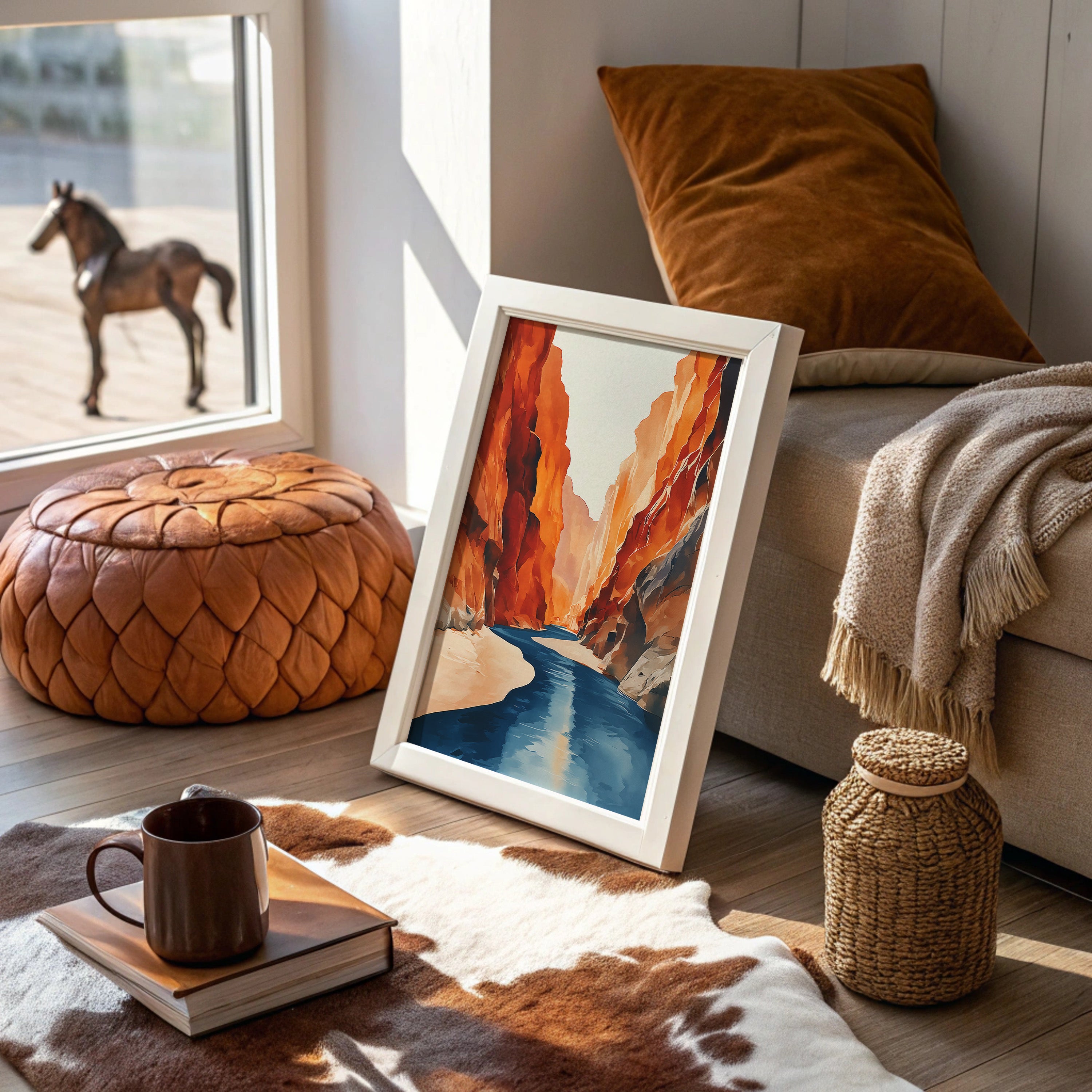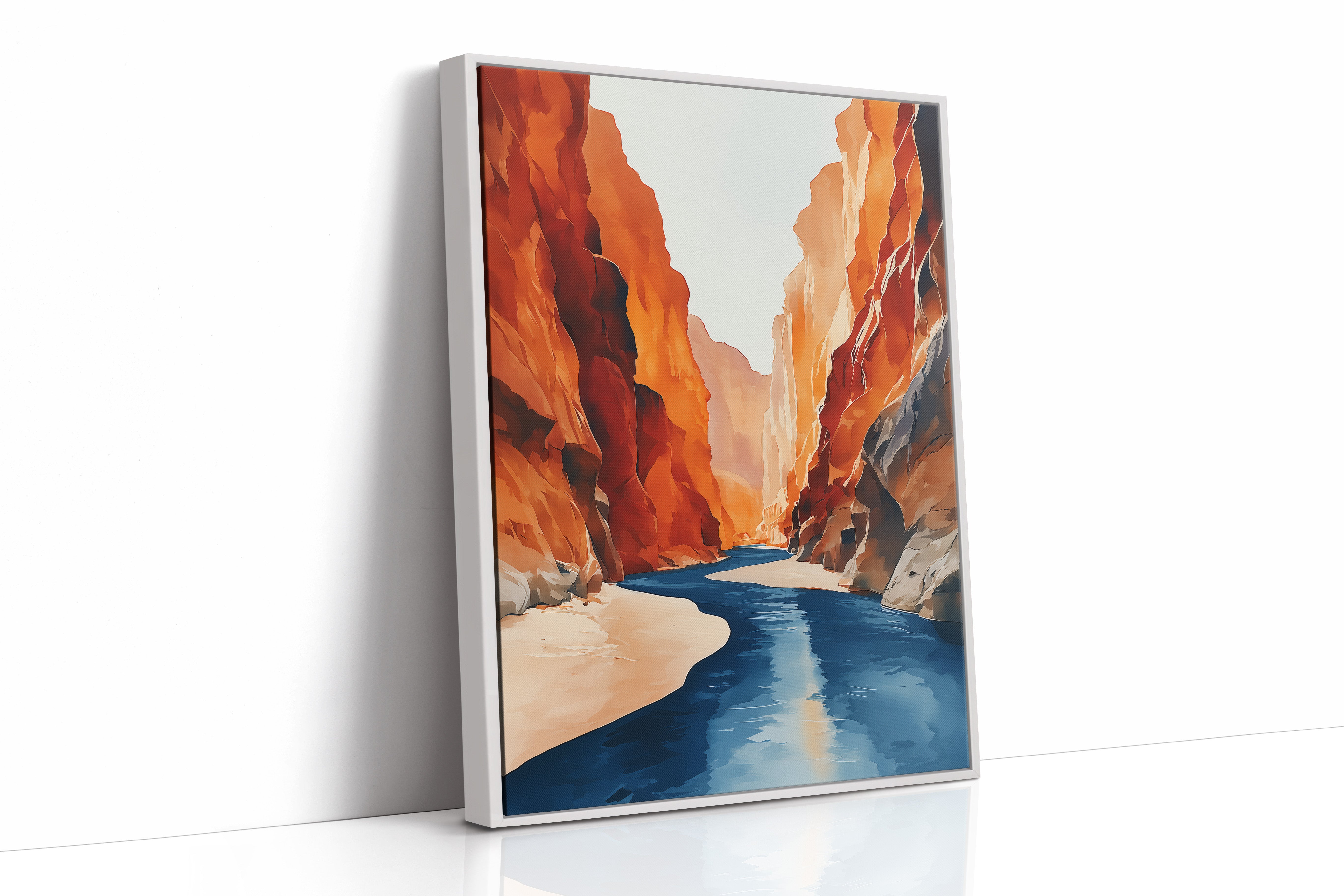 Time stands still where sapphire waters curve through towering walls of burnt orange sandstone. This striking piece from our Contemporary collection captures nature's most dramatic architecture. Smooth river bends contrast against rugged canyon walls, creating a mesmerizing dance of light and shadow. Deep blues mirror the sky above while warm desert tones tell stories of geological epochs past. Perfect for spaces that yearn for bold statement pieces, from modern living rooms to meditation spaces. Each viewing reveals new details in the intricate interplay of water and stone.