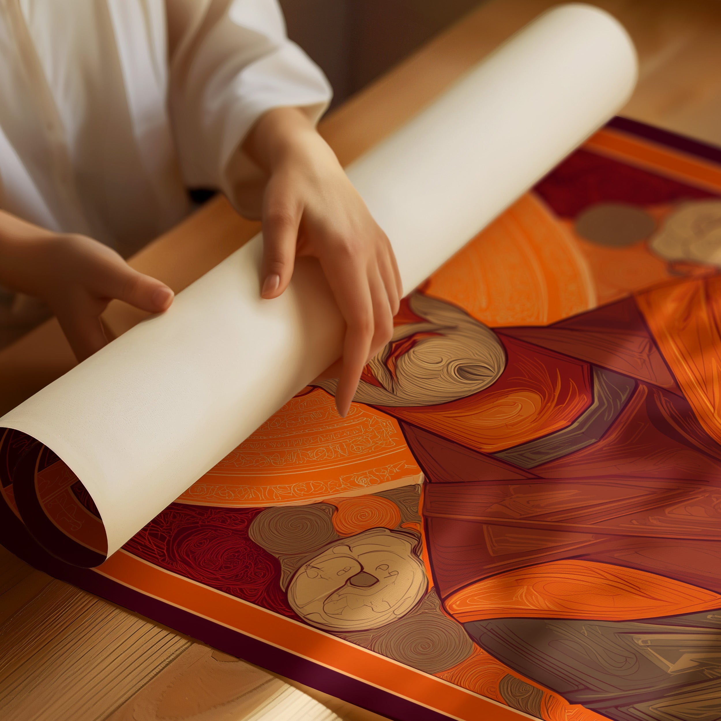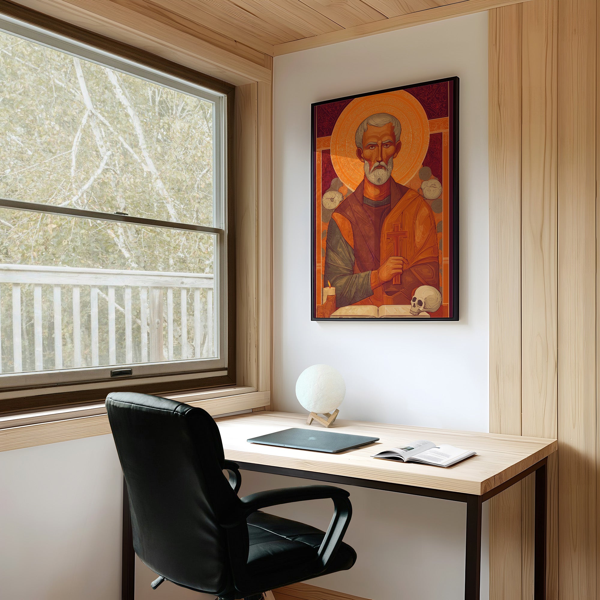 Warm amber and deep burgundy tones radiate from this contemplative icon resting on weathered wood. The intricate brushwork captures both solemnity and reverence, with golden halos and rich textures creating a sense of timeless devotion. The contrast between the vibrant illustration and the rustic table beneath speaks to the enduring dialogue between ancient tradition and everyday life. This piece brings a sense of spiritual depth to a reading nook, meditation space, or any area where quiet reflection is cherished.