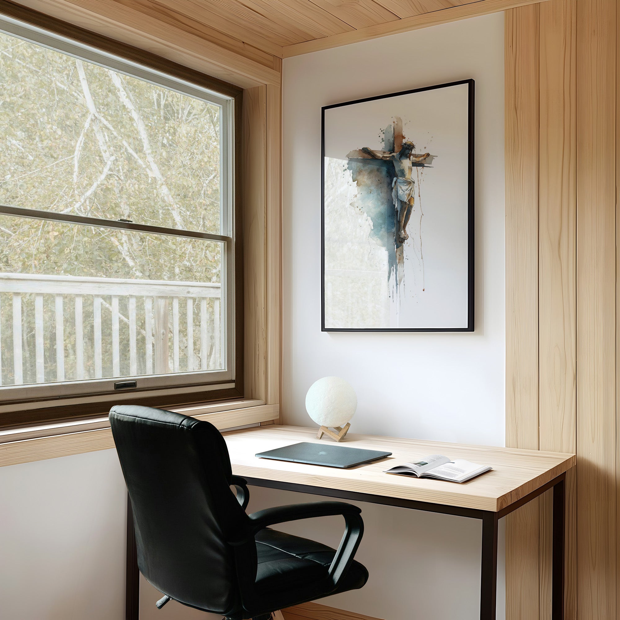 The weight of devotion spills across the canvas in gentle blues and earthen browns. Delicate watercolor bleeds create a poignant portrayal of sacrifice, where strength and vulnerability coexist in perfect tension. The minimalist approach heightens the emotional impact, with intentional splashes and drips creating movement that draws the eye upward and outward. This piece brings contemplative depth to a prayer room, study, or any space where moments of reflection are cherished.