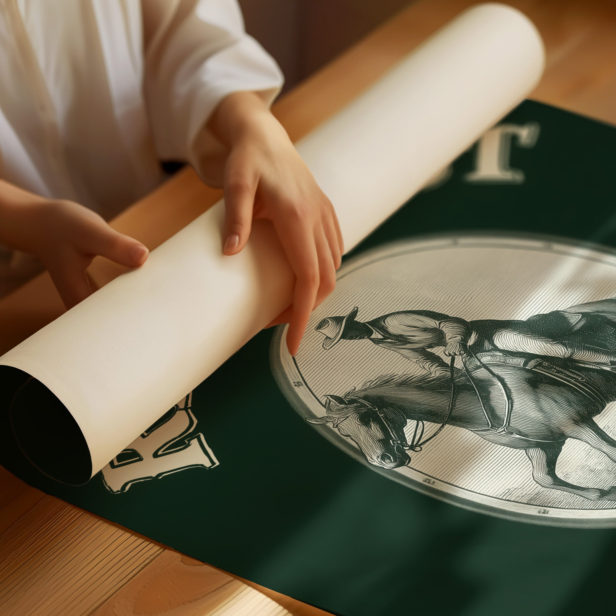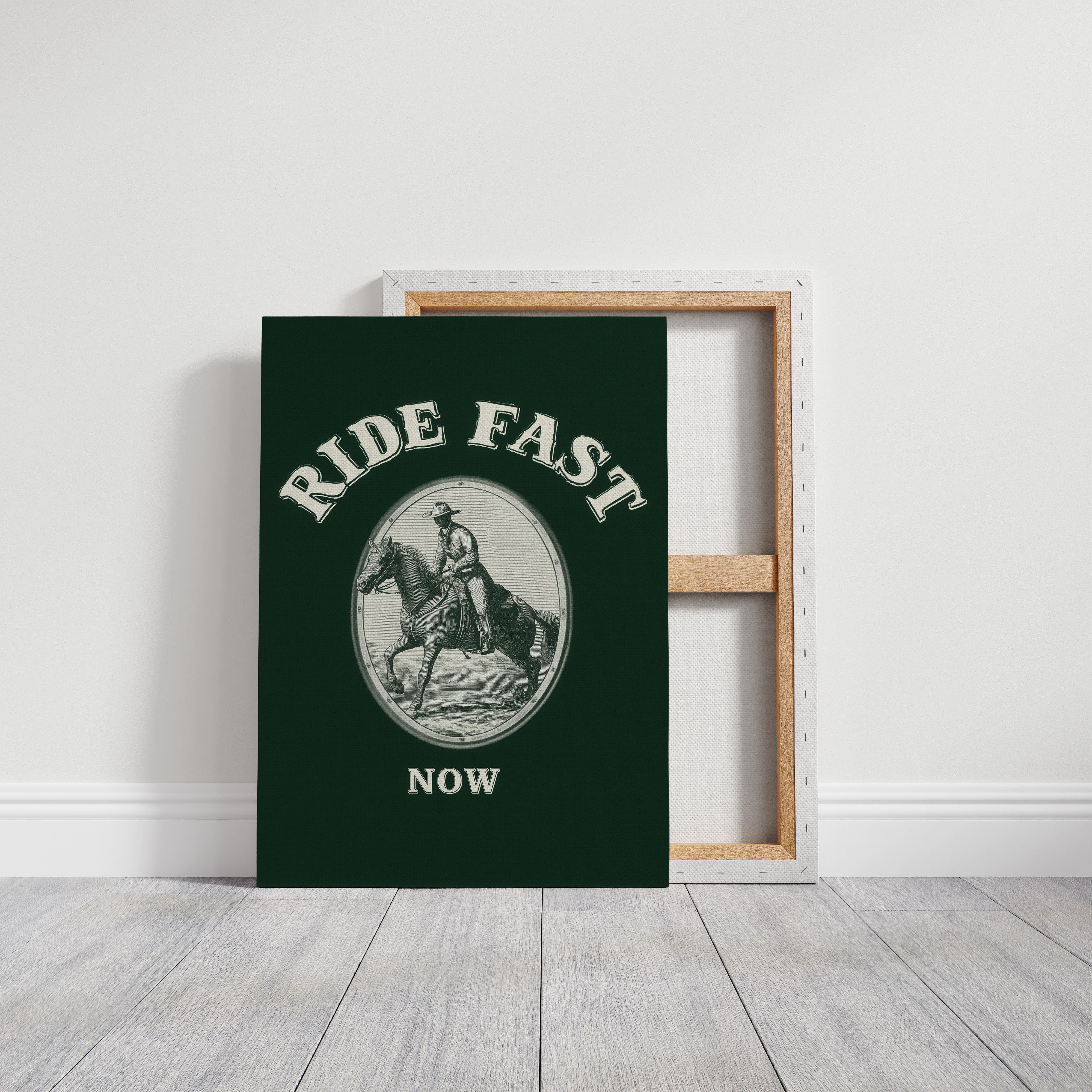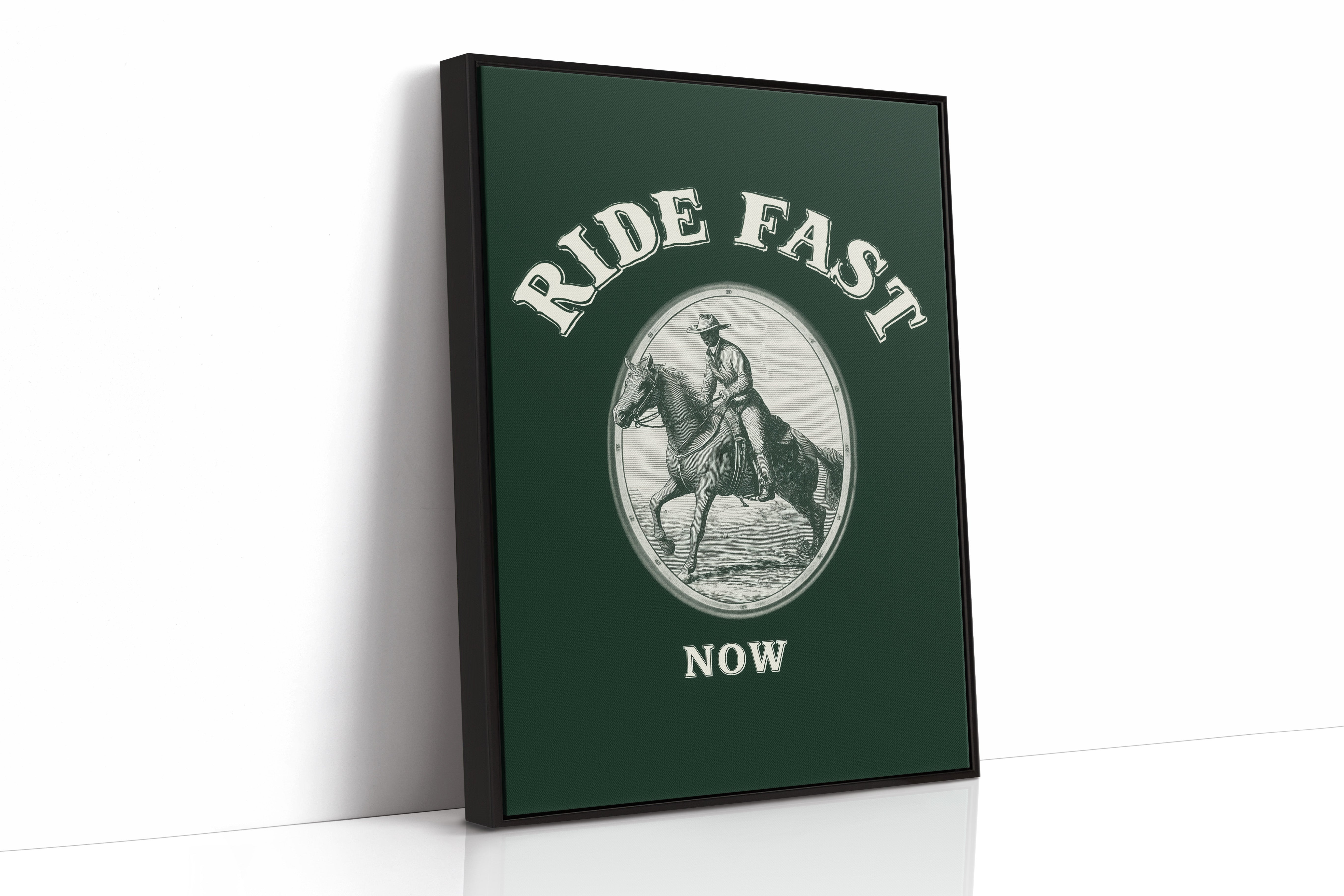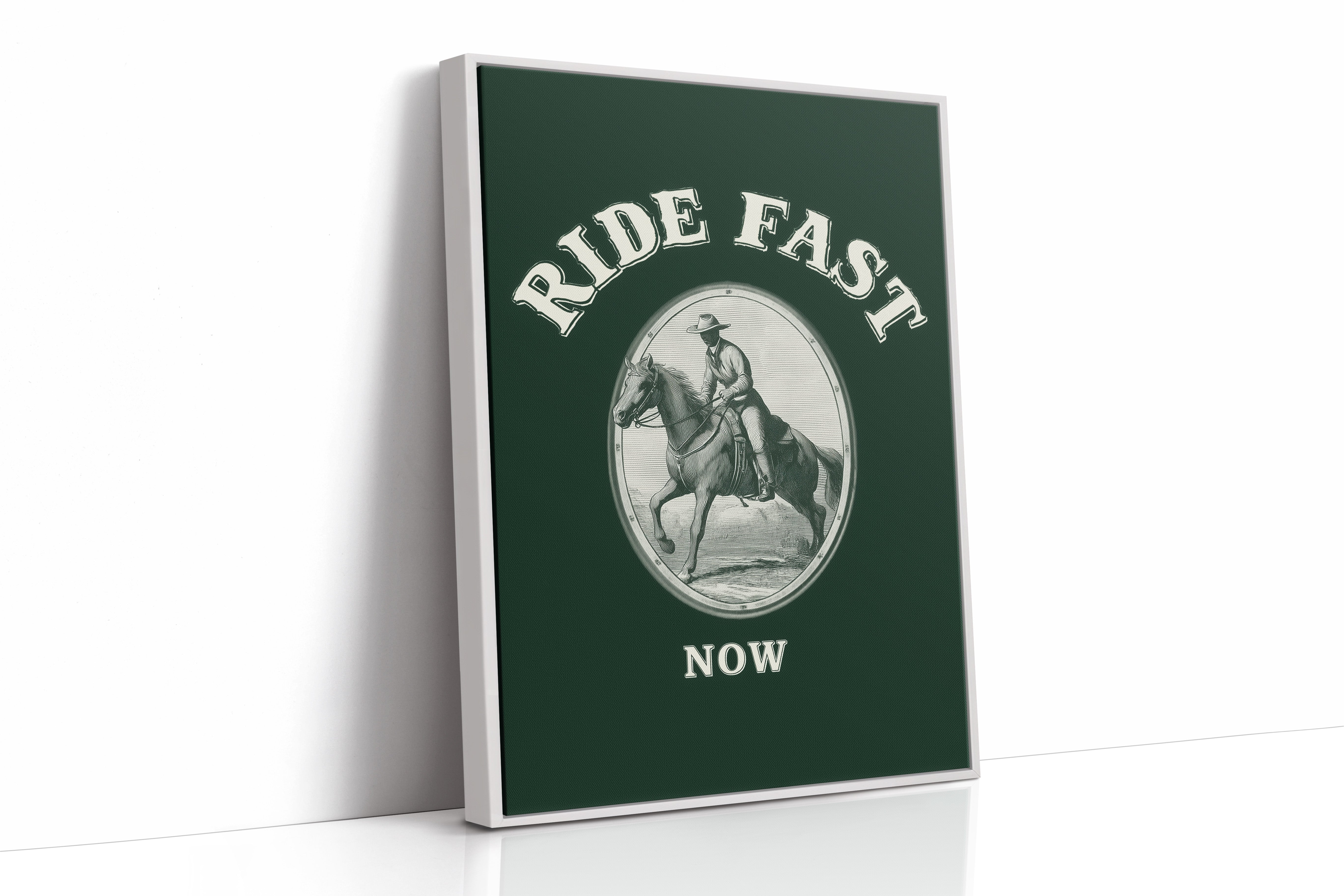 Hooves thunder across timeless plains, stirring memories of wild frontiers and untamed spirits. This contemporary reimagining draws from classic Western iconography with a modern minimalist twist. The stark contrast between the detailed line art and the deep forest green background creates a powerful narrative of motion and purpose, while the oval vignette frames this moment of pure kinetic energy. The rider and horse move as one, capturing that precise moment where speed meets grace, power meets control. Perfect for adding a bold statement to a home office, study, or any space that celebrates the enduring spirit of adventure.