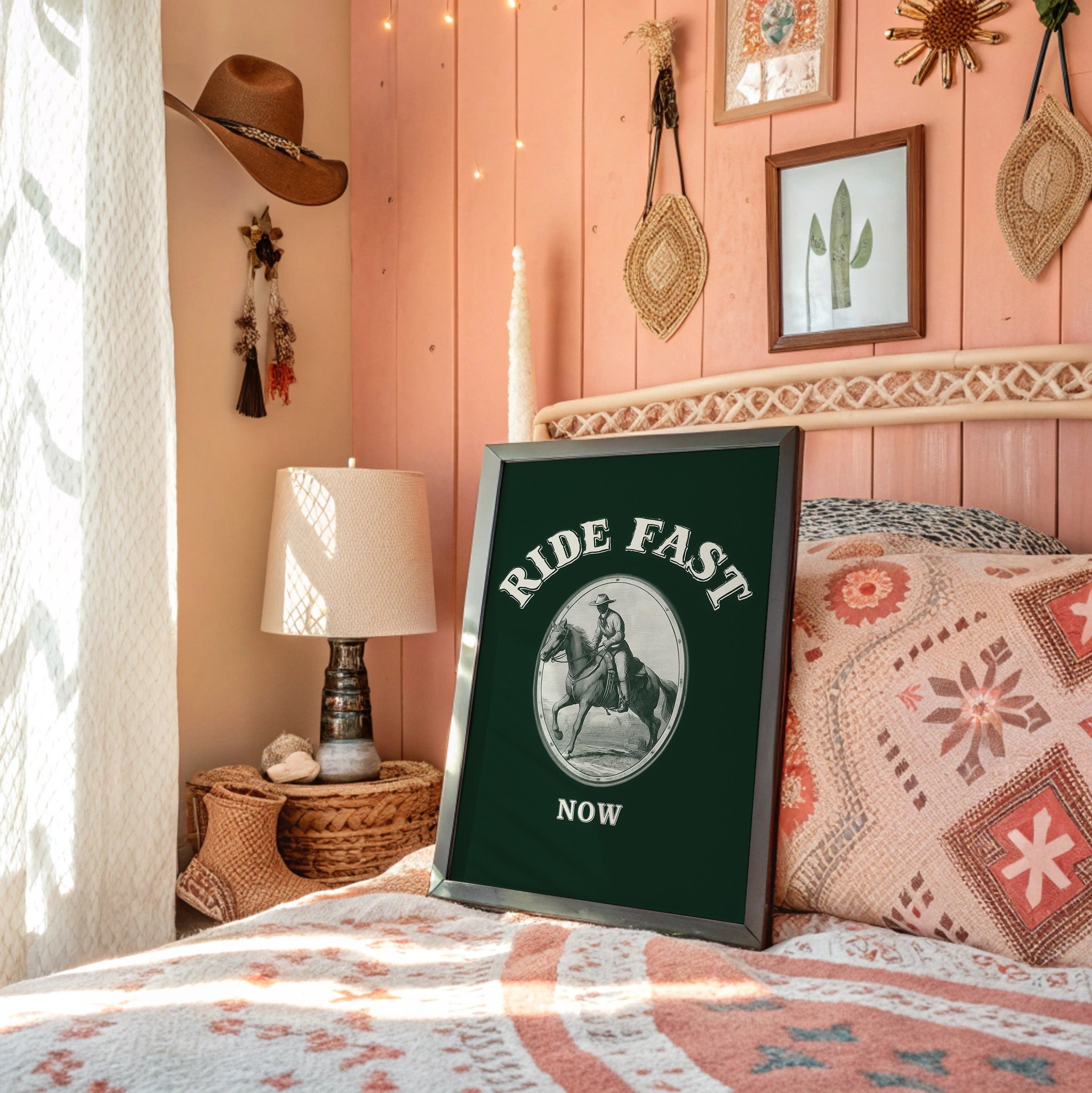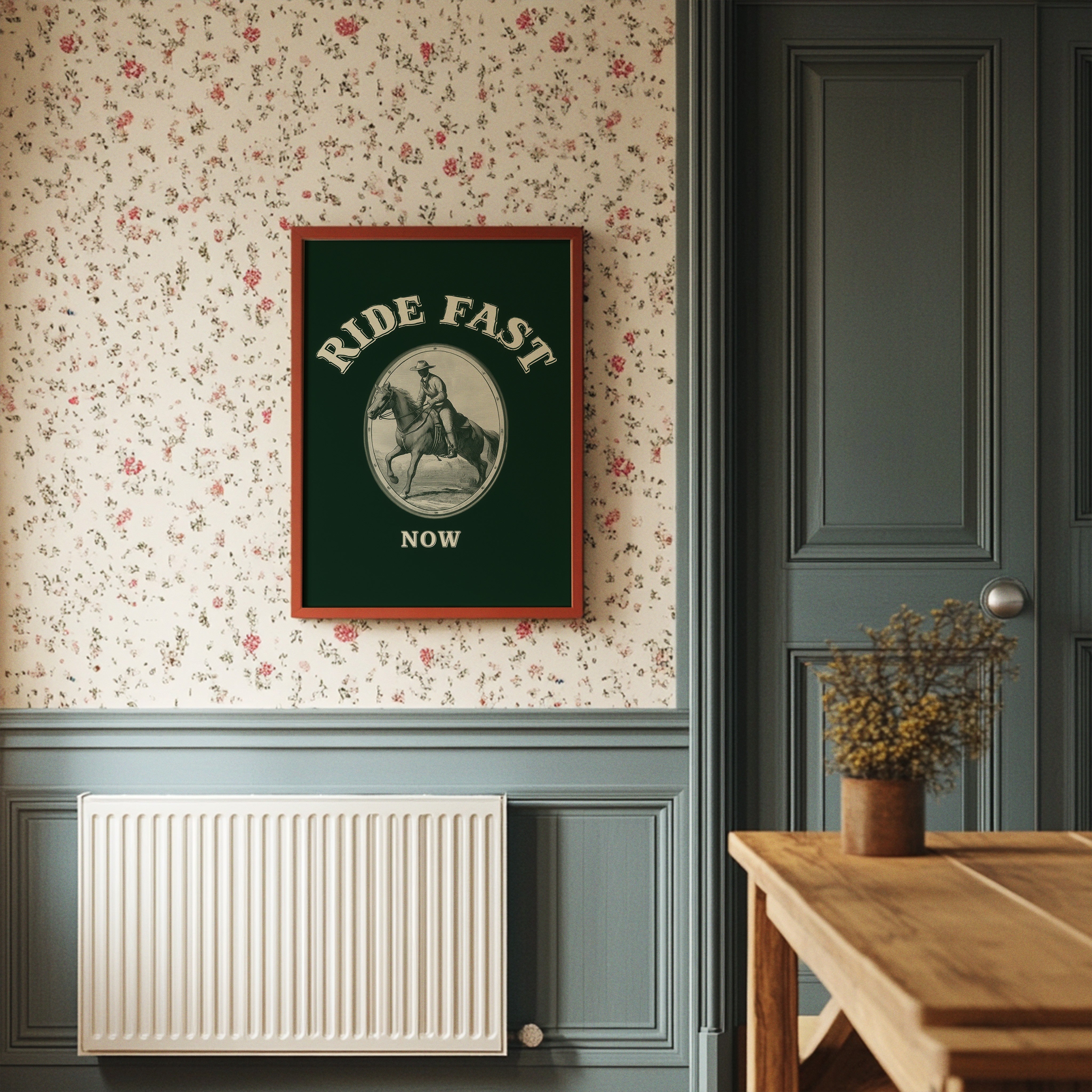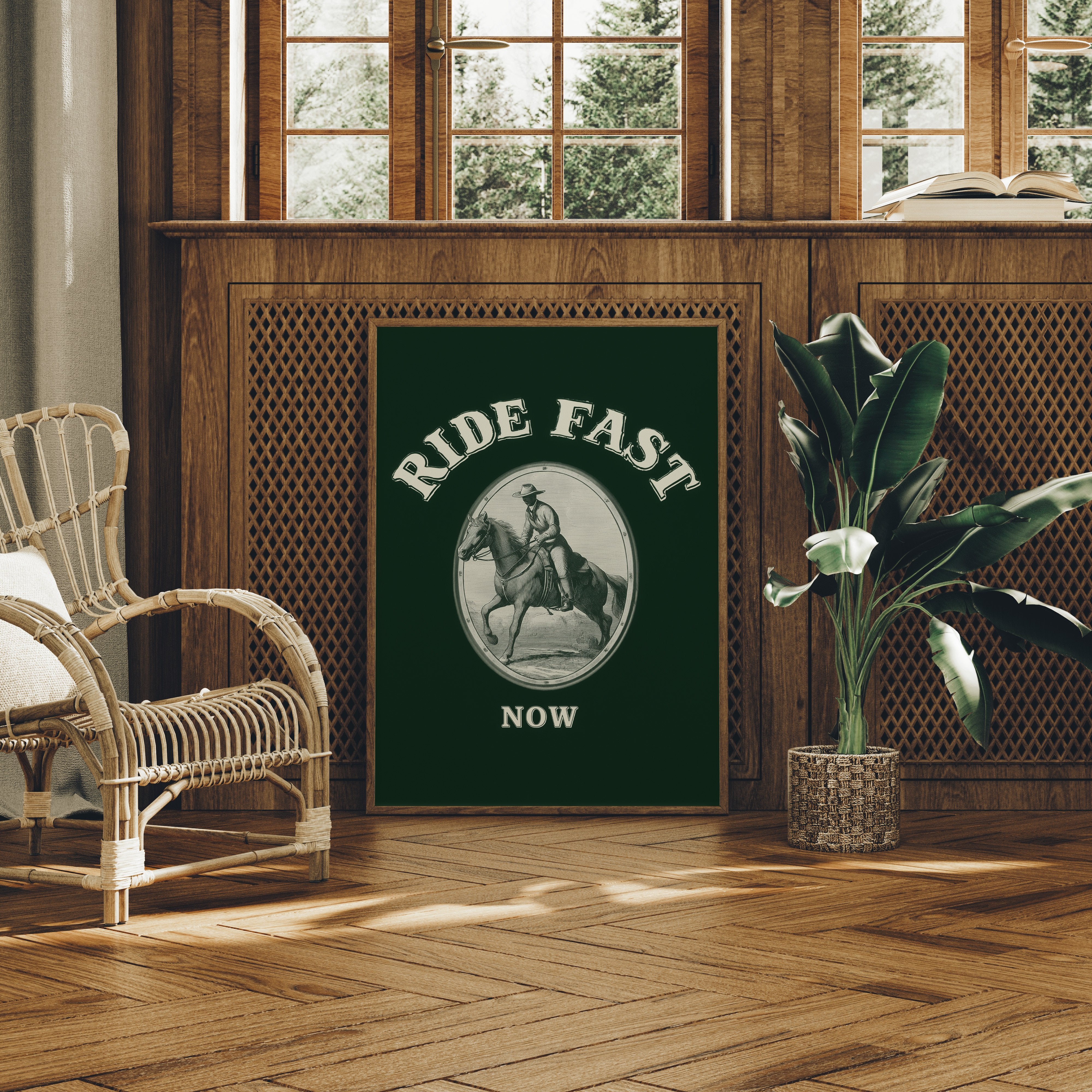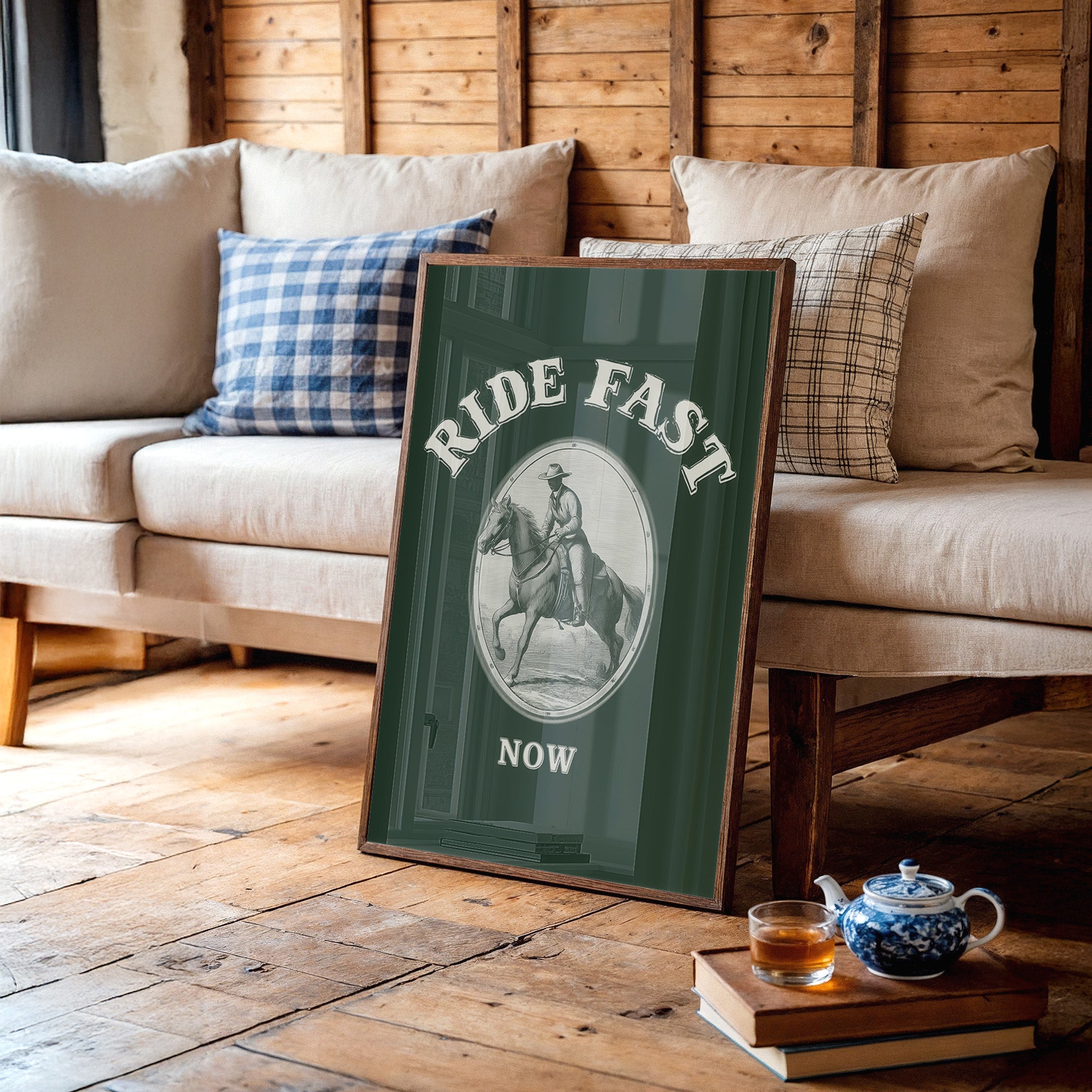 Hooves thunder across timeless plains, stirring memories of wild frontiers and untamed spirits. This contemporary reimagining draws from classic Western iconography with a modern minimalist twist. The stark contrast between the detailed line art and the deep forest green background creates a powerful narrative of motion and purpose, while the oval vignette frames this moment of pure kinetic energy. The rider and horse move as one, capturing that precise moment where speed meets grace, power meets control. Perfect for adding a bold statement to a home office, study, or any space that celebrates the enduring spirit of adventure.