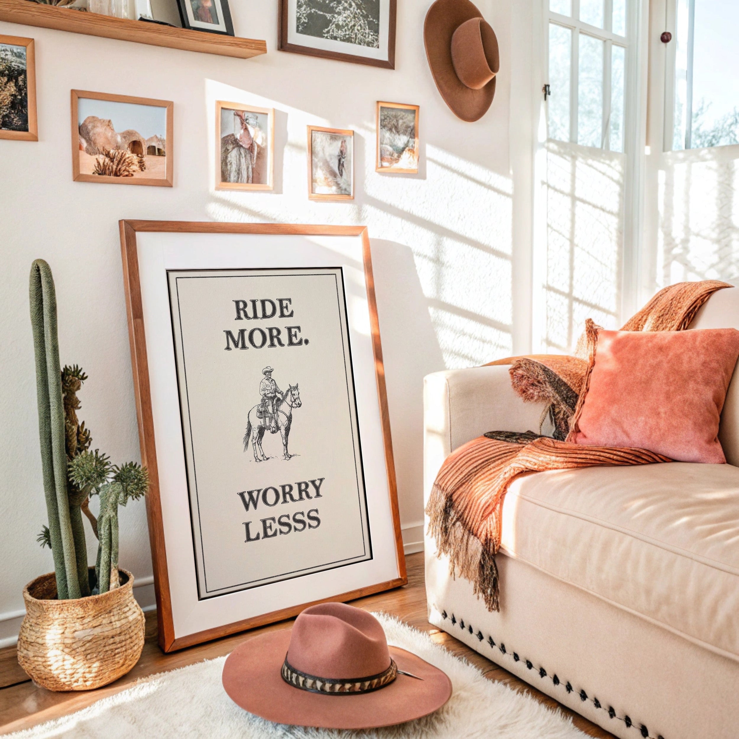 A gentle breeze carries the timeless wisdom of the open range, where hoofbeats mark the rhythm of a simpler life. This piece captures the essence of contemporary western minimalism with its clean lines and purposeful composition. The detailed illustration speaks to the enduring bond between rider and horse, rendered in masterful black and white strokes that celebrate both tradition and modernity. Against a pristine backdrop, the cowboy and his mount stand as symbols of determination and grace, their silhouette a testament to the untamed spirit of adventure. This striking piece brings character and contemplative energy to a home office, study, or any space seeking to blend rustic charm with contemporary sophistication.