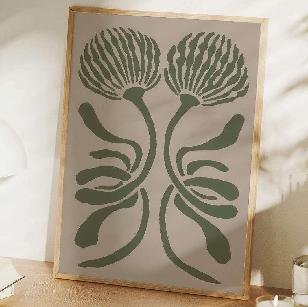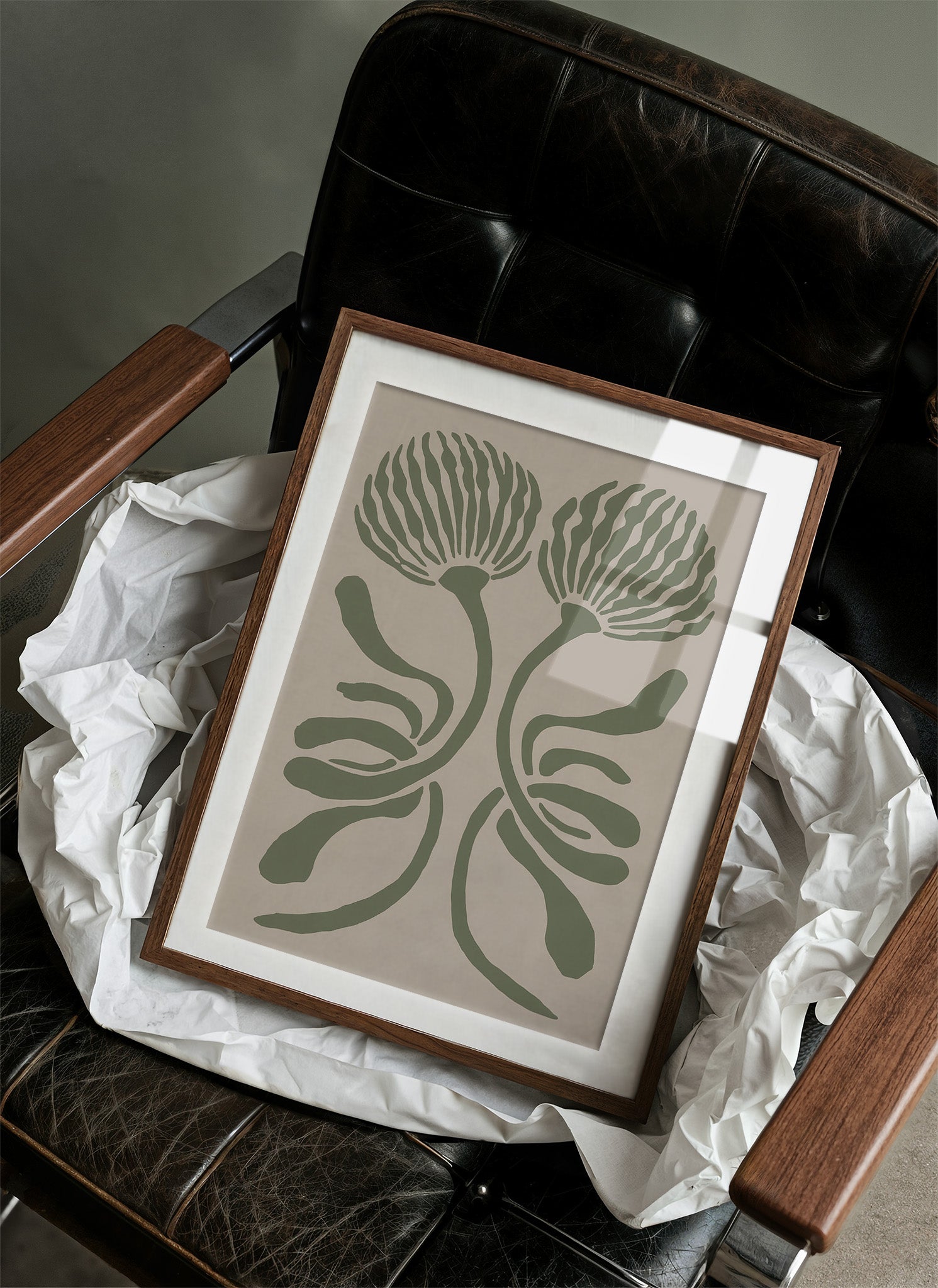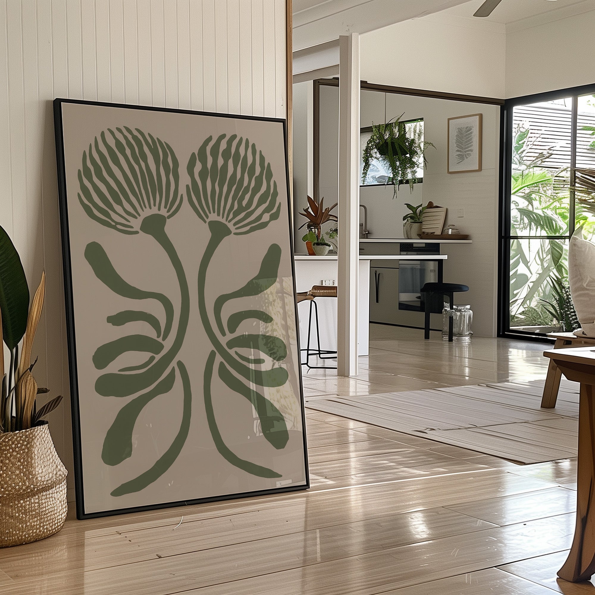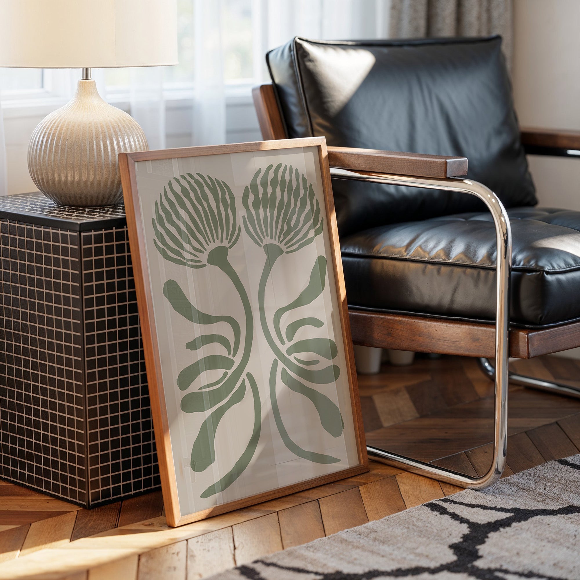 Morning light streams across a modern living space, illuminating a sophisticated botanical print where sage-green flowers mirror each other in elegant symmetry. The artwork's clean lines and organic forms create a harmonious dialogue with the room's mid-century furnishings, from the ribbed ceramic lamp to the leather and chrome armchair. This piece brings a sense of natural grace to a contemporary interior, perfectly balancing minimalist design with organic expression.