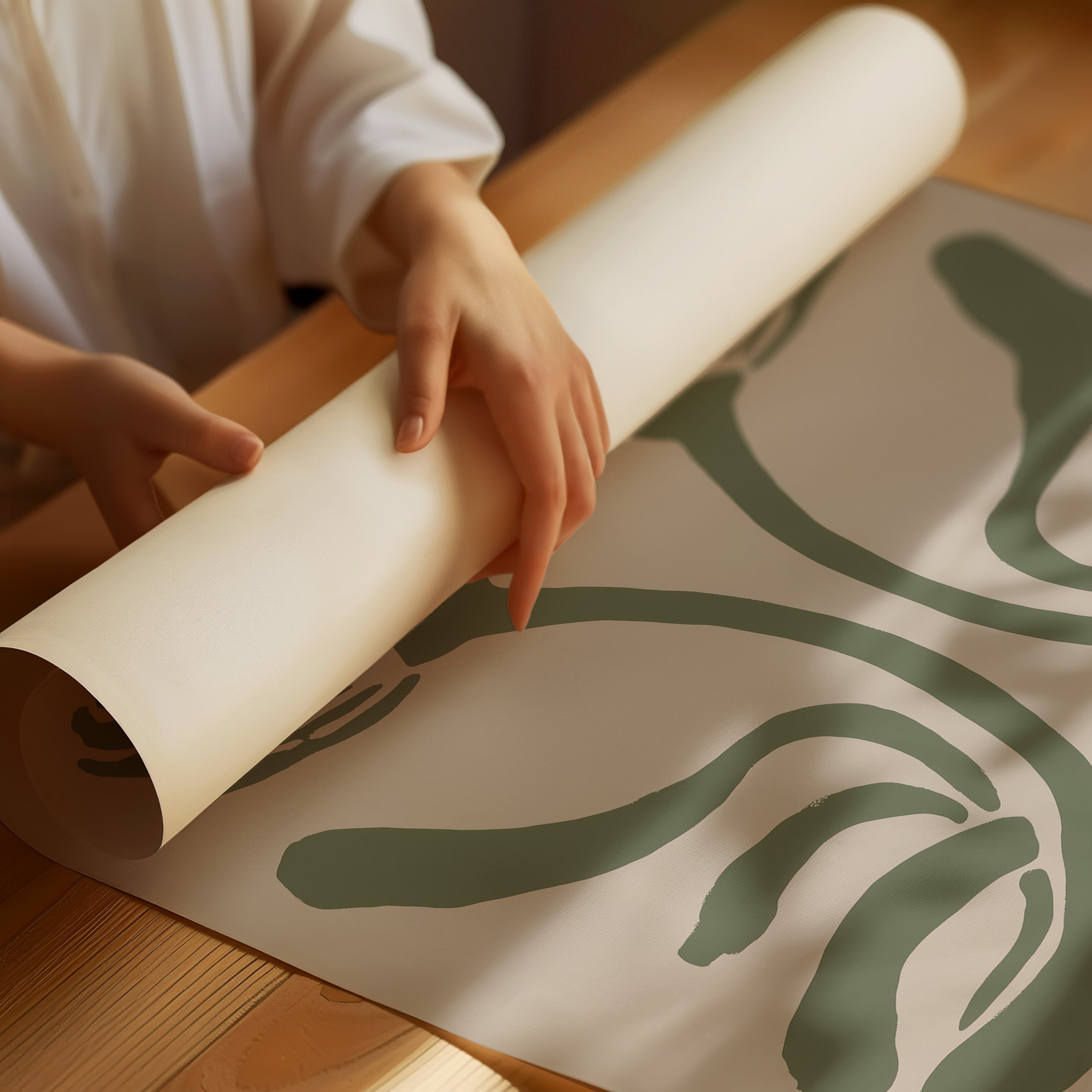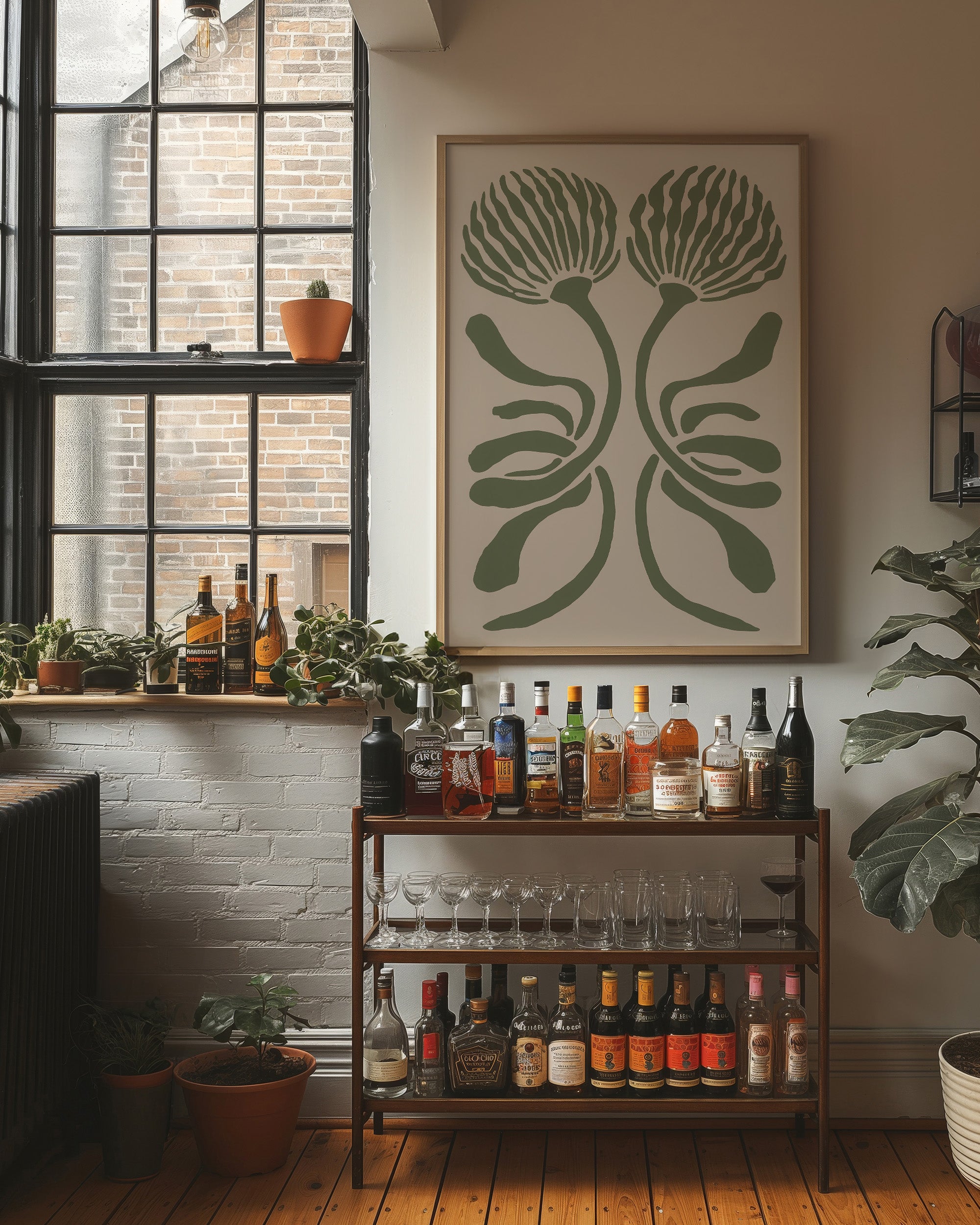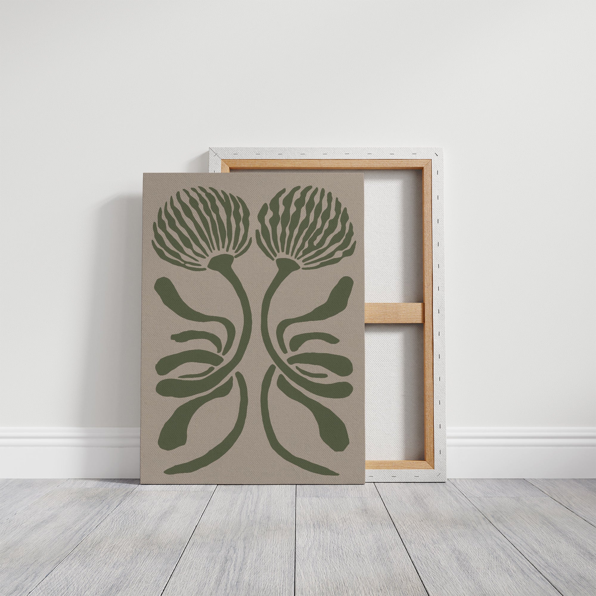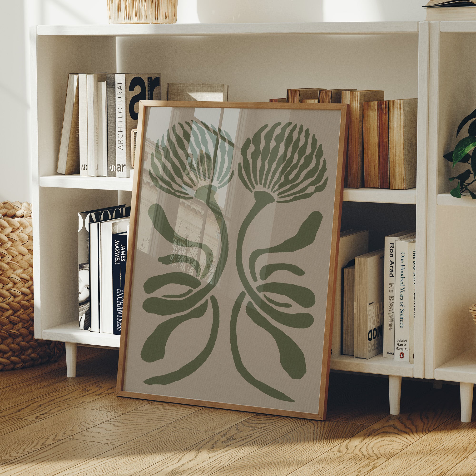 Morning light streams across a modern living space, illuminating a sophisticated botanical print where sage-green flowers mirror each other in elegant symmetry. The artwork's clean lines and organic forms create a harmonious dialogue with the room's mid-century furnishings, from the ribbed ceramic lamp to the leather and chrome armchair. This piece brings a sense of natural grace to a contemporary interior, perfectly balancing minimalist design with organic expression.