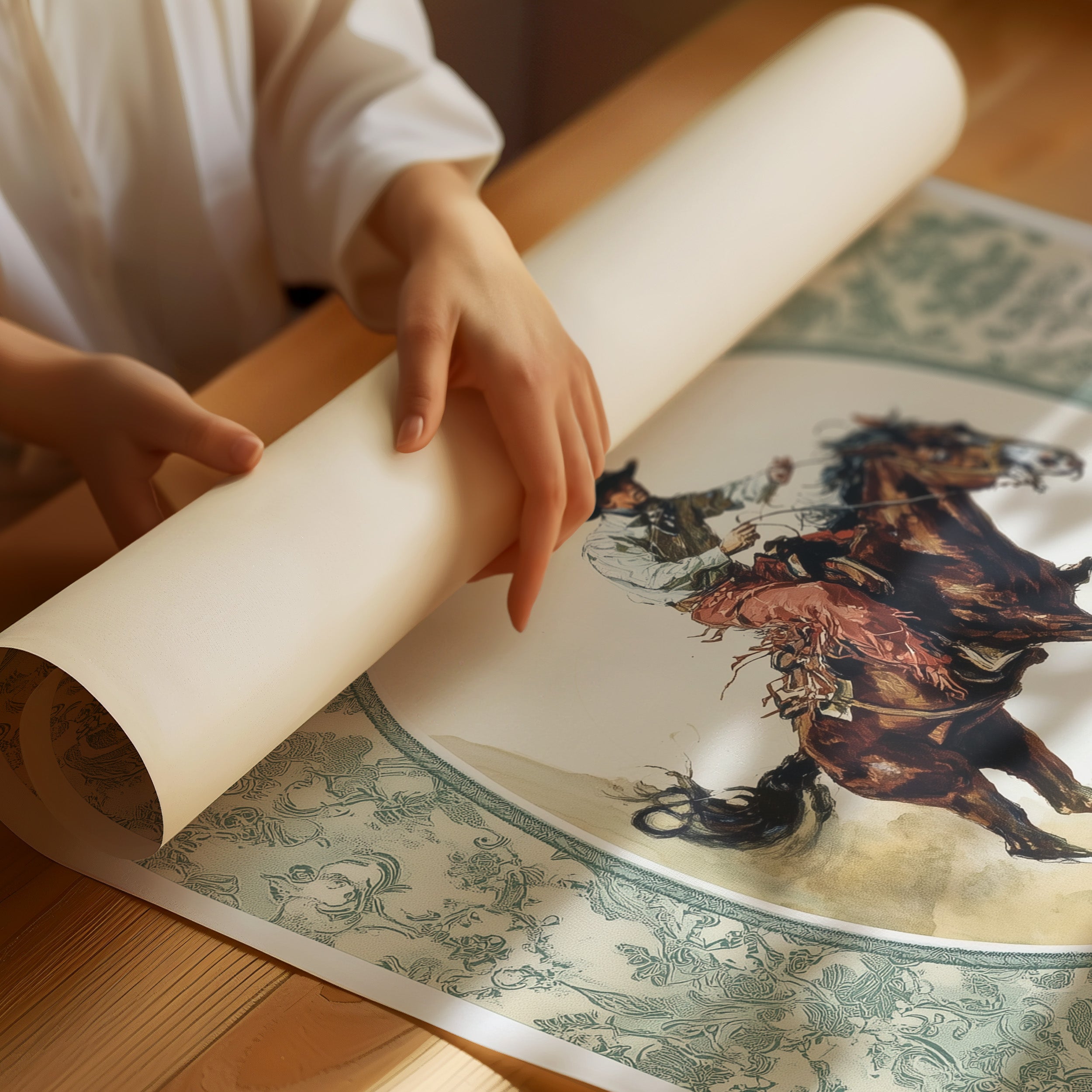 Dust motes dance in golden lamplight, casting warmth across weathered wood walls where heritage meets modern comfort. This piece from our Contemporary collection reimagines classic Western imagery through an elegant, refined lens. The sage damask border cradles a dynamic scene of raw power and skilled horsemanship, while vintage-inspired details blend seamlessly with modern styling. The thoughtful composition creates a perfect balance between refined sophistication and rugged authenticity. This statement piece commands attention in a study, den, or living room where leather and natural textures tell stories of adventure and grace.