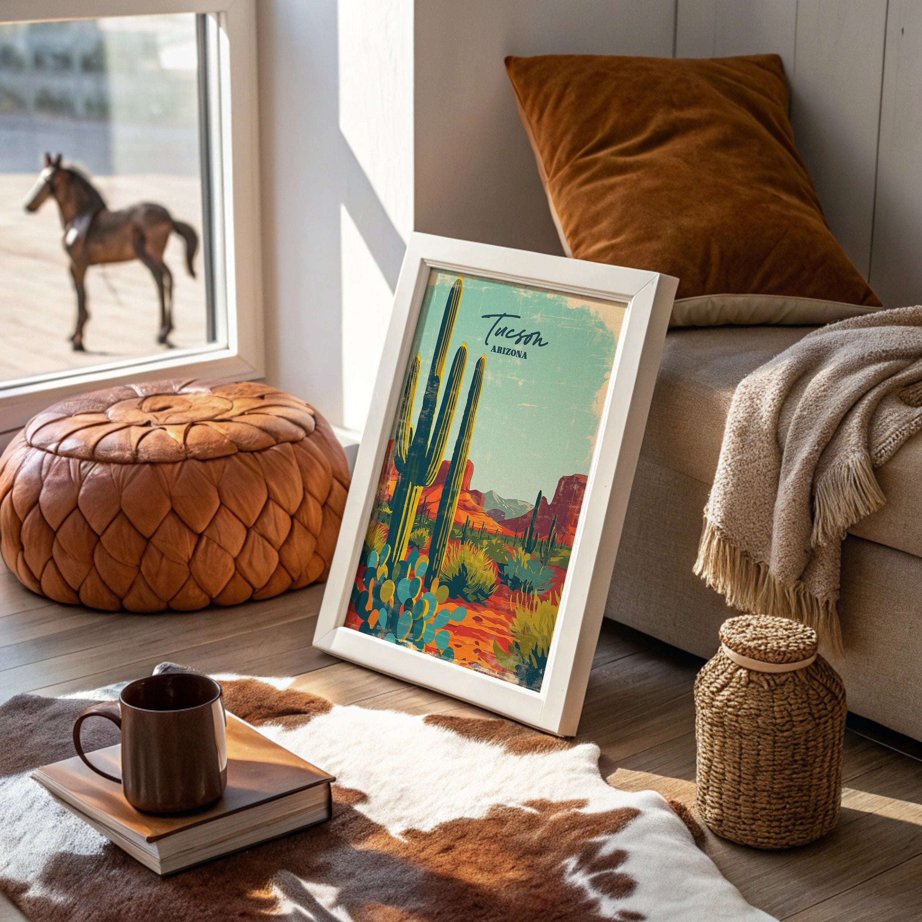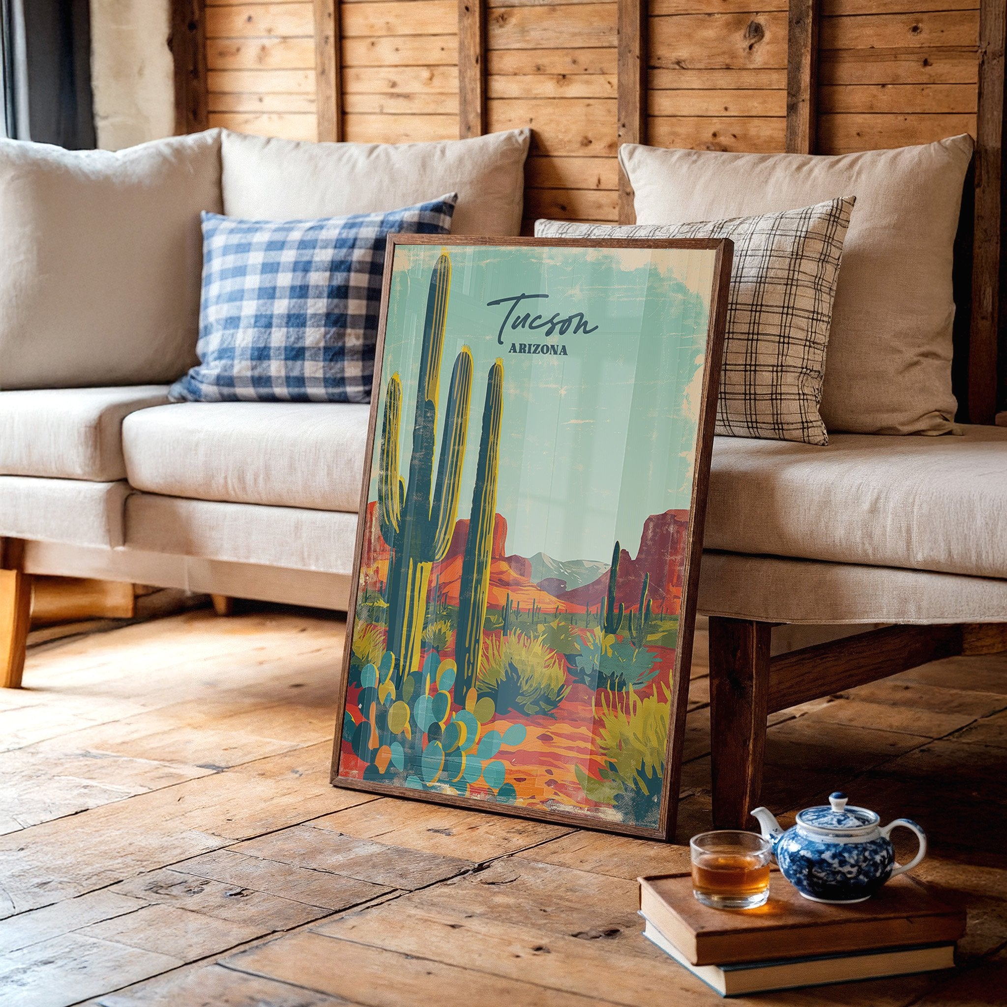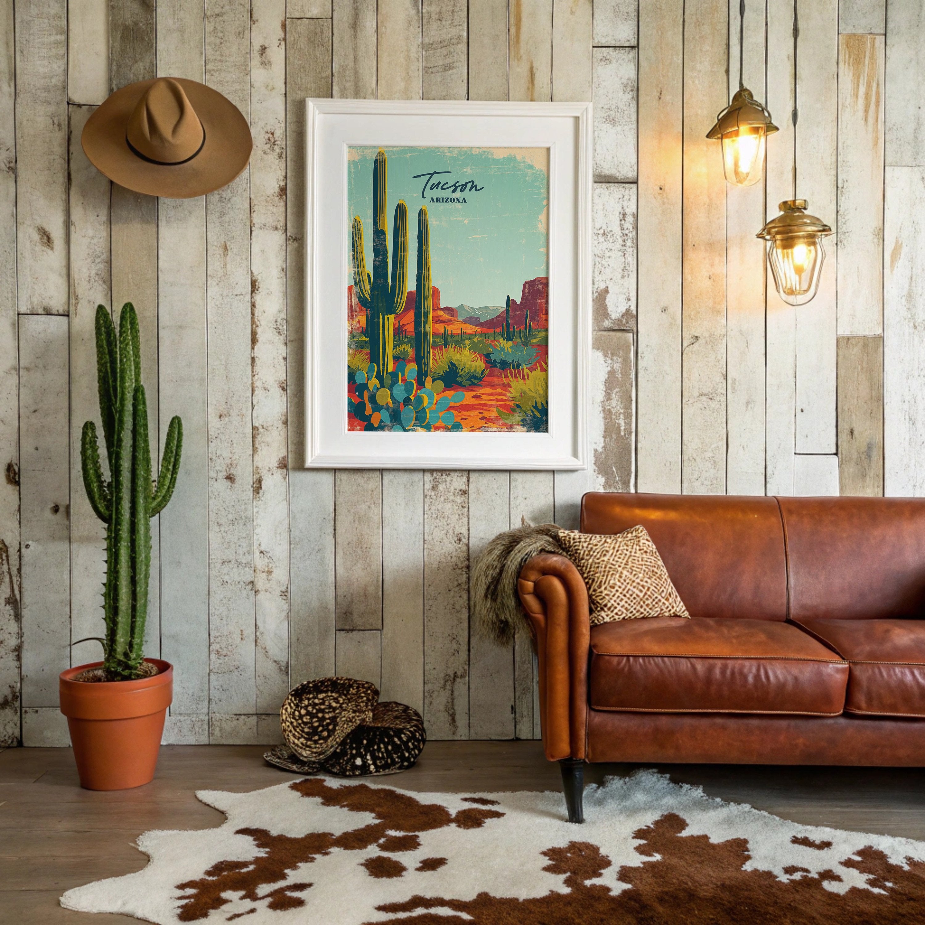 Turquoise horizons meet rust-colored earth in this vibrant ode to the Sonoran Desert. Tall saguaro sentinels stand proudly against a clear Arizona sky, while colorful cacti and desert flora create a tapestry of life along winding trails. The vintage-inspired travel poster style captures Tucson's rugged beauty with bold colors and simplified forms that celebrate the iconic southwestern landscape. This piece brings southwestern charm to any space, creating a perfect focal point in a rustic living room, bohemian study, or as part of a travel-inspired gallery wall.