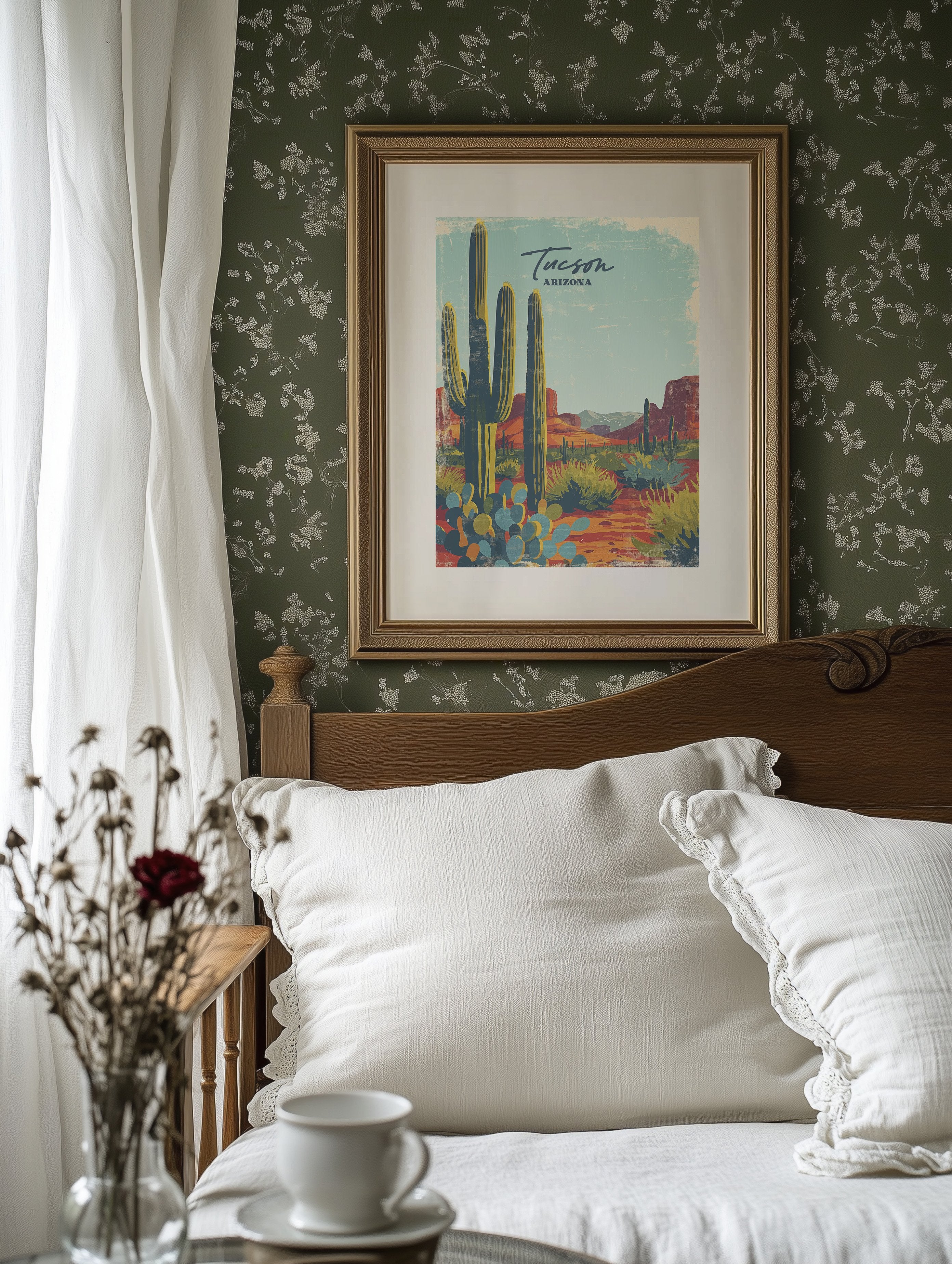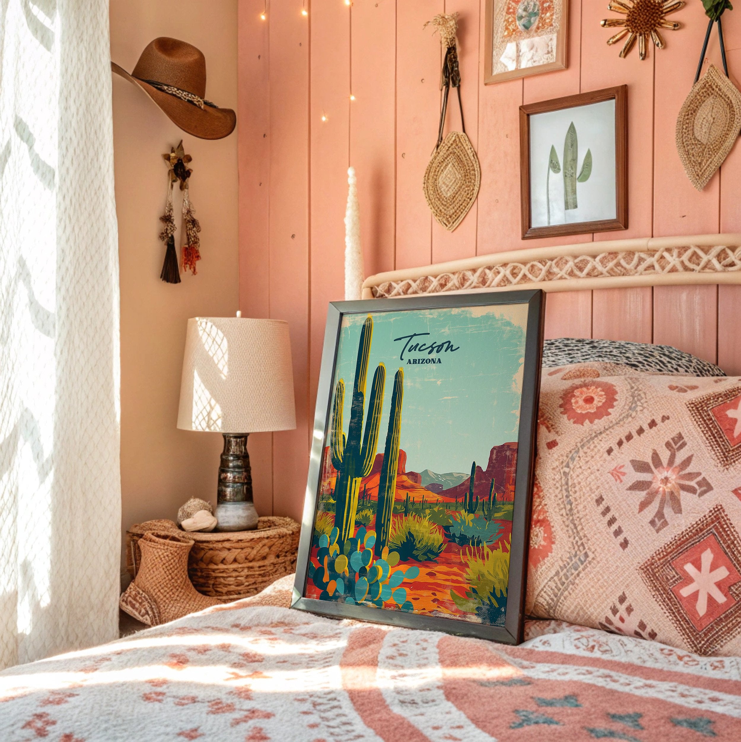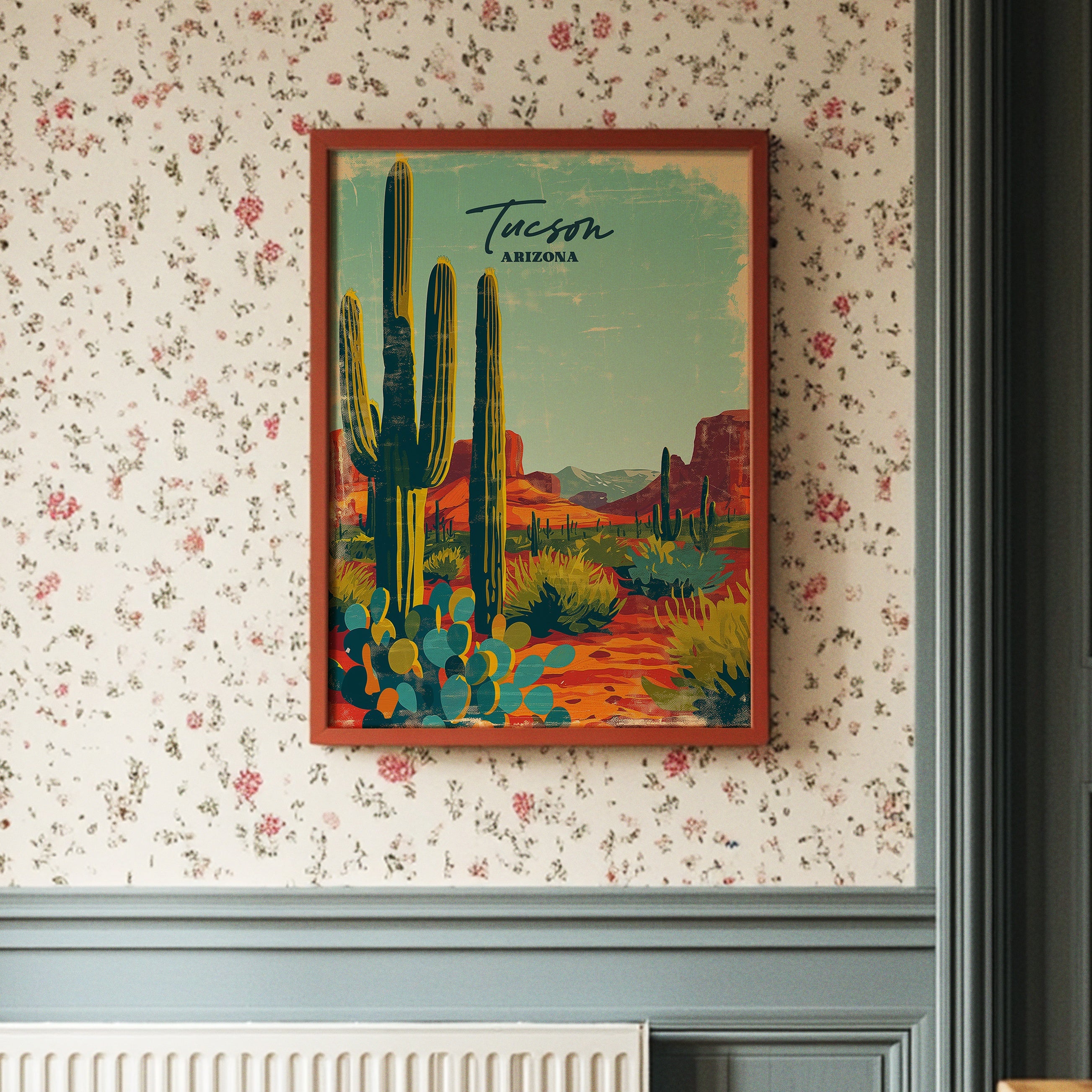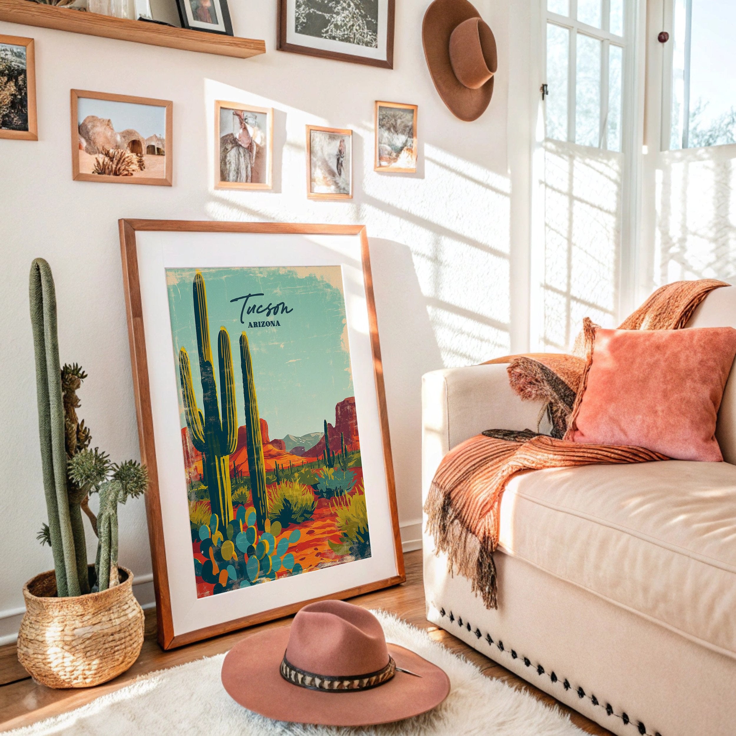 Turquoise horizons meet rust-colored earth in this vibrant ode to the Sonoran Desert. Tall saguaro sentinels stand proudly against a clear Arizona sky, while colorful cacti and desert flora create a tapestry of life along winding trails. The vintage-inspired travel poster style captures Tucson's rugged beauty with bold colors and simplified forms that celebrate the iconic southwestern landscape. This piece brings southwestern charm to any space, creating a perfect focal point in a rustic living room, bohemian study, or as part of a travel-inspired gallery wall.
