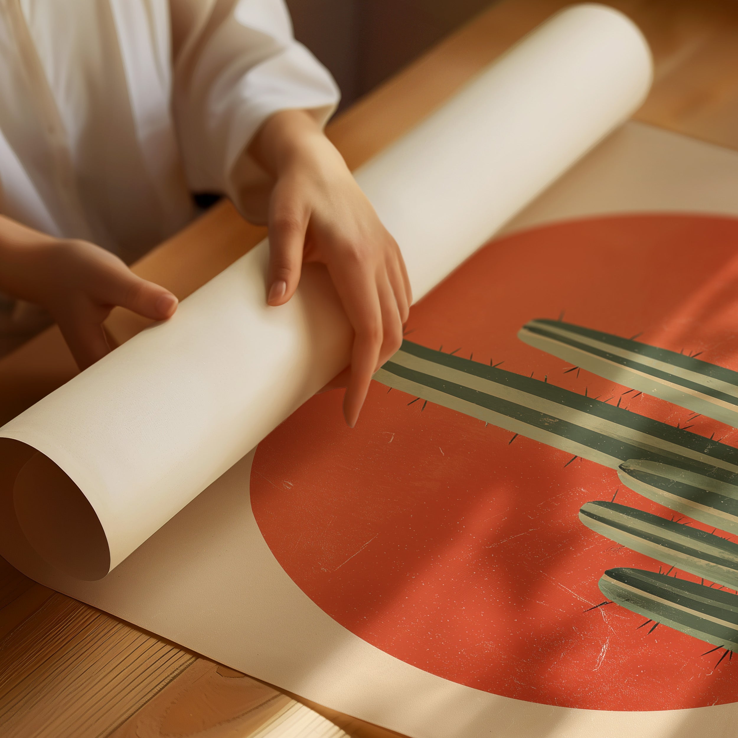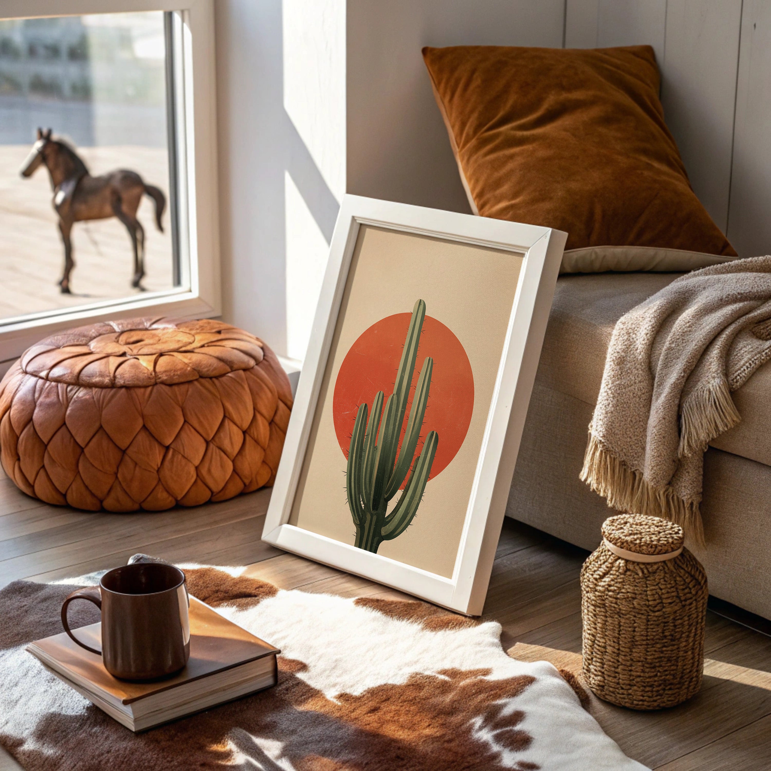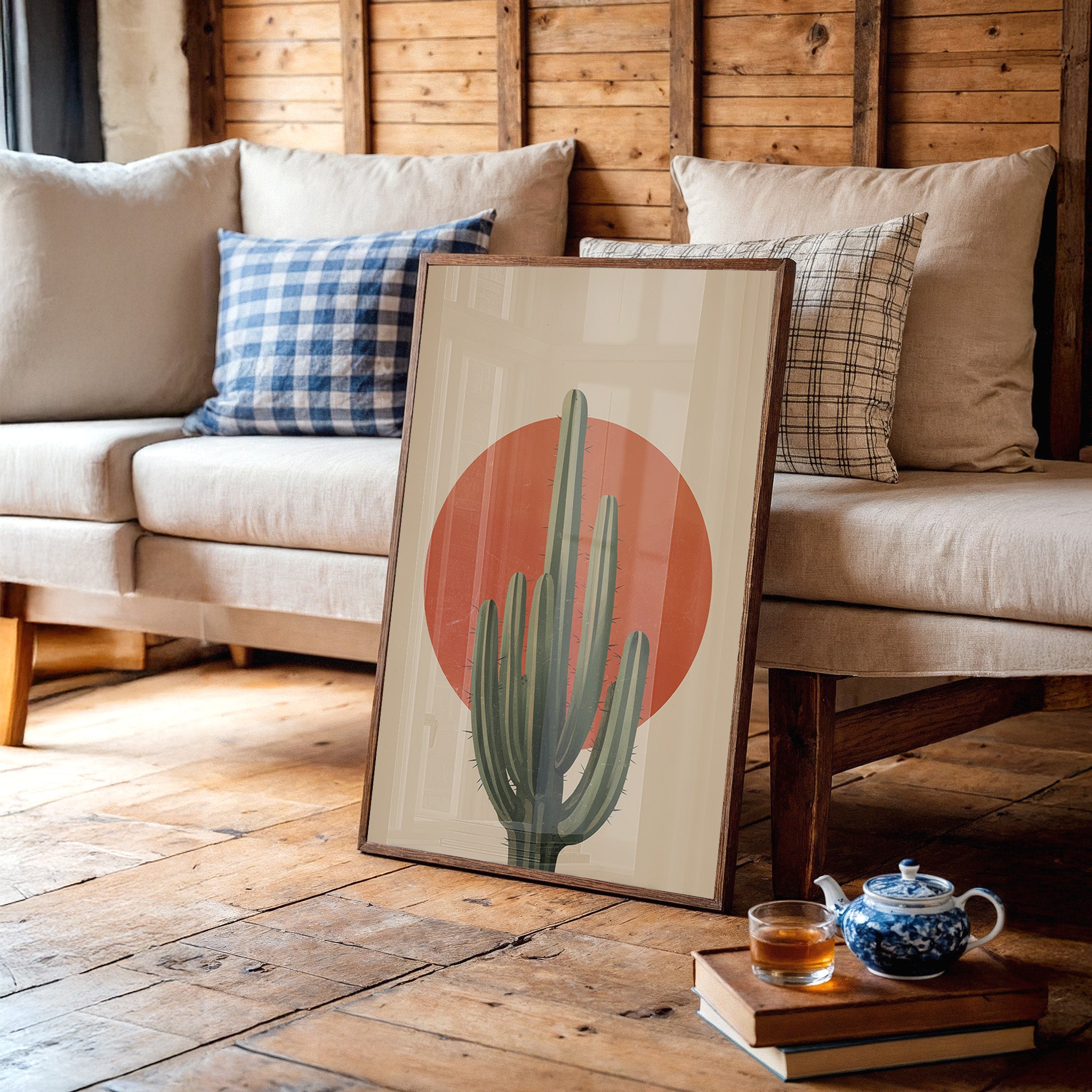 A striking saguaro cactus stands tall against a bold terracotta sun, creating a minimalist desert meditation. The composition balances organic shapes with geometric simplicity, while earth tones and desert greens merge in perfect harmony. The clean lines and contemporary styling speak to both southwestern heritage and modern design sensibilities. This piece brings dramatic desert energy to contemporary living spaces, home offices, or anywhere seeking a touch of modern southwestern flair.