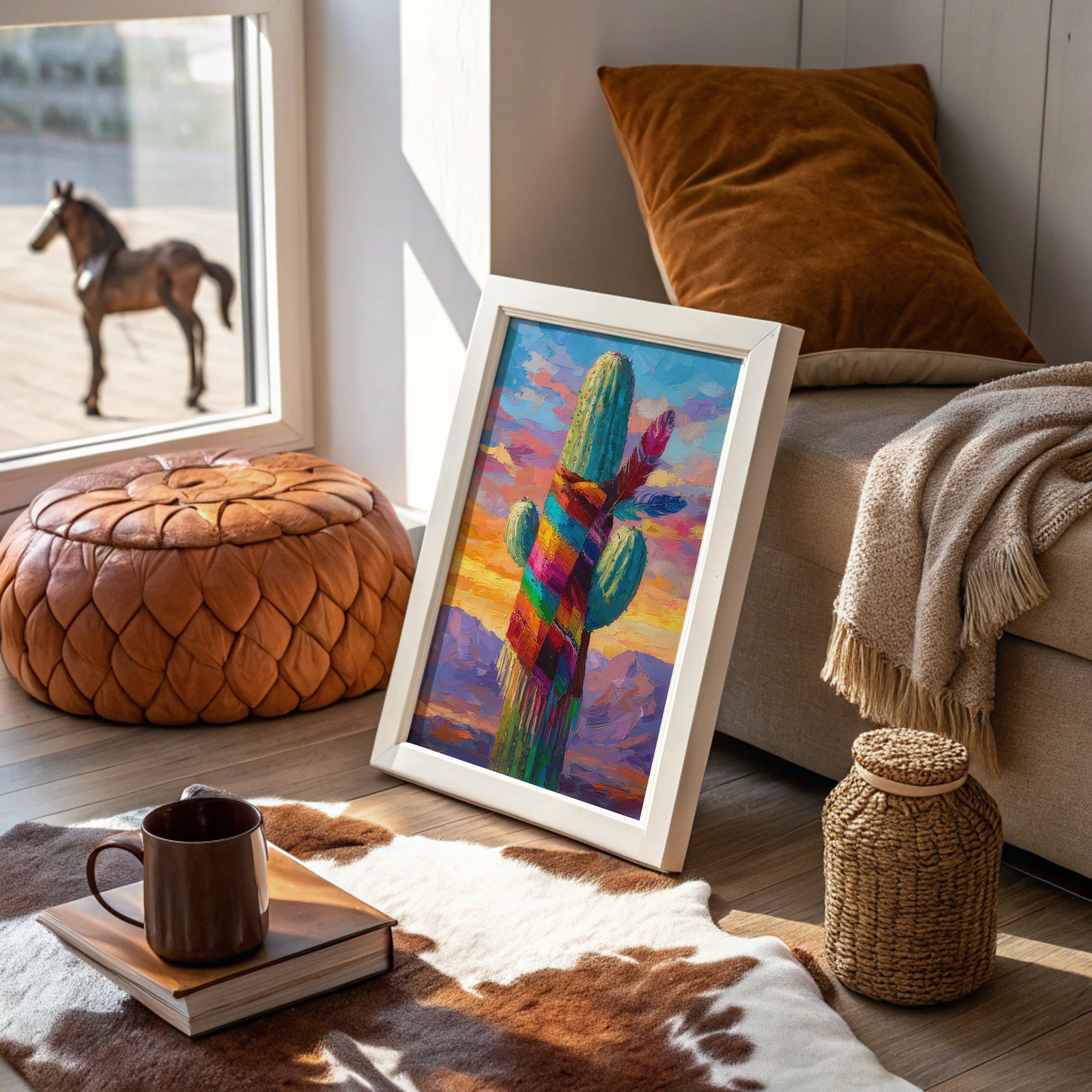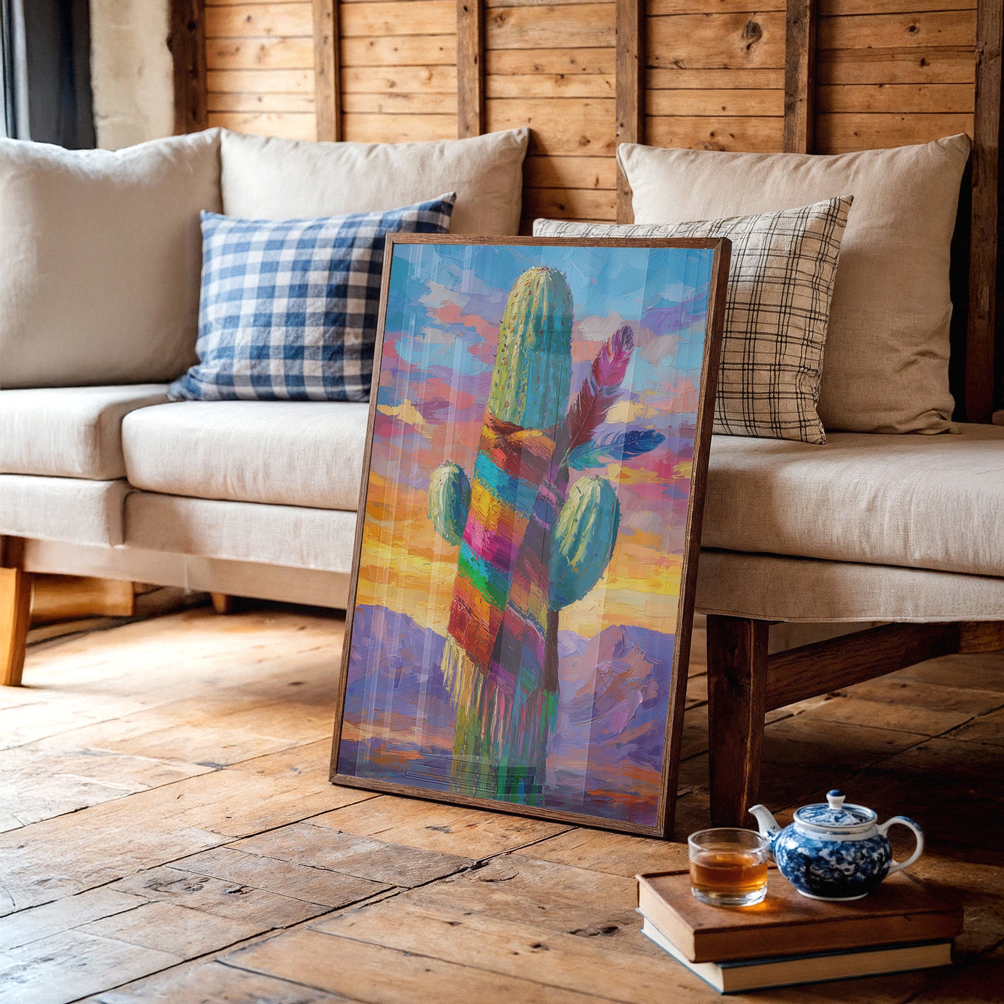 A vibrant saguaro cactus stands proudly wrapped in a colorful serape against a blazing sunset sky. Bold purples and oranges paint the horizon while whimsical feathers dance alongside this desert sentinel, creating a playful fusion of Southwestern traditions and contemporary artistry. This imaginative piece turns a familiar desert icon into a celebration of color and culture, where reality meets fantasy in the warm glow of dusk. Perfect for adding a splash of Southwestern charm to a modern living room, home office, or any space craving both warmth and whimsy.