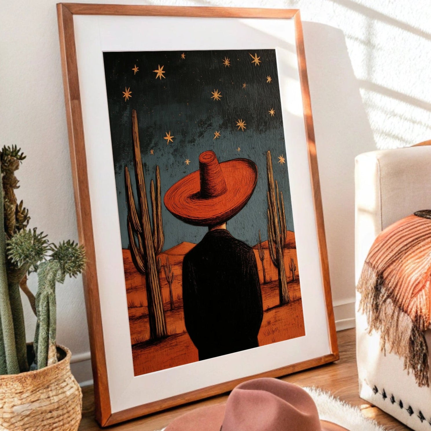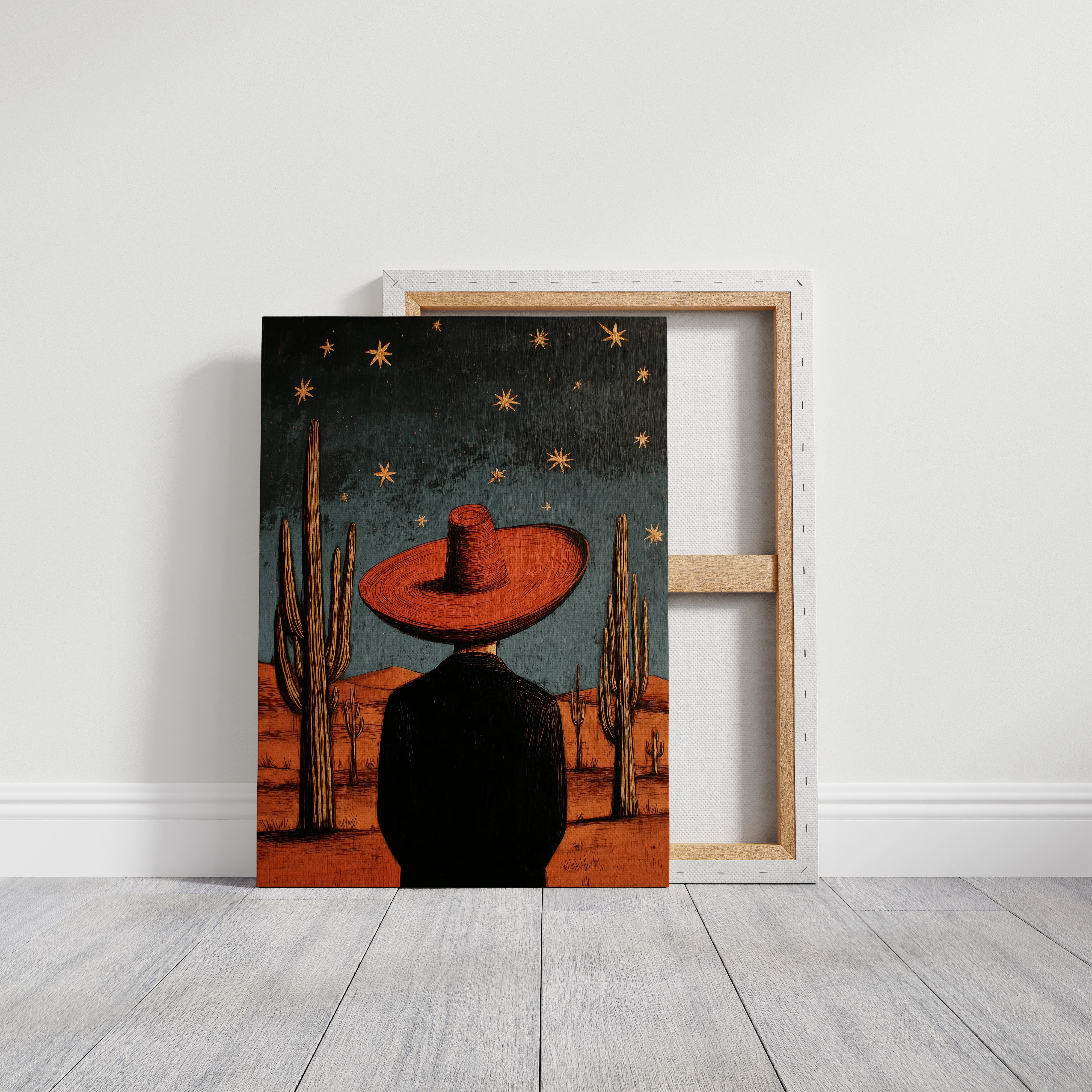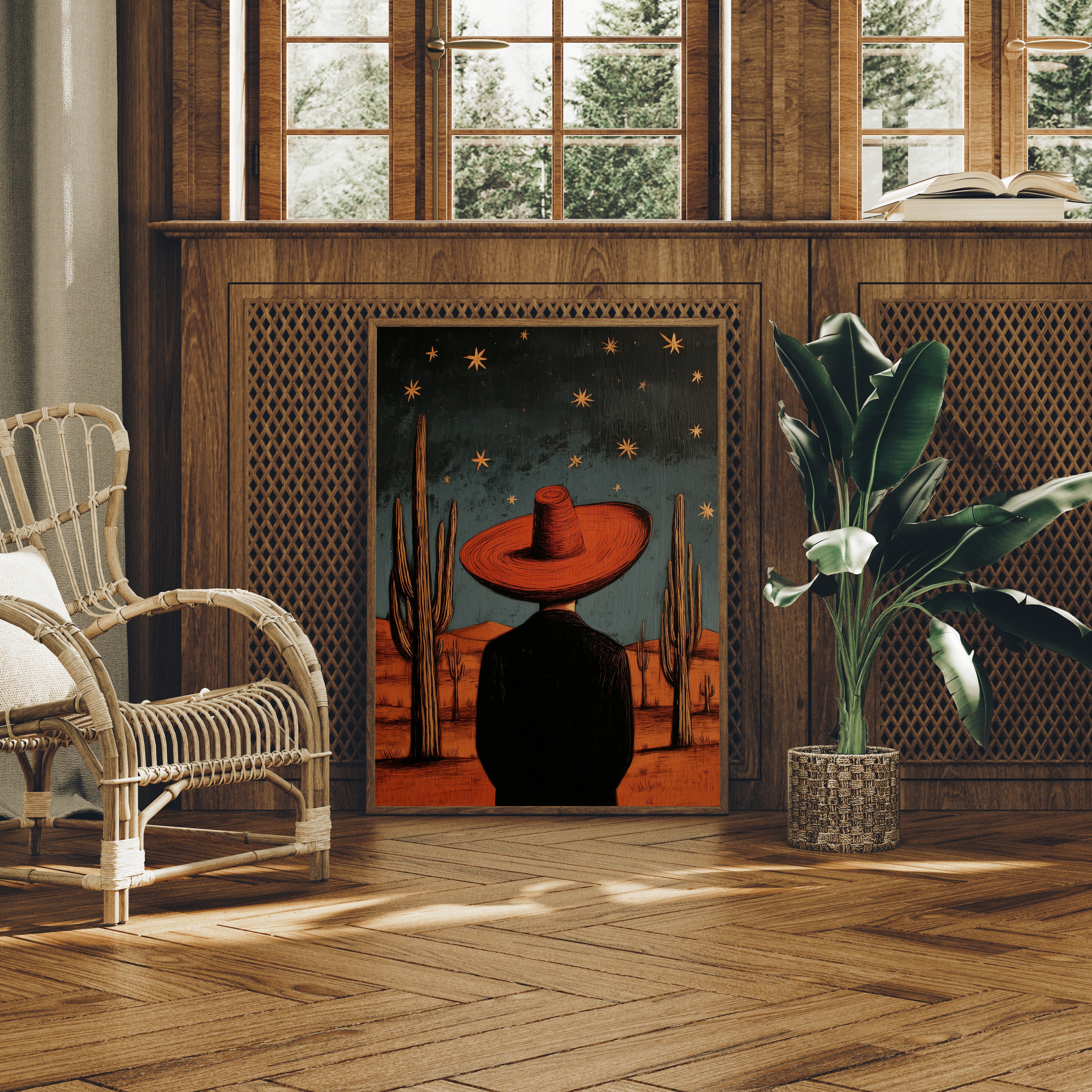 A lone figure gazes upward where desert stars pierce the indigo night, their sombrero silhouetted against the vast southwestern sky. This piece from our Contemporary collection marries southwestern mystique with modern artistic sensibility. The rich terracotta and deep blue palette creates a mesmerizing dance between earth and cosmos, while towering saguaros stand like ancient sentinels marking time in the endless desert. The composition invites quiet contemplation of our place in the grand tapestry of existence. Perfect for adding a touch of desert romance to a study, living room, or any space that calls for both grounding earthiness and dreamy wonder.