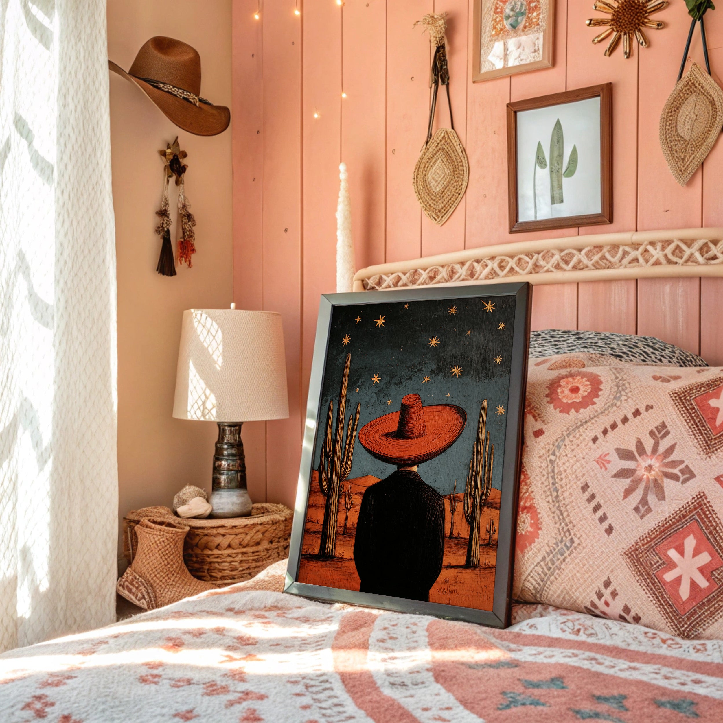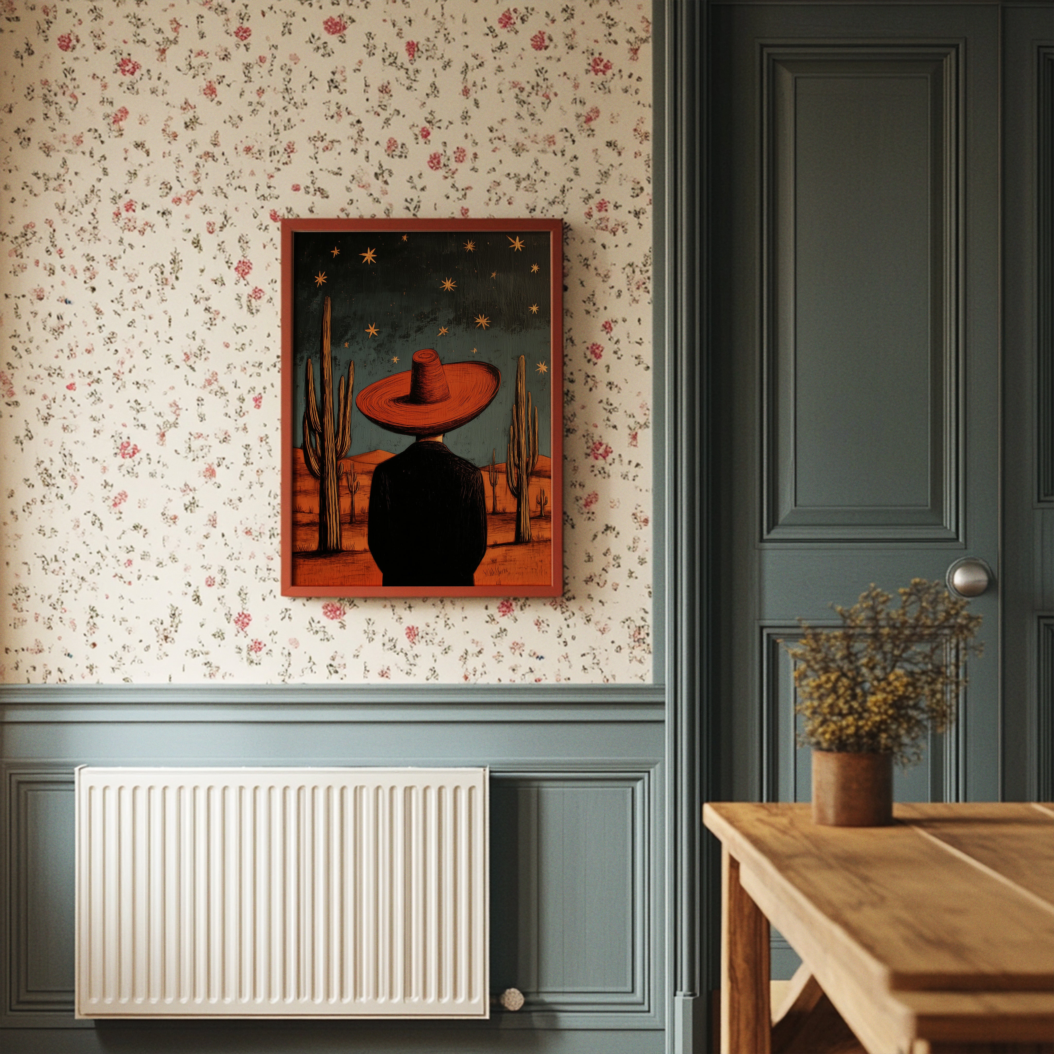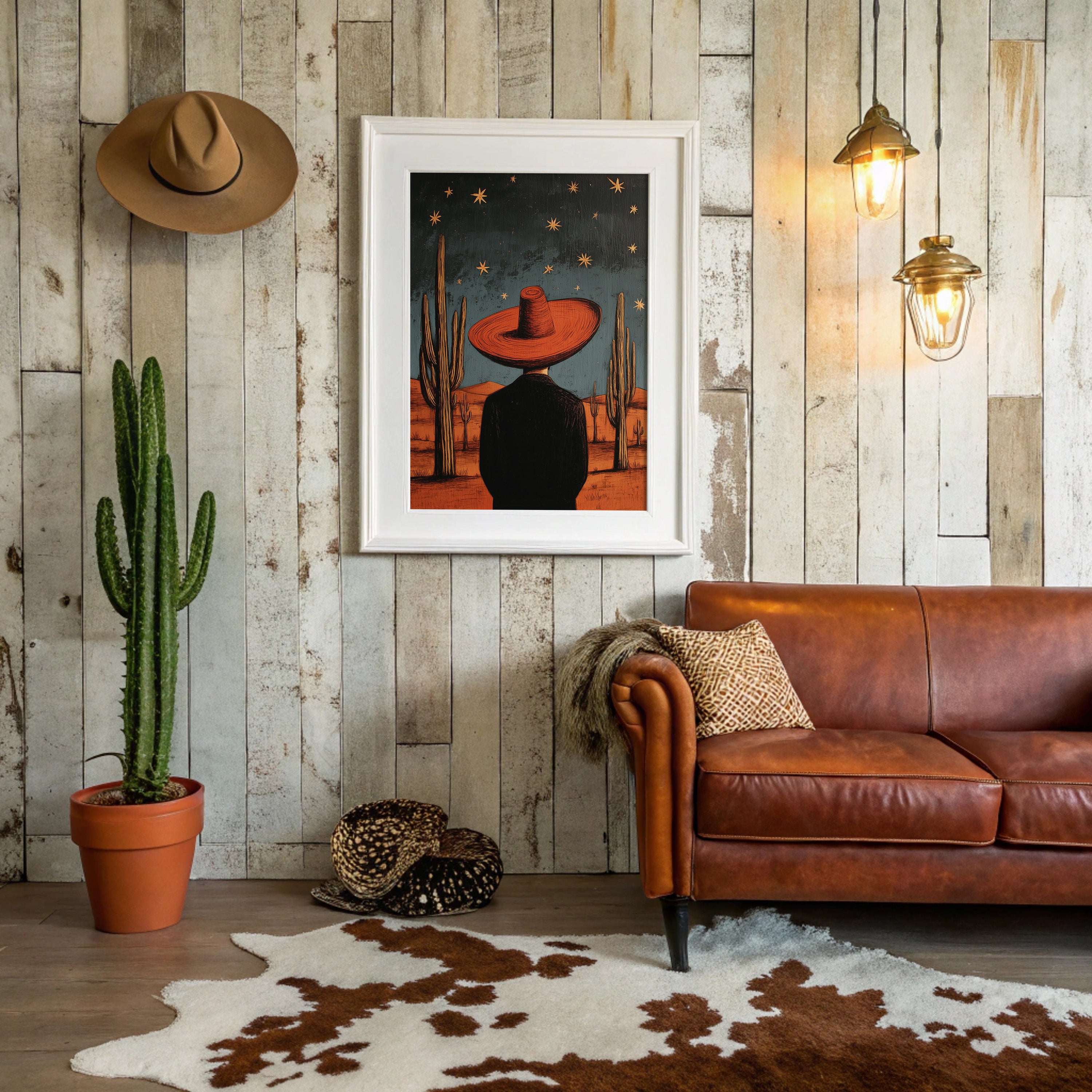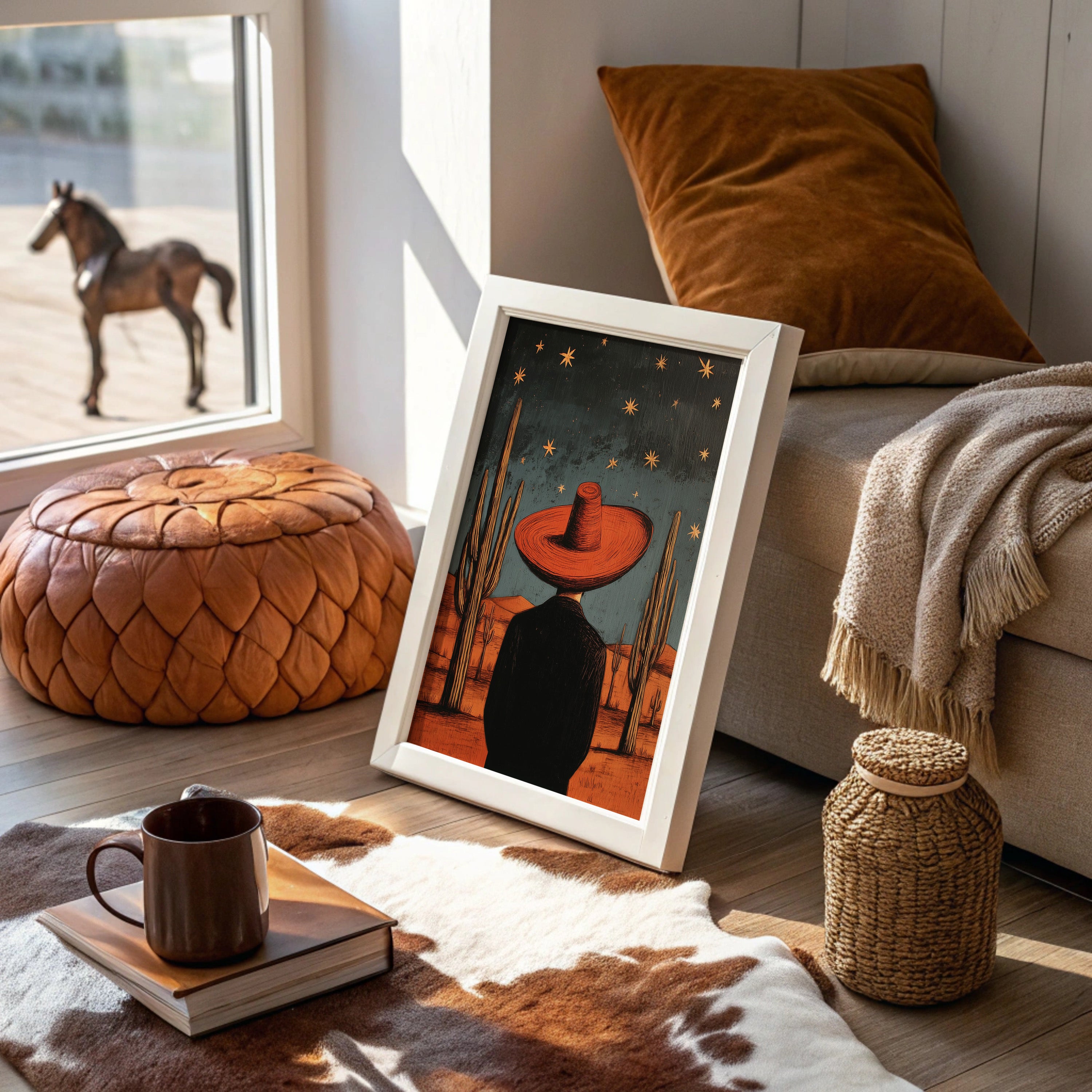 A lone figure gazes upward where desert stars pierce the indigo night, their sombrero silhouetted against the vast southwestern sky. This piece from our Contemporary collection marries southwestern mystique with modern artistic sensibility. The rich terracotta and deep blue palette creates a mesmerizing dance between earth and cosmos, while towering saguaros stand like ancient sentinels marking time in the endless desert. The composition invites quiet contemplation of our place in the grand tapestry of existence. Perfect for adding a touch of desert romance to a study, living room, or any space that calls for both grounding earthiness and dreamy wonder.
