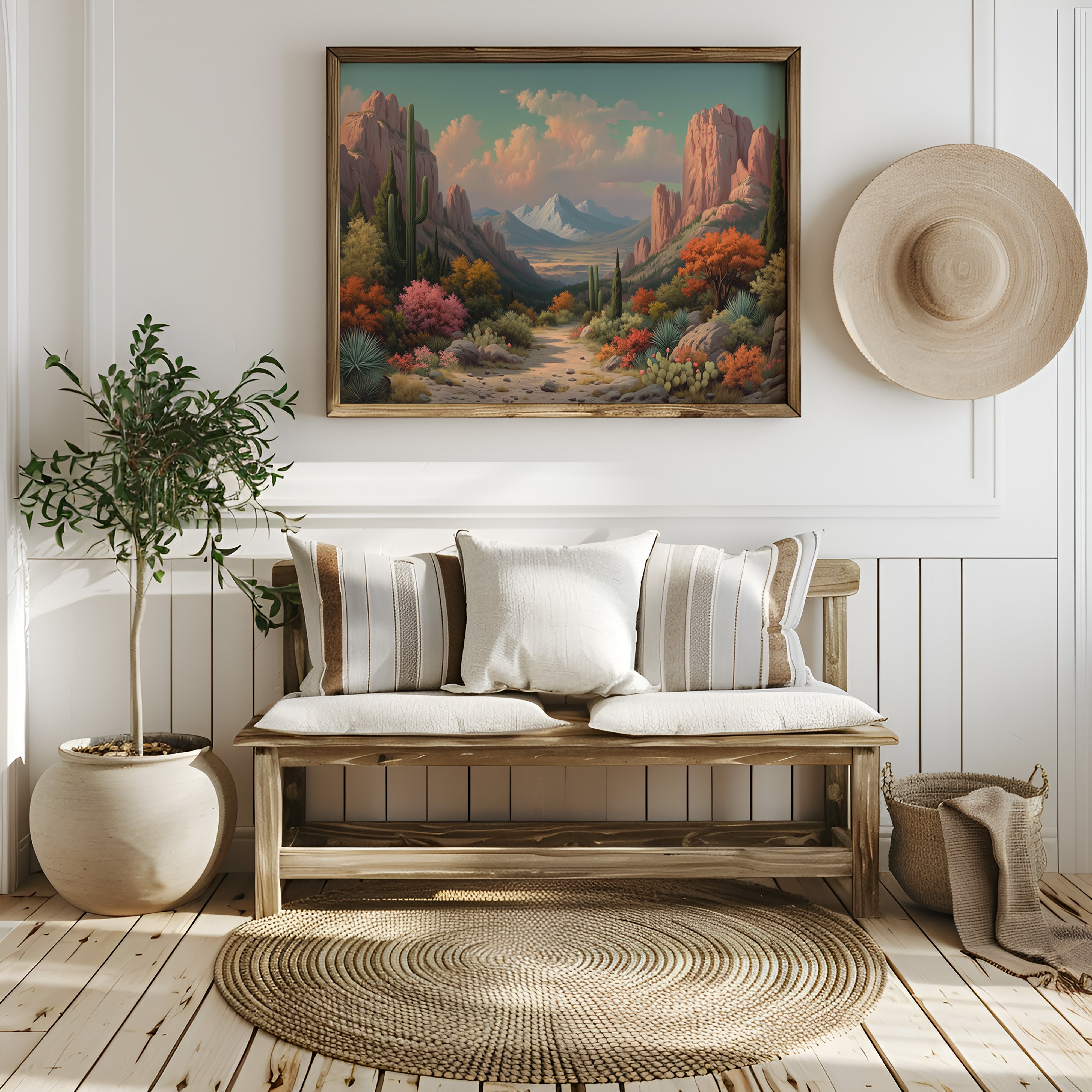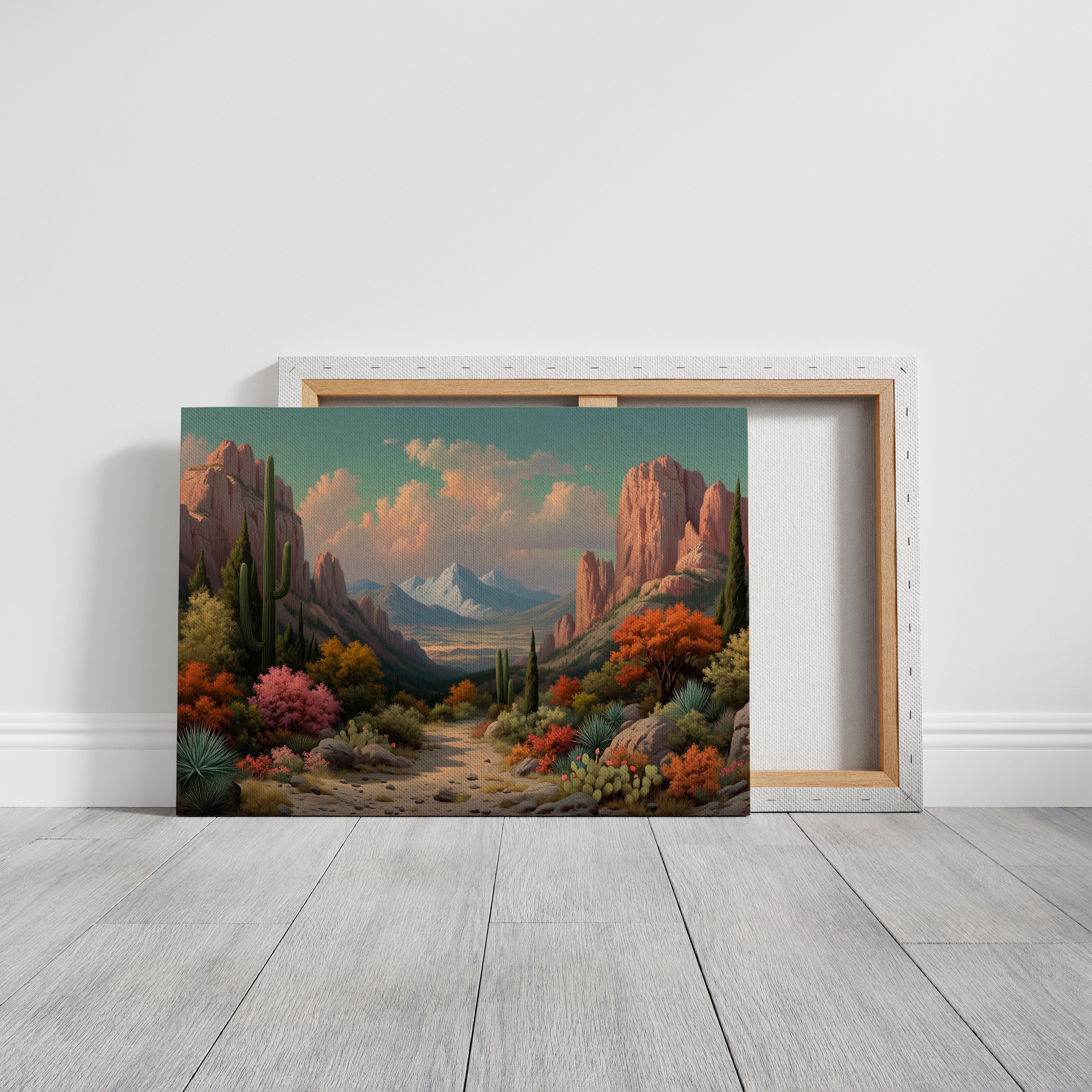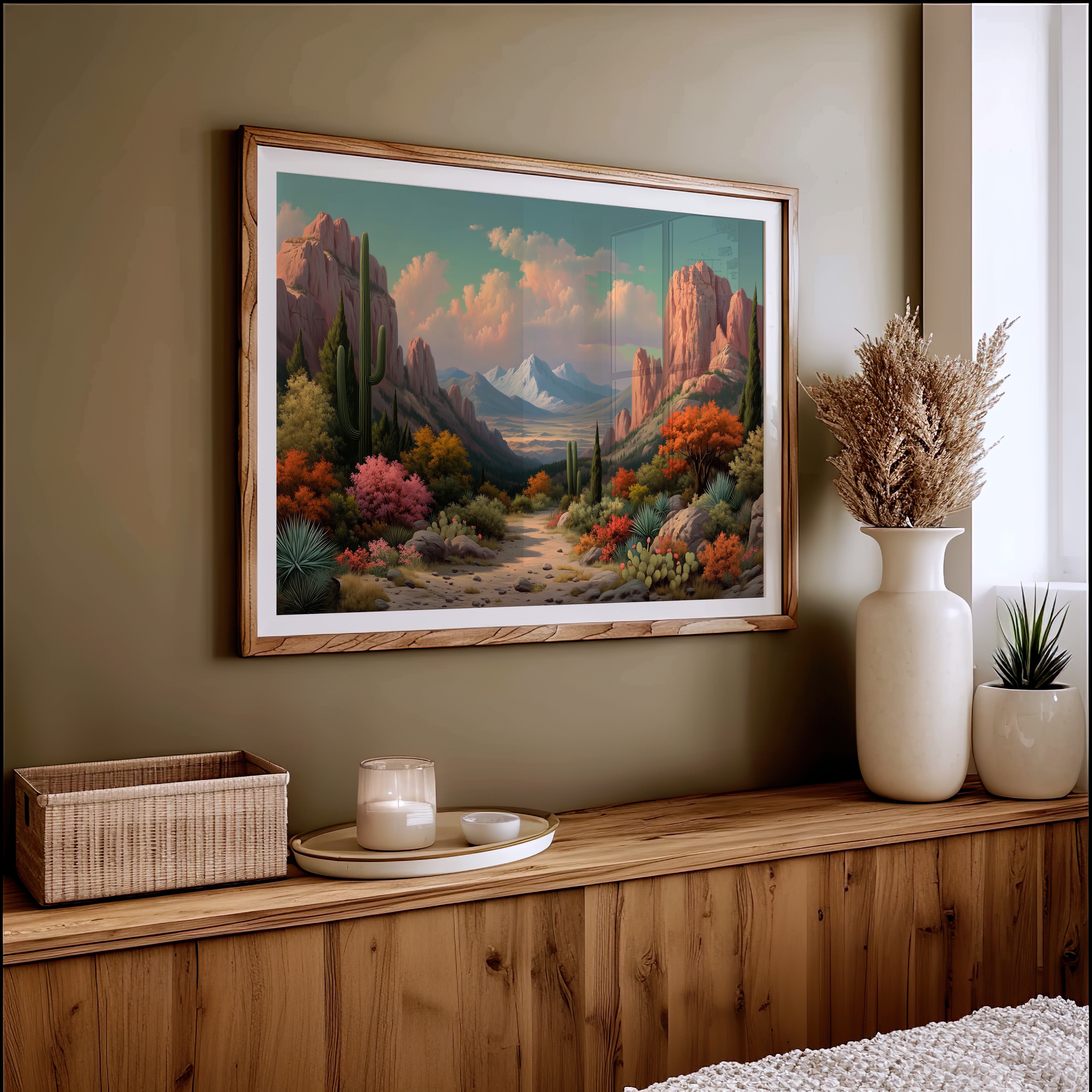 Golden light spills across ancient stone, painting red cliffs in shades of dawn while desert blooms dot the winding path with unexpected splashes of color. This piece captures the majestic beauty of the American Southwest with contemporary artistic flair. Towering saguaros stand sentinel against turquoise skies, while snow-capped peaks pierce distant horizons, creating a dramatic interplay of desert and alpine landscapes. Hardy desert flora - from prickly pear to flowering ocotillo - add rich texture and seasonal warmth to the foreground, their autumn colors blazing against weathered rock faces. This striking scene would create a captivating focal point in a great room or above a dining room mantel, bringing the expansive energy of the Southwest indoors.