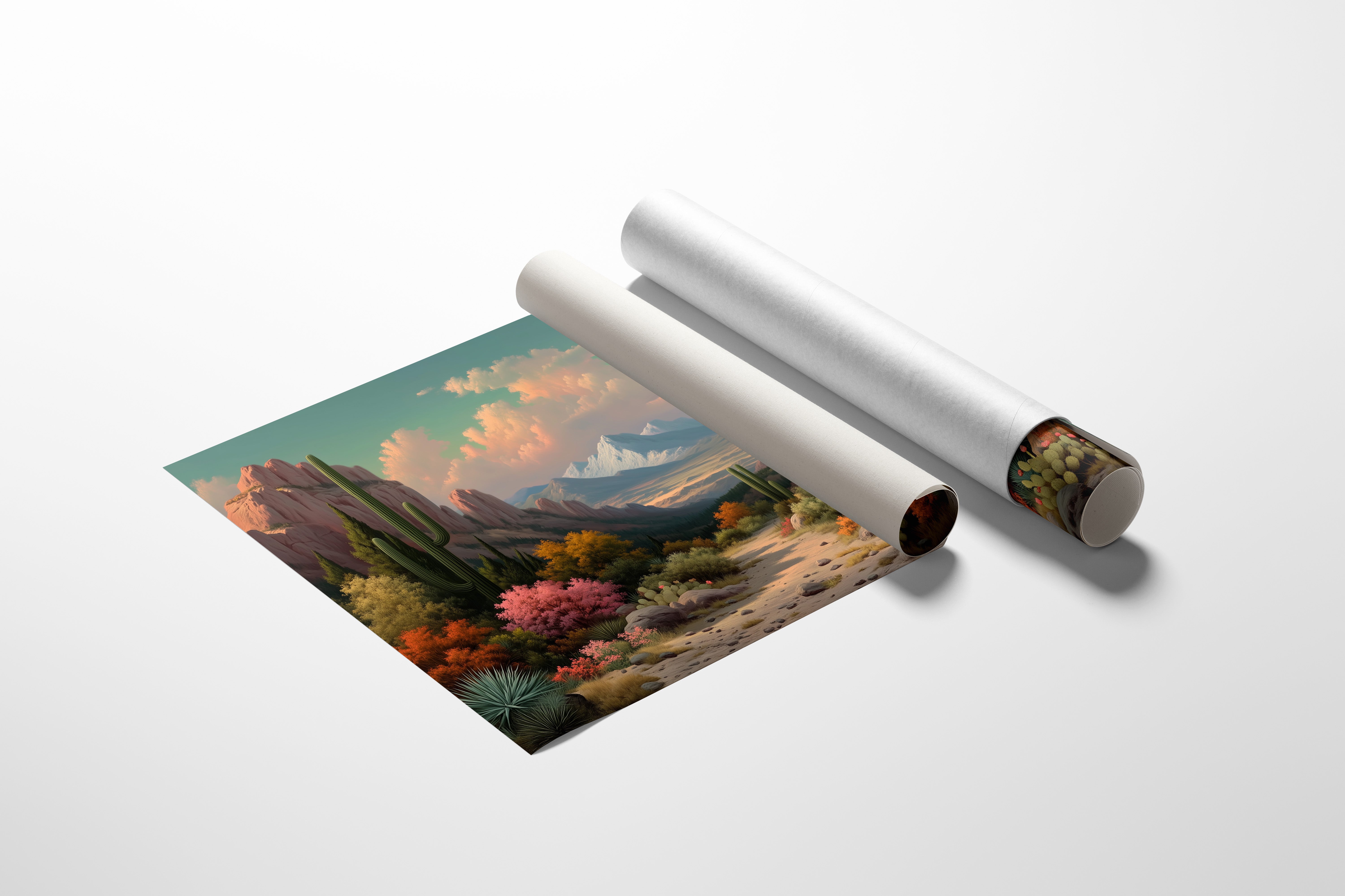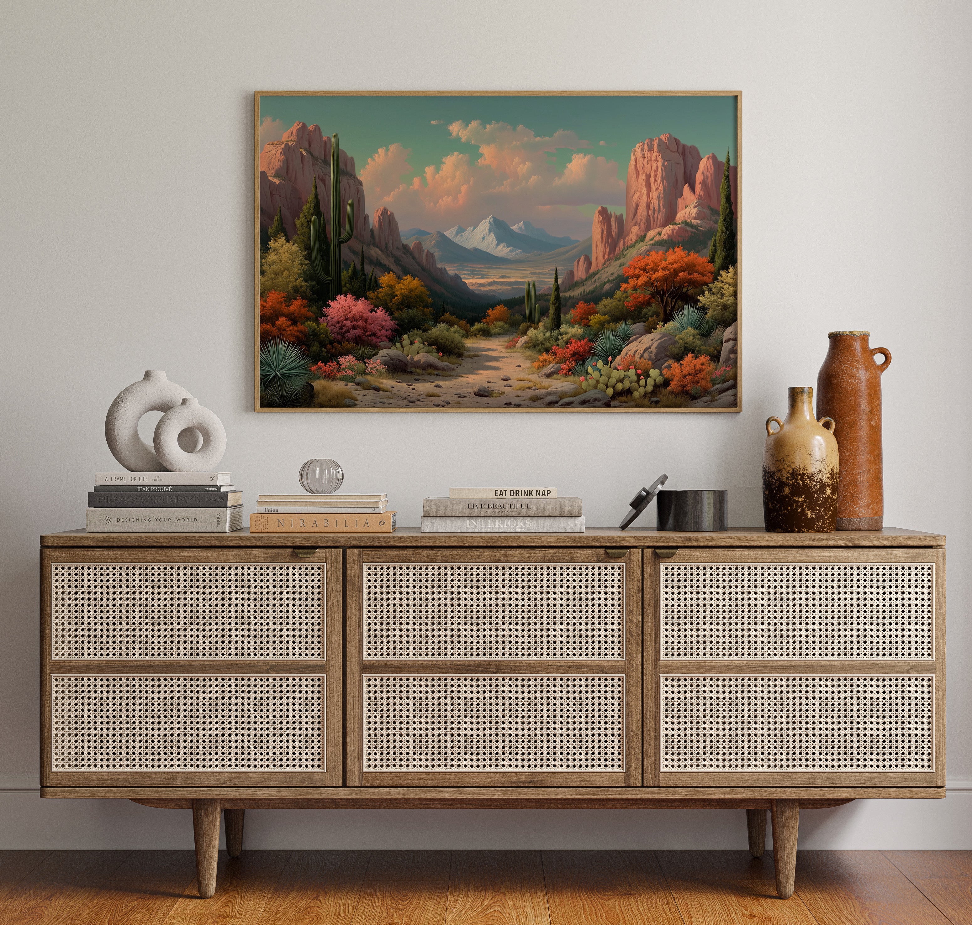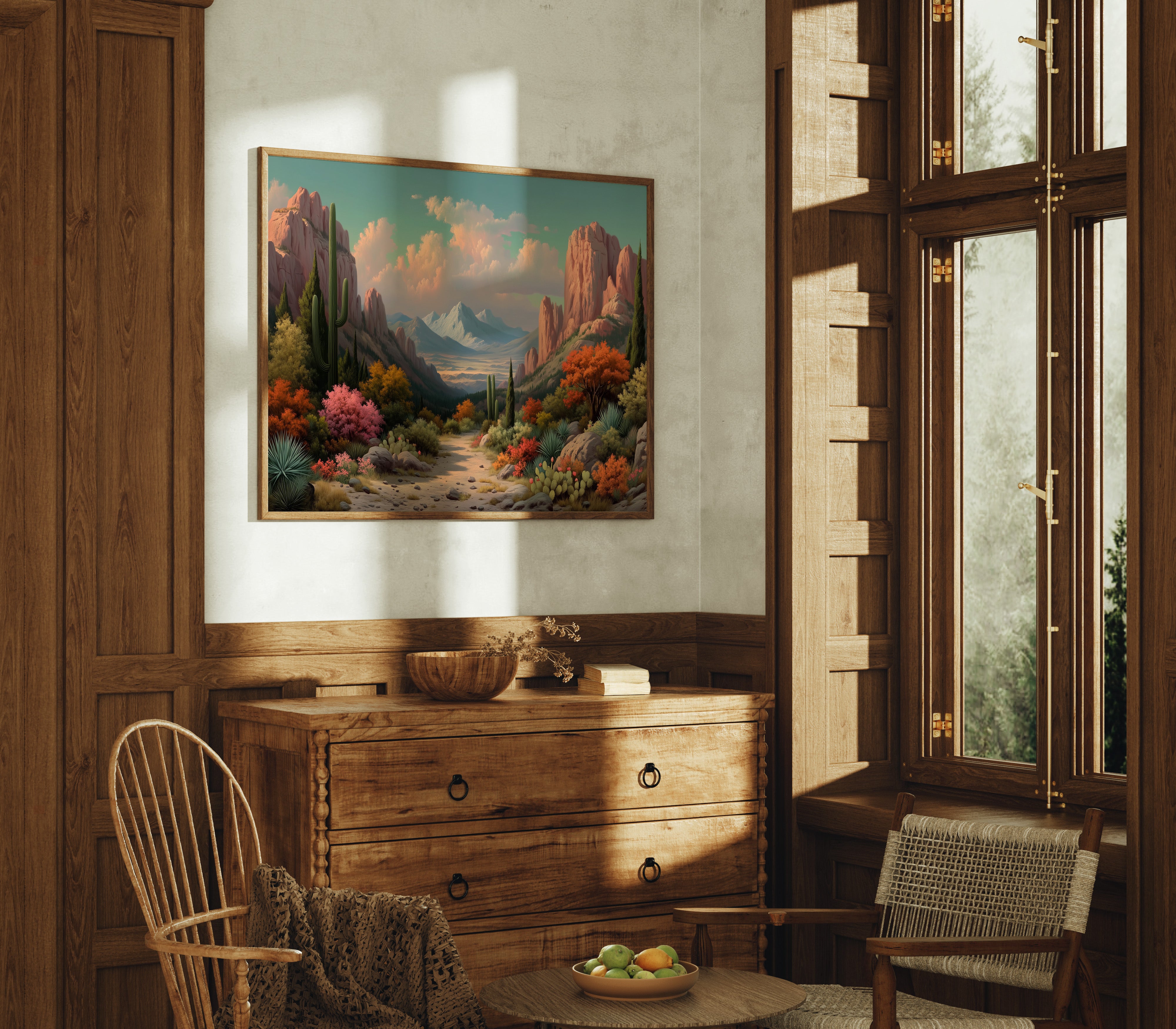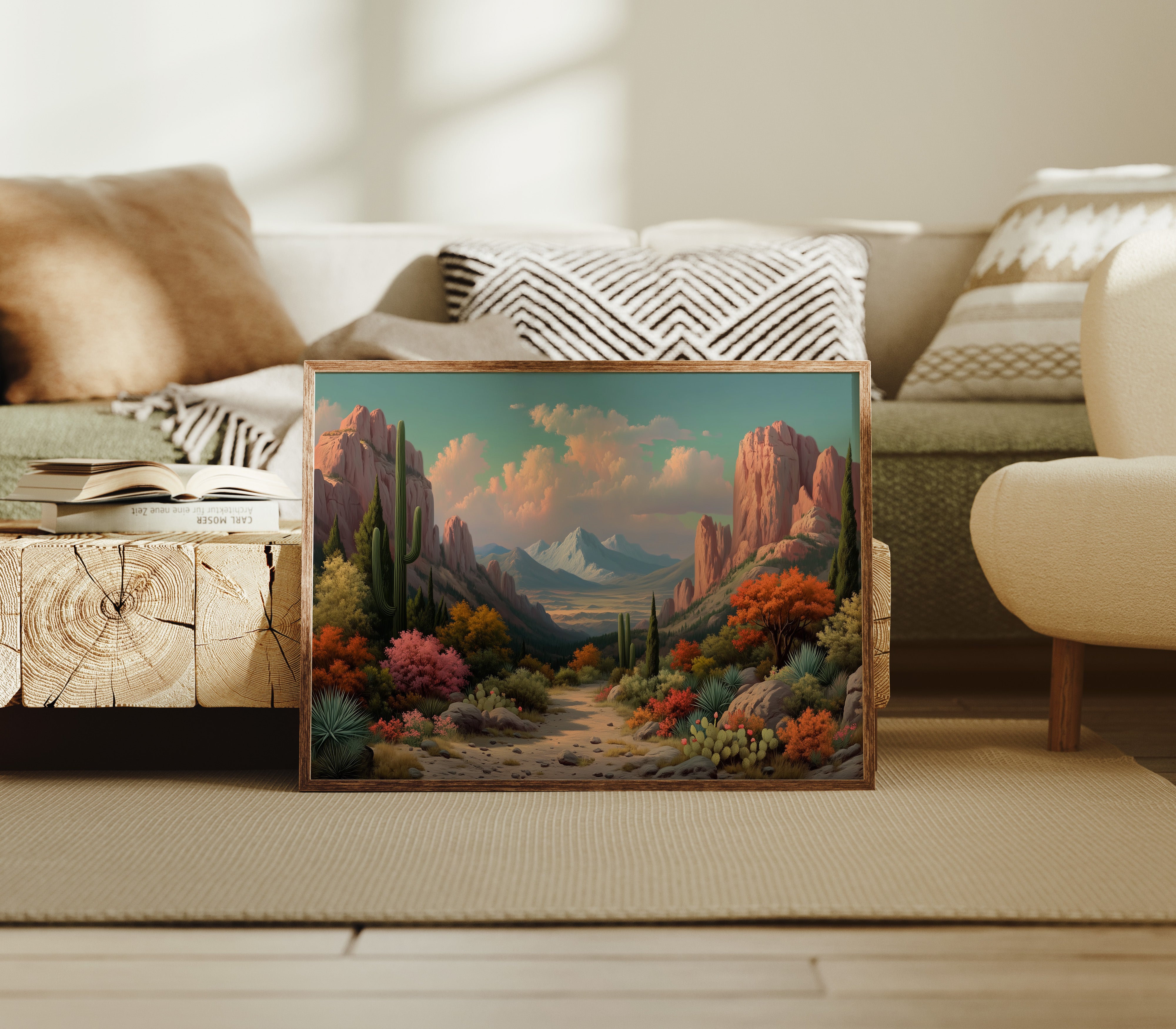 Golden light spills across ancient stone, painting red cliffs in shades of dawn while desert blooms dot the winding path with unexpected splashes of color. This piece captures the majestic beauty of the American Southwest with contemporary artistic flair. Towering saguaros stand sentinel against turquoise skies, while snow-capped peaks pierce distant horizons, creating a dramatic interplay of desert and alpine landscapes. Hardy desert flora - from prickly pear to flowering ocotillo - add rich texture and seasonal warmth to the foreground, their autumn colors blazing against weathered rock faces. This striking scene would create a captivating focal point in a great room or above a dining room mantel, bringing the expansive energy of the Southwest indoors.