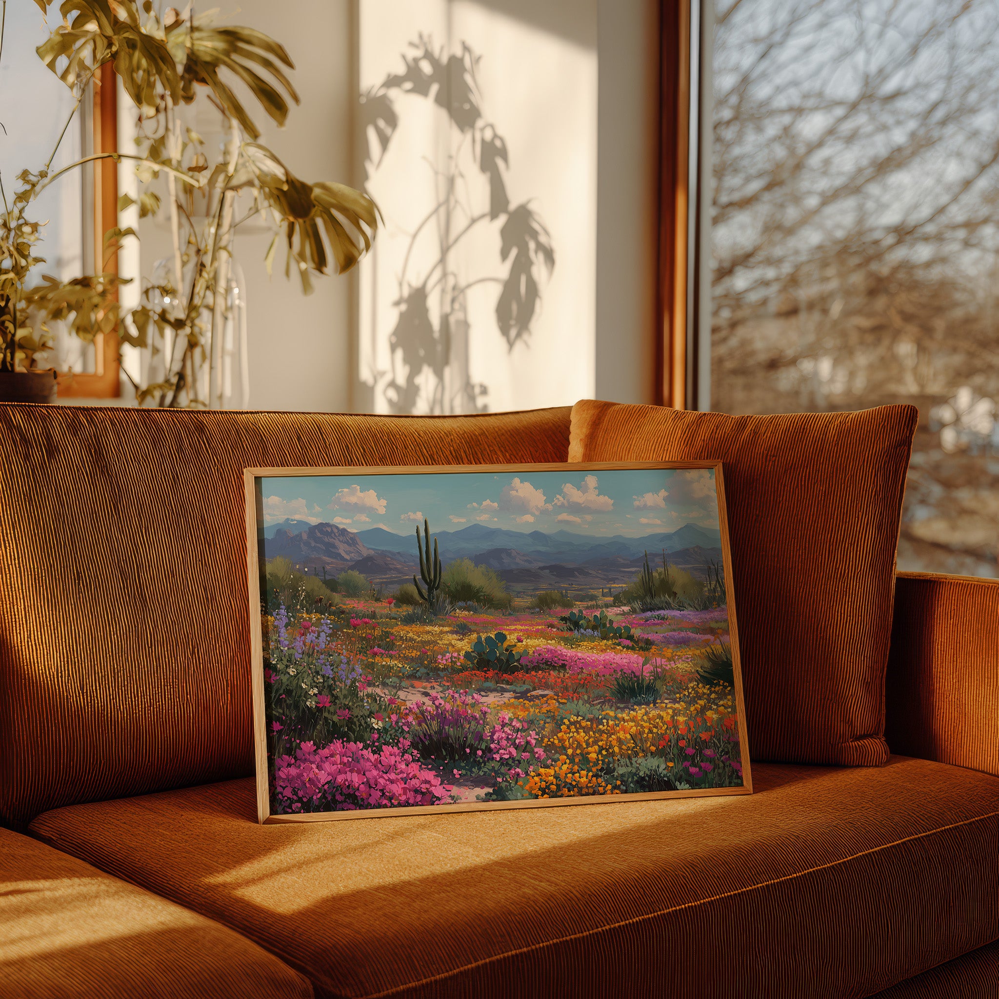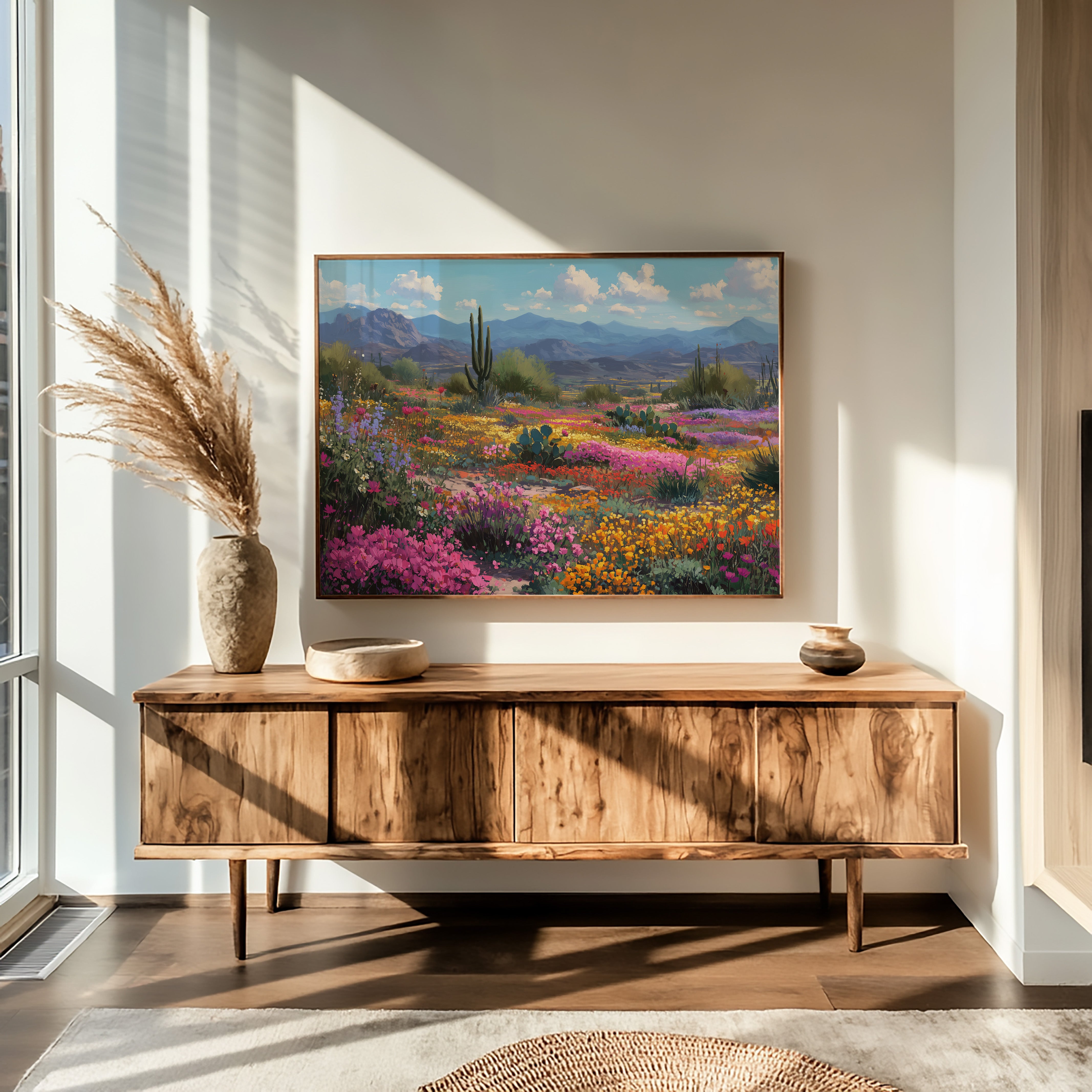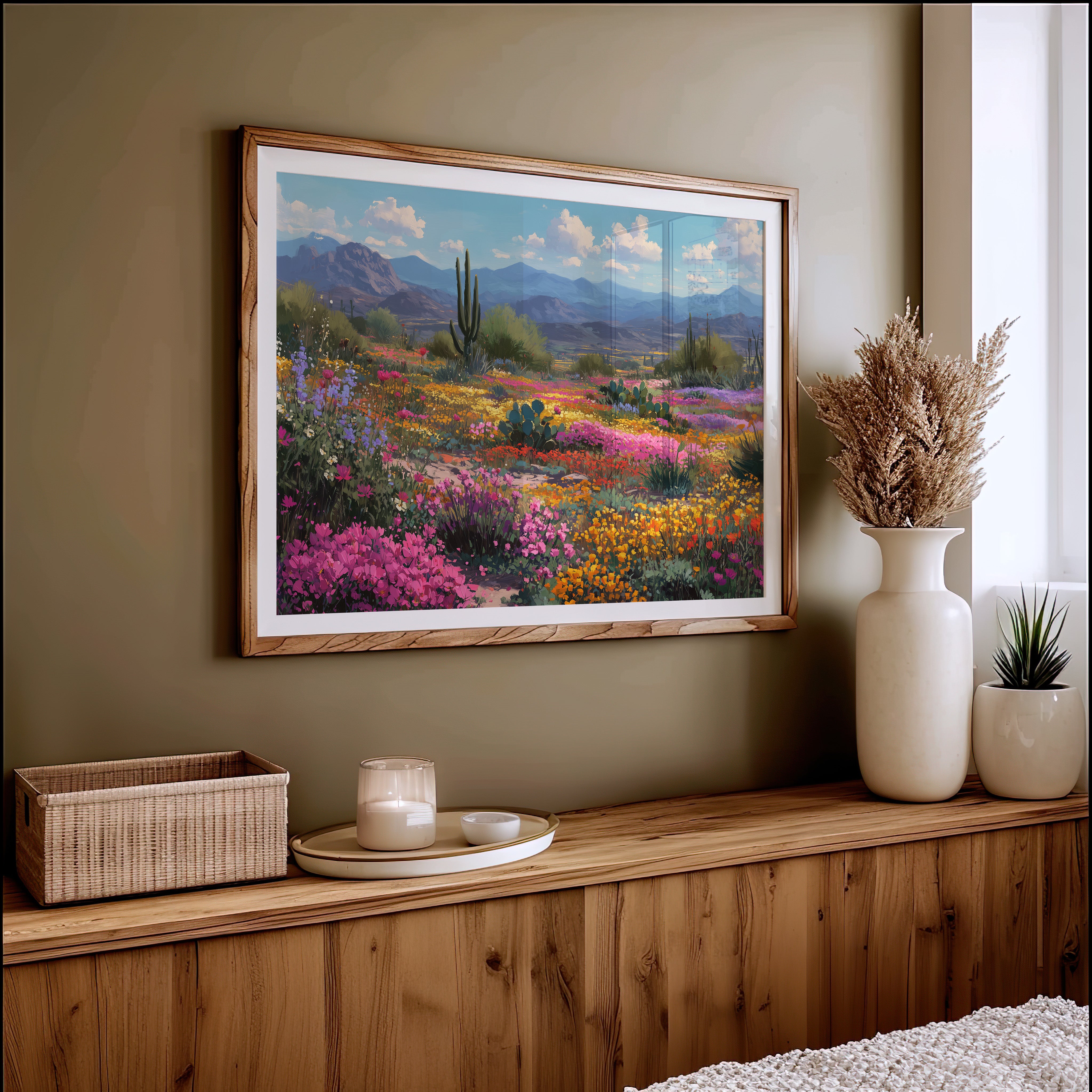 A vibrant tapestry of desert blooms unfolds beneath an azure sky, where magenta and gold wildflowers paint the landscape in bold, joyful strokes. Proud saguaro sentinels stand watch over this natural garden, their silhouettes stark against distant purple mountains that fade into a dreamy horizon. The scene captures the fleeting magic of desert spring, when the typically austere landscape transforms into a celebration of color and life. This striking desert panorama brings dramatic natural beauty and a sense of expansive southwestern charm to any space, making it an ideal focal point for living rooms, dining areas, or any room seeking to capture the bold spirit of the American Southwest.