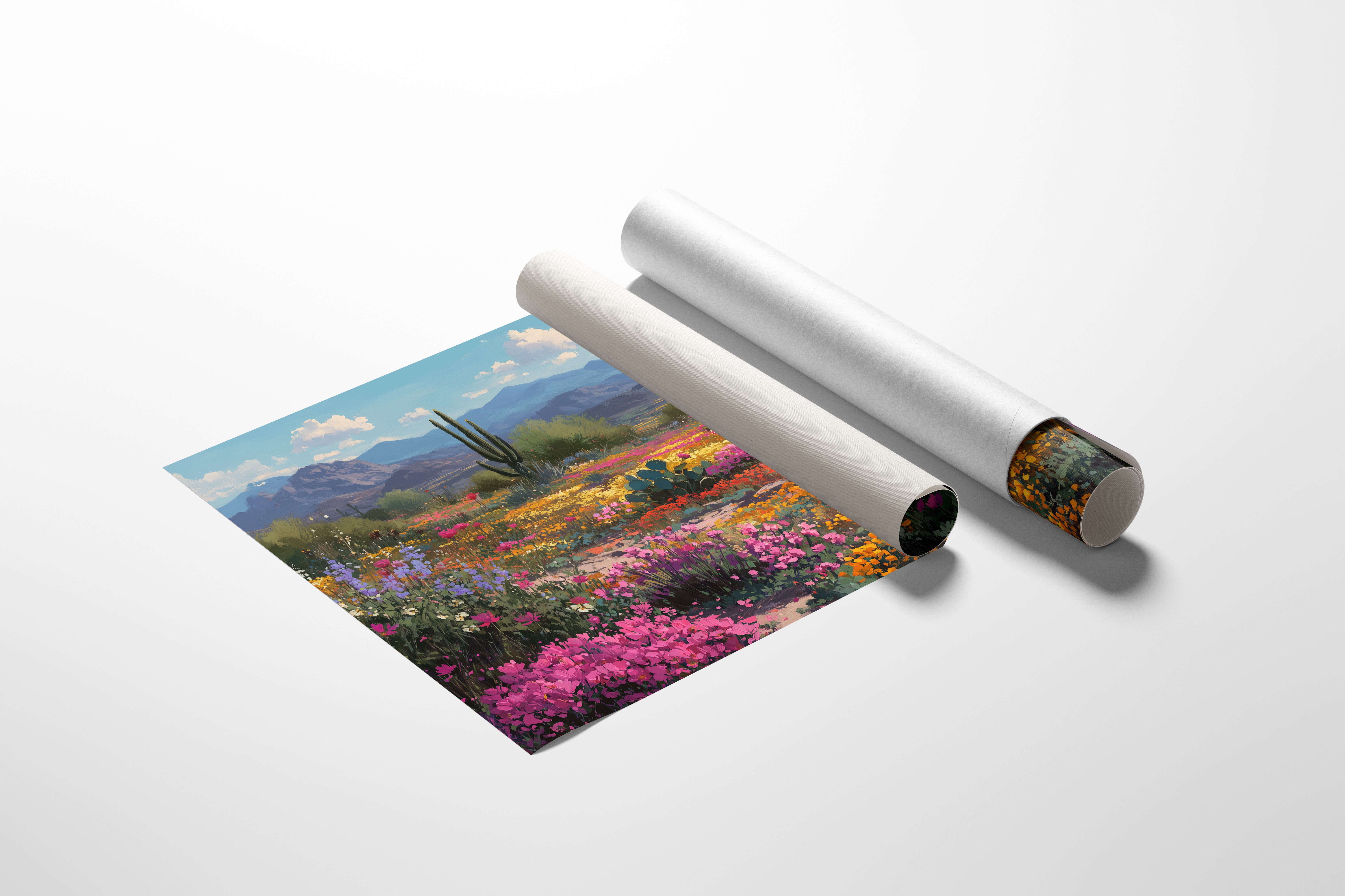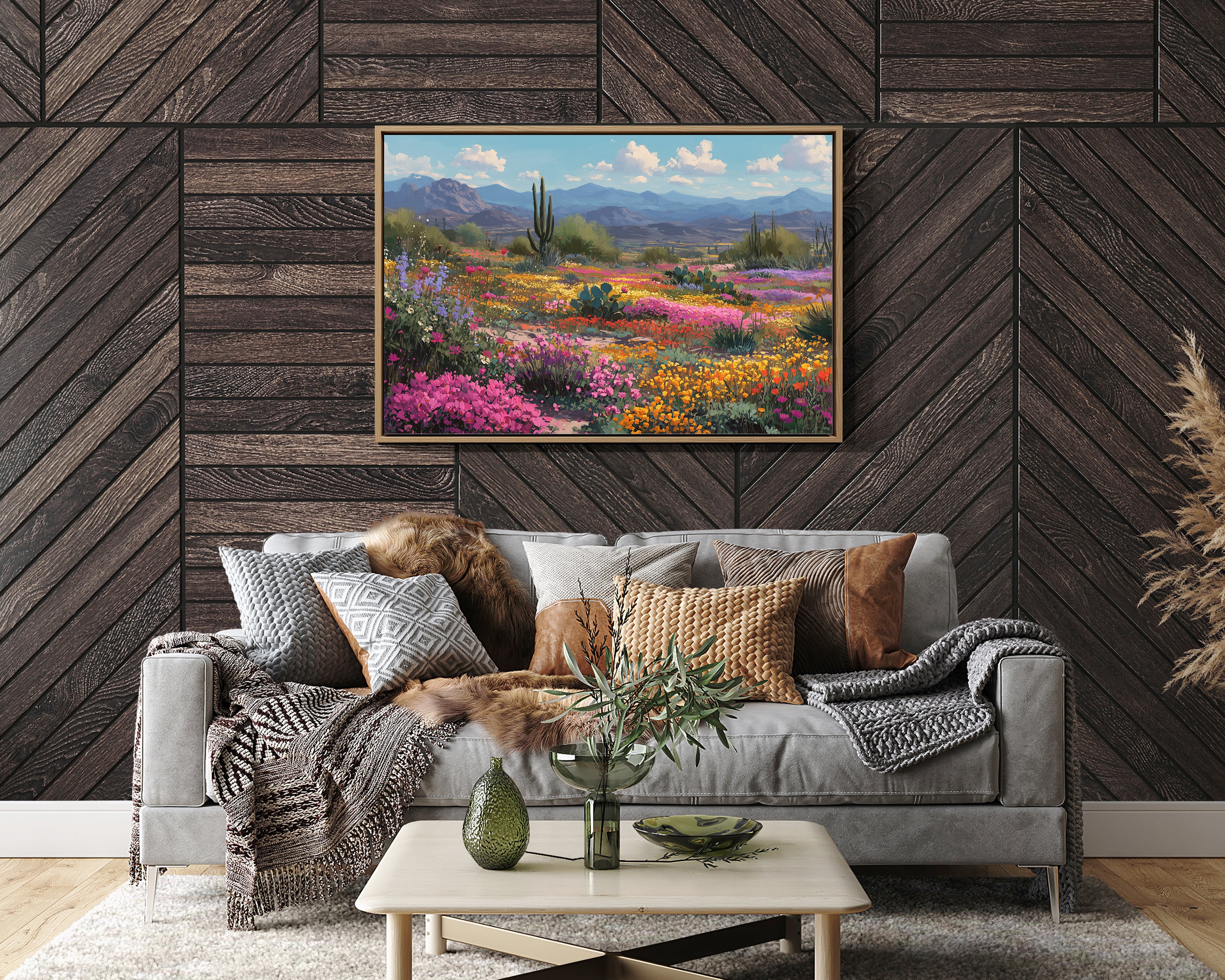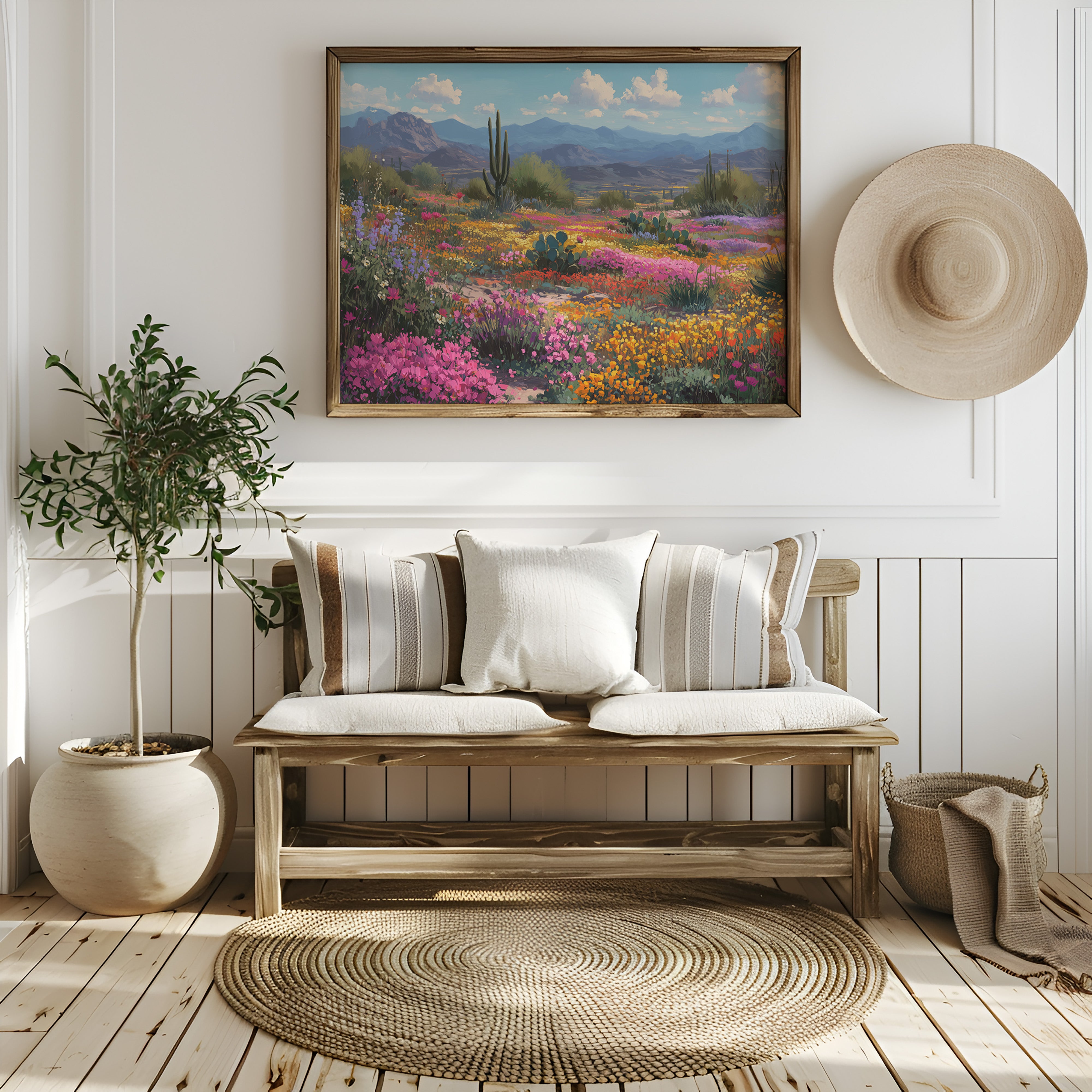 A vibrant tapestry of desert blooms unfolds beneath an azure sky, where magenta and gold wildflowers paint the landscape in bold, joyful strokes. Proud saguaro sentinels stand watch over this natural garden, their silhouettes stark against distant purple mountains that fade into a dreamy horizon. The scene captures the fleeting magic of desert spring, when the typically austere landscape transforms into a celebration of color and life. This striking desert panorama brings dramatic natural beauty and a sense of expansive southwestern charm to any space, making it an ideal focal point for living rooms, dining areas, or any room seeking to capture the bold spirit of the American Southwest.
