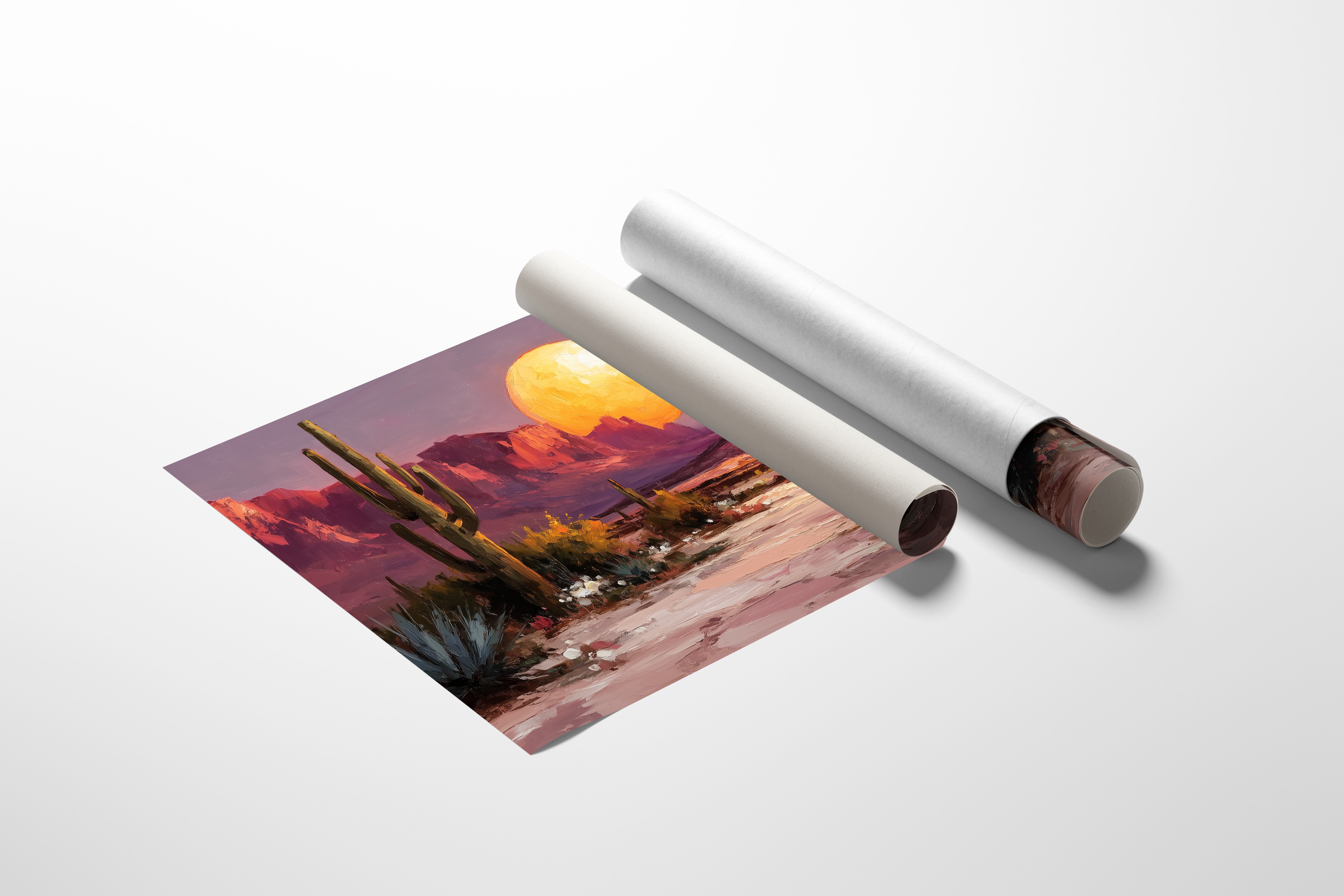 A magnificent golden orb rises between rugged canyon walls, casting warm honey light across the desert floor. This piece captures the mystical essence of the Contemporary Southwest collection, where traditional landscapes meet modern artistic expression. Towering saguaro sentinels stand proud against a dusky purple sky, while desert wildflowers and agave plants dot the foreground in whites and sage greens. The rich palette of sunset oranges and deep magentas creates a dreamlike atmosphere where reality and imagination merge. This statement piece would create an enchanting focal point in a modern living room or add dramatic flair to a minimalist dining space, inviting conversations about nature's grandeur. The interplay of light and shadow invites quiet contemplation of desert mysteries.