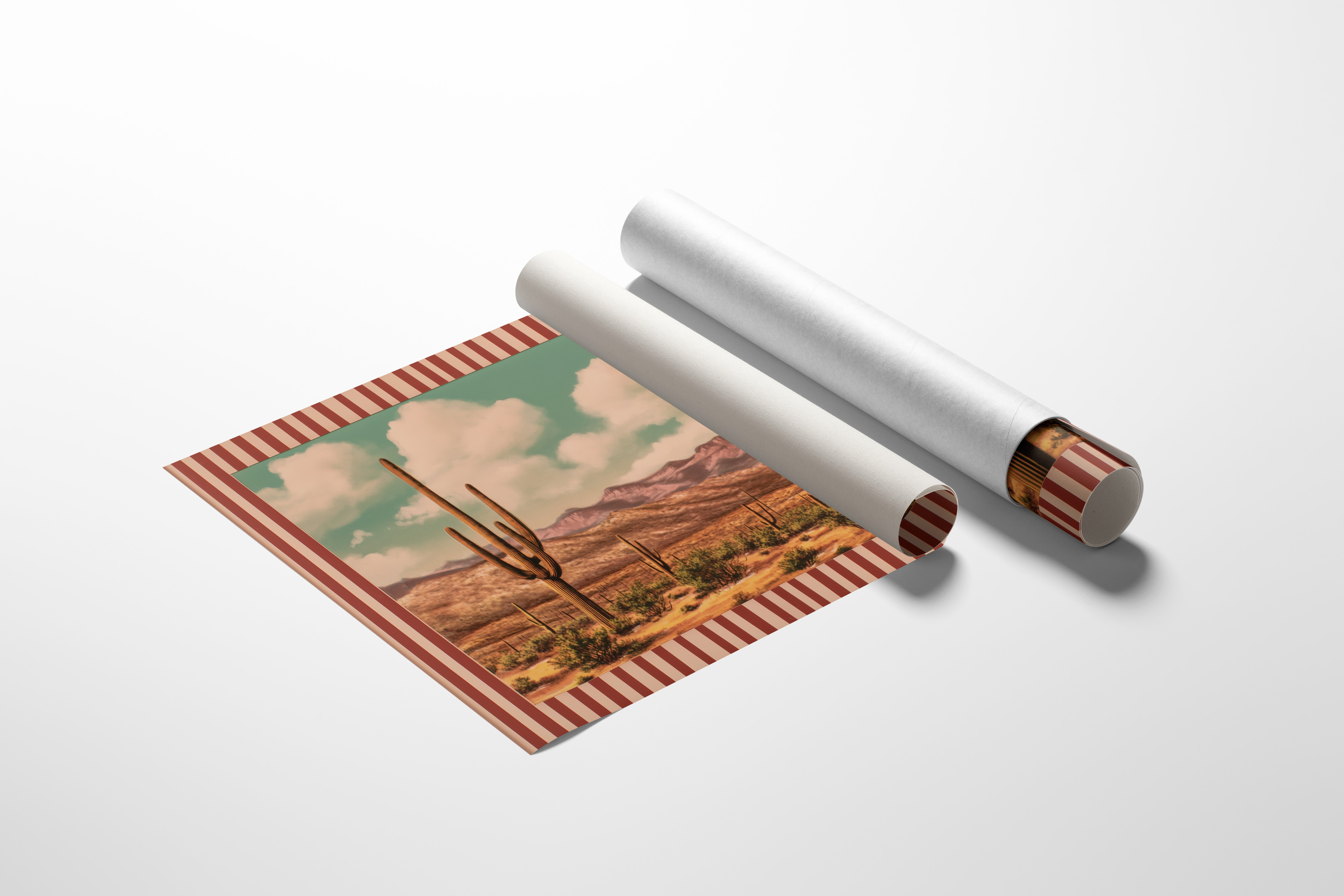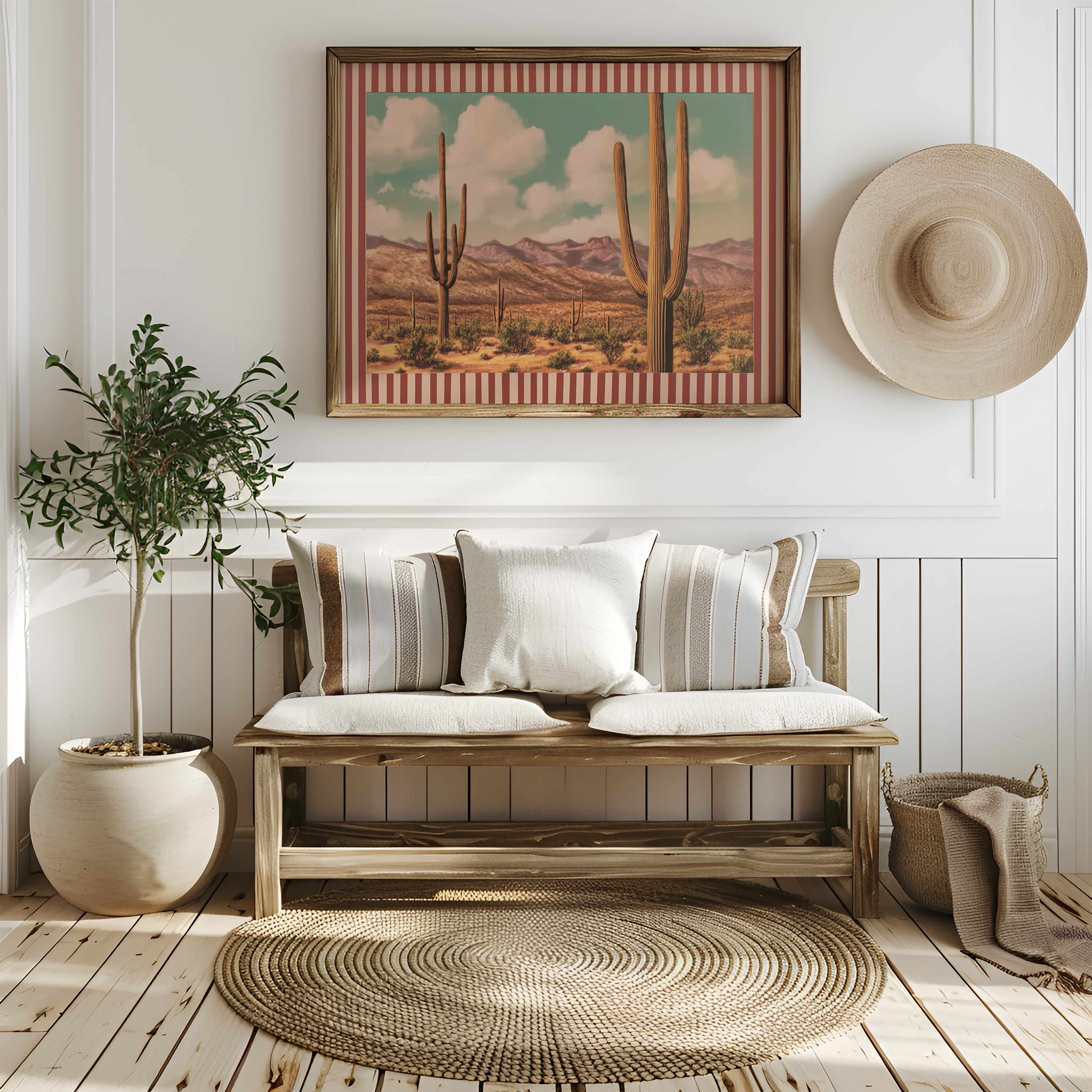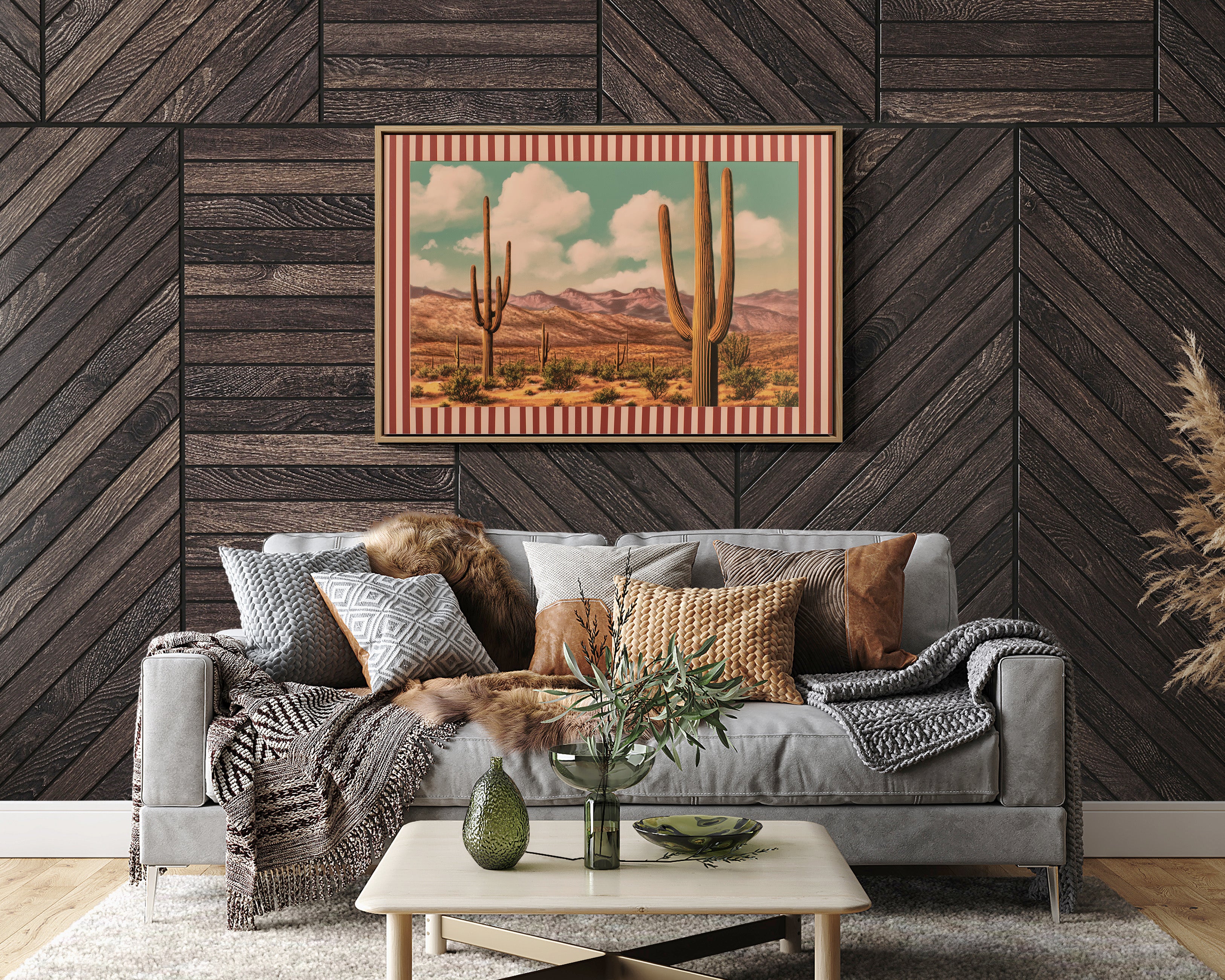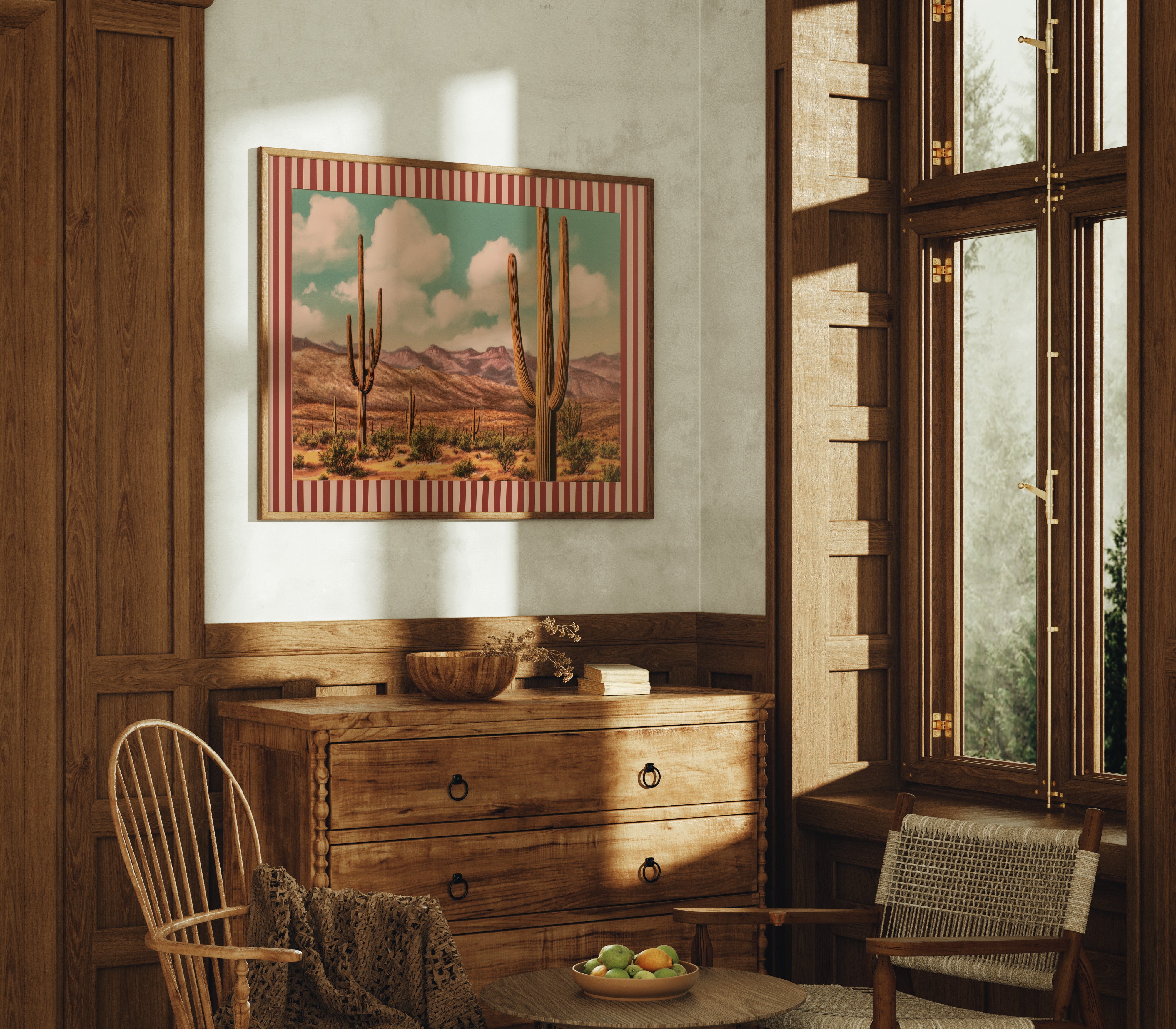 Towering sentinels pierce the desert sky, their ancient silhouettes reaching toward cotton-candy clouds in a turquoise expanse. This contemporary interpretation captures the timeless majesty of the American Southwest. Golden light bathes the landscape in warm hues, while distant purple mountains create a dramatic backdrop for the iconic saguaro cacti. The composition balances the vertical strength of the desert giants with the soft, horizontal flow of the desert floor. Perfect for adding a sense of adventure and natural grandeur to a living room or office space, this piece invites quiet contemplation of wild spaces. The gentle color palette brings both warmth and serenity to any interior.