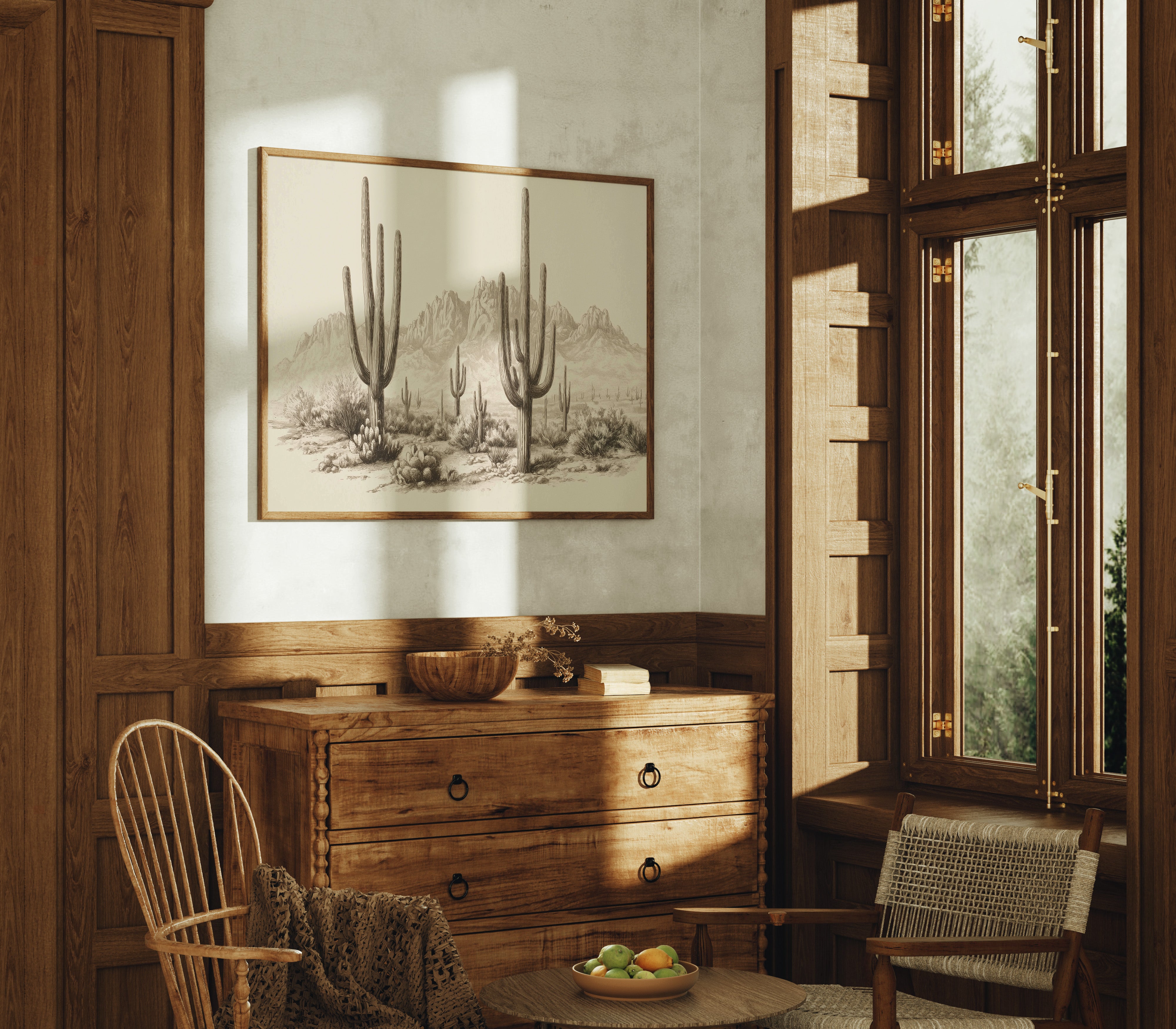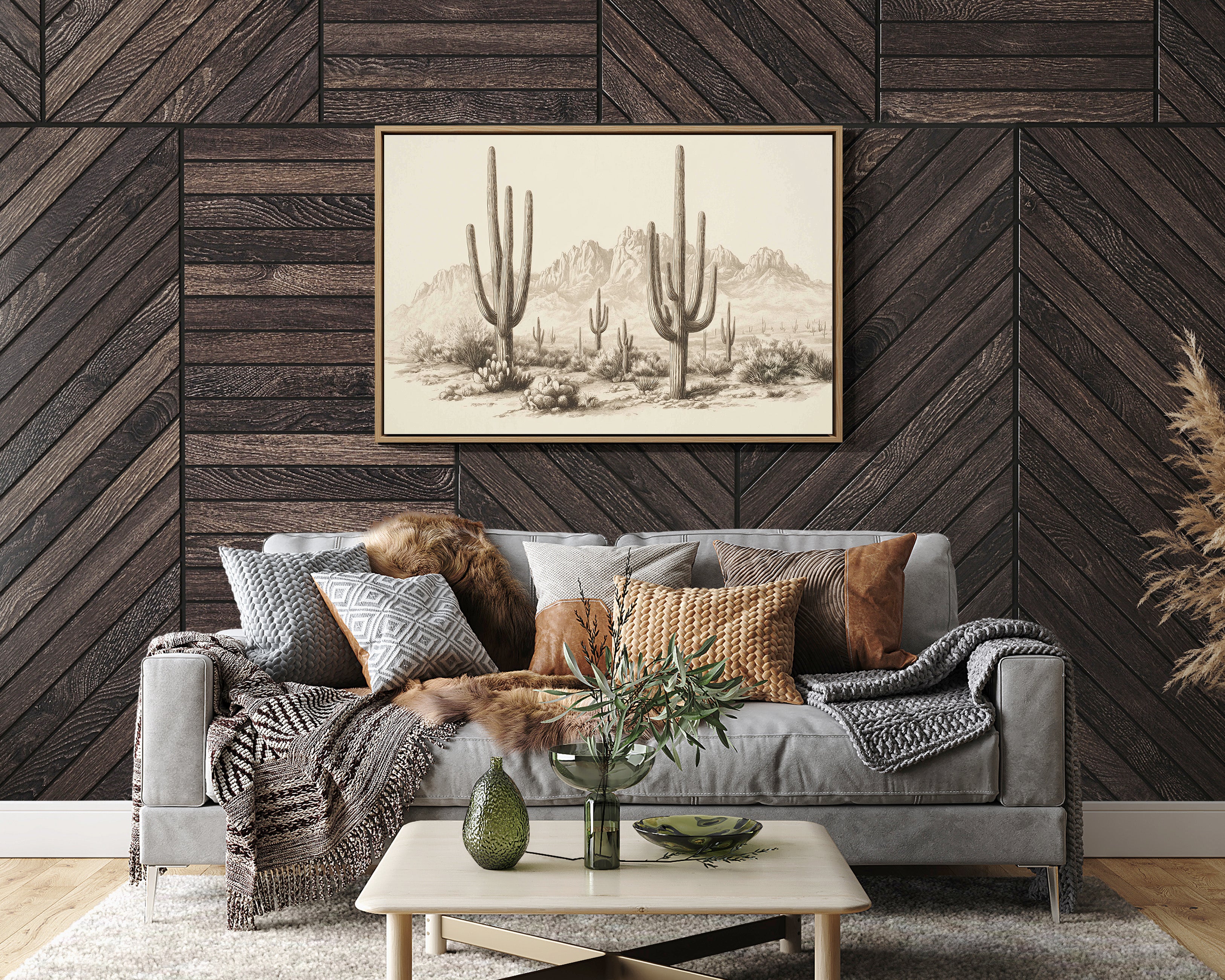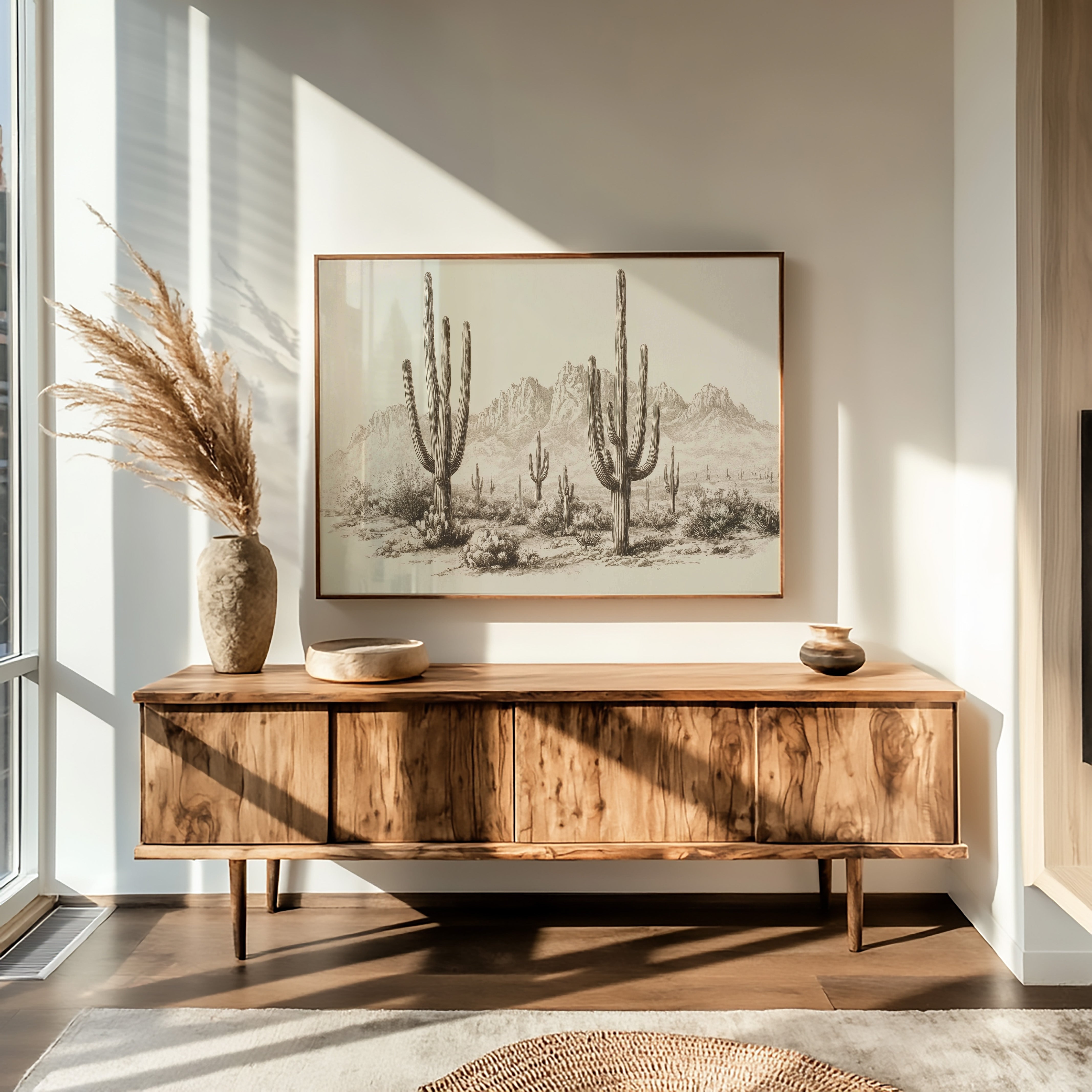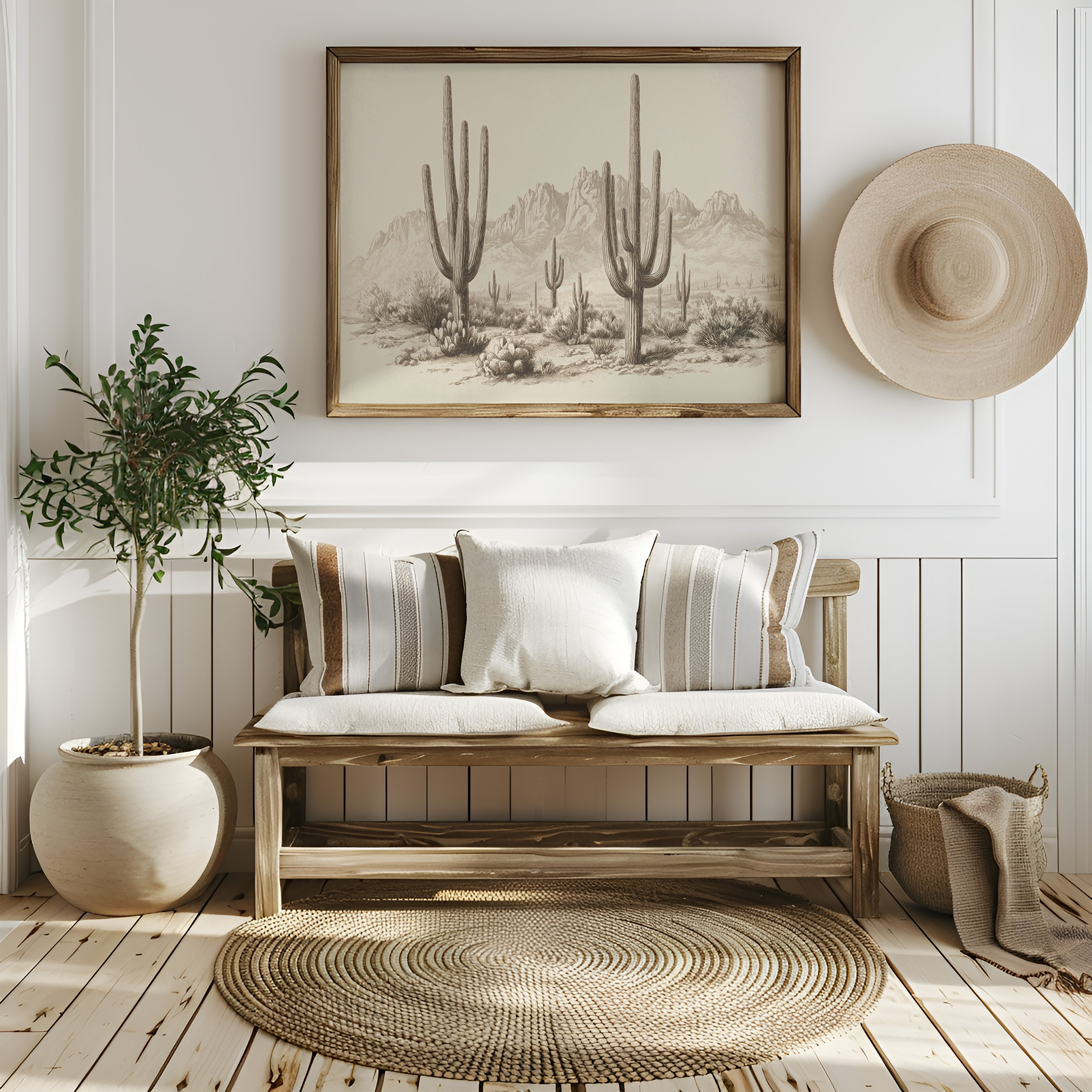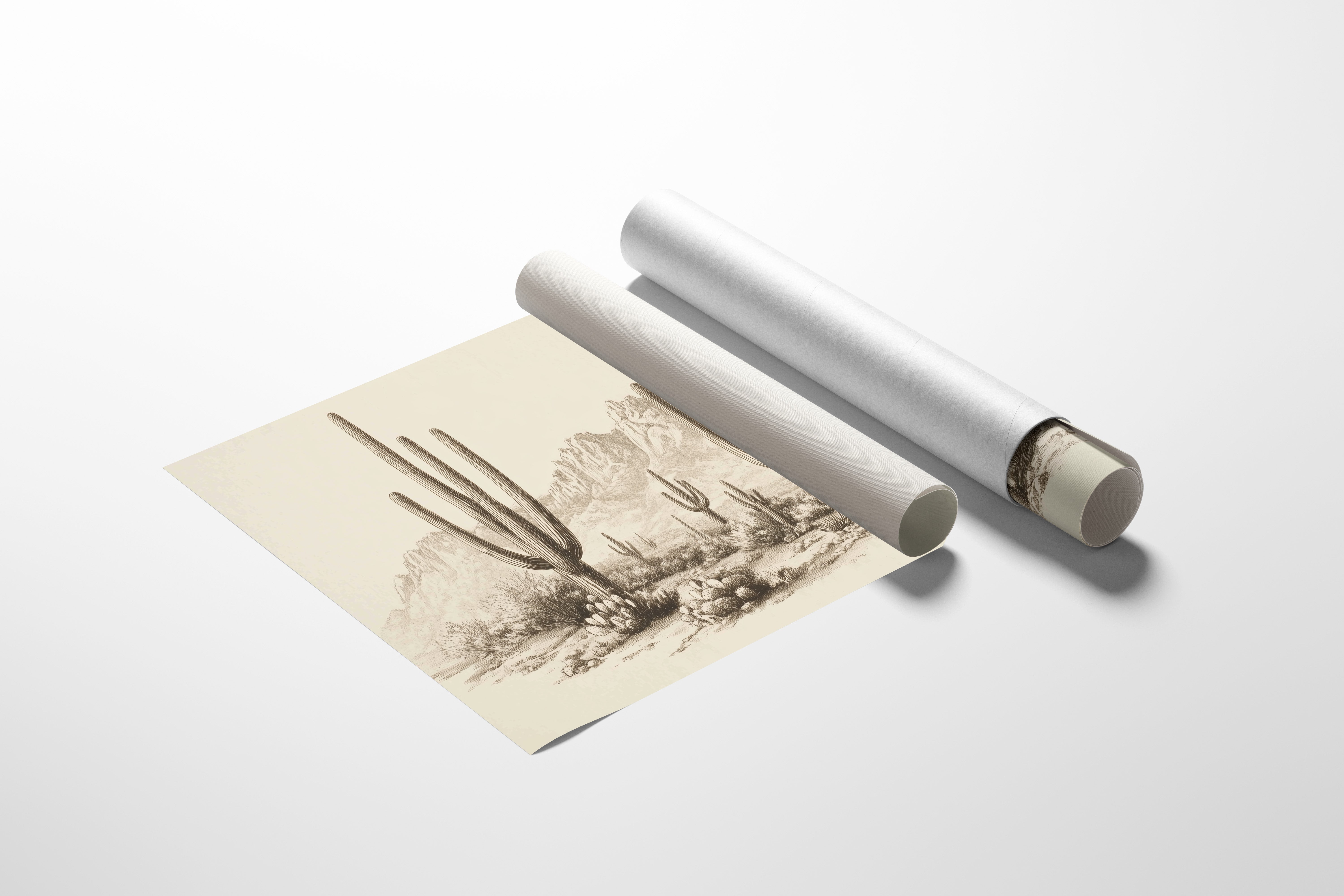 Towering sentinels stand patient and proud against a backdrop of rugged peaks, their silhouettes etched in timeless sepia tones. This piece captures the essence of contemporary desert minimalism, where nature's raw beauty meets artistic restraint. Majestic saguaro cacti rise from the desert floor like living monuments, their arms reaching skyward while barrel cacti cluster at their feet, creating a stunning composition of vertical lines and organic forms. The subtle gradients and fine line work transform this desert scene into a meditation on permanence and change. This striking piece brings southwestern serenity to modern spaces, particularly suited for a dining room or entryway where its quiet dignity can set the tone. Each viewing reveals new details in the delicate rendering of desert textures and forms.