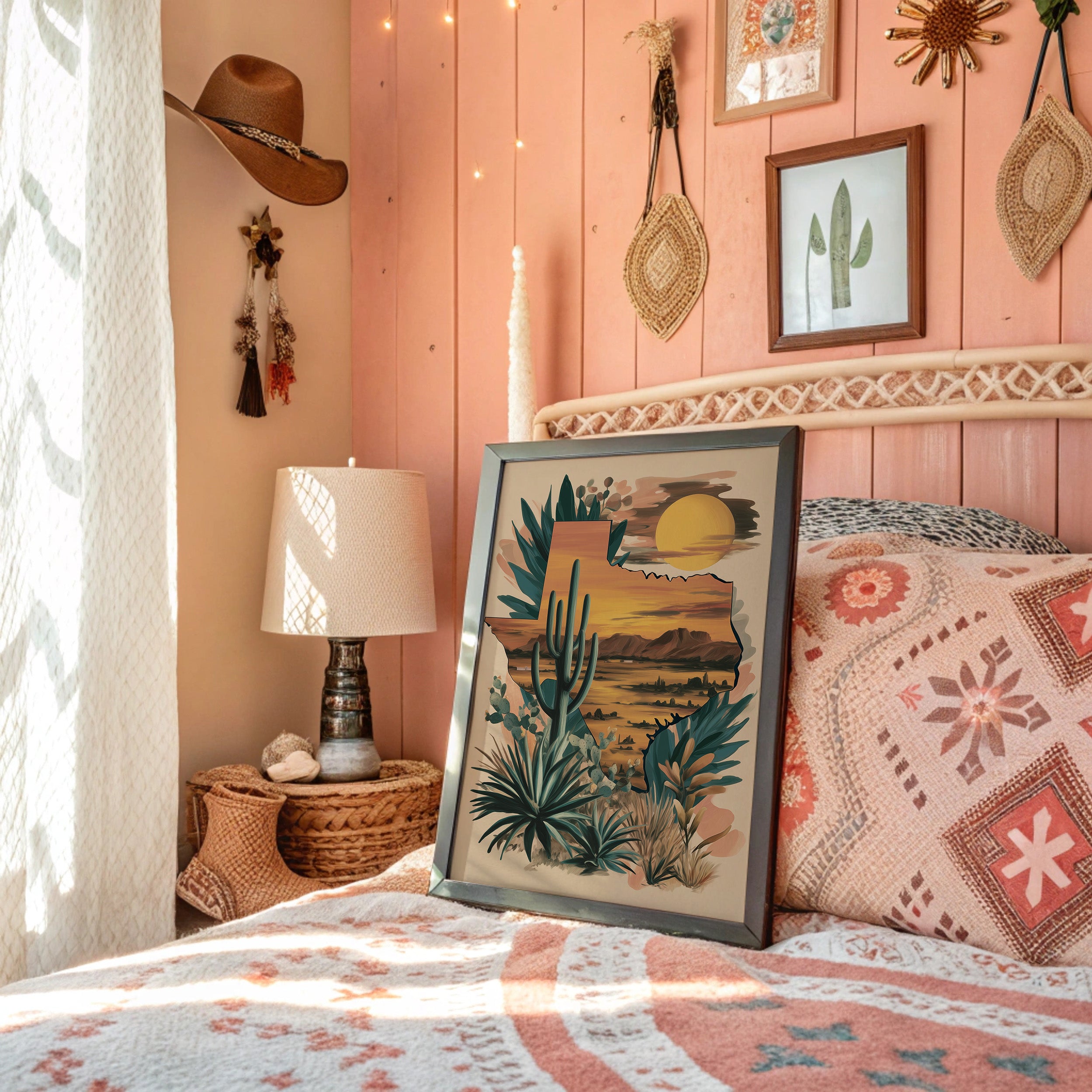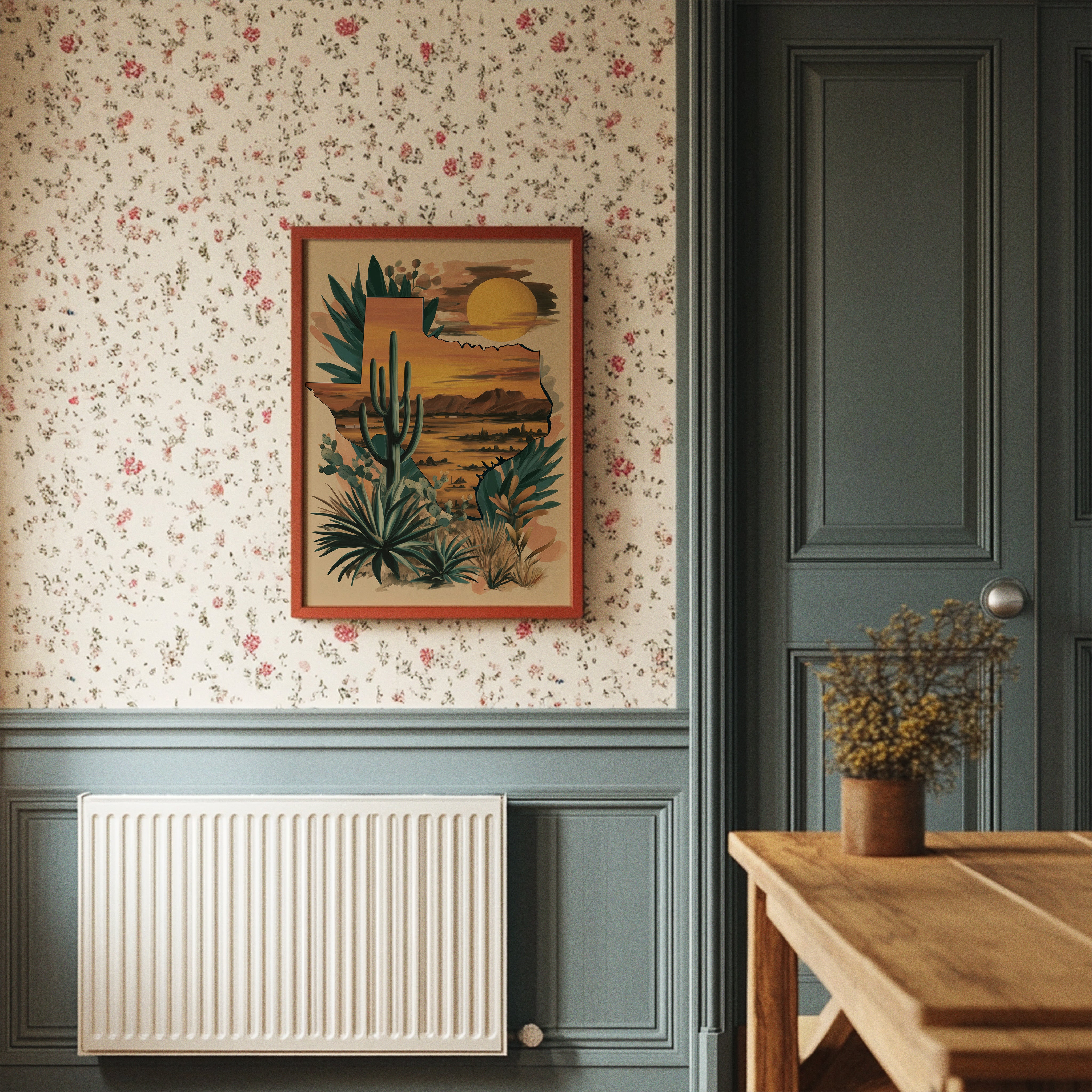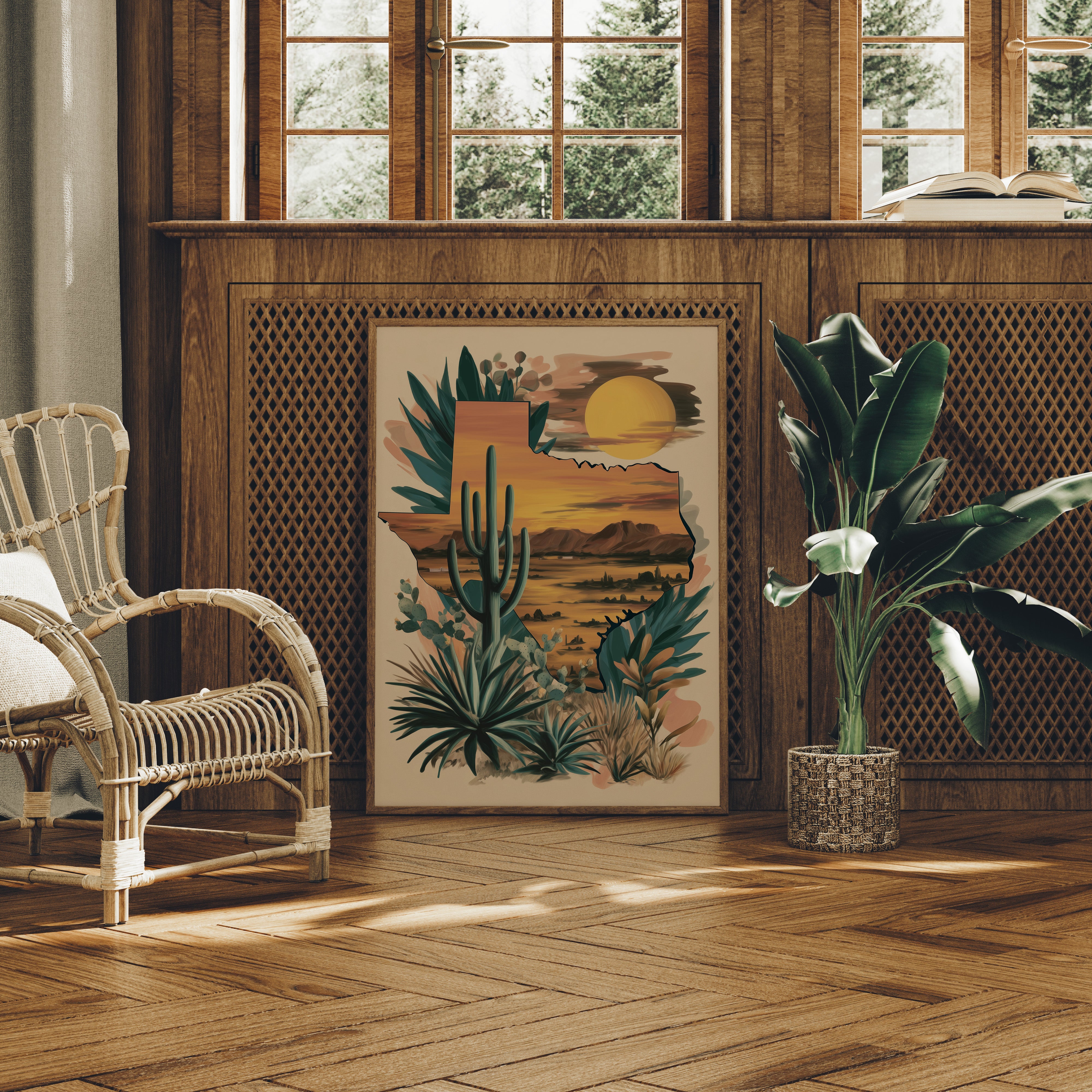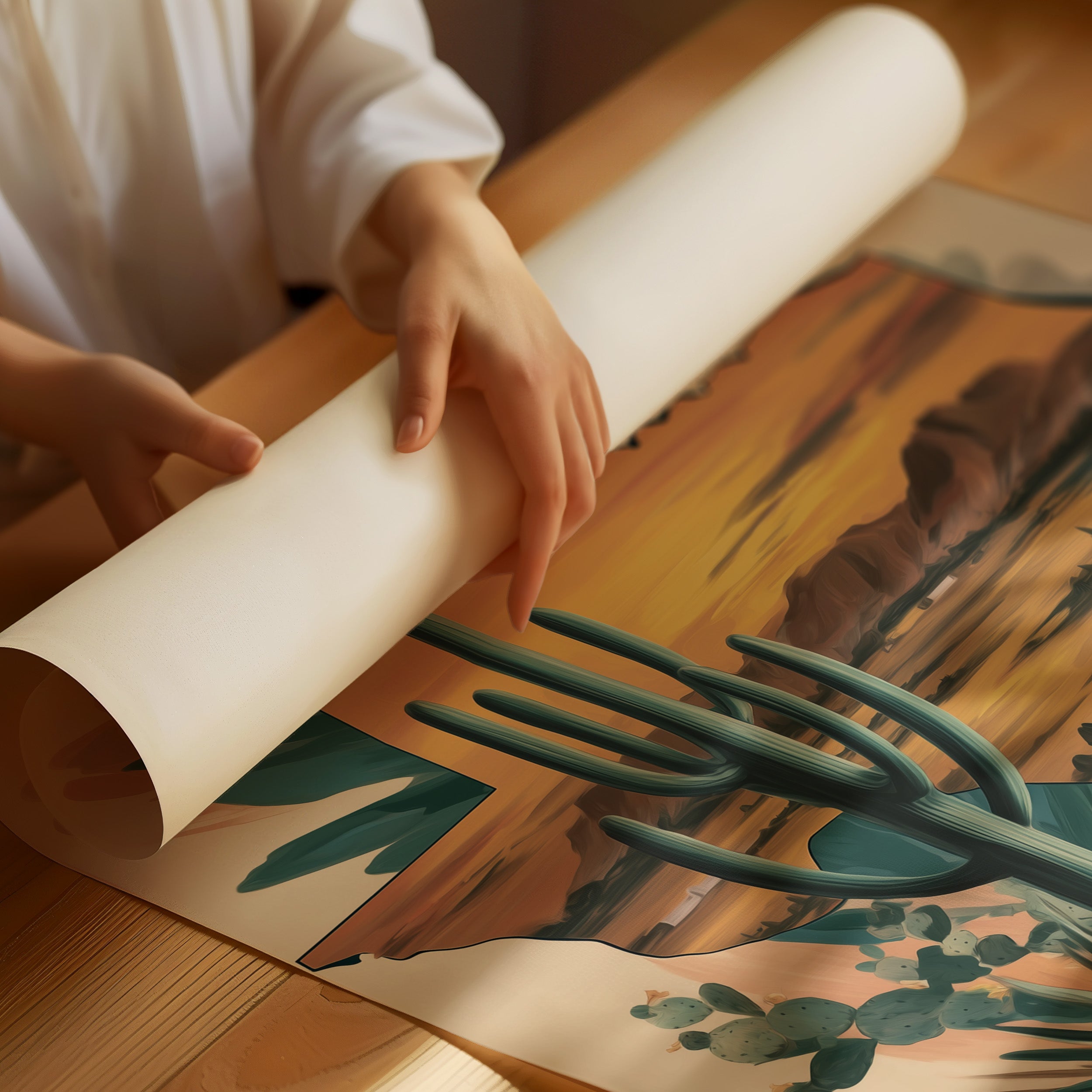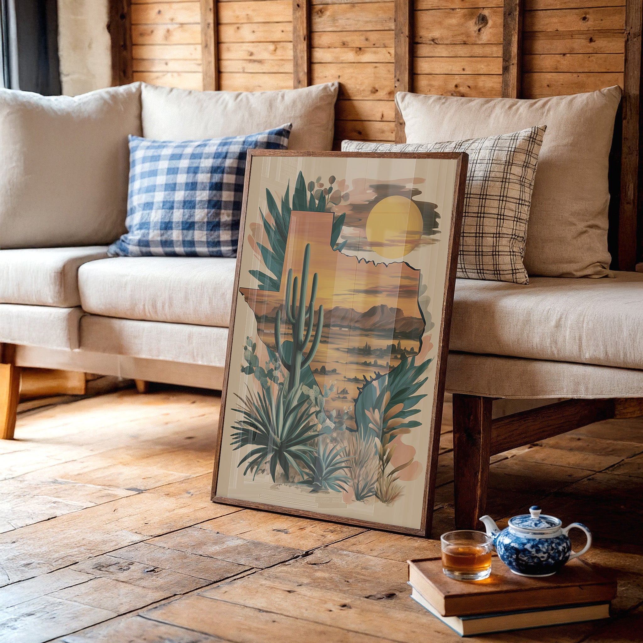 A desert symphony unfolds as the setting sun bathes the landscape in rich amber hues. Towering saguaros stand sentinel against a watercolor sky, while agave and desert flora dance along the composition's edge. The scene captures that magical moment when day surrenders to dusk, painting the mountains in deep purple silhouettes. Perfect for a modern southwestern living room or home office seeking to bring the warmth and majesty of desert horizons indoors.