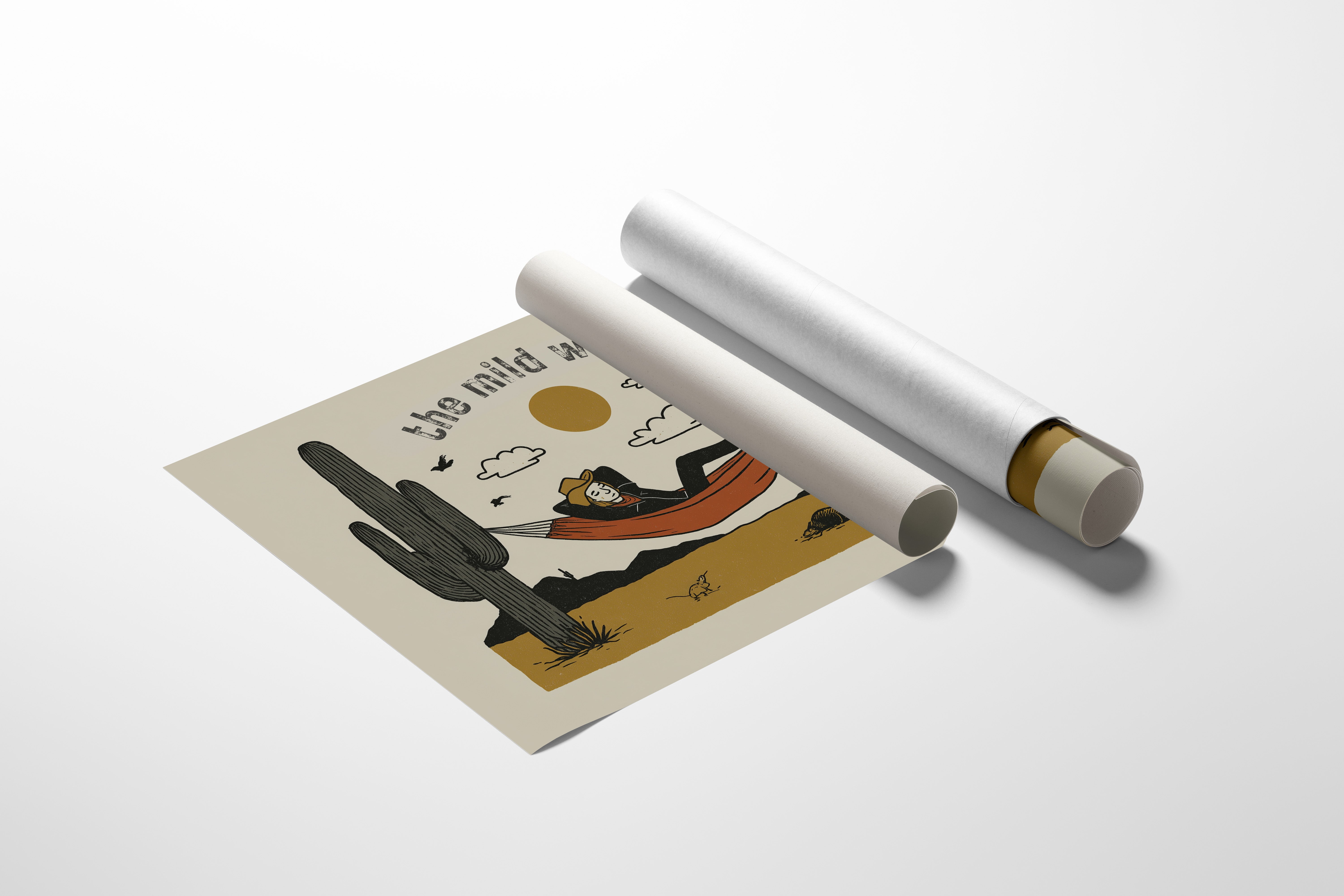 Between towering desert sentinels, time slows to a gentle desert rhythm. This piece from our Contemporary collection captures the essence of southwestern serenity with playful, minimalist charm. A figure lounges in a rust-colored hammock, surrounded by majestic saguaro cacti reaching skyward, while small desert creatures scurry below against a backdrop of golden earth and gentle clouds. The warm ochre sun and neutral palette create a peaceful meditation on desert life and leisure. Perfect for bringing a touch of laid-back southwestern charm to a home office or reading nook, inviting moments of peaceful contemplation.