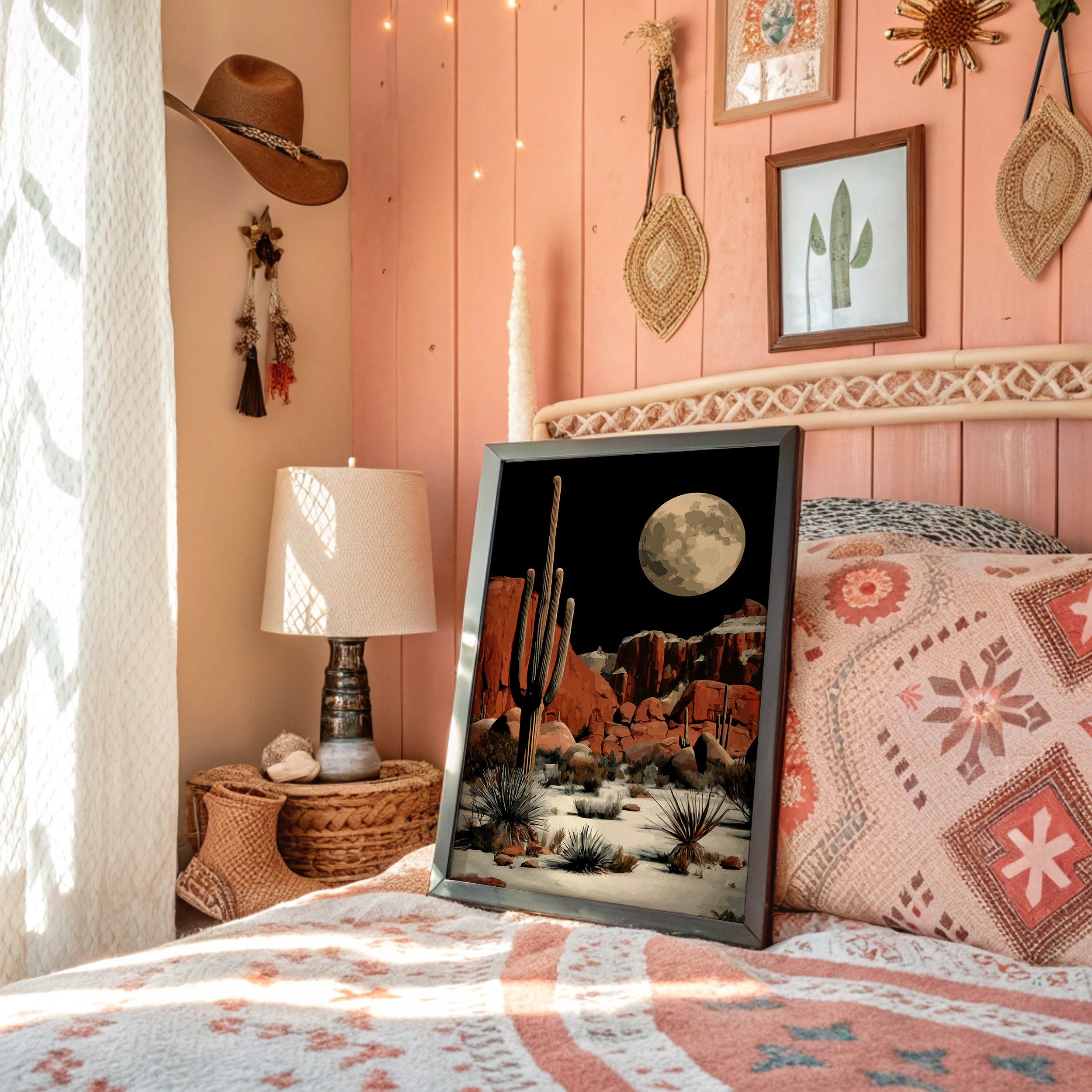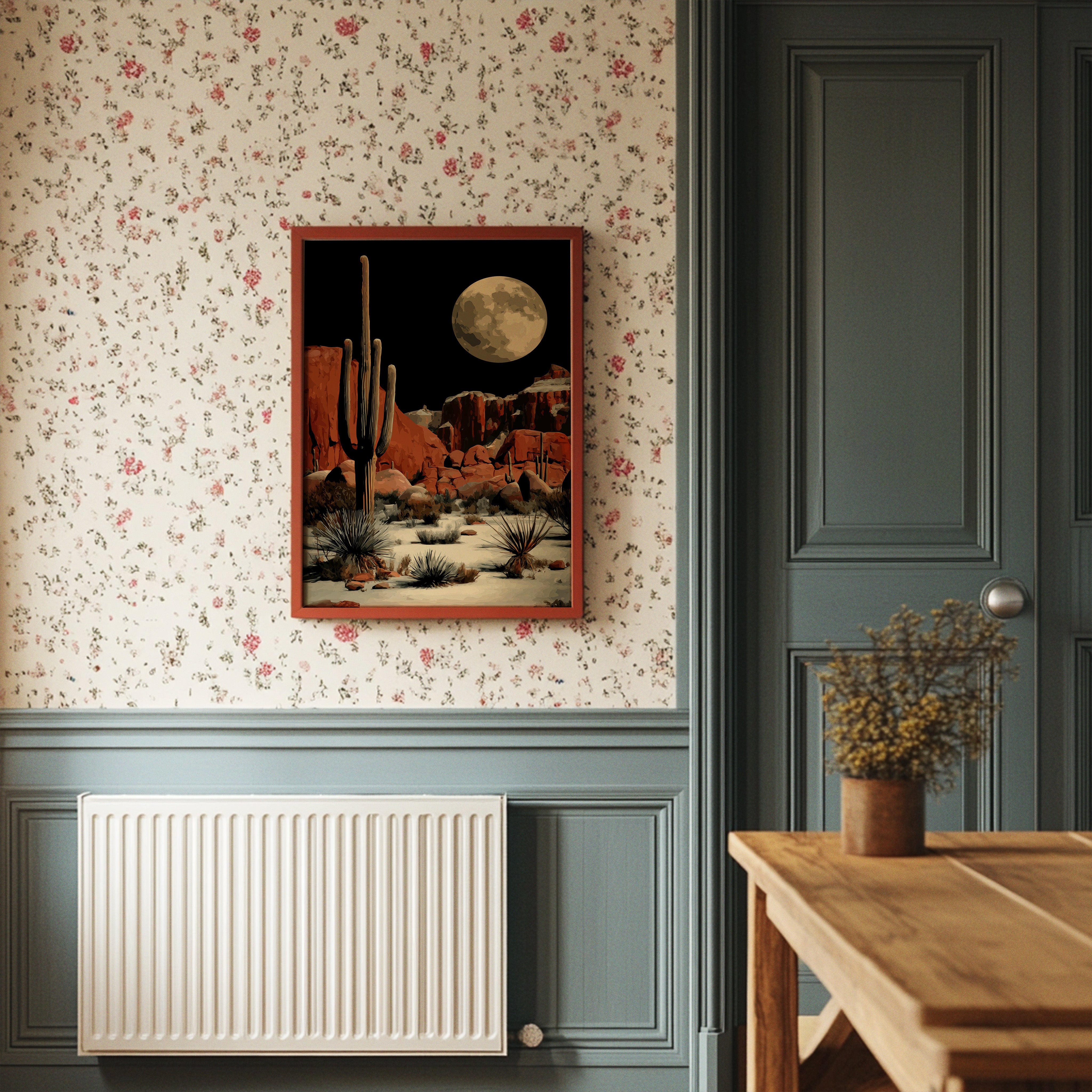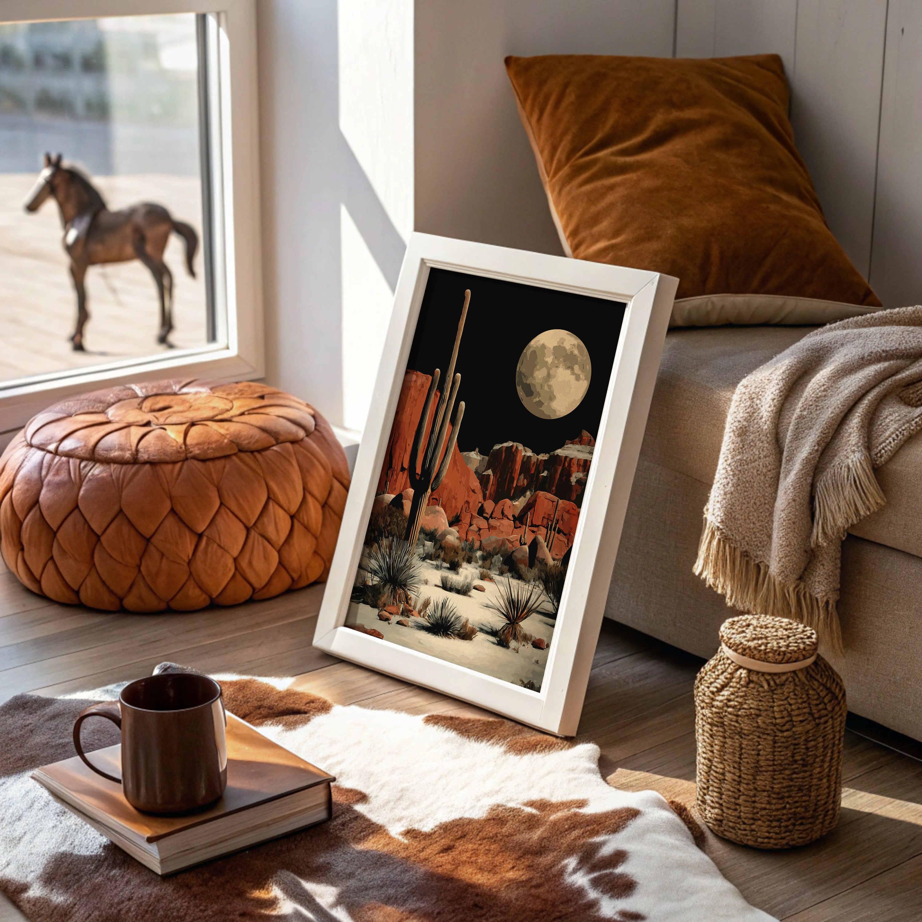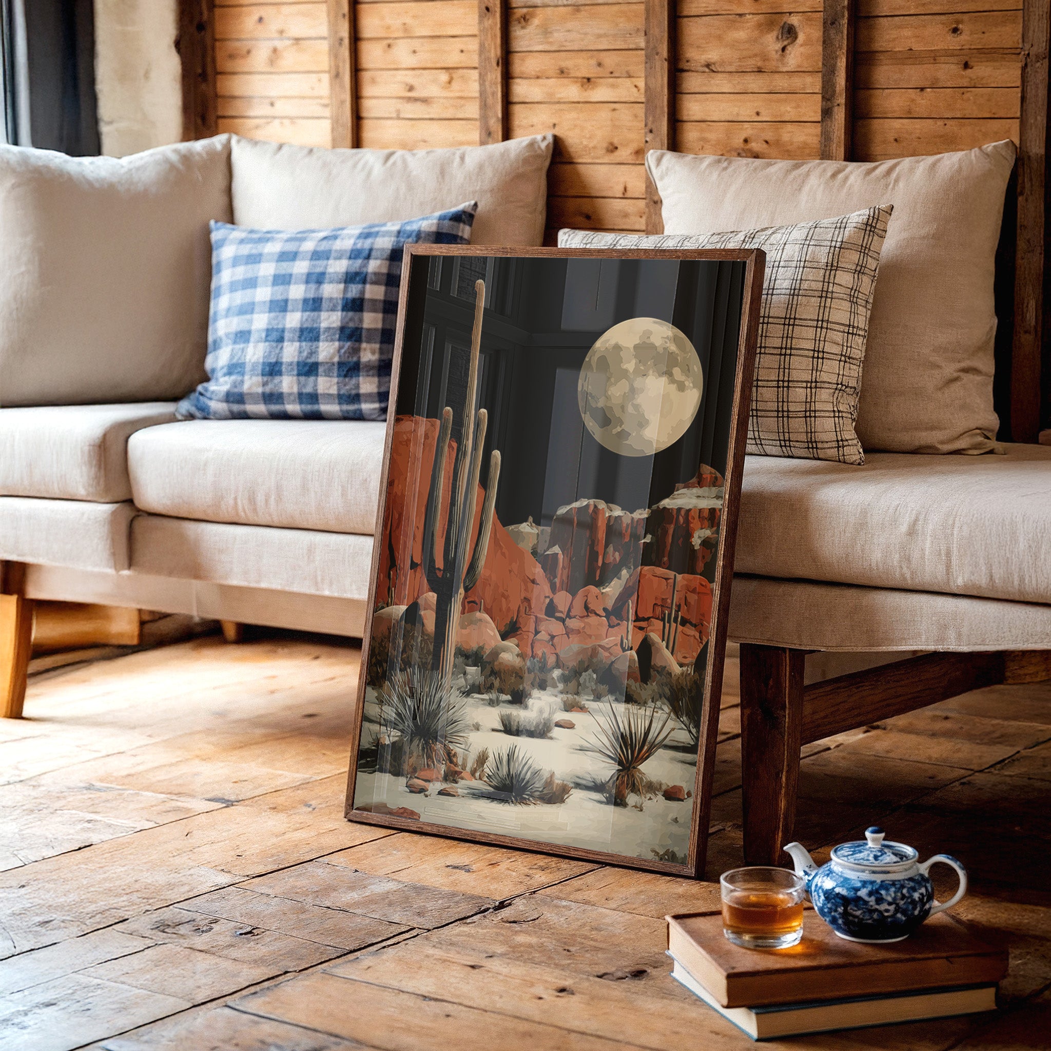 A majestic full moon bathes the desert landscape in ethereal light, casting long shadows across red rock formations. Towering saguaro cacti stand sentinel against the night sky, while delicate agave plants dot the sandy terrain below. The rugged cliffs wear their rust-colored majesty proudly, creating a striking contrast with the moon's golden luminescence. This contemporary desert scene brings the wild spirit of the American Southwest into your space, perfect for adding dramatic flair to a modern living room or creating a bold focal point in an office.