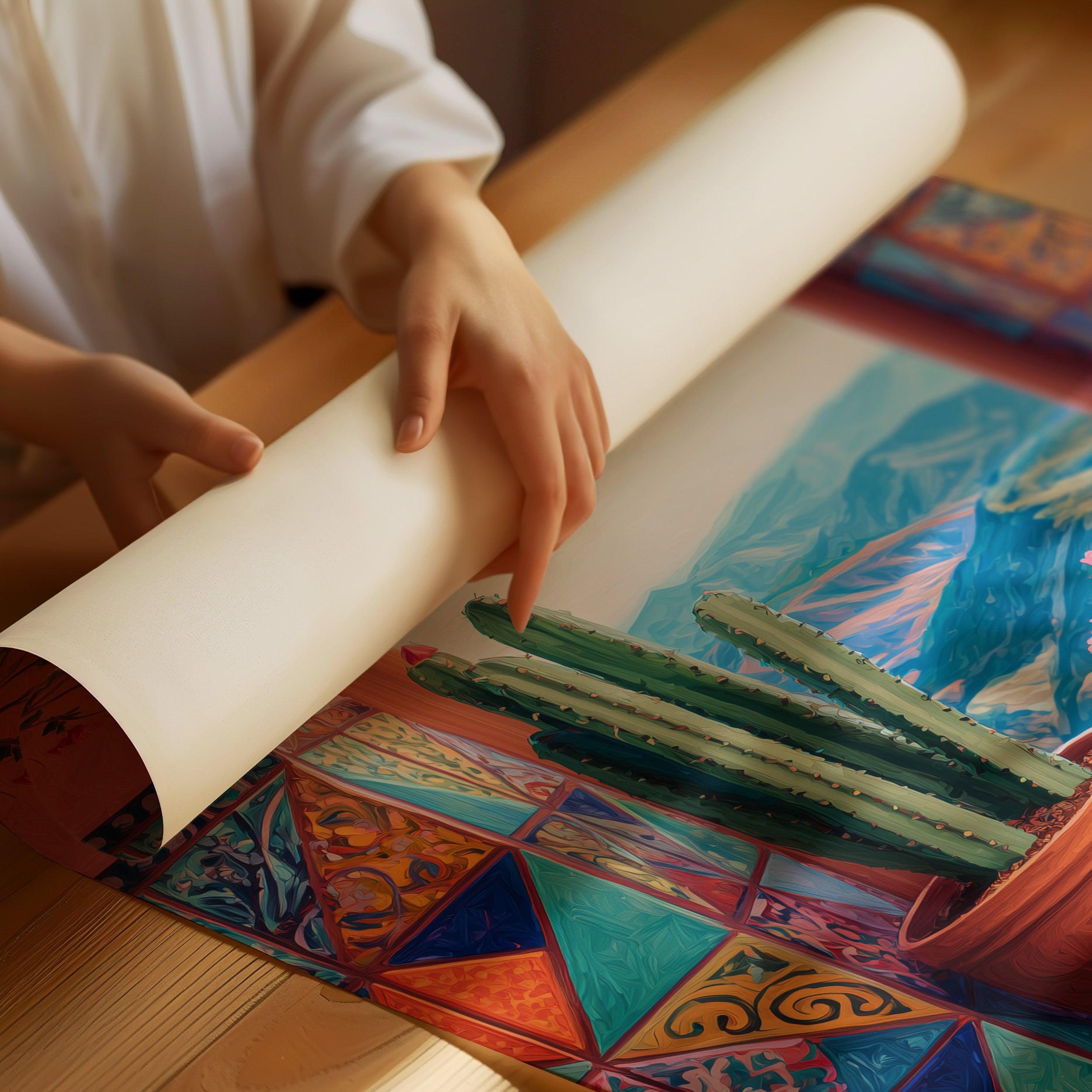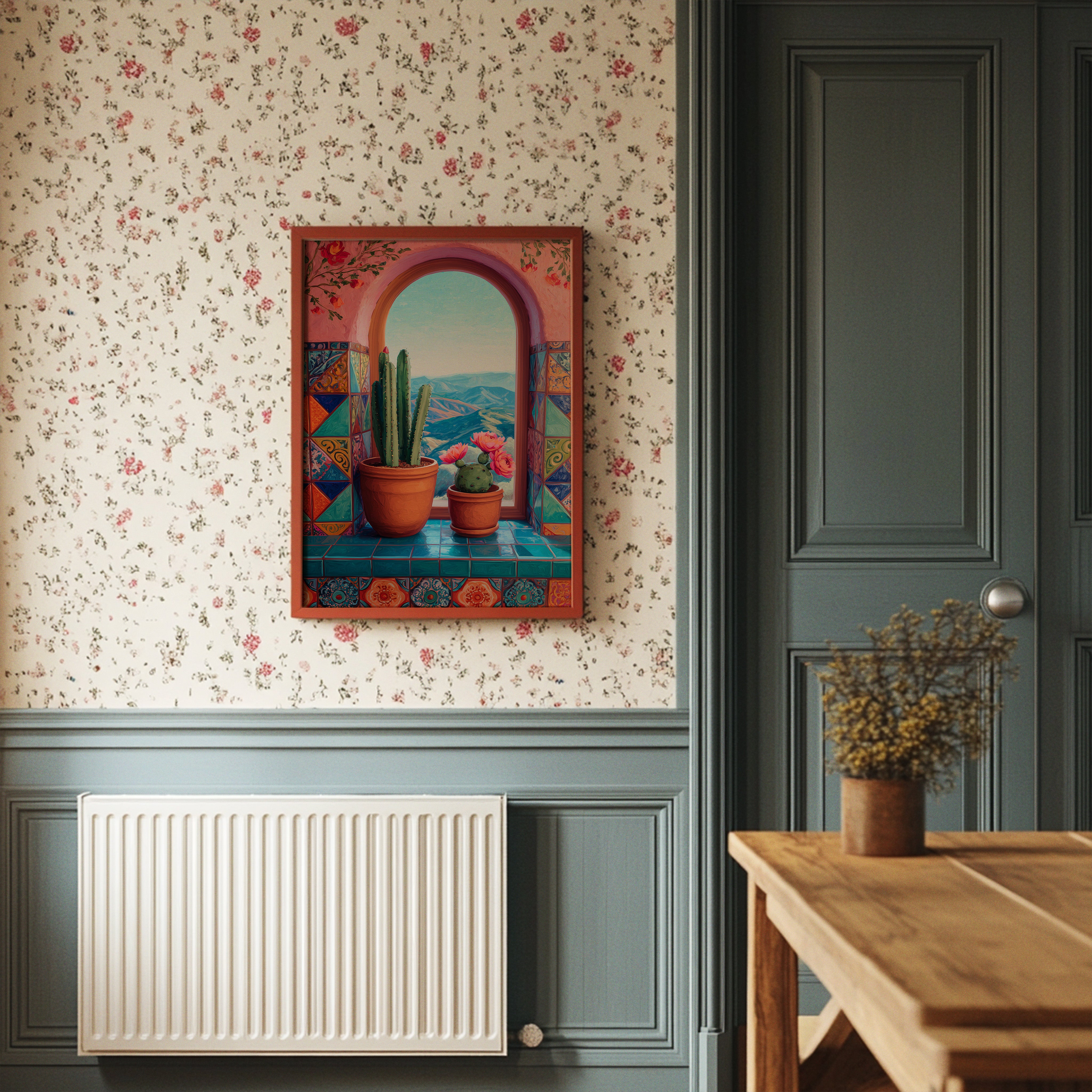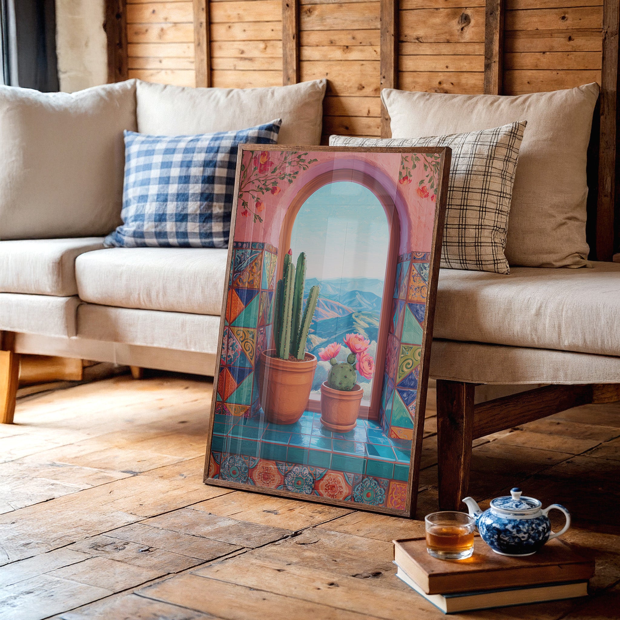 A sun-warmed archway frames distant mountains, where terracotta pots cradle desert dwellers against a backdrop of coral-painted walls. Vibrant Mexican tiles dance beneath potted cacti, their geometric patterns echoing the wild spirit of the Southwest. The scene captures a perfect moment of desert serenity, where architecture and nature merge in harmonious balance. This piece brings a touch of warm sophistication to modern living spaces, ideal for a sun-filled breakfast nook or cozy reading corner.