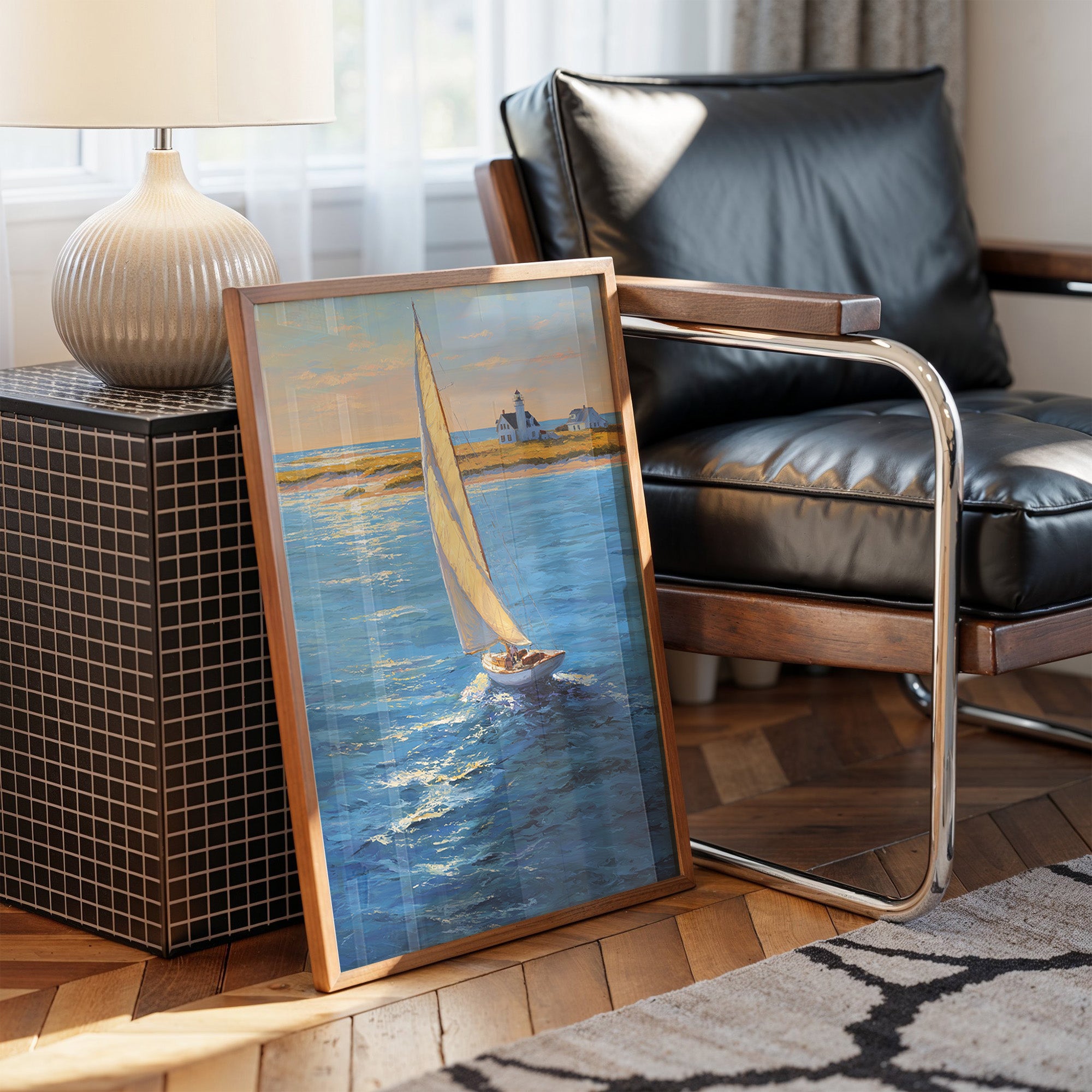 Golden afternoon light dances across azure waters as a solitary sailboat charts its course toward shore. The painting captures that perfect moment of serenitywhite sails billowing against a pastel sky, with a distant lighthouse standing sentinel on the sandy coastline. Brushstrokes create gentle ripples across the water's surface, telling a story of peaceful nautical wanderings and the promise of safe harbor ahead. This coastal scene brings a breath of fresh air into any living space, perfect for creating a calming focal point in a study, hallway, or anywhere you wish to evoke memories of summer voyages.