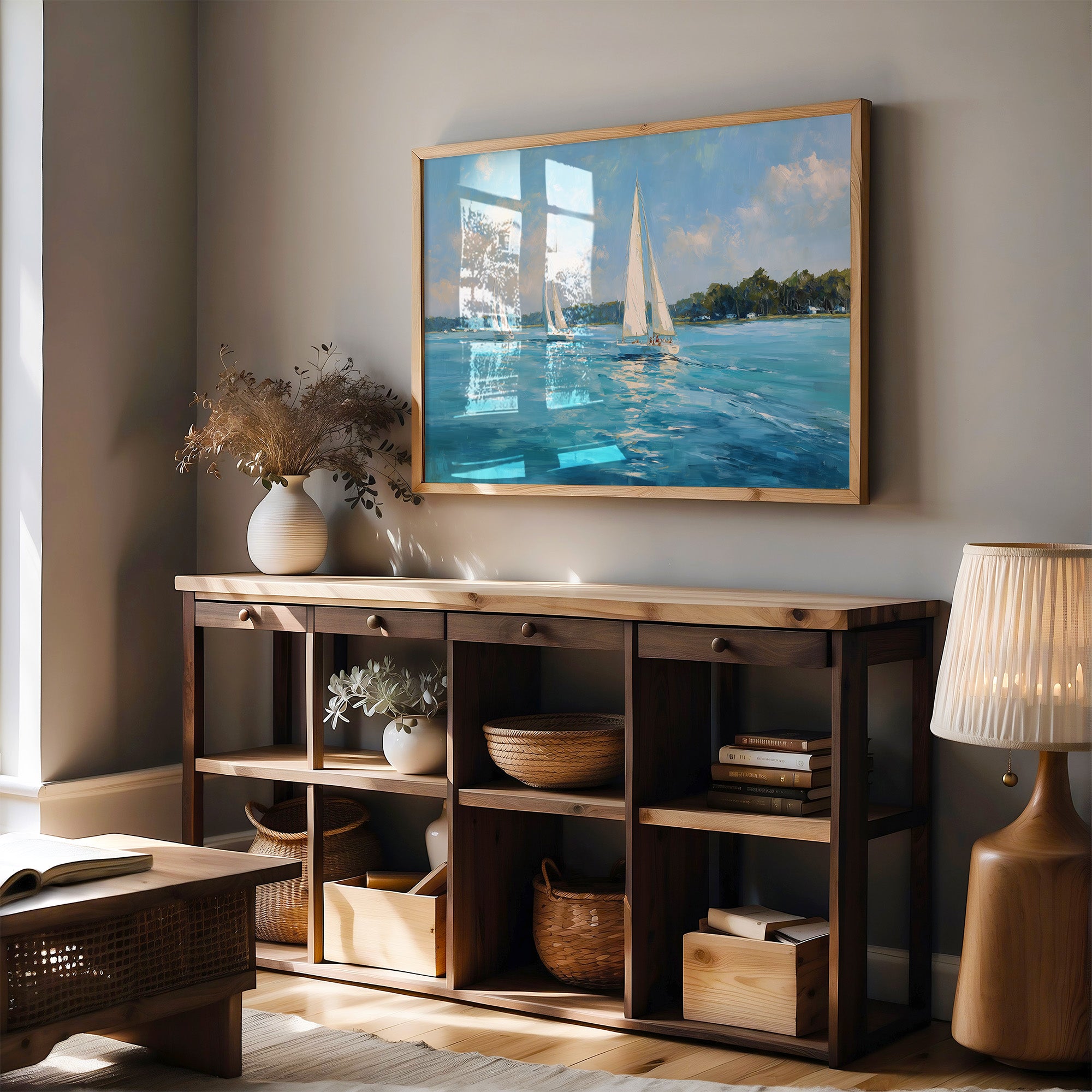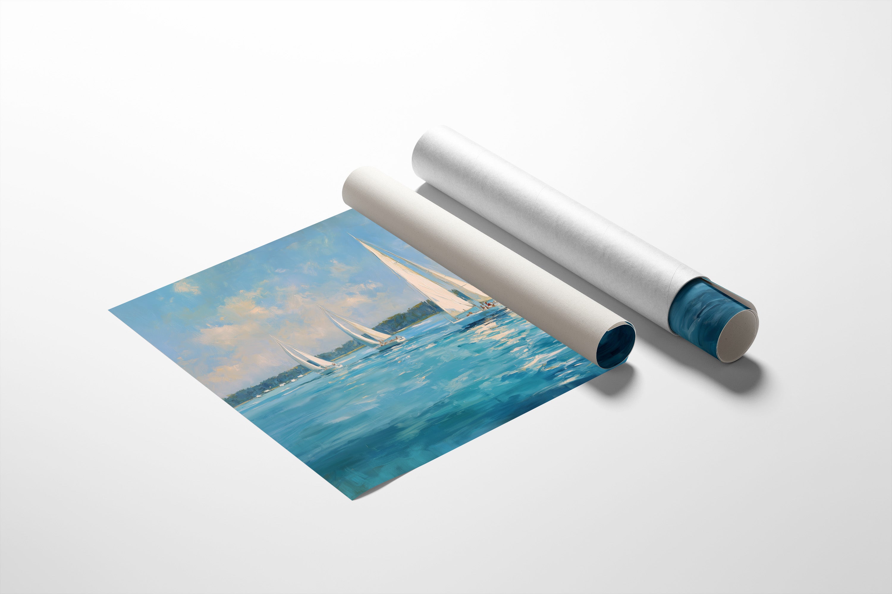 Sunlight dances across turquoise waters as white sails catch the afternoon breeze. The scene captures that perfect summer moment when time seems to slow, where sailboats glide effortlessly across the lake's shimmering surface. Rich blues mingle with soft cloud reflections, creating a tapestry of light and movement against the distant tree-lined shore. The painting's brushstrokes capture both the tranquility and gentle energy of a perfect sailing day, with each vessel charting its own peaceful journey. This serene coastal scene brings a breath of fresh air to living rooms or bedrooms where a touch of escapism is desired.