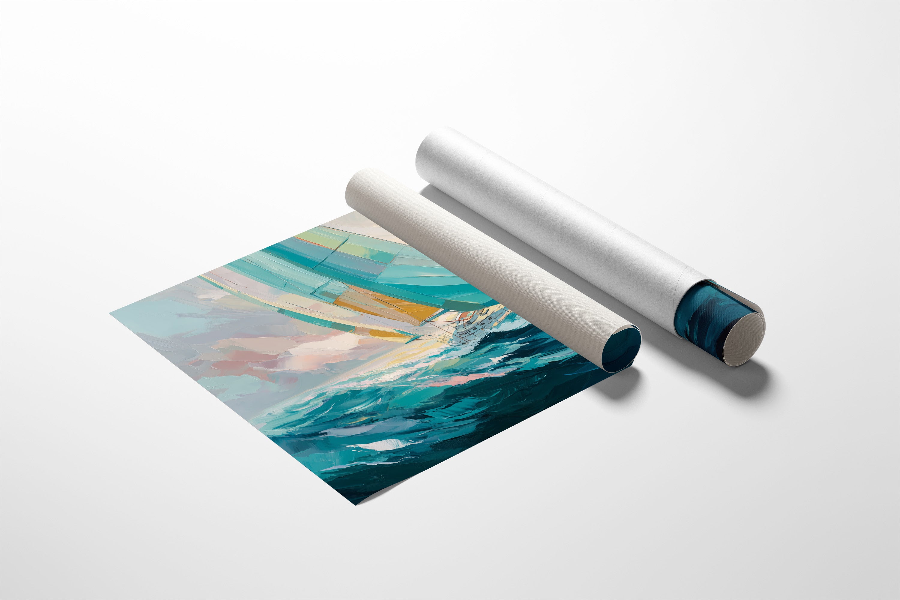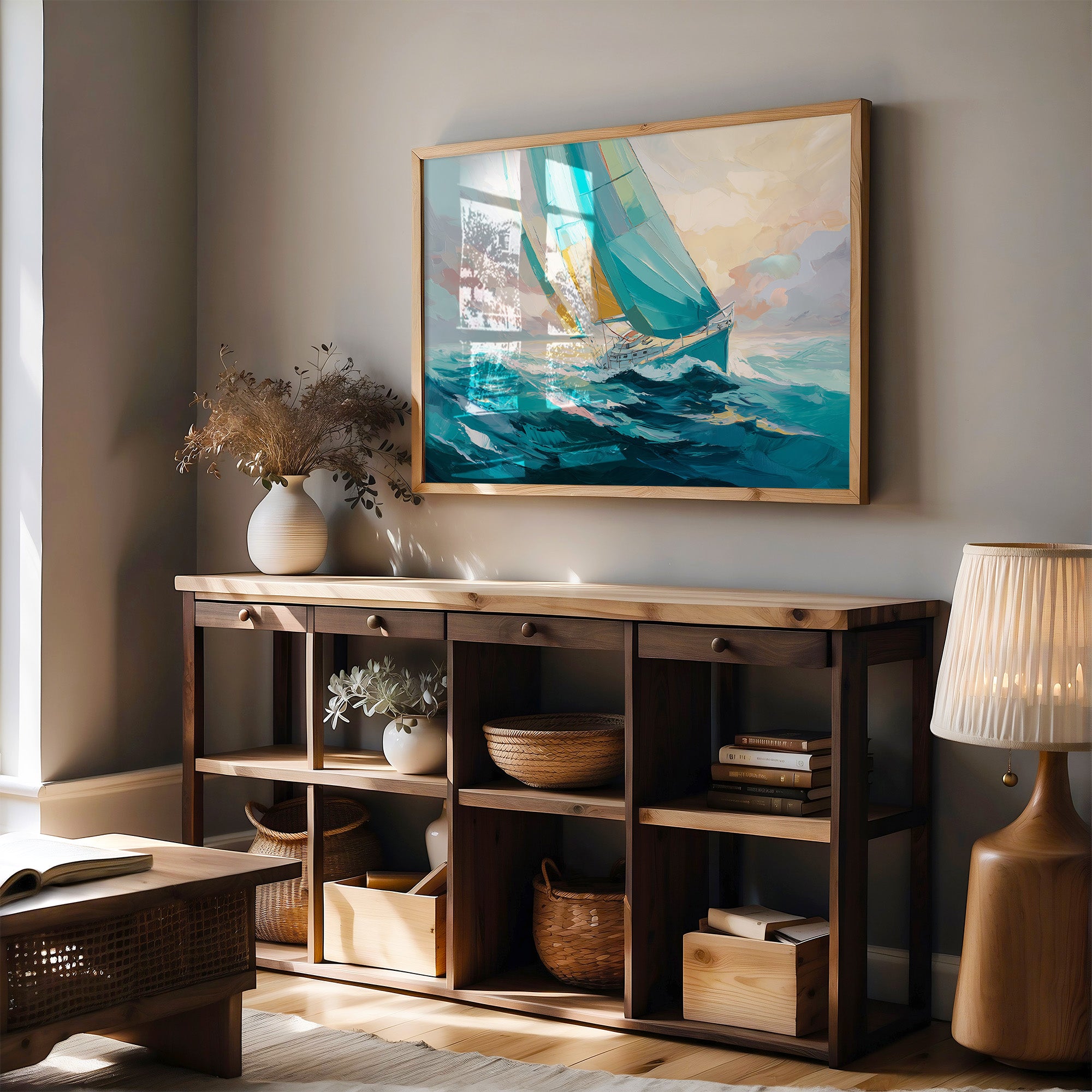 The sailboat leans into the wind, turquoise sails catching both storm and sunlight as it crests a deep azure wave. Bold brushstrokes capture the dynamic tension between the vessel's determination and the sea's raw power, with gentle coral and gold tones breaking through the horizon. The painting's impressionistic style transforms an ordinary sailing scene into a moment of transcendent courage, where human craft meets nature's magnificent force.