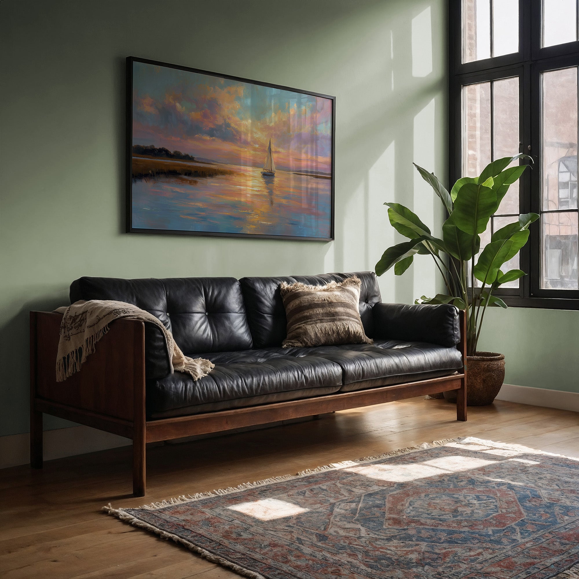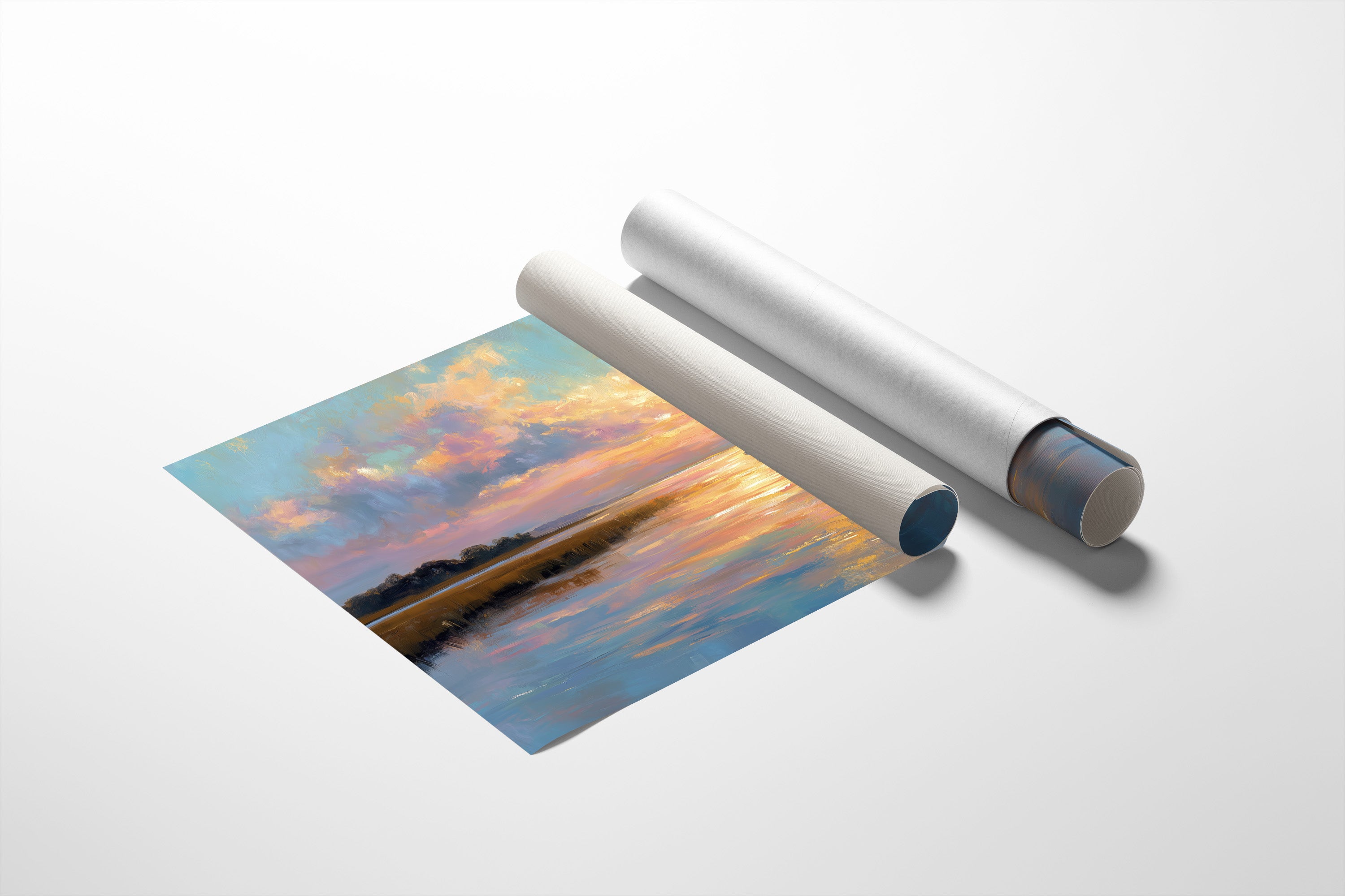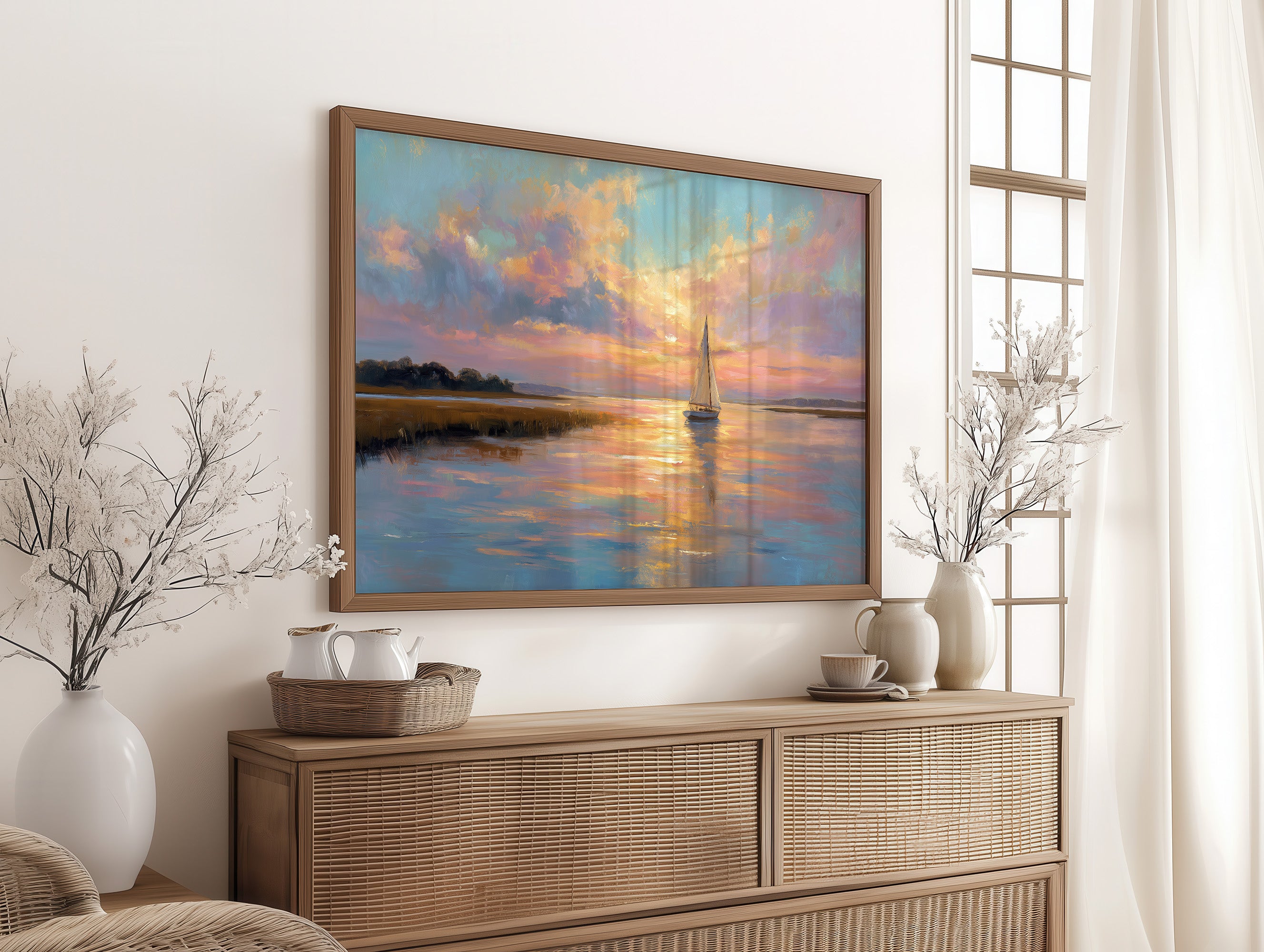 The day melts into liquid gold as a solitary sailboat glides across tranquil waters. Lavender clouds and amber light dance together across the sky, creating a symphony of color that ripples across the glassy surface below. The marshland stands as a silent witness to this daily miracle, its golden grasses catching the last warm rays before dusk settles in. This piece transforms any room into a peaceful sanctuary where time seems to pause between day and night.