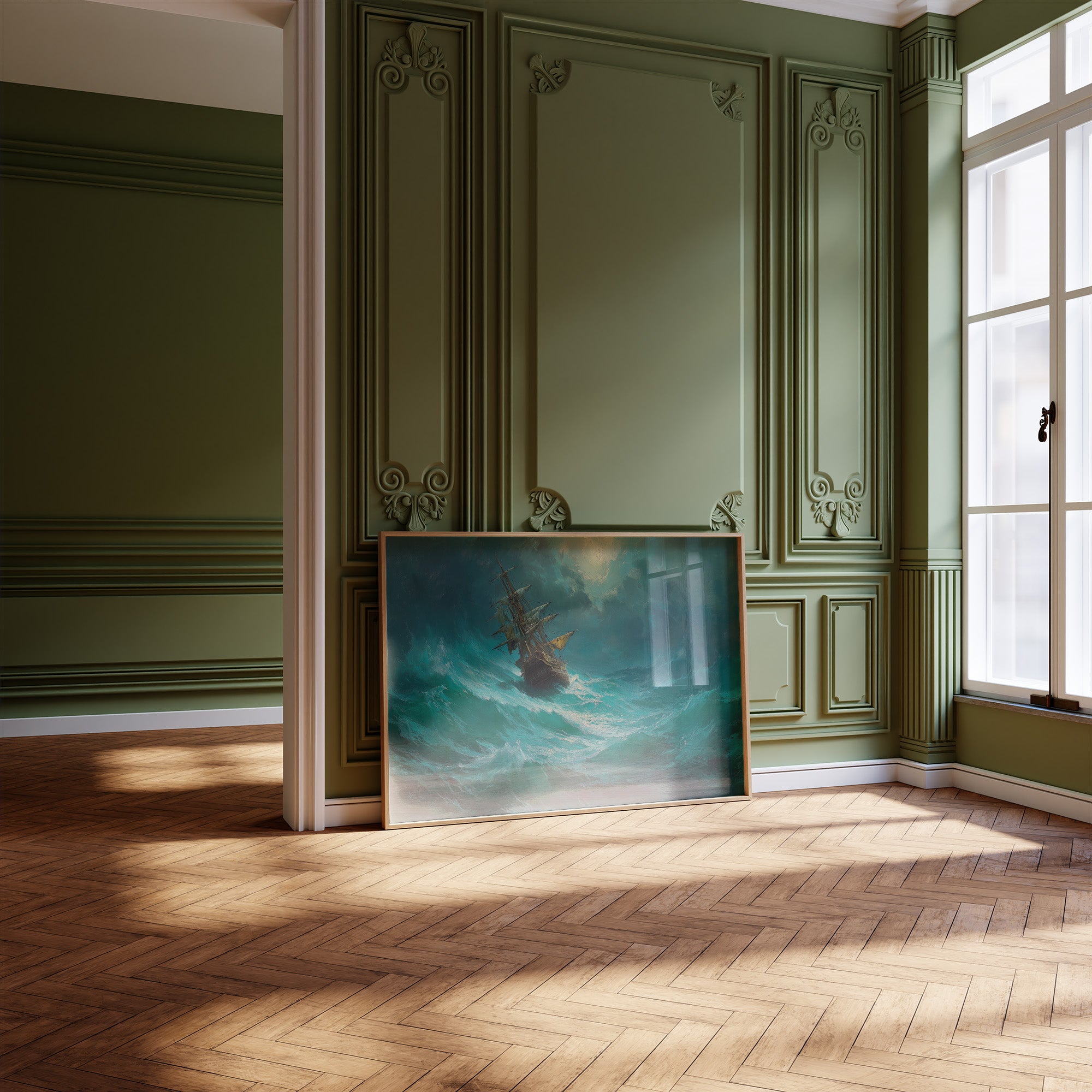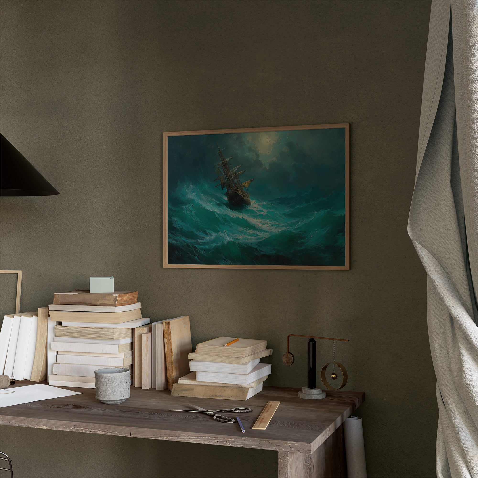 A lone ship battles against the mighty wrath of a turquoise sea, its masts defiant against the churning waves. Deep teal waters rise and fall in dramatic peaks, creating a symphony of movement while moonlight breaks through stormy clouds, casting an ethereal glow across the tumultuous scene. The painting's rich maritime palette captures both the peril and sublime beauty of nature's raw power. This striking seascape brings contemplative drama to a home library, study, or anywhere you wish to evoke the romantic spirit of adventure and resilience.