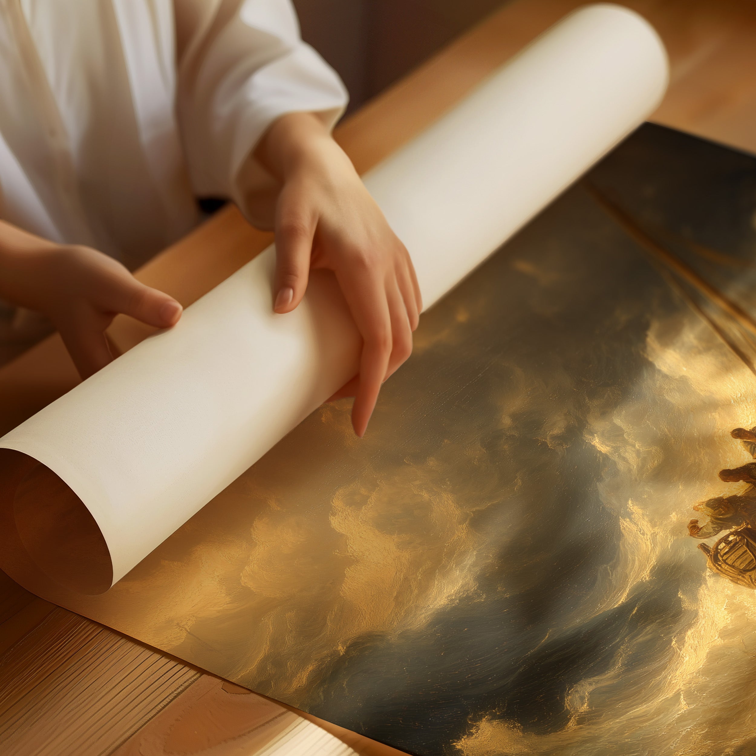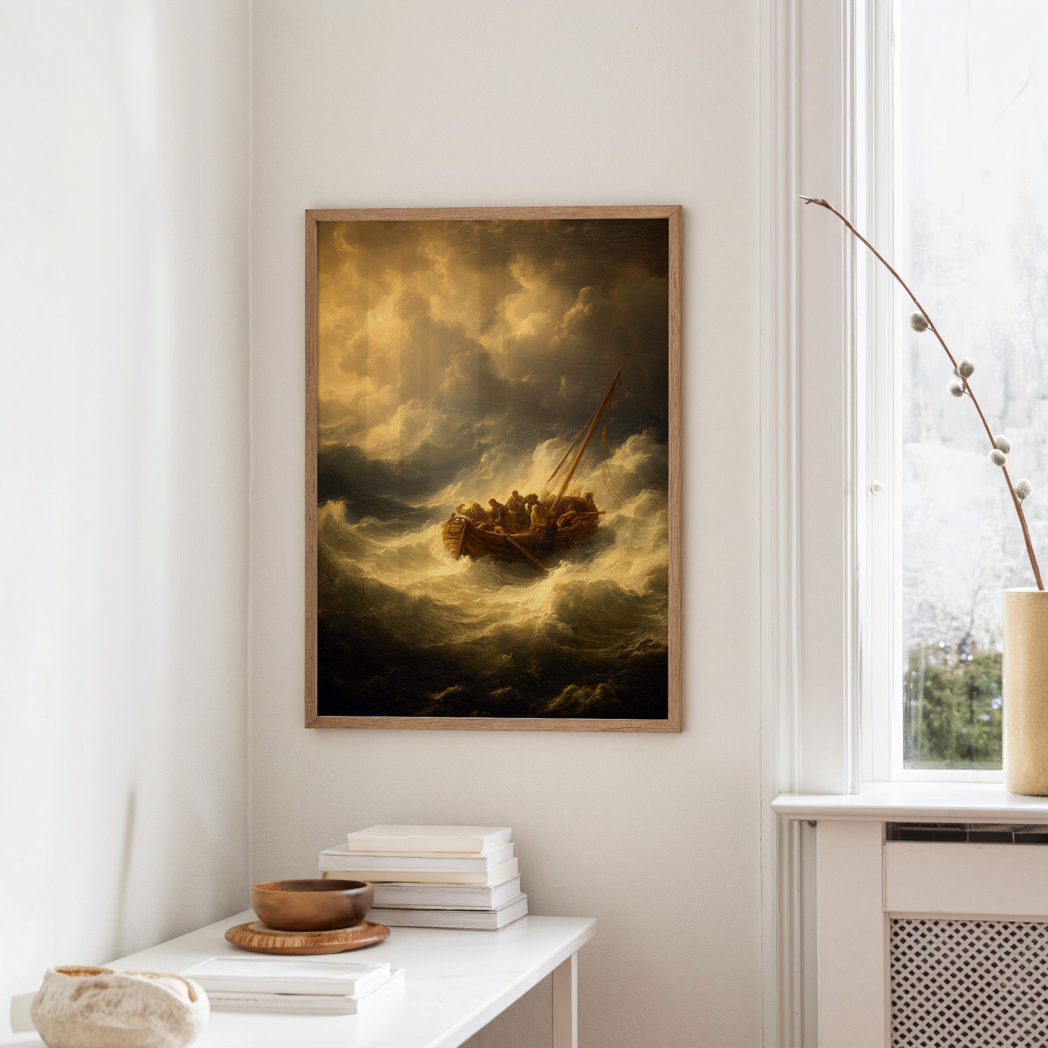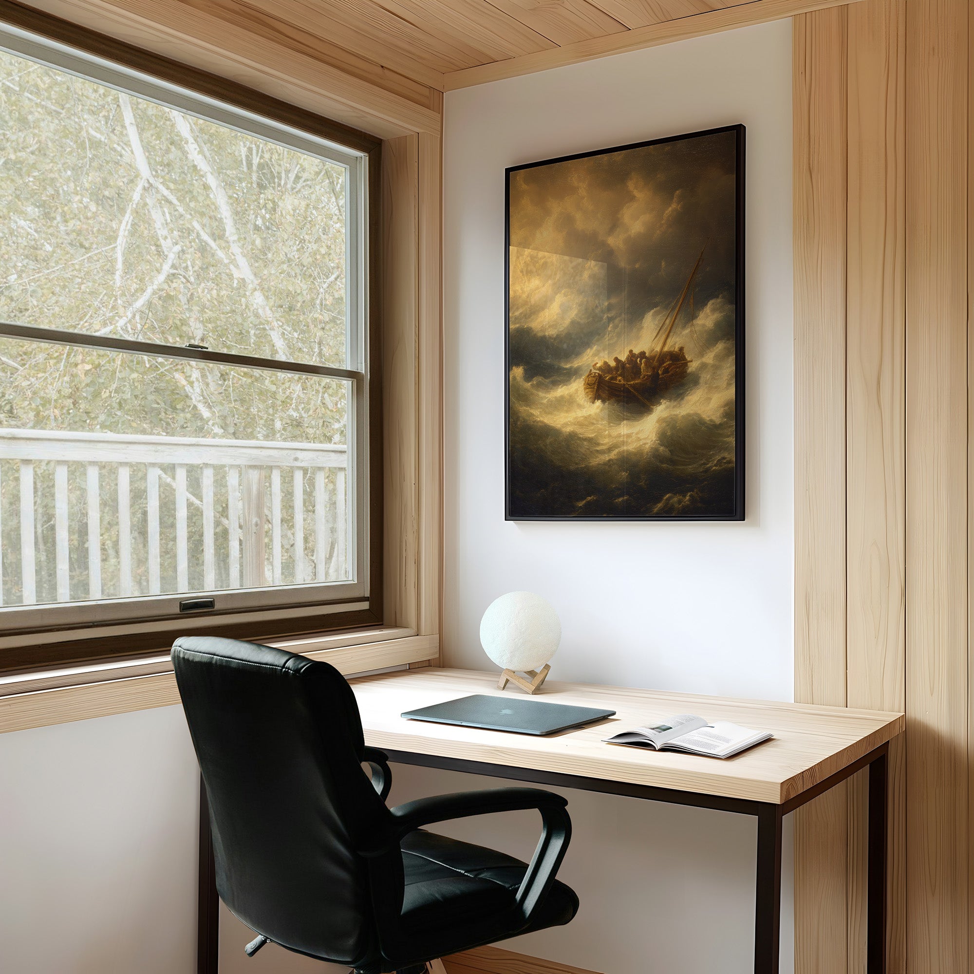 Morning light spills across a wooden table, illuminating a dramatic maritime painting where desperate sailors cling to their vessel amid churning waves. Golden storm clouds loom overhead, their heaviness contrasting with the fragile boat below, creating a powerful narrative of human resilience against nature's raw power. The classical painting rests casually among other items, bringing timeless drama into everyday space.