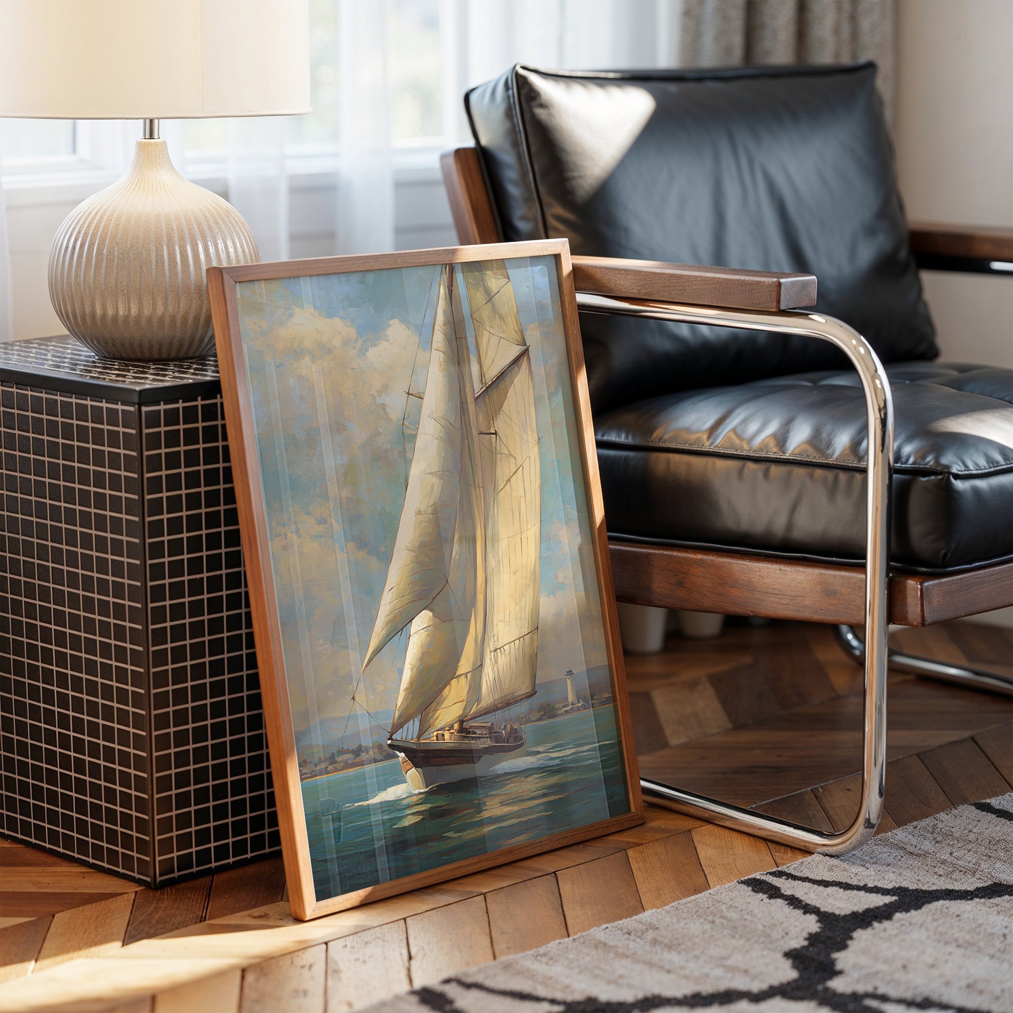 Sunlight dances across cream-colored canvas as a magnificent sailboat glides through tranquil waters. The painting captures that perfect maritime moment when wind fills the sails and possibility stretches as far as the horizon, rendered in gentle blues and warm golds. Framed in natural wood, this nautical scene brings the freedom of open water and the romance of traditional sailing vessels into an otherwise contemporary space.