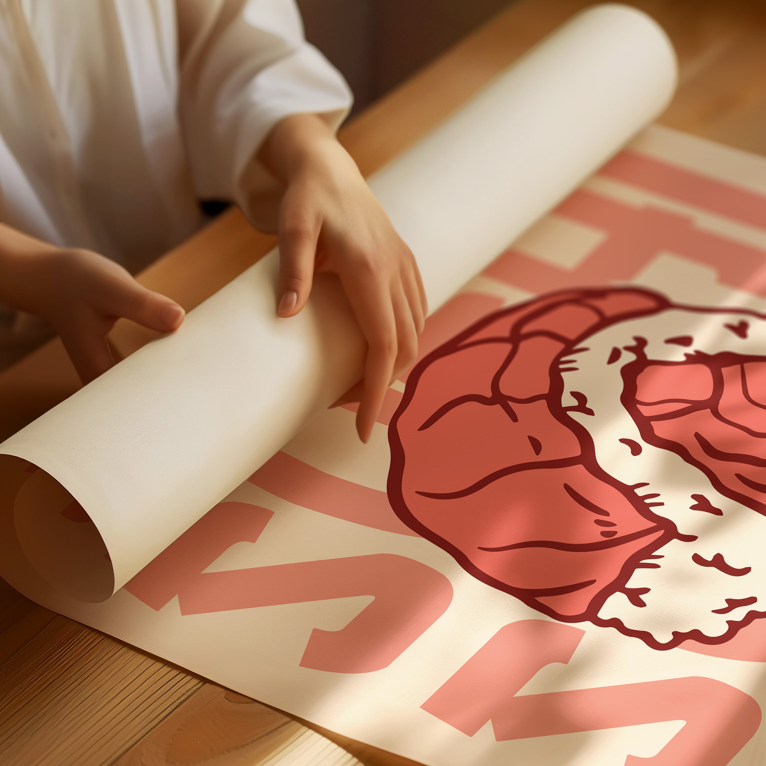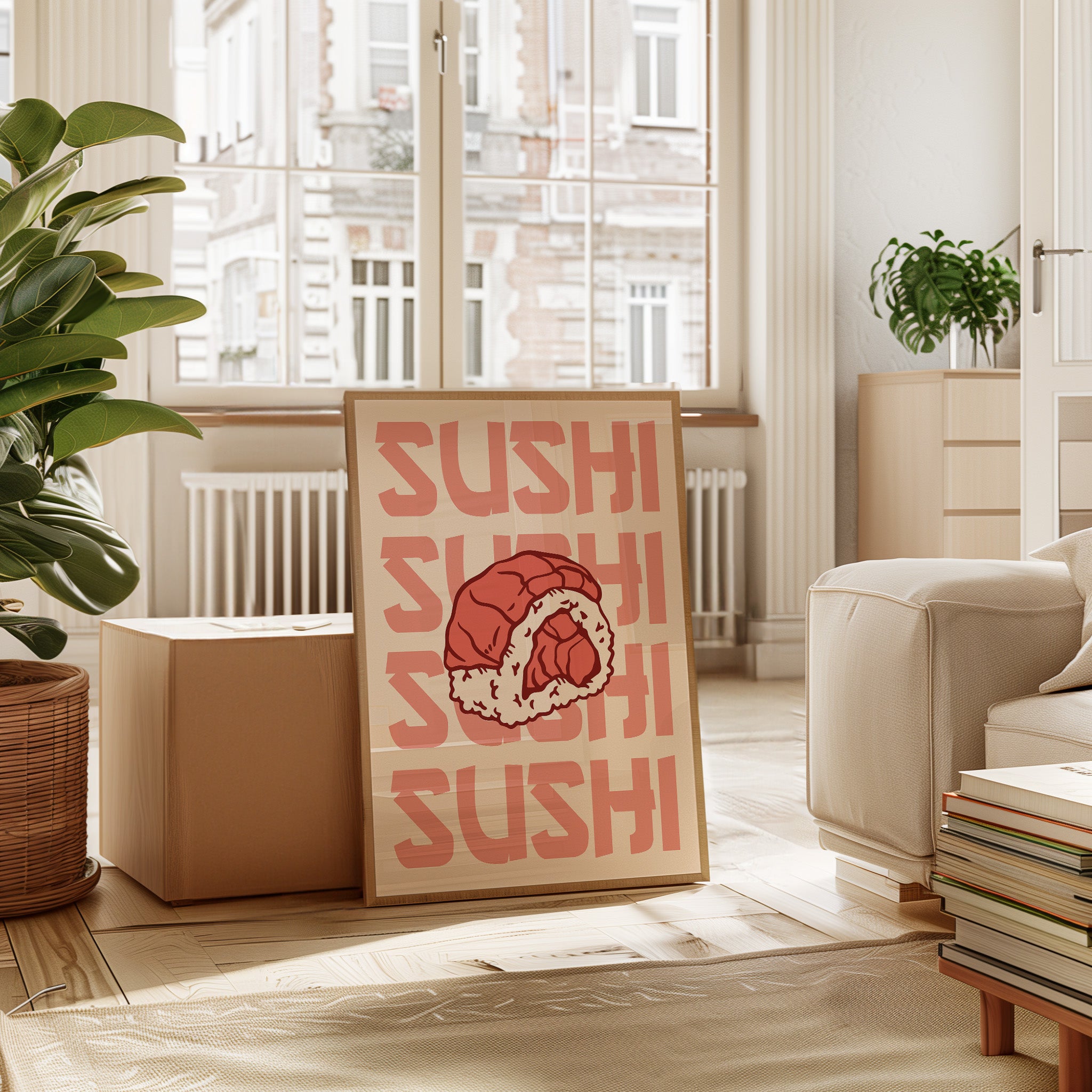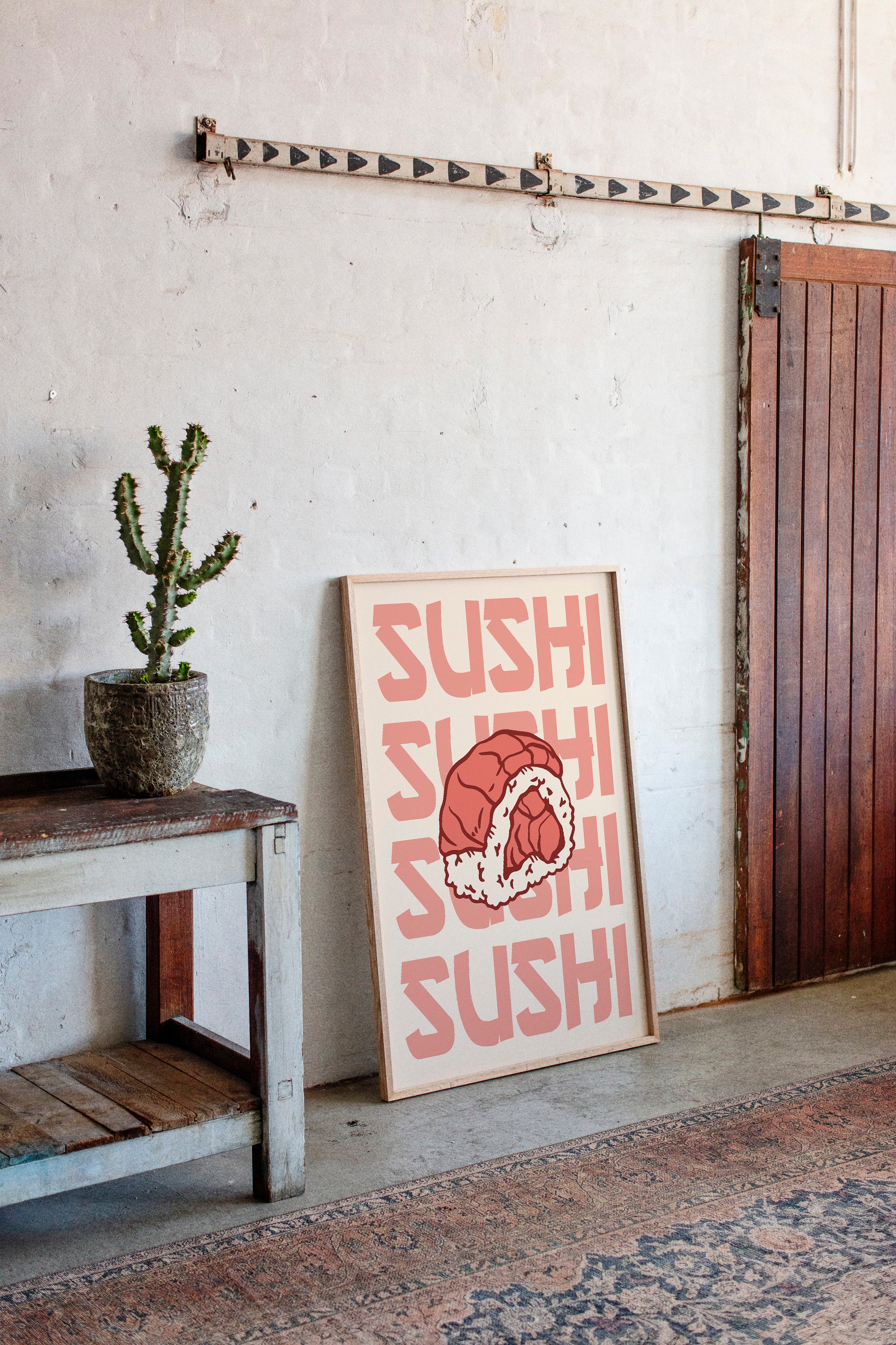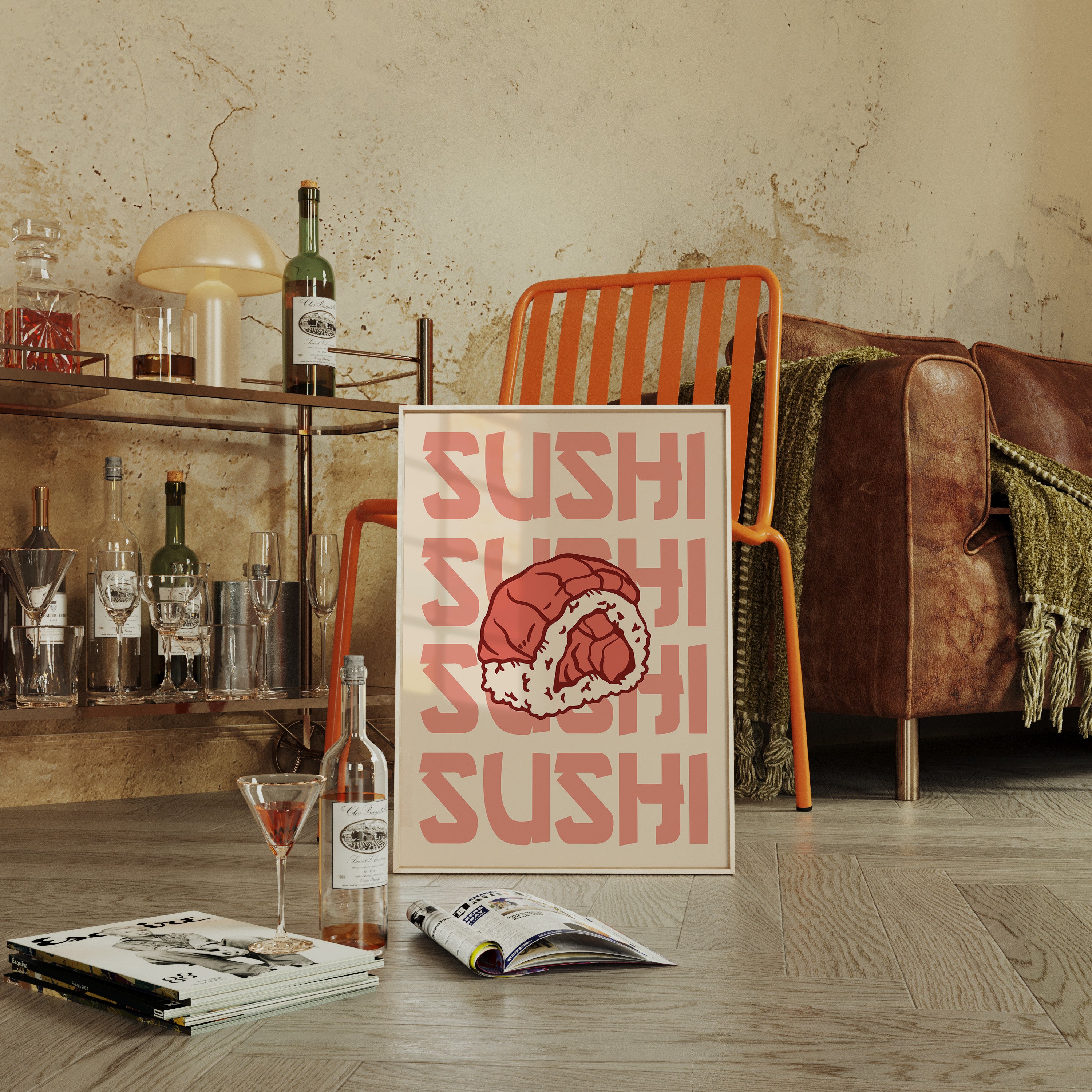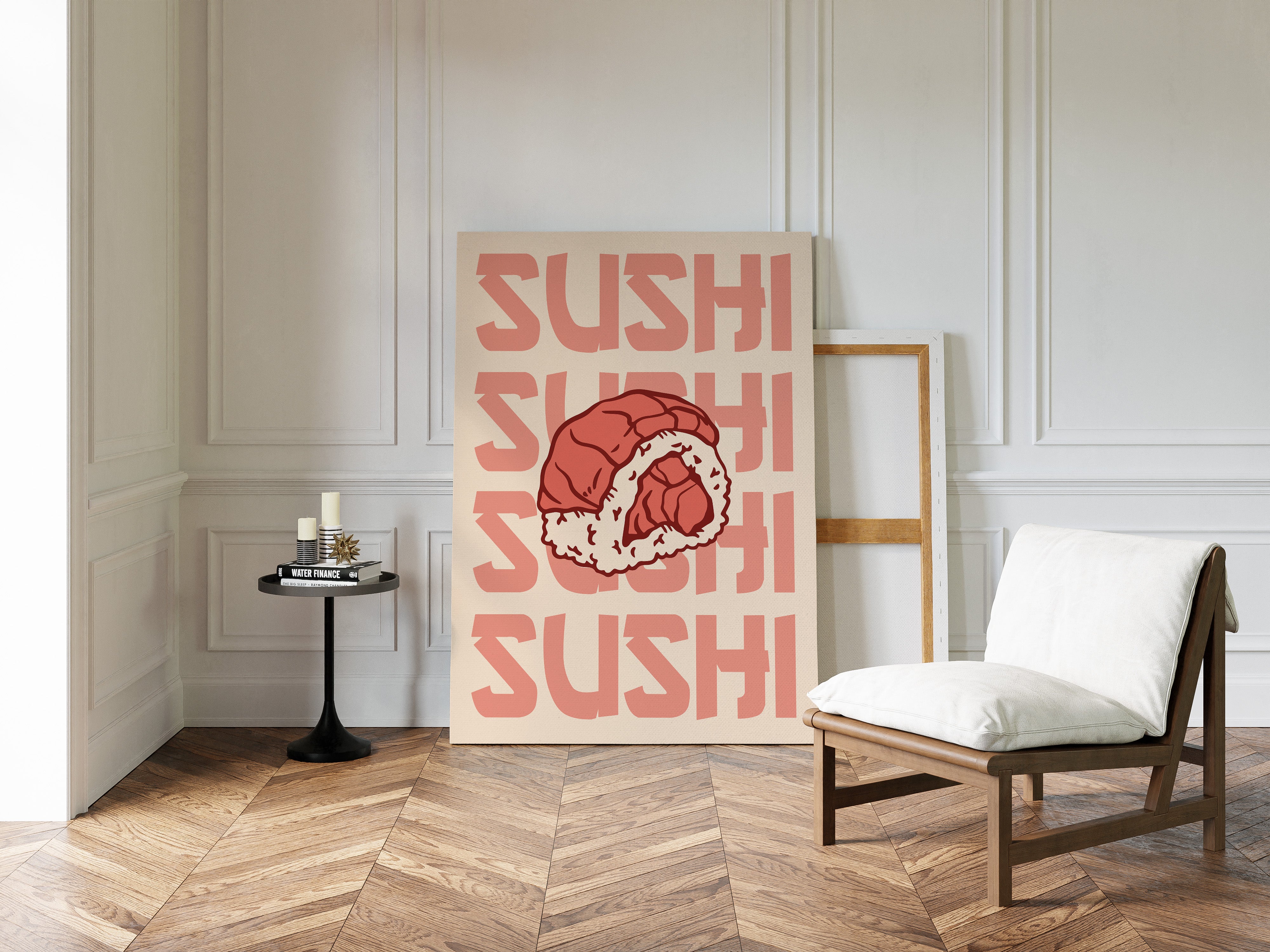 A single piece of sushi becomes a bold statement against a peachy backdrop, its coral-tinted repetition creating a mesmerizing rhythm across the canvas. This piece exemplifies the modern pop art aesthetic, where simple subjects transform into powerful graphic statements. The interplay between the delicate details of the rice roll and the strong typographic elements creates a compelling visual dialogue, while warm salmon pinks and creamy whites dance in perfect harmony. This contemporary piece brings playful sophistication to dining spaces and modern kitchens. Its minimalist charm and food-centric focus make it an ideal accent for culinary-inspired interiors where art meets appetite.