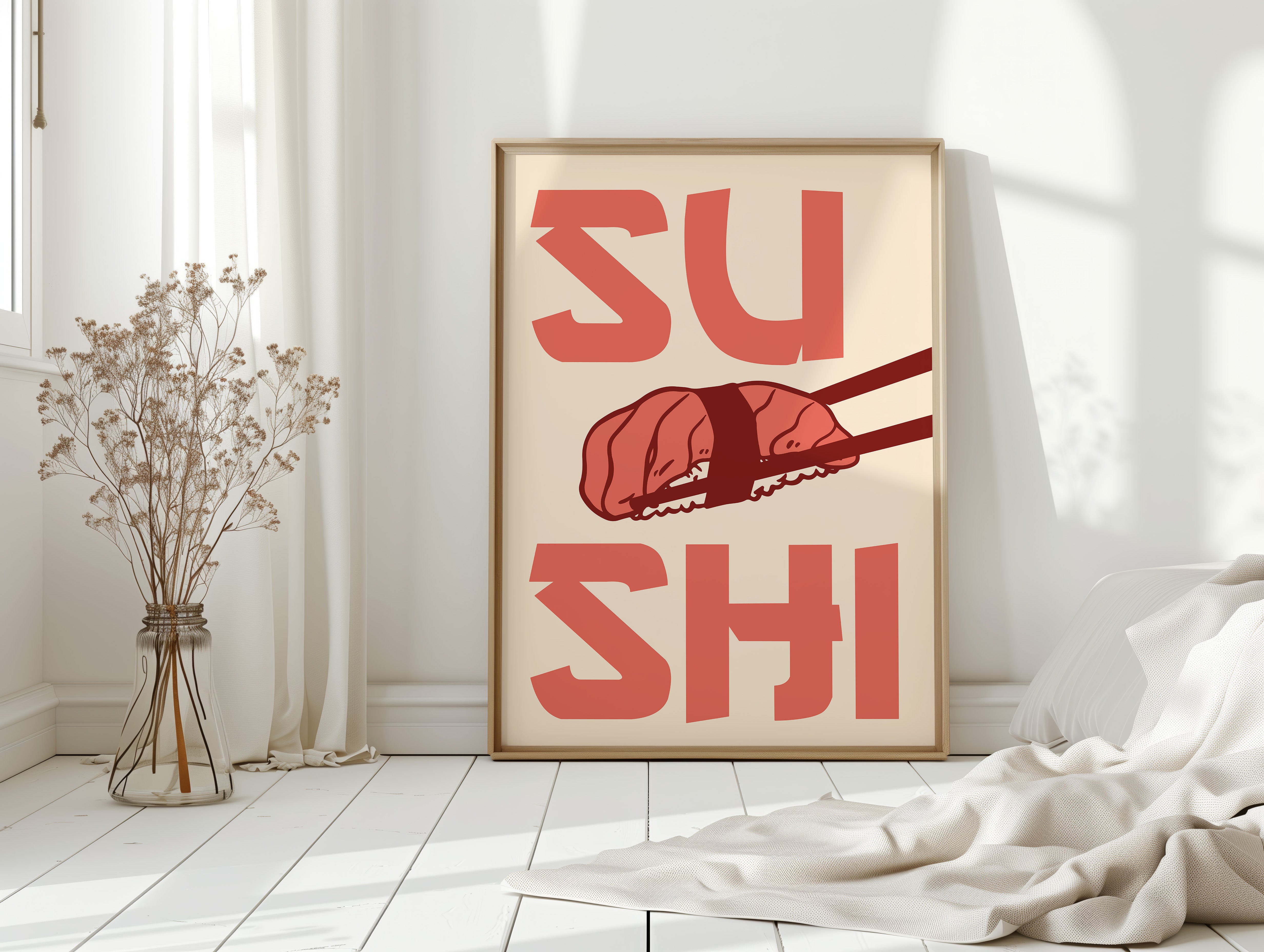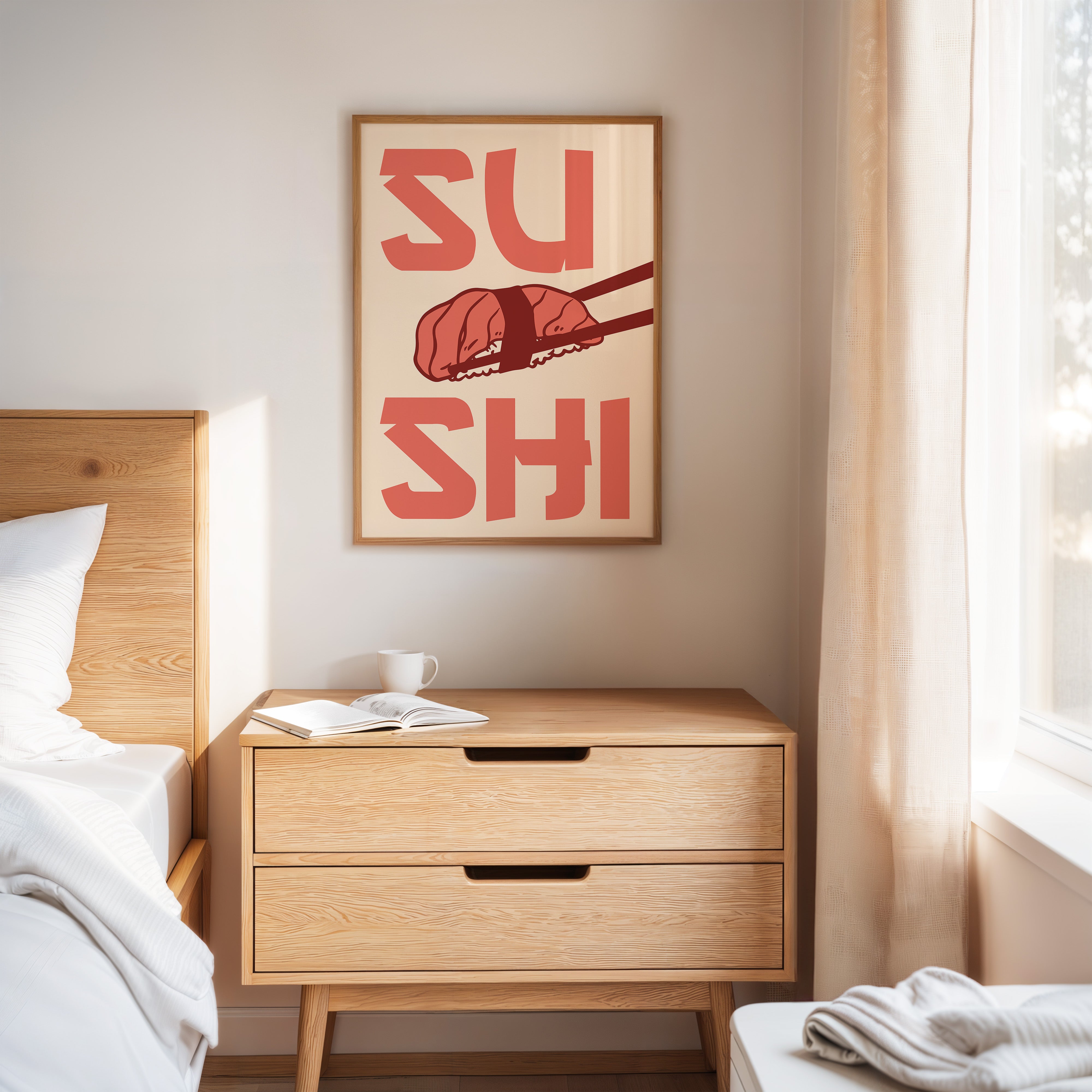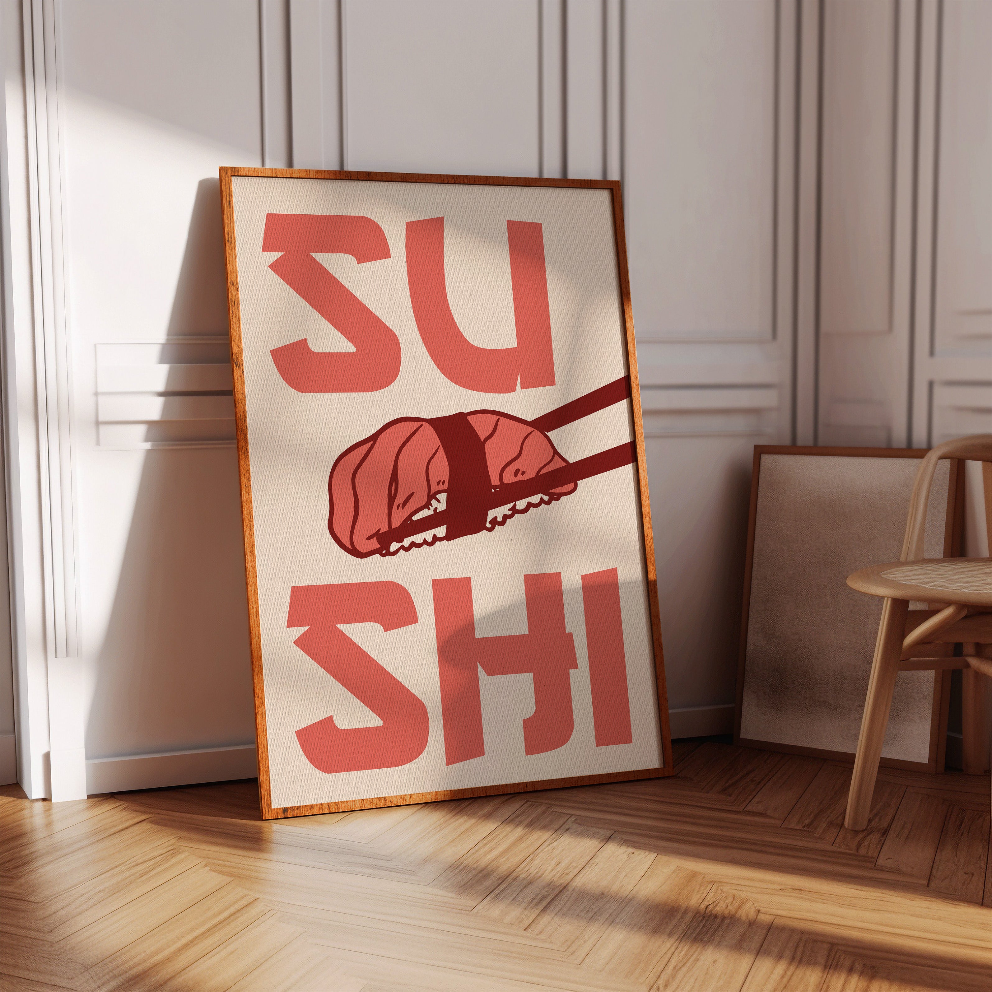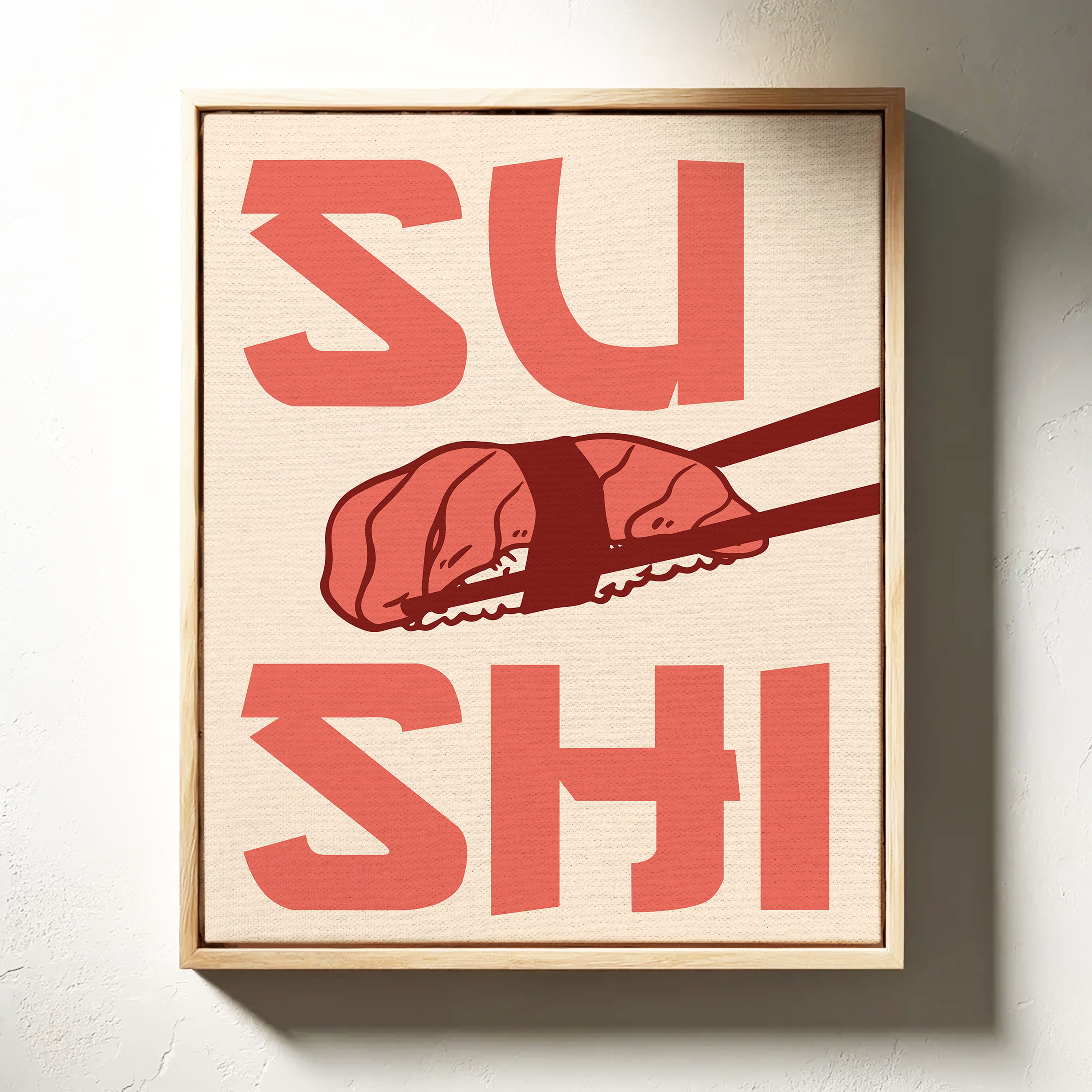 Bold typography meets culinary artistry in this minimalist celebration of sushi culture. A striking piece from our Contemporary collection that marries modern design with traditional Japanese cuisine. The coral-hued letters frame a perfectly rendered nigiri, while chopsticks delicately grasp the salmon's tender form - creating a composition that's both graphic and gastronomic. This statement piece brings sophisticated charm to dining spaces and modern kitchens. A conversation starter that celebrates the intersection of food culture and design.