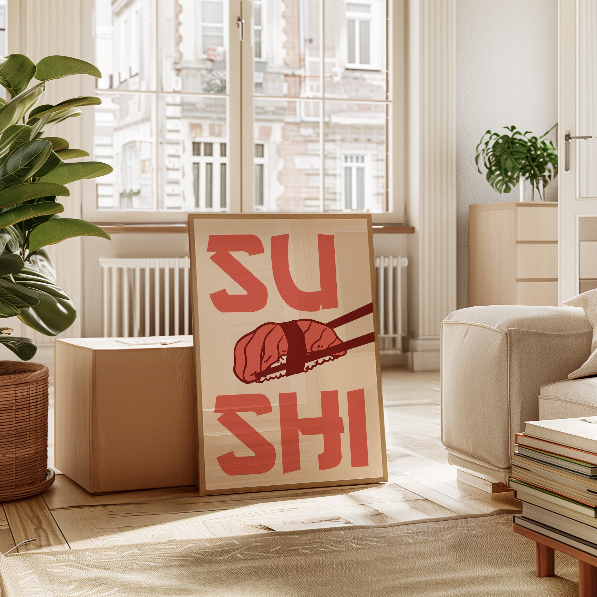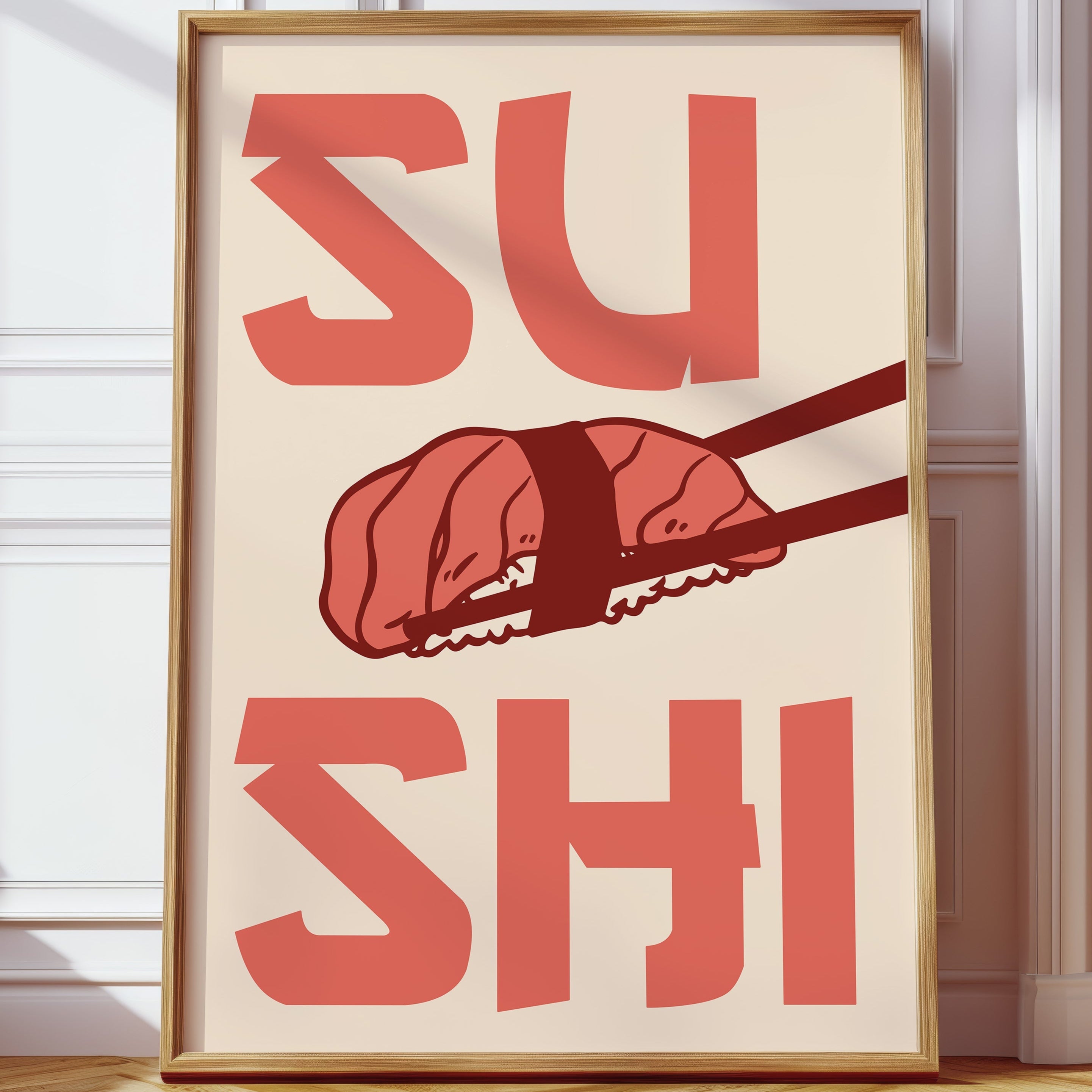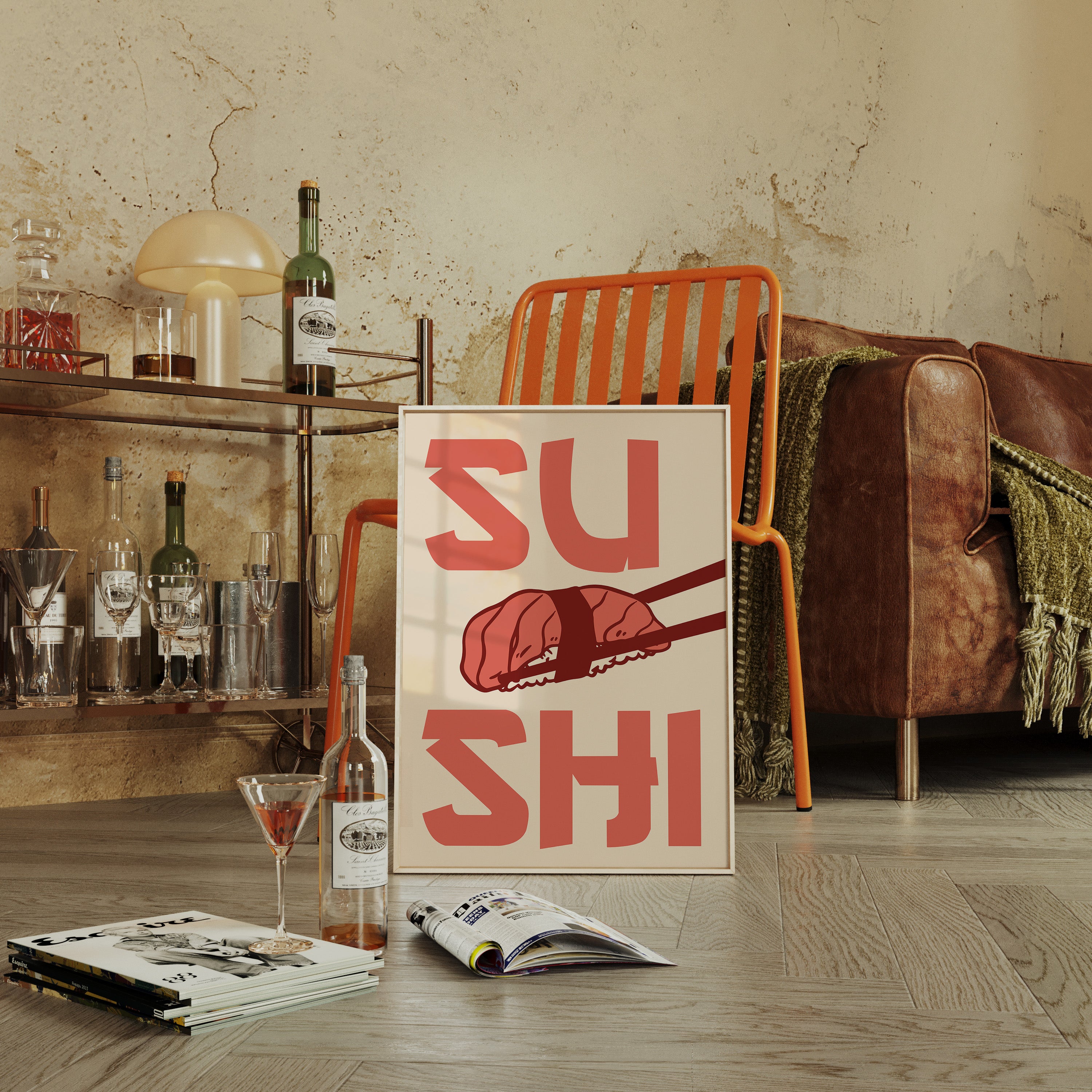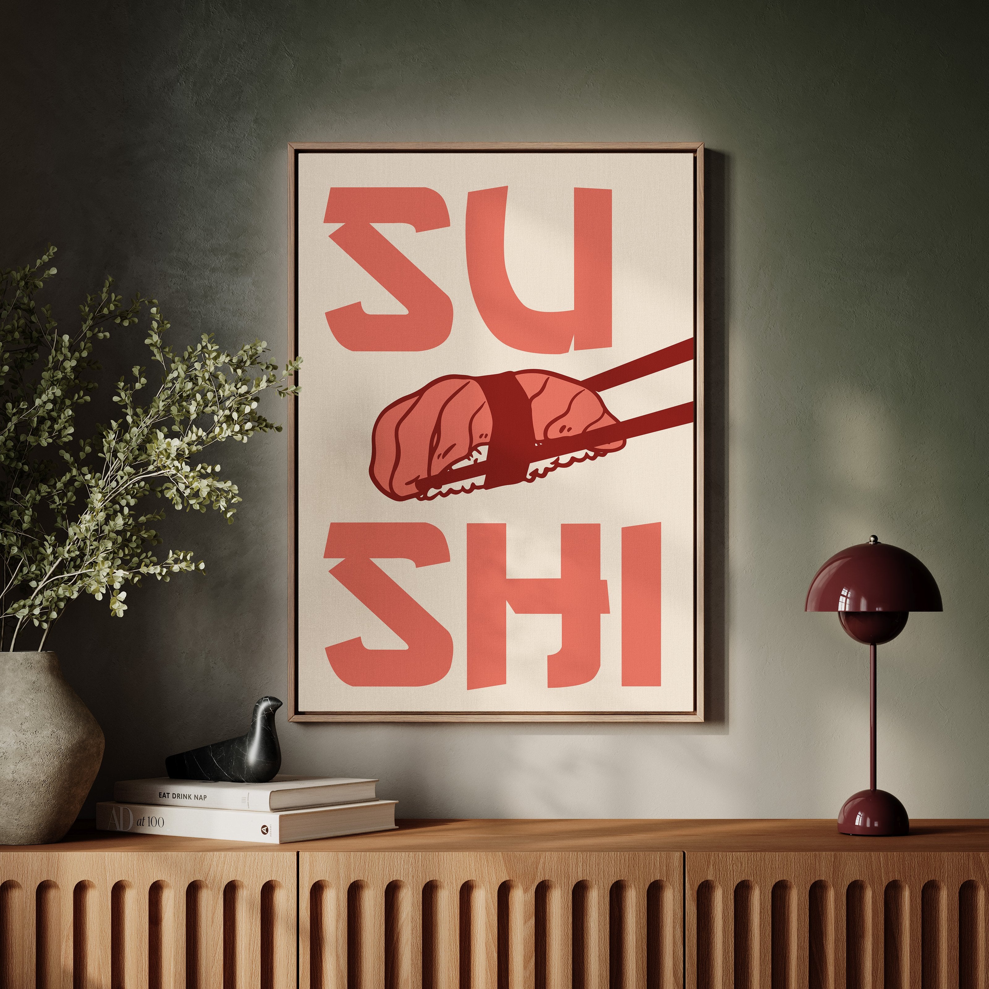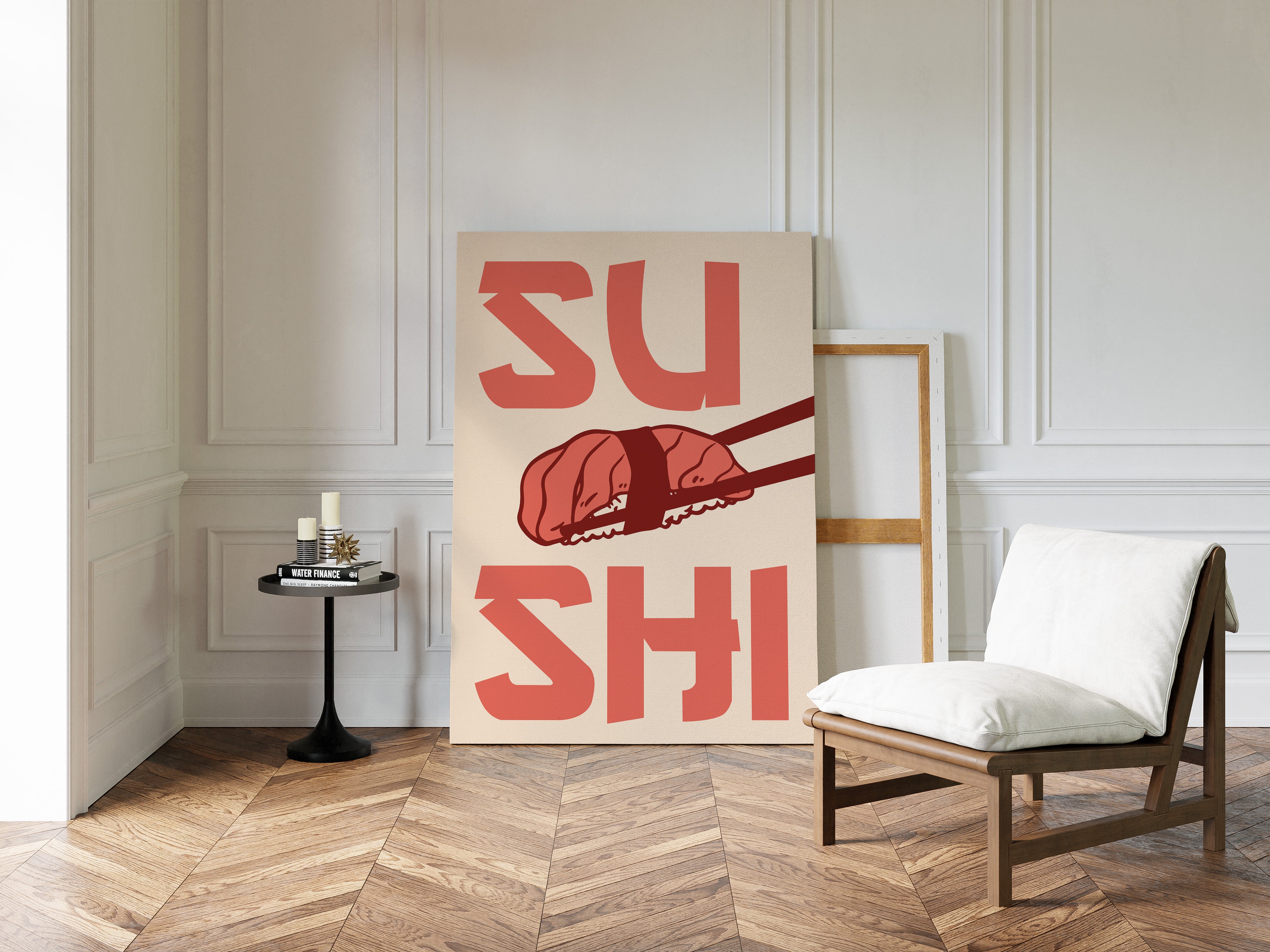 Bold typography meets culinary artistry in this minimalist celebration of sushi culture. A striking piece from our Contemporary collection that marries modern design with traditional Japanese cuisine. The coral-hued letters frame a perfectly rendered nigiri, while chopsticks delicately grasp the salmon's tender form - creating a composition that's both graphic and gastronomic. This statement piece brings sophisticated charm to dining spaces and modern kitchens. A conversation starter that celebrates the intersection of food culture and design.