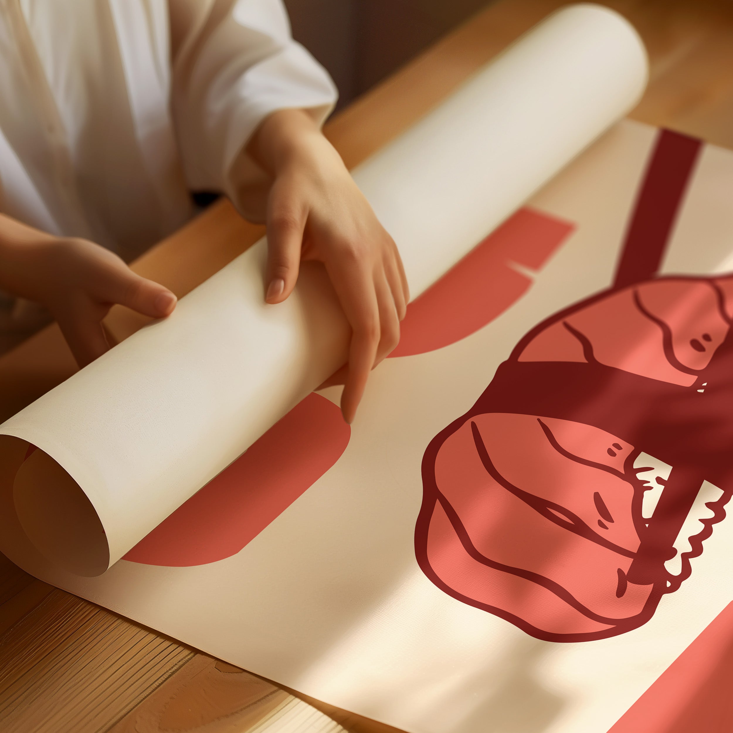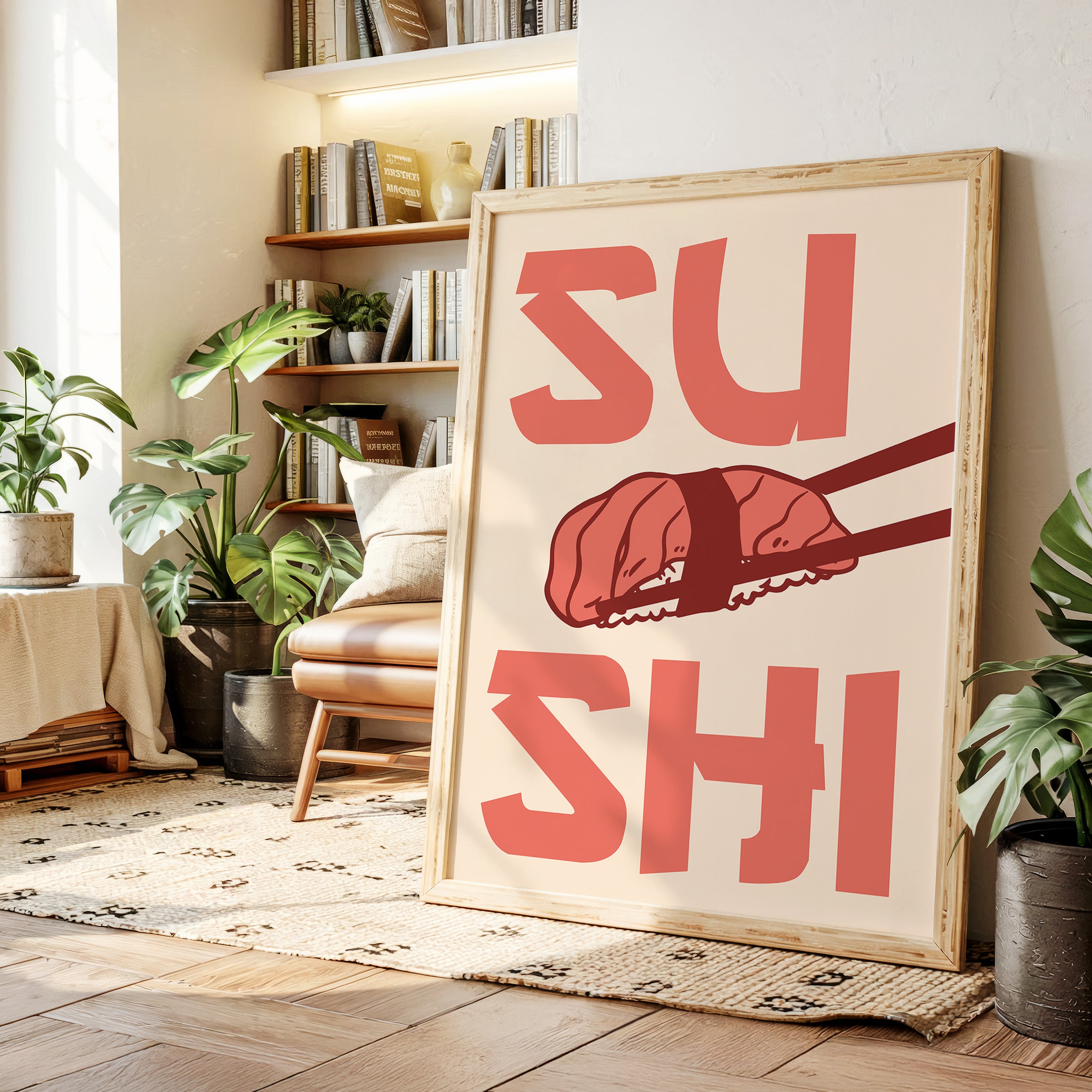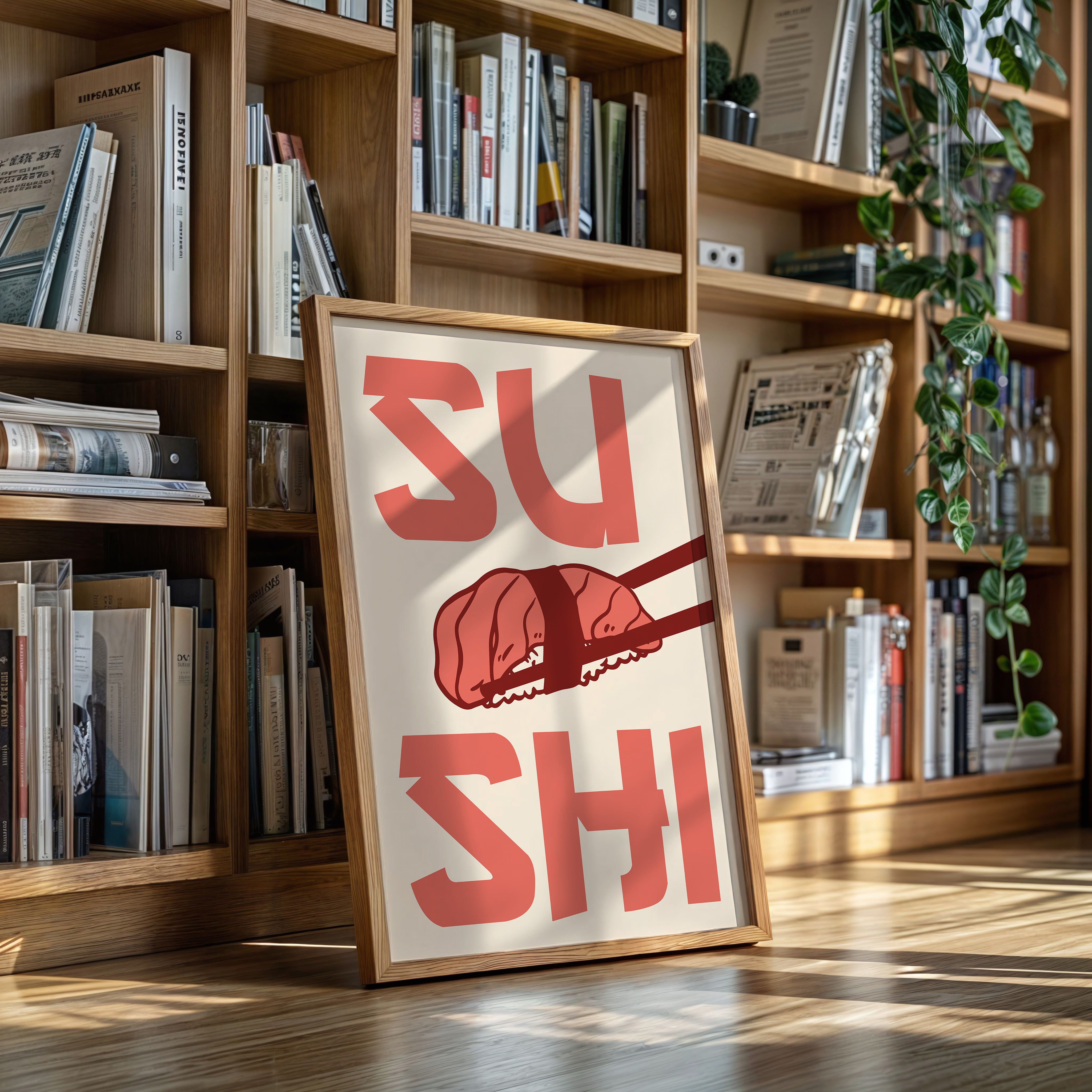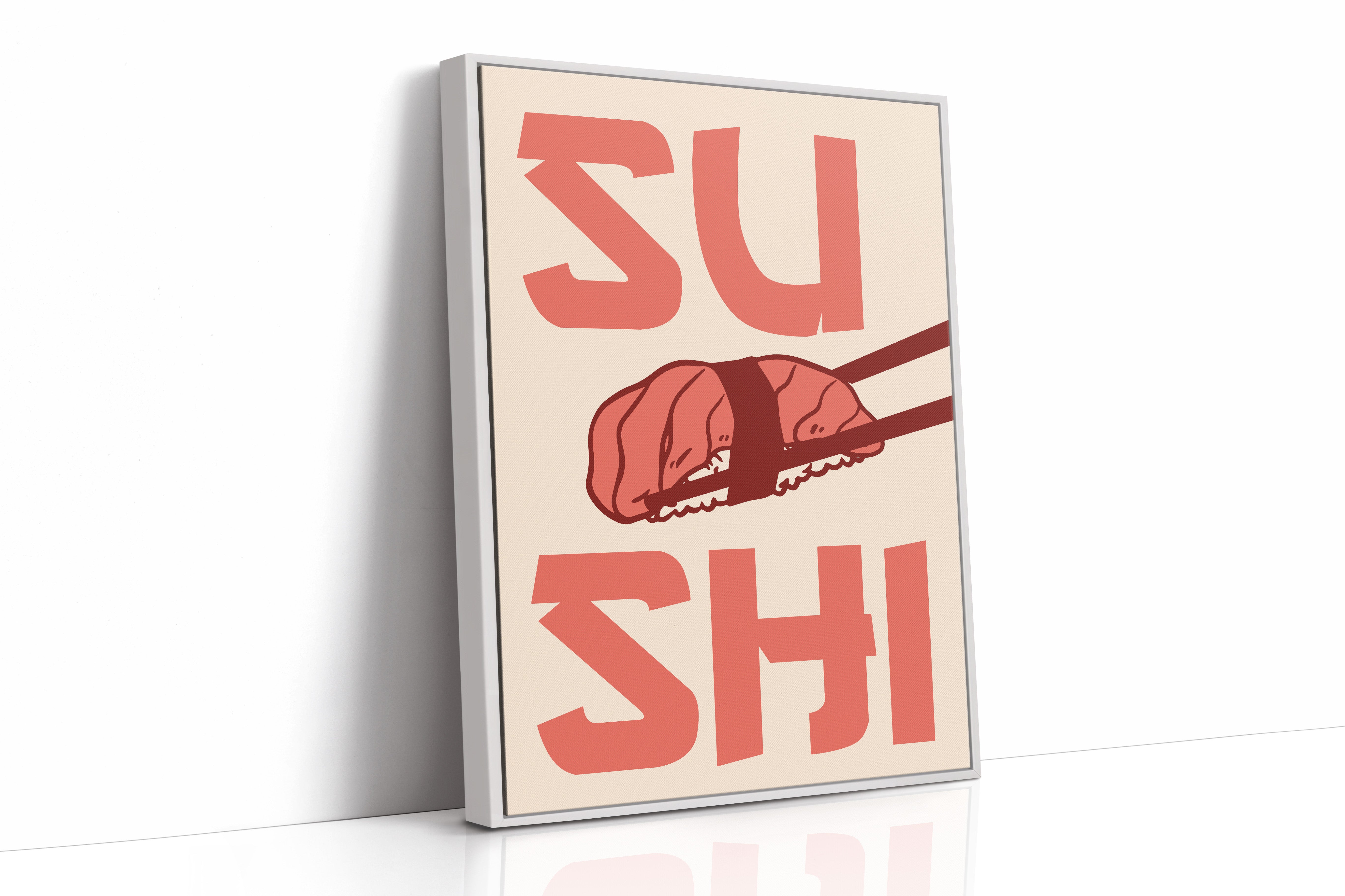 Bold typography meets culinary artistry in this minimalist celebration of sushi culture. A striking piece from our Contemporary collection that marries modern design with traditional Japanese cuisine. The coral-hued letters frame a perfectly rendered nigiri, while chopsticks delicately grasp the salmon's tender form - creating a composition that's both graphic and gastronomic. This statement piece brings sophisticated charm to dining spaces and modern kitchens. A conversation starter that celebrates the intersection of food culture and design.