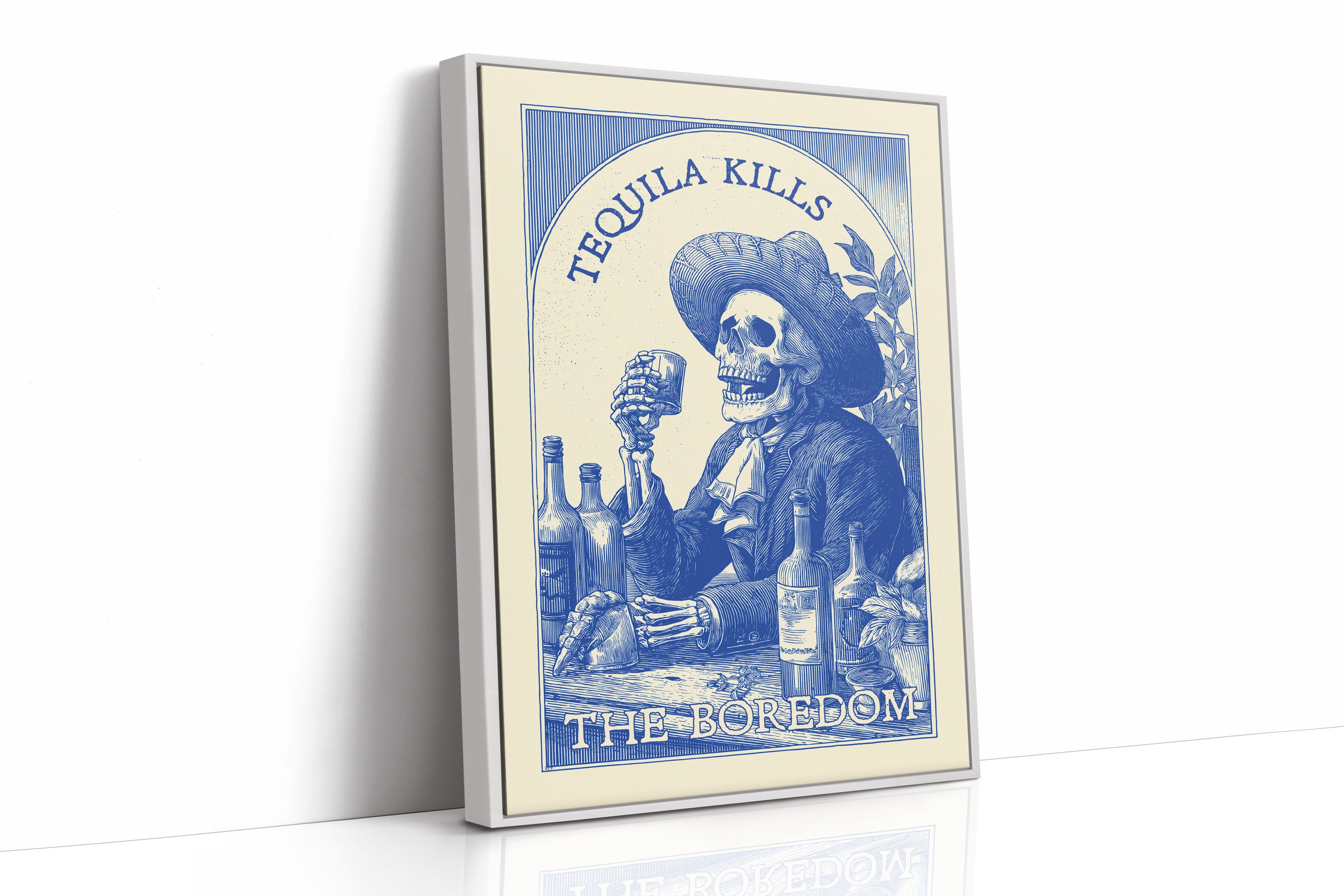 A striking blue illustration captures the irreverent spirit of cantina culture, framed elegantly against weathered wood paneling. The skeleton mariachi in his wide-brimmed sombrero raises a bottle in eternal toast, surrounded by the warm amber glow of pendant lights. This piece brings together rustic southwestern charm and darkly humorous folk art tradition.
