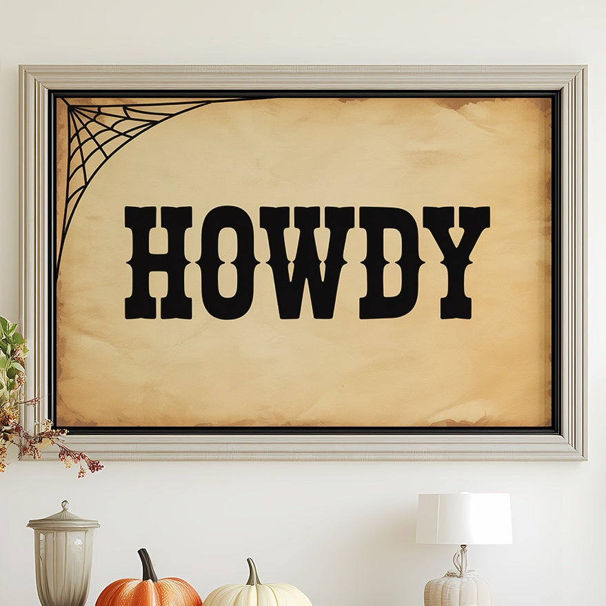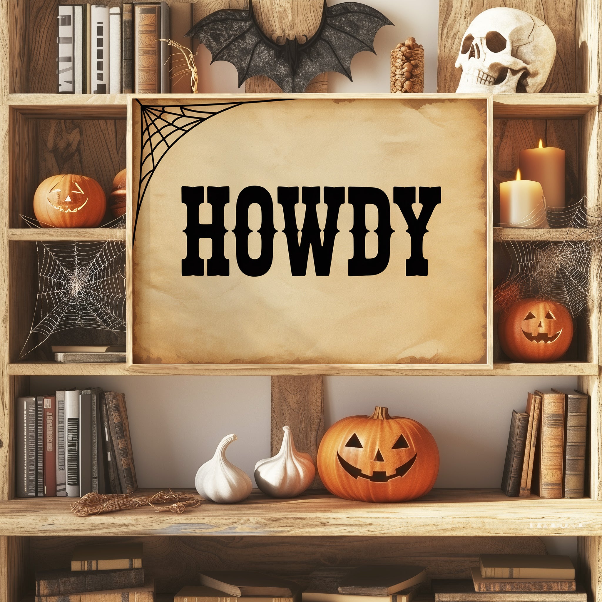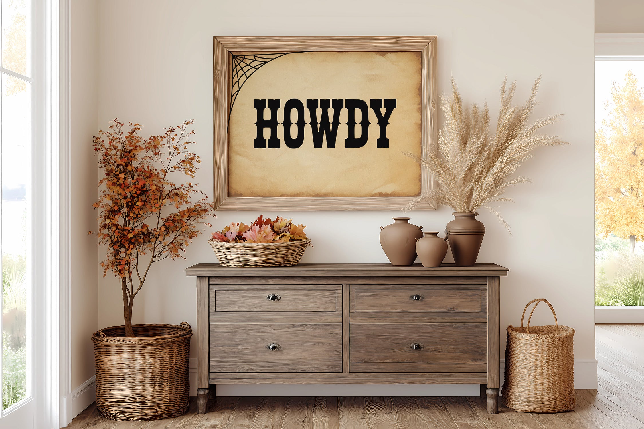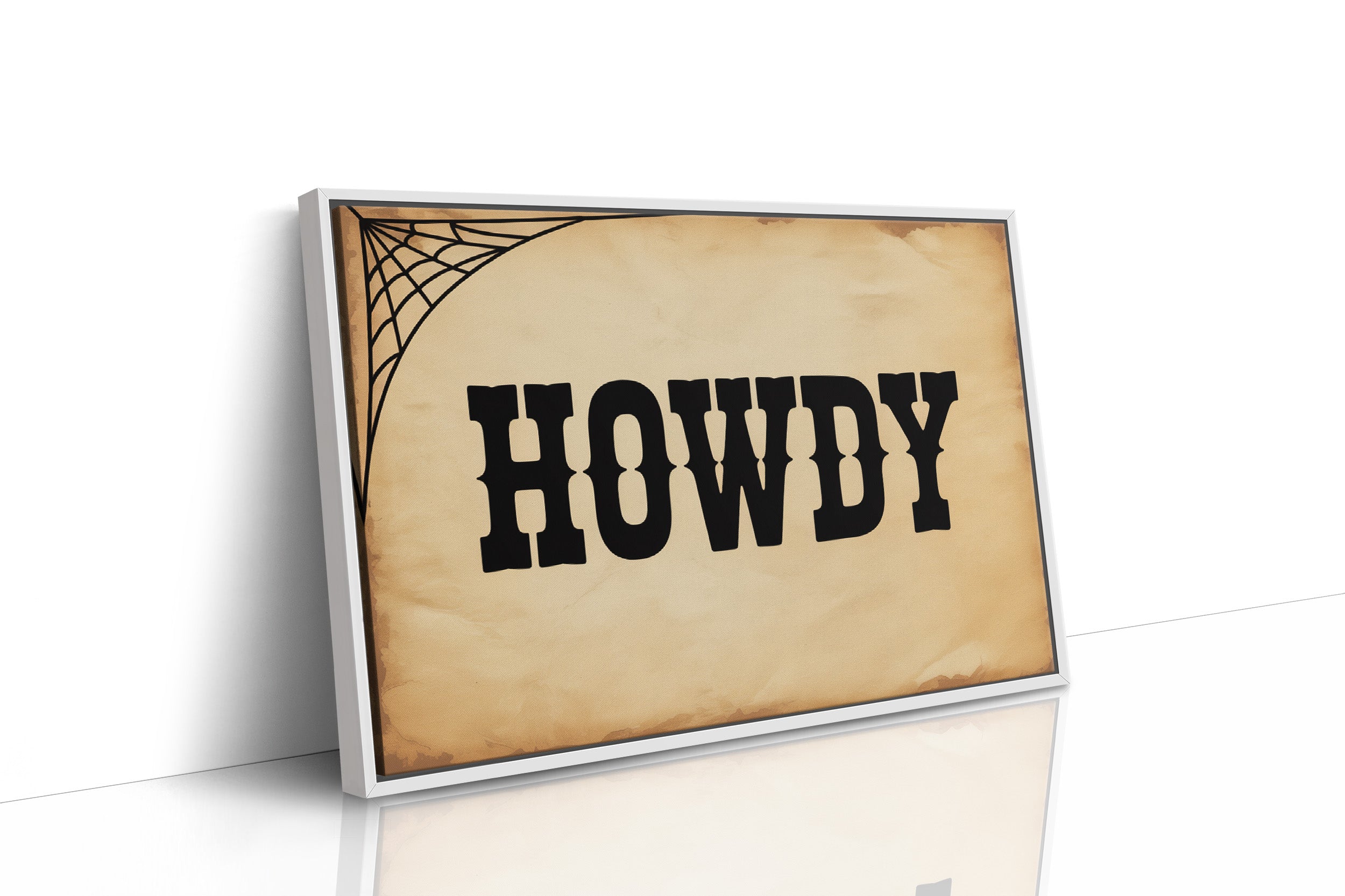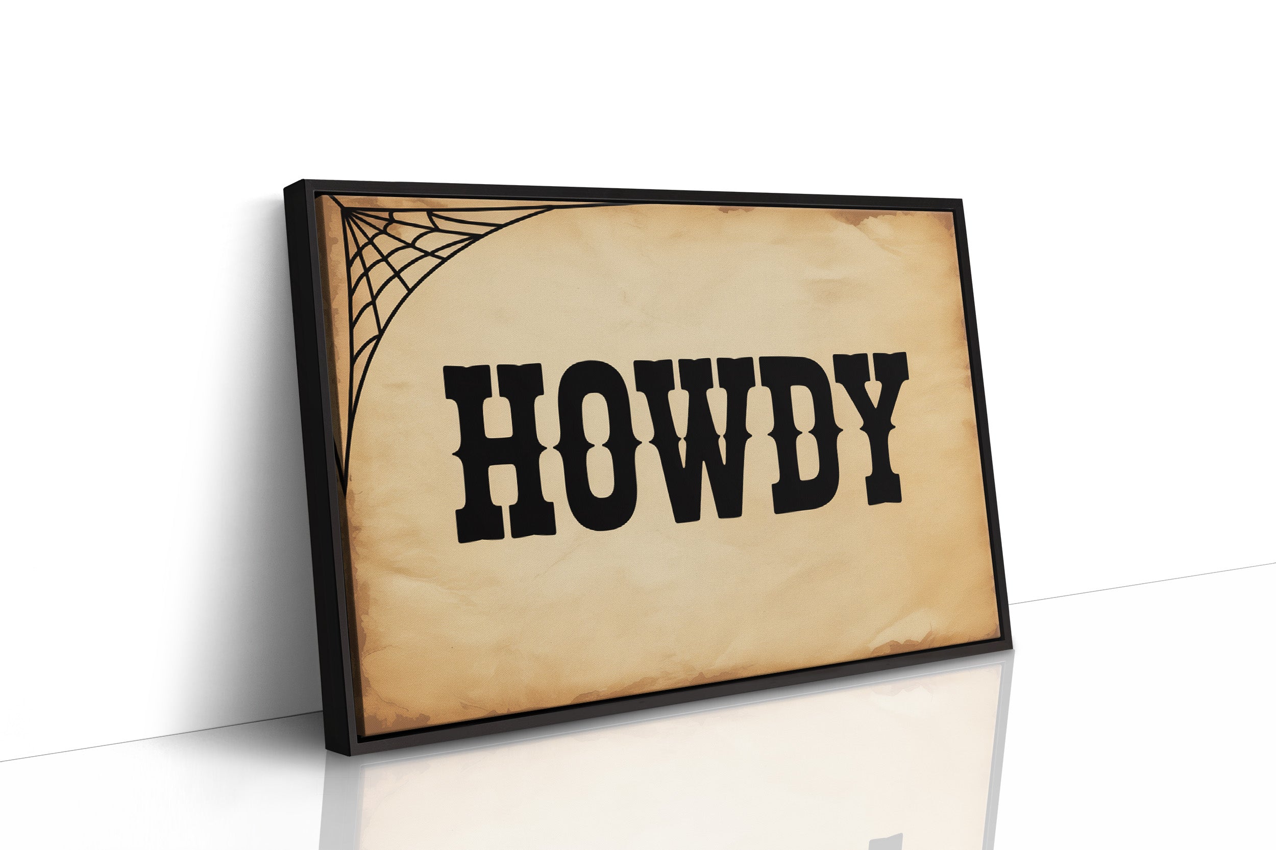 A weathered parchment holds a single bold word, inviting you into a world of dusty boots and swinging doors. The stark contrast between the aged sepia background and the confident black lettering evokes the raw simplicity of frontier life. The cobweb detail in the corner adds a touch of nostalgic abandonment, as if this sign has witnessed countless stories unfold beneath it. This piece brings character to home bars, rustic kitchens, or any space needing a touch of Western charm.