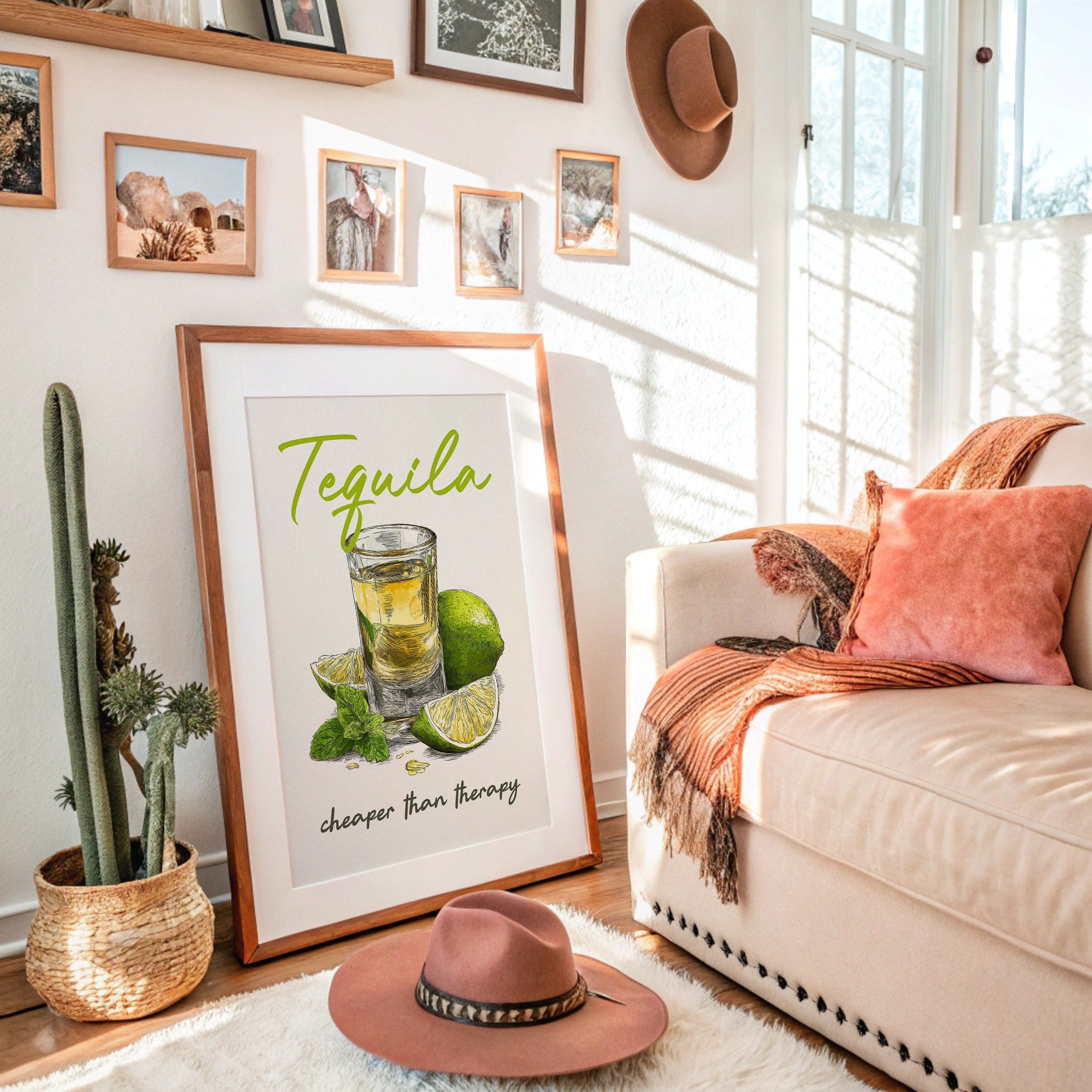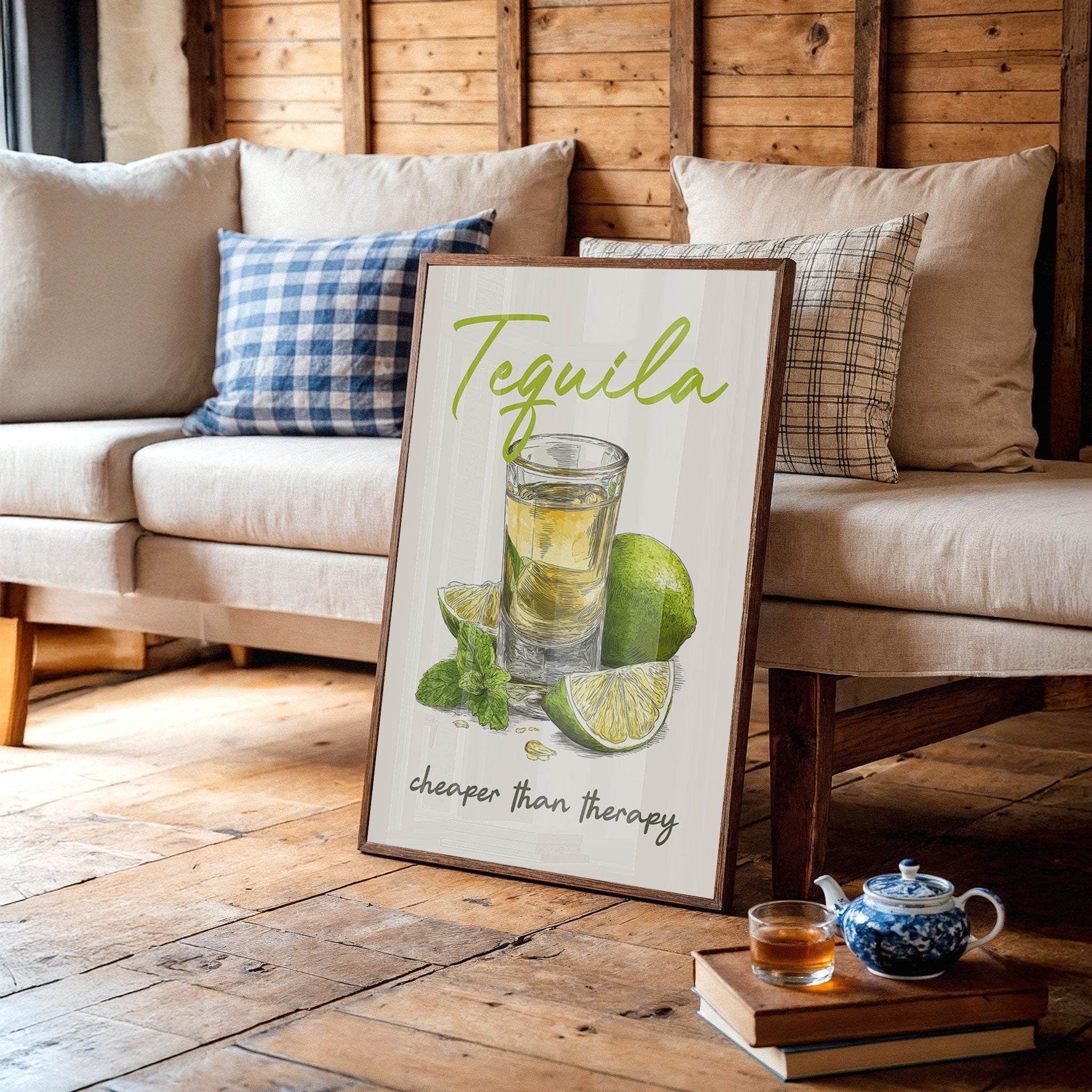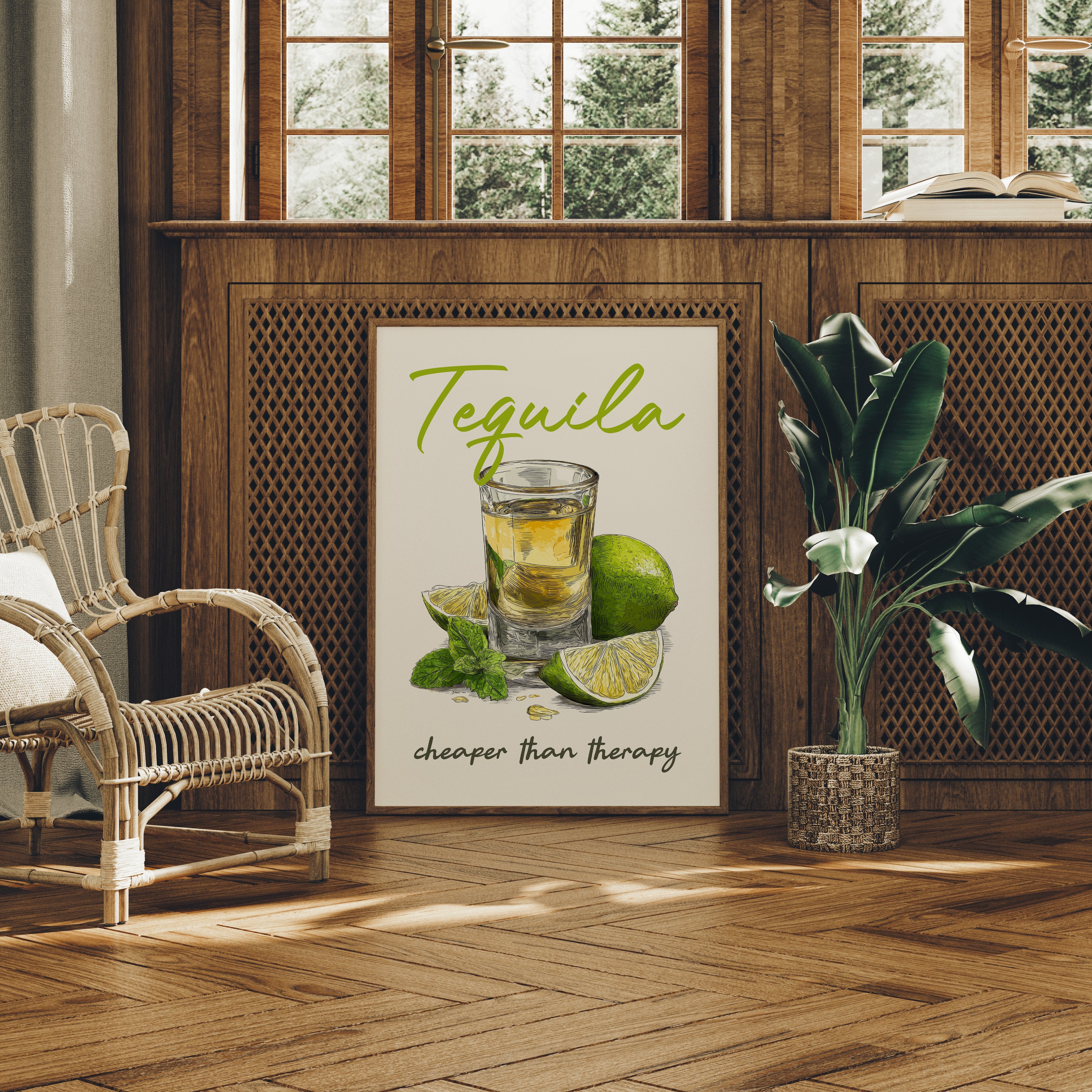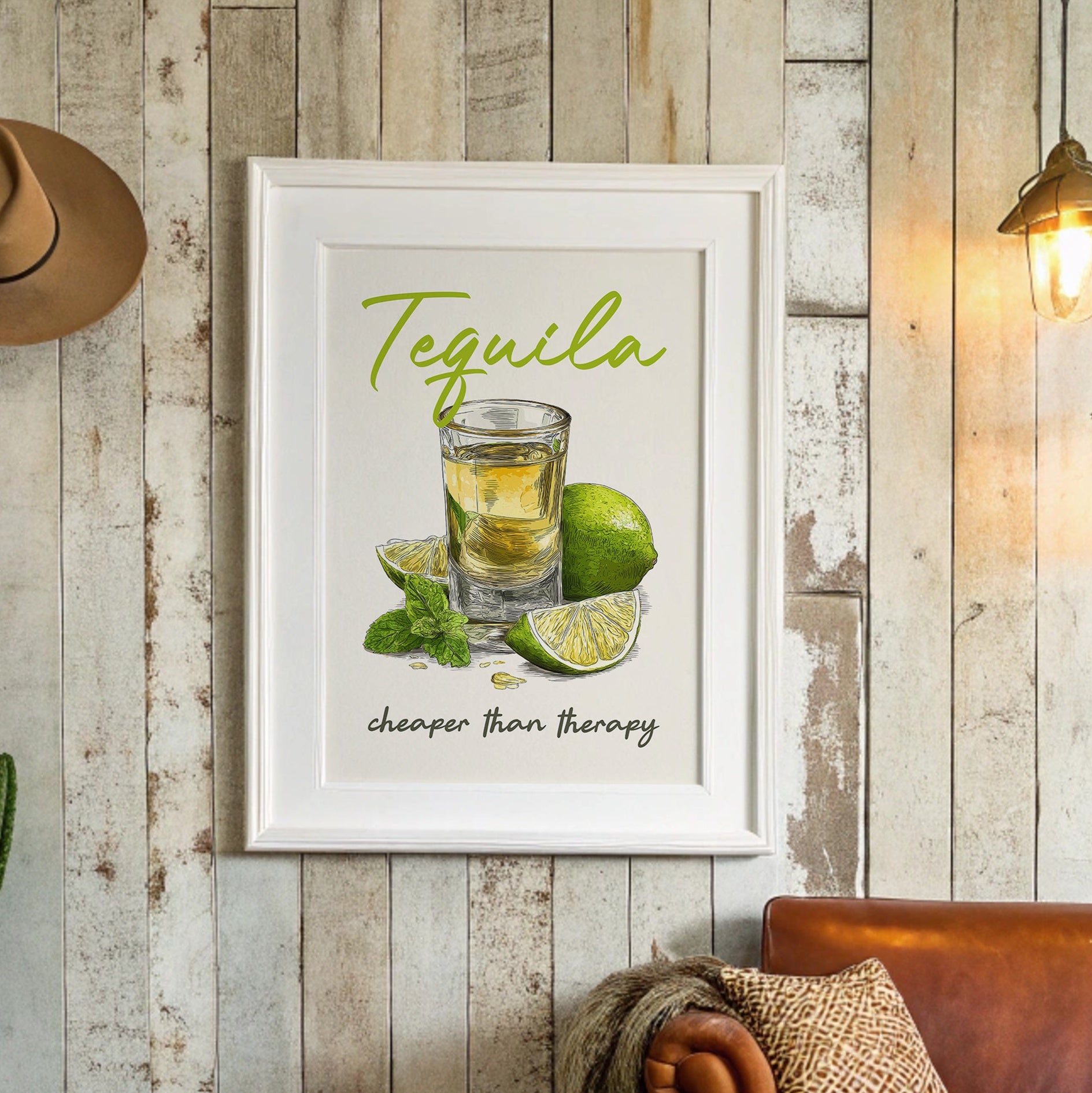 A playful tequila illustration finds its home among rustic wooden planks and warm leather. The vibrant lime green lettering pops against weathered wood paneling, while the amber shot glass and fresh citrus create a moment of casual sophistication. This southwestern-inspired space balances earthy tones with touches of greenery and golden light from vintage pendants.