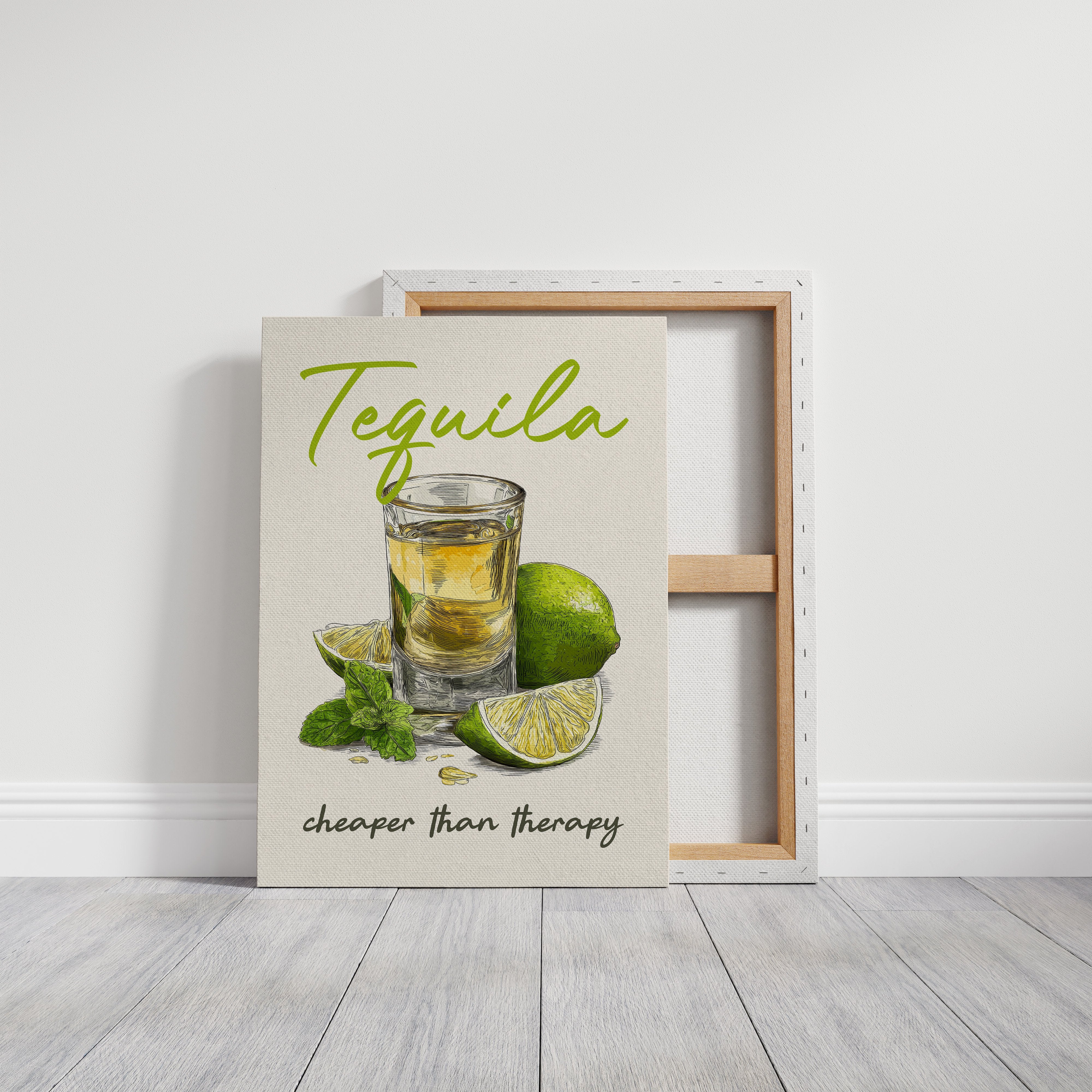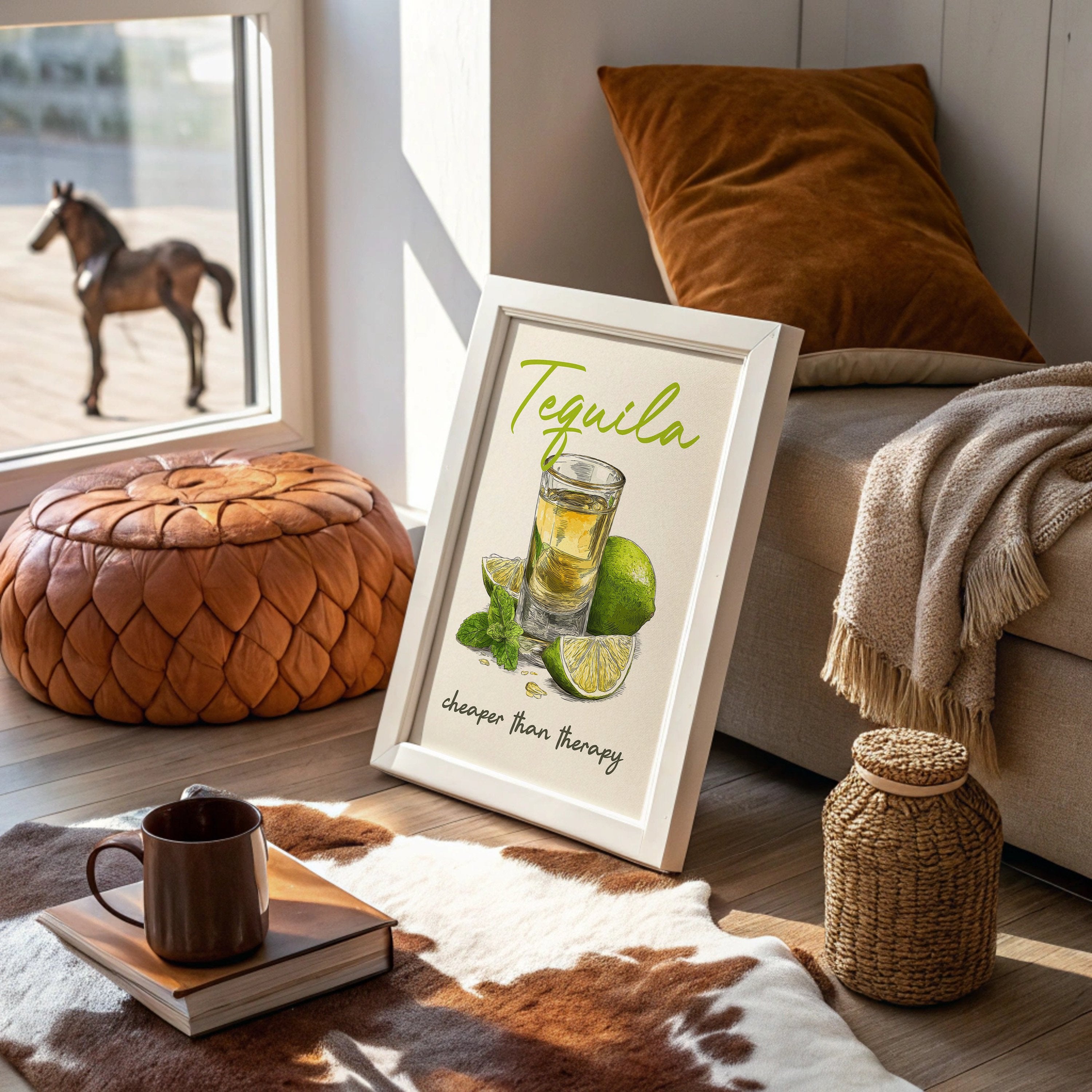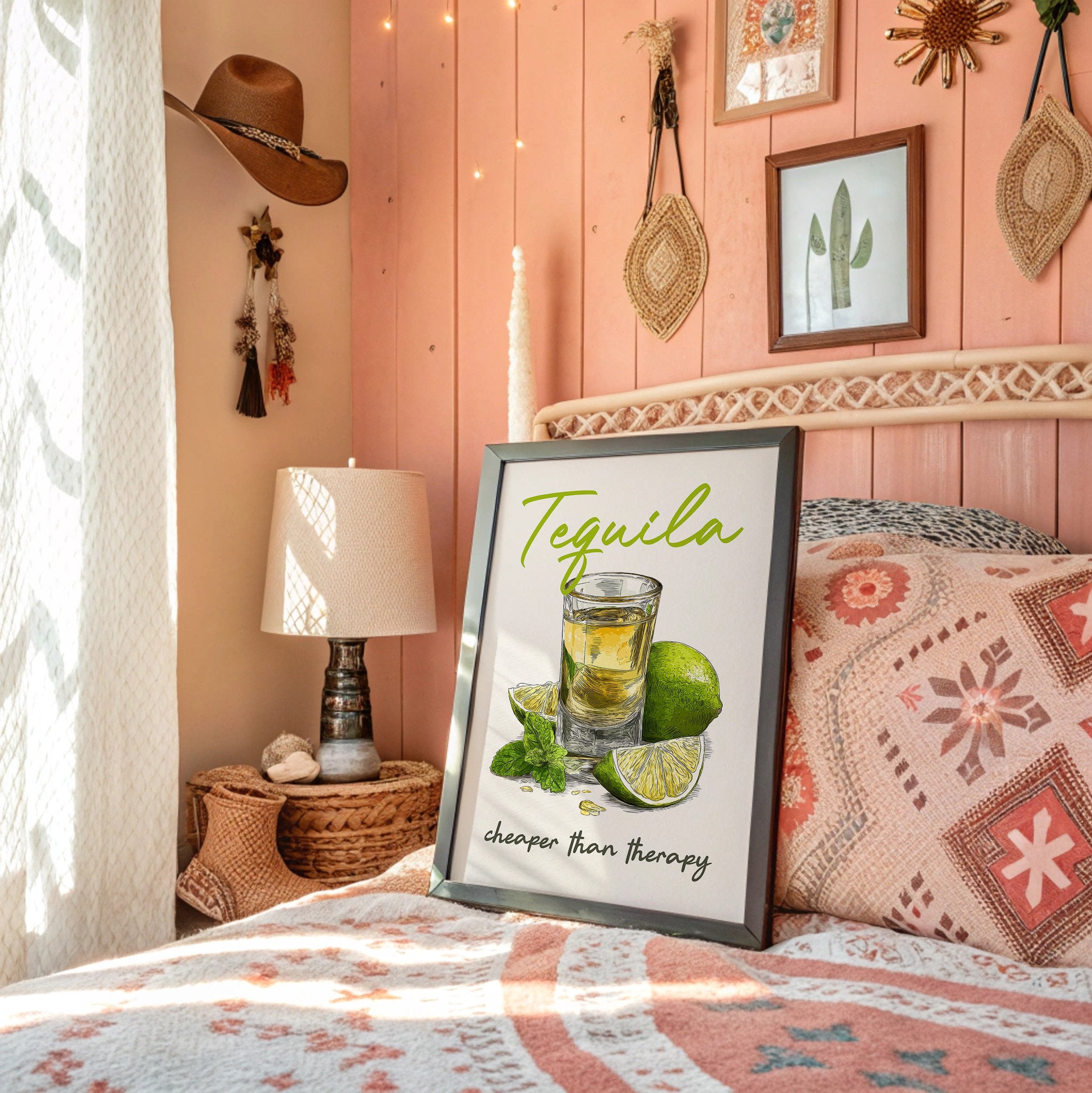 A playful tequila illustration finds its home among rustic wooden planks and warm leather. The vibrant lime green lettering pops against weathered wood paneling, while the amber shot glass and fresh citrus create a moment of casual sophistication. This southwestern-inspired space balances earthy tones with touches of greenery and golden light from vintage pendants.