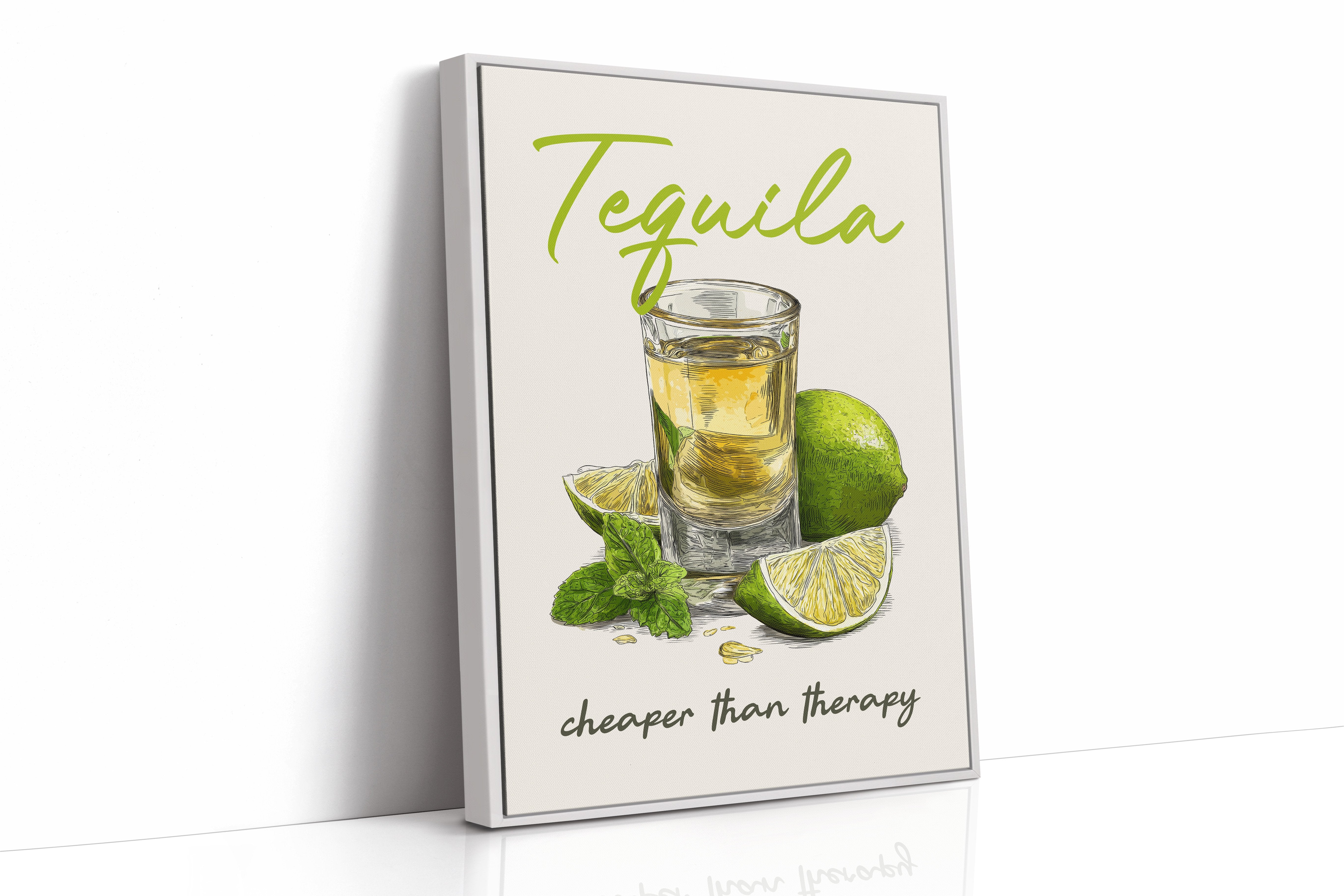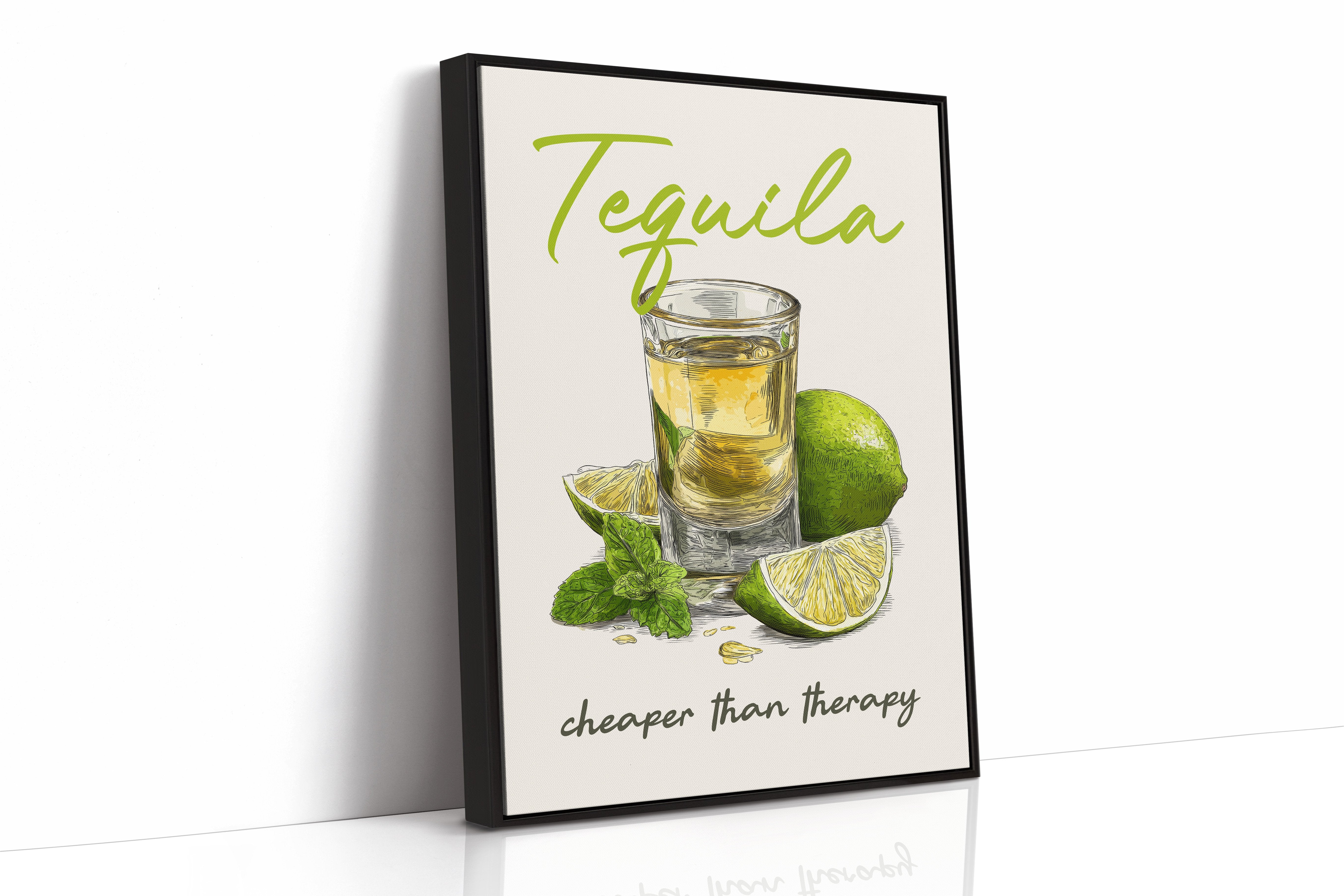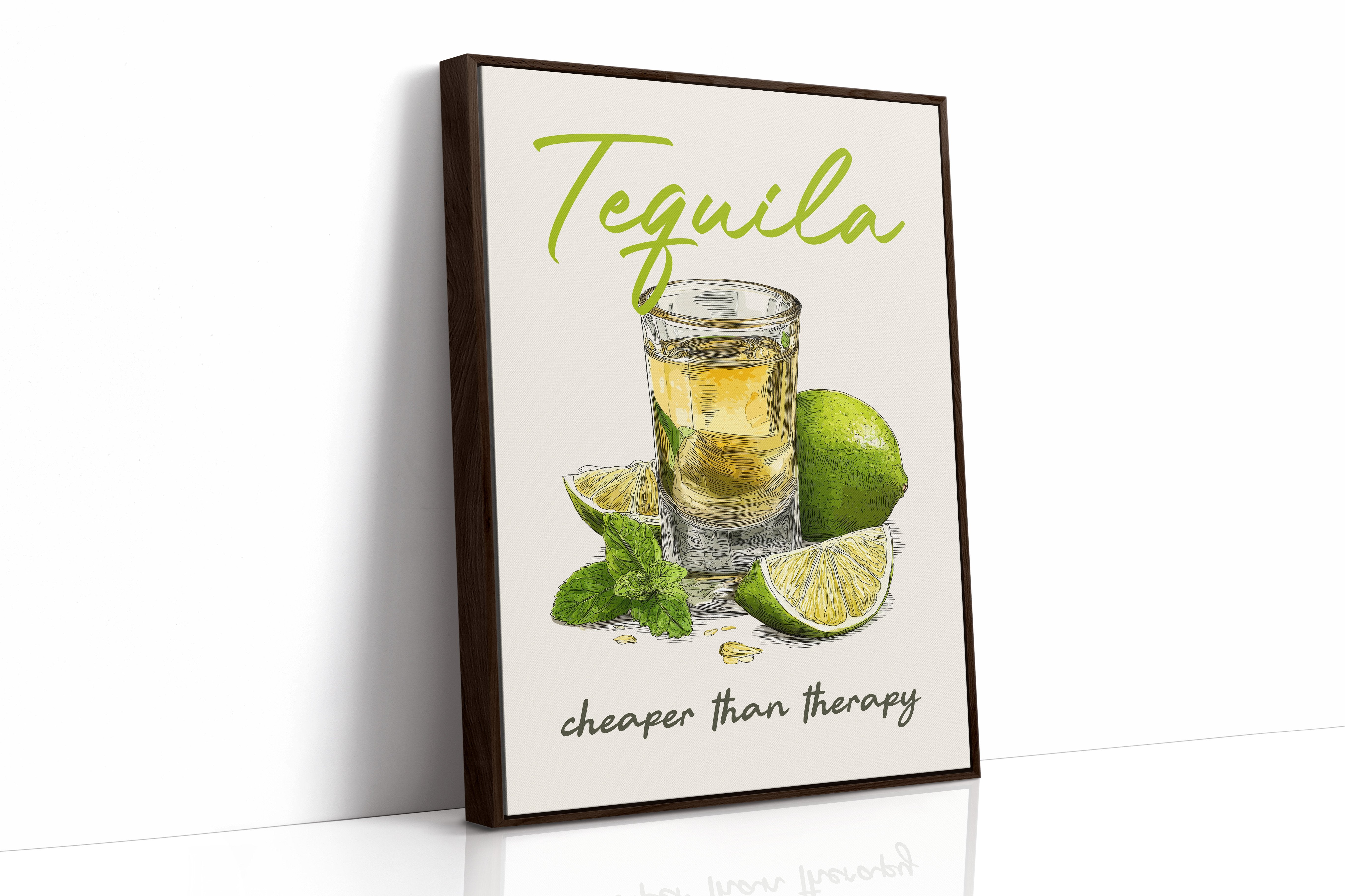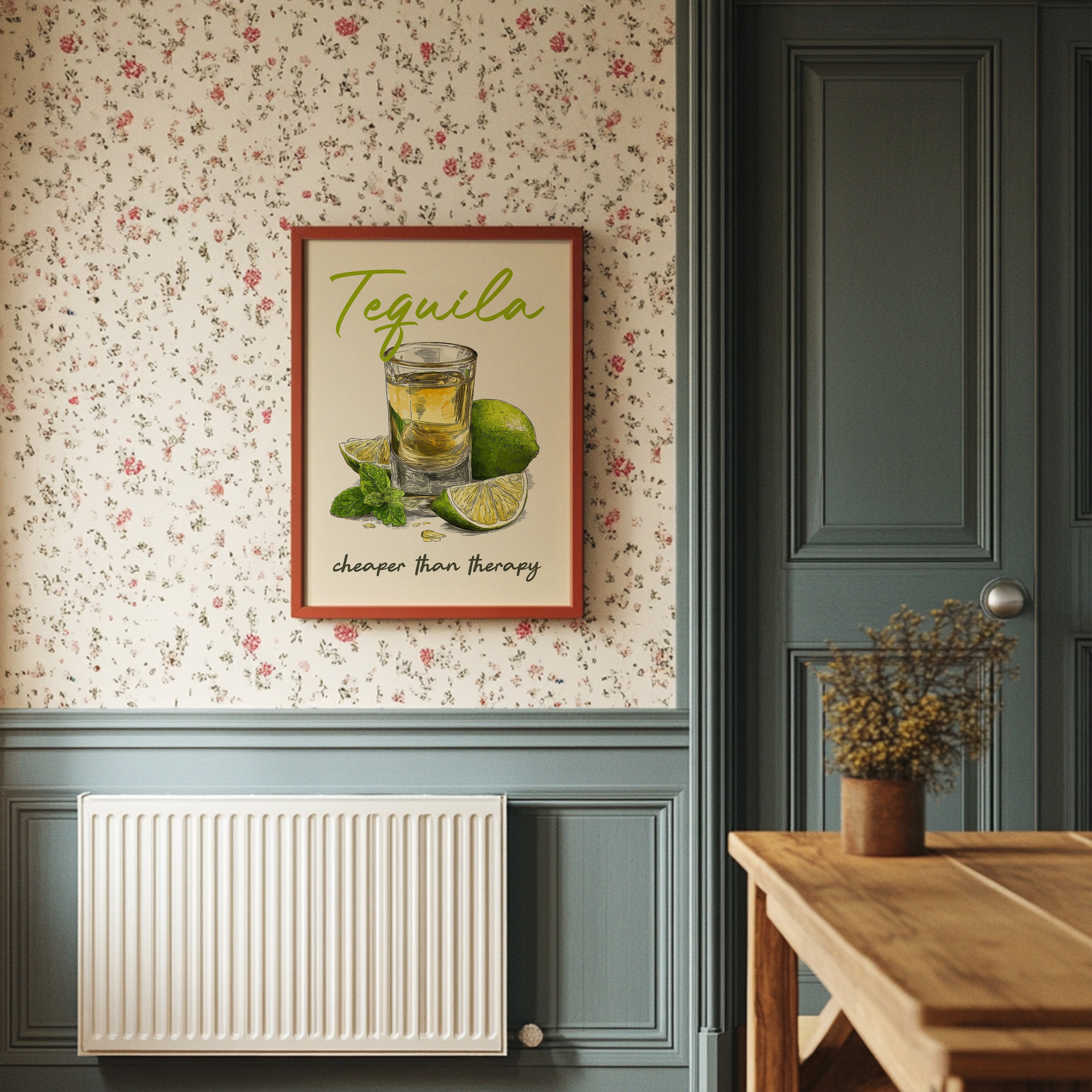 A playful tequila illustration finds its home among rustic wooden planks and warm leather. The vibrant lime green lettering pops against weathered wood paneling, while the amber shot glass and fresh citrus create a moment of casual sophistication. This southwestern-inspired space balances earthy tones with touches of greenery and golden light from vintage pendants.