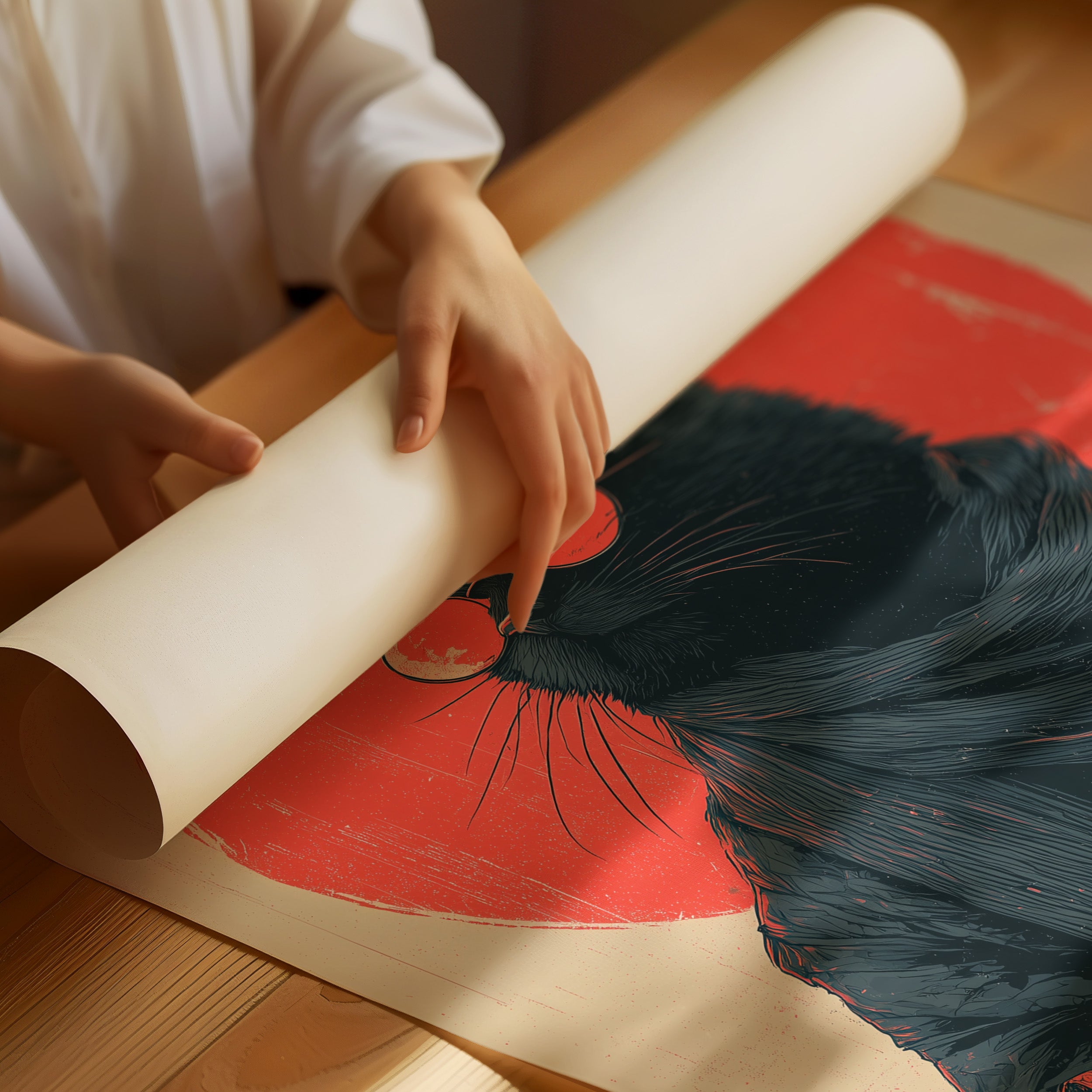 A mysterious feline warrior emerges from shadow, its silhouette stark against a brilliant crimson sun. The black cat, adorned in traditional samurai robes and distinctive red circular glasses, commands attention with regal posture and an air of ancient wisdom. Dark fabric folds and the subtle outline of a katana create a compelling fusion of playful pet portraiture and noble Japanese warrior tradition. This striking piece would make a bold statement in a modern study or creative workspace, where its blend of pop culture and traditional Asian aesthetics can inspire both focus and imagination.