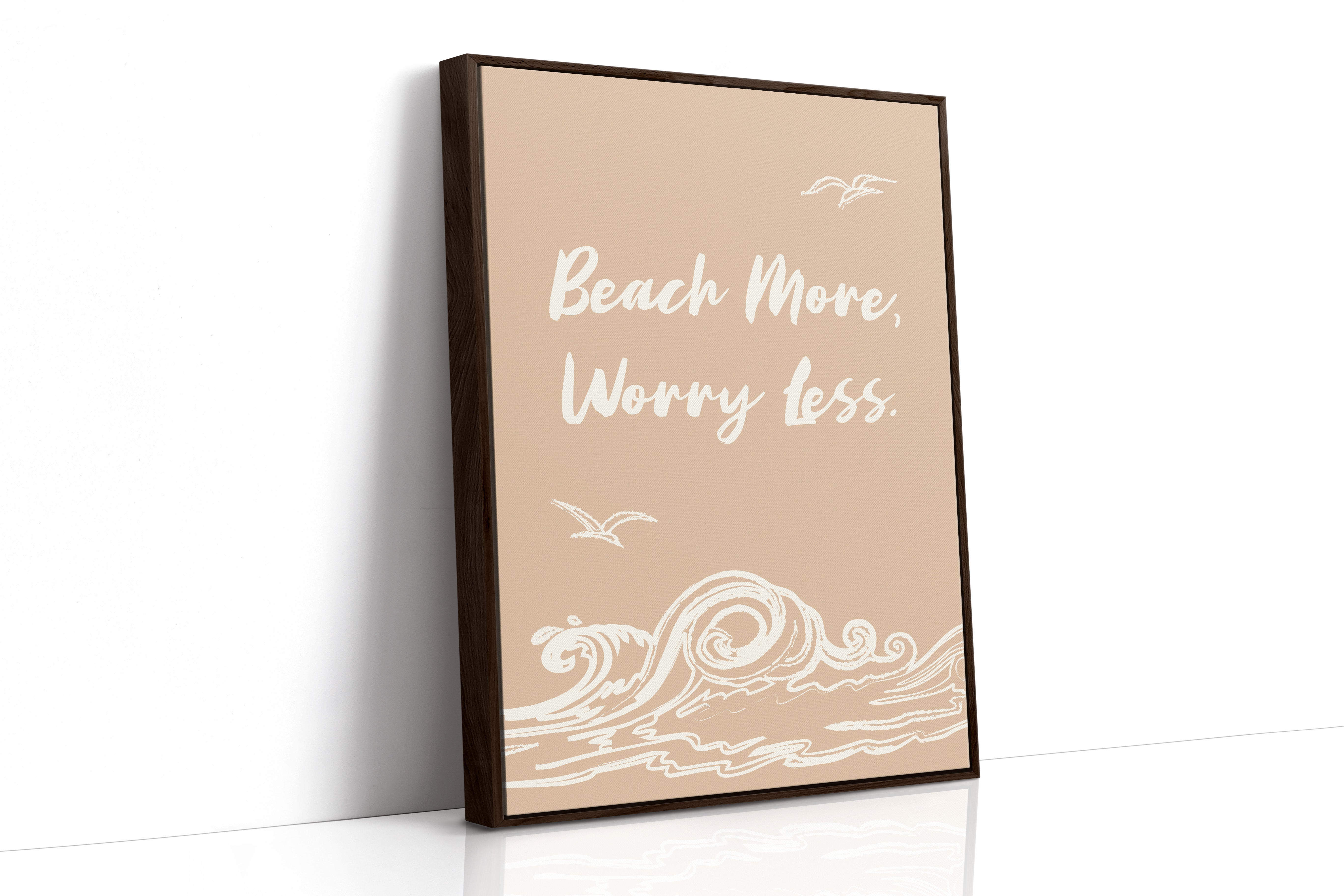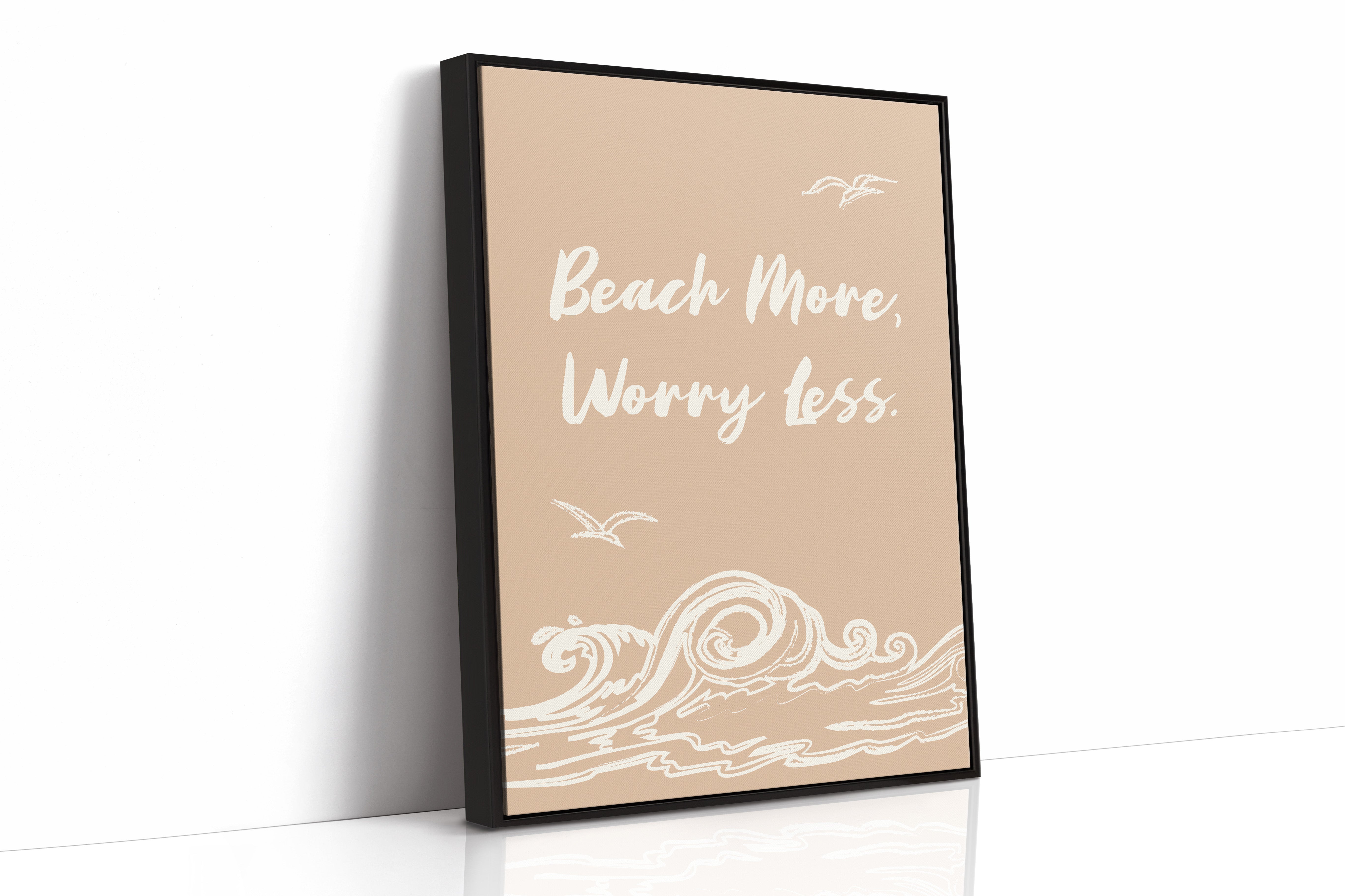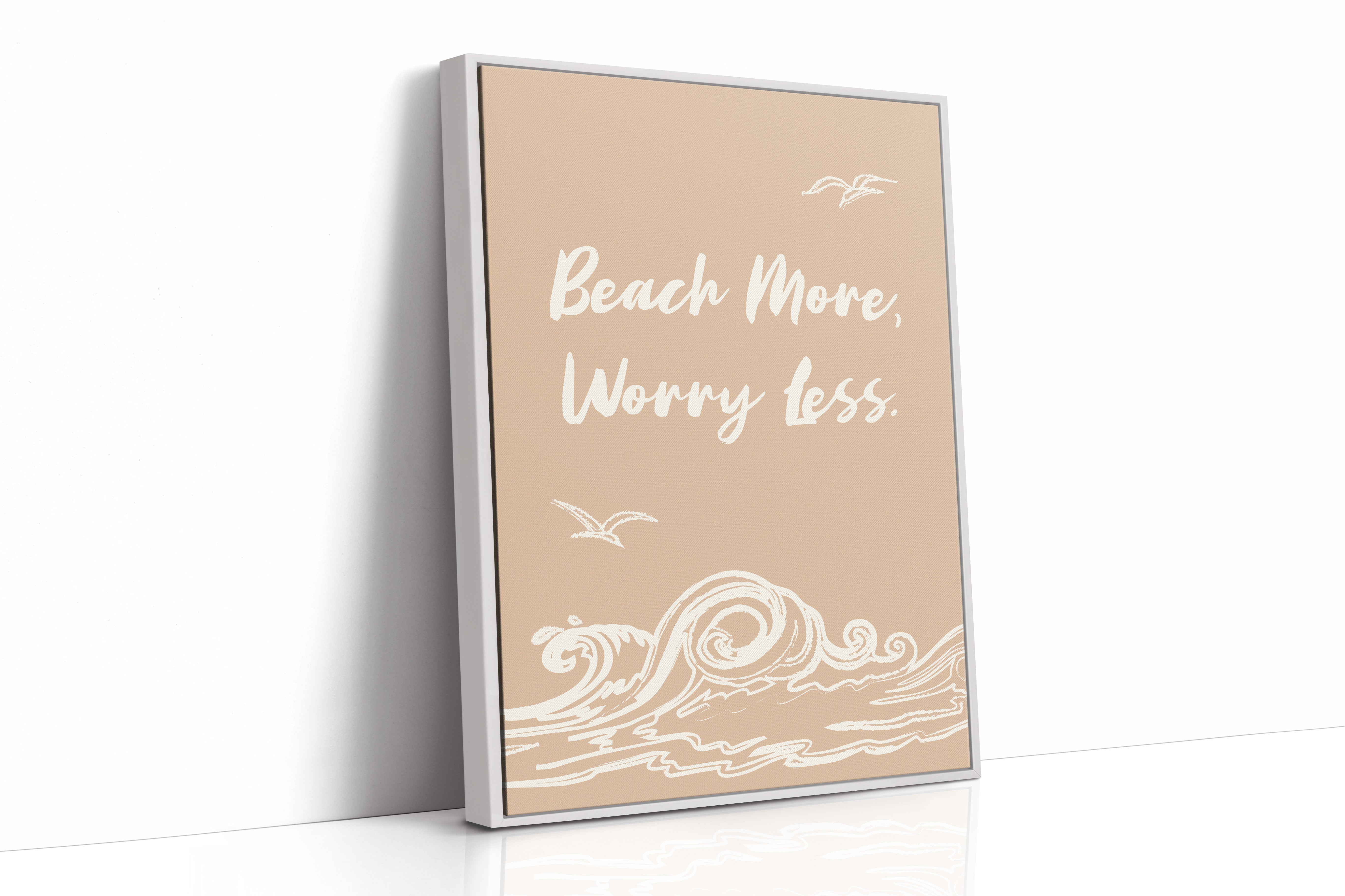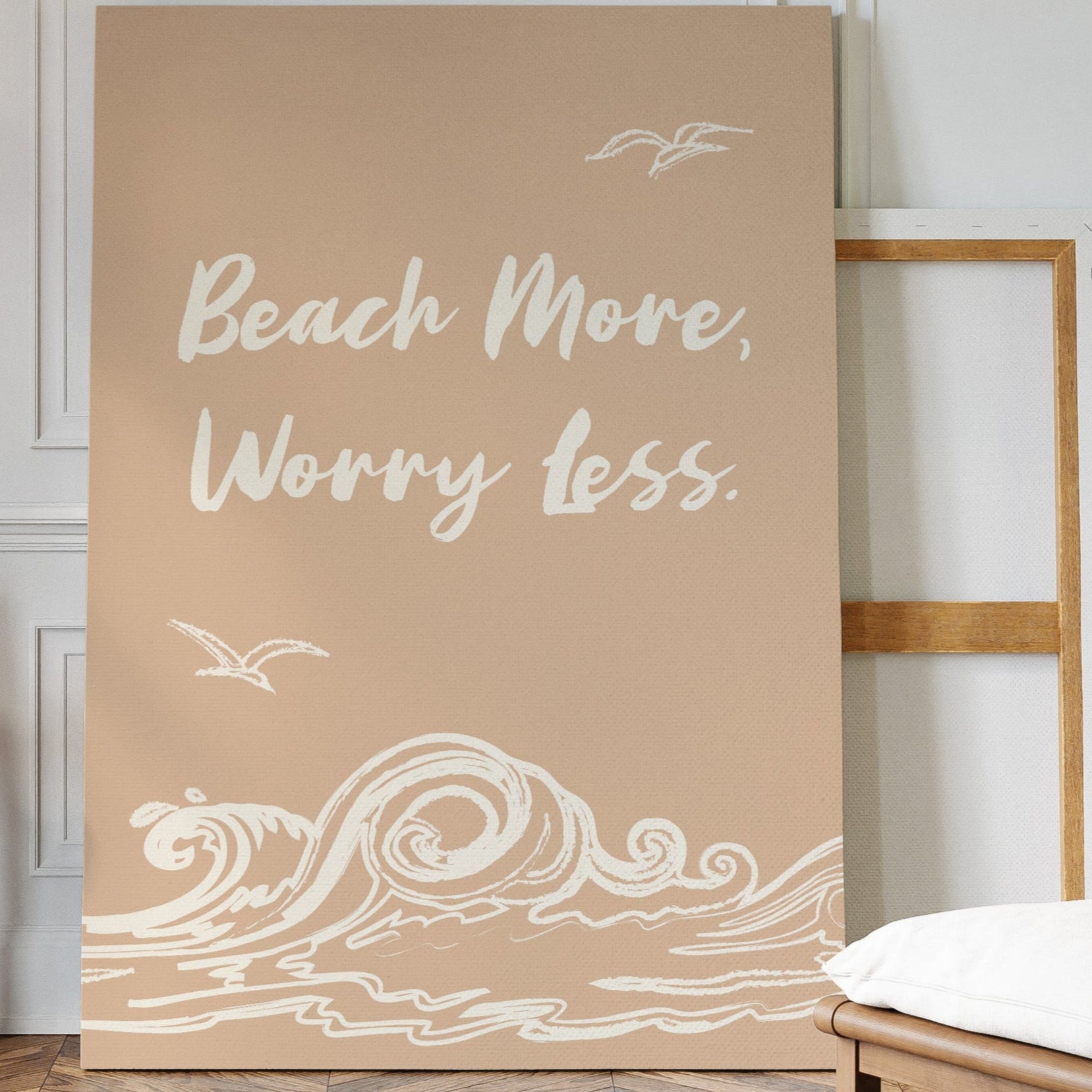 Gentle waves sketch their wisdom across warm sand, while seabirds trace lazy circles in a rose-gold sky. This piece from our Contemporary collection captures the laid-back philosophy of coastal living through minimalist design. White brushstrokes dance against a soothing nude backdrop, creating a rhythmic pattern that mirrors the ocean's endless motion. The simple yet profound message speaks to anyone seeking balance between life's responsibilities and simple pleasures. Perfect for bringing a sense of calm to a home office or bedroom sanctuary, where its peaceful presence can serve as a daily reminder to pause and breathe. Let this piece be your invitation to embrace life's simpler moments.