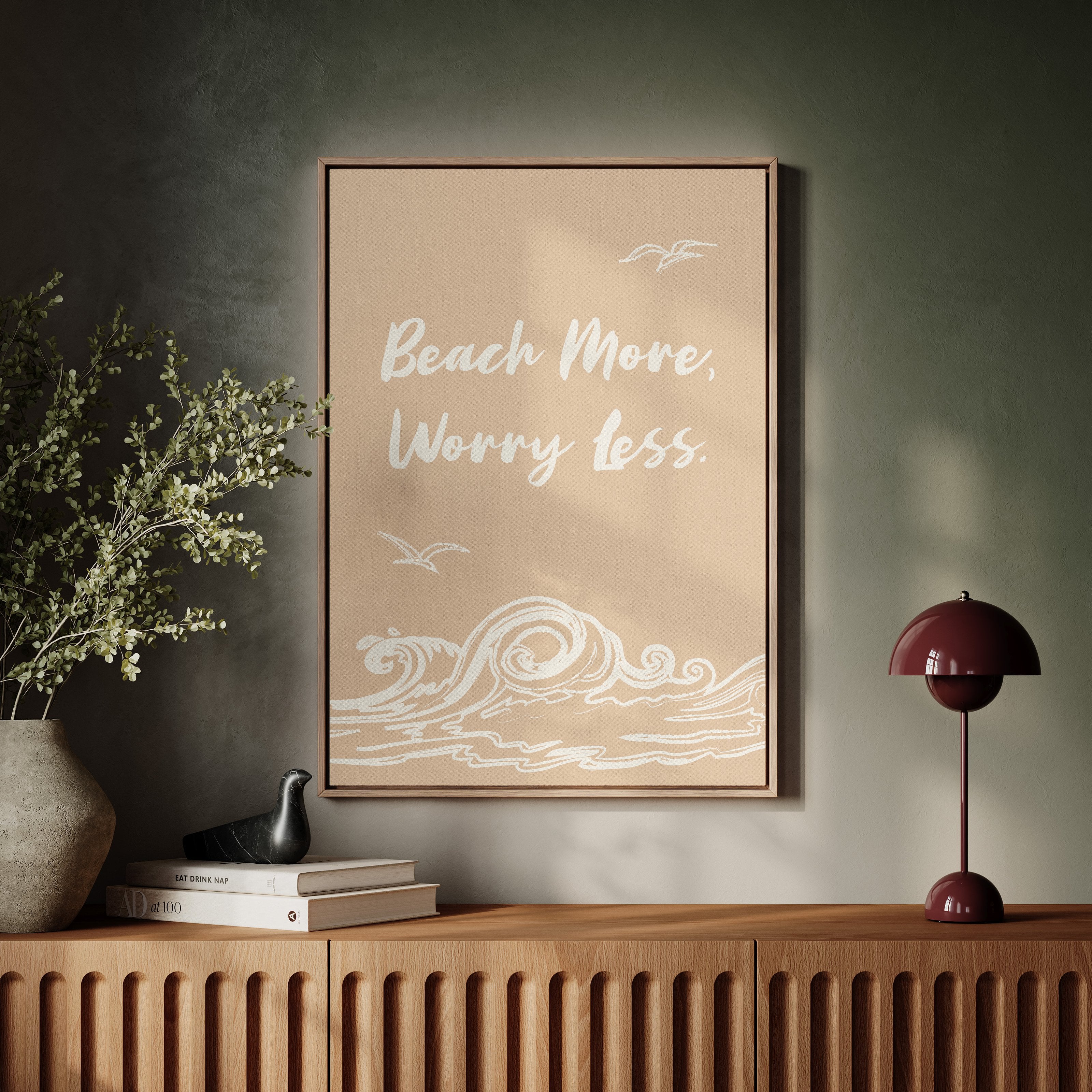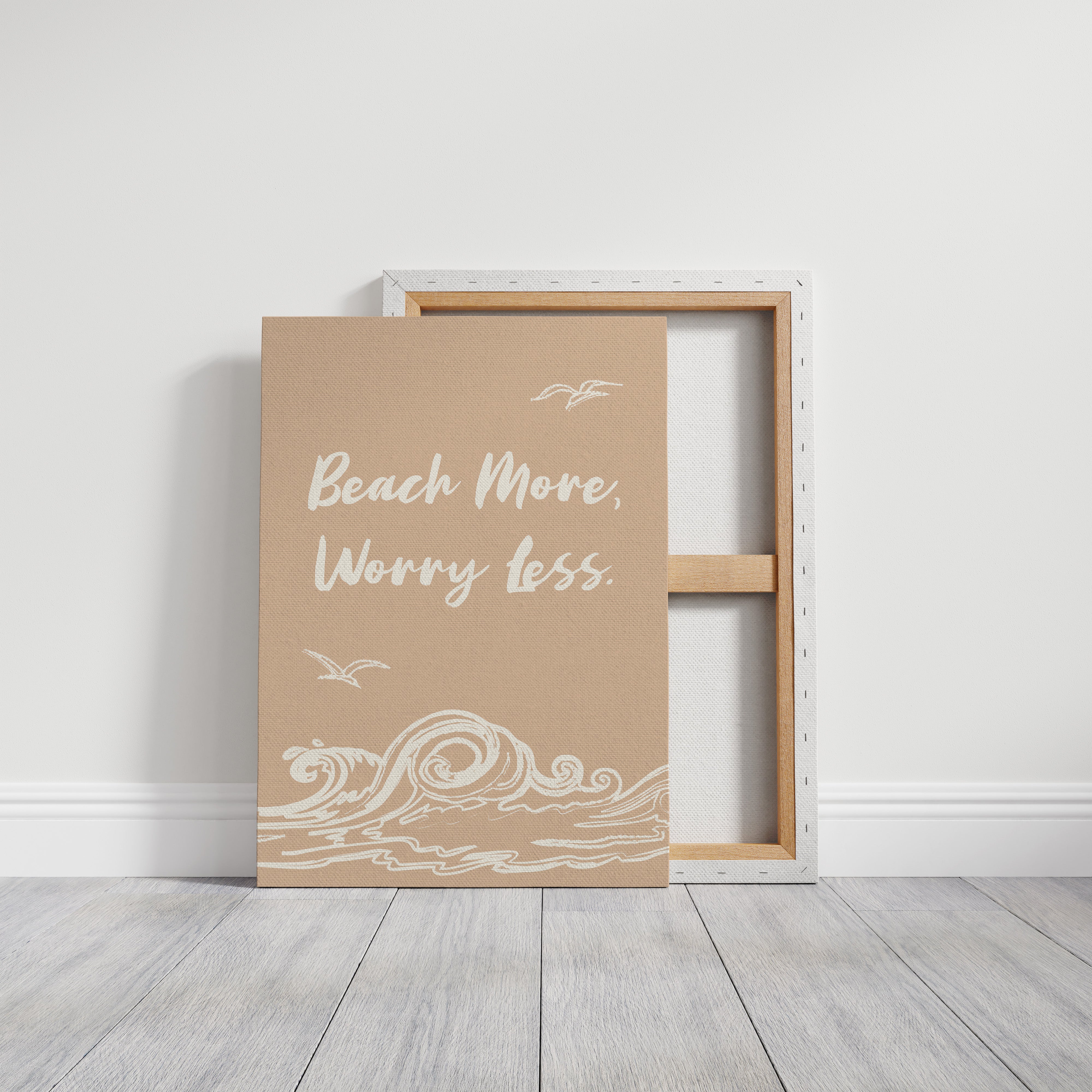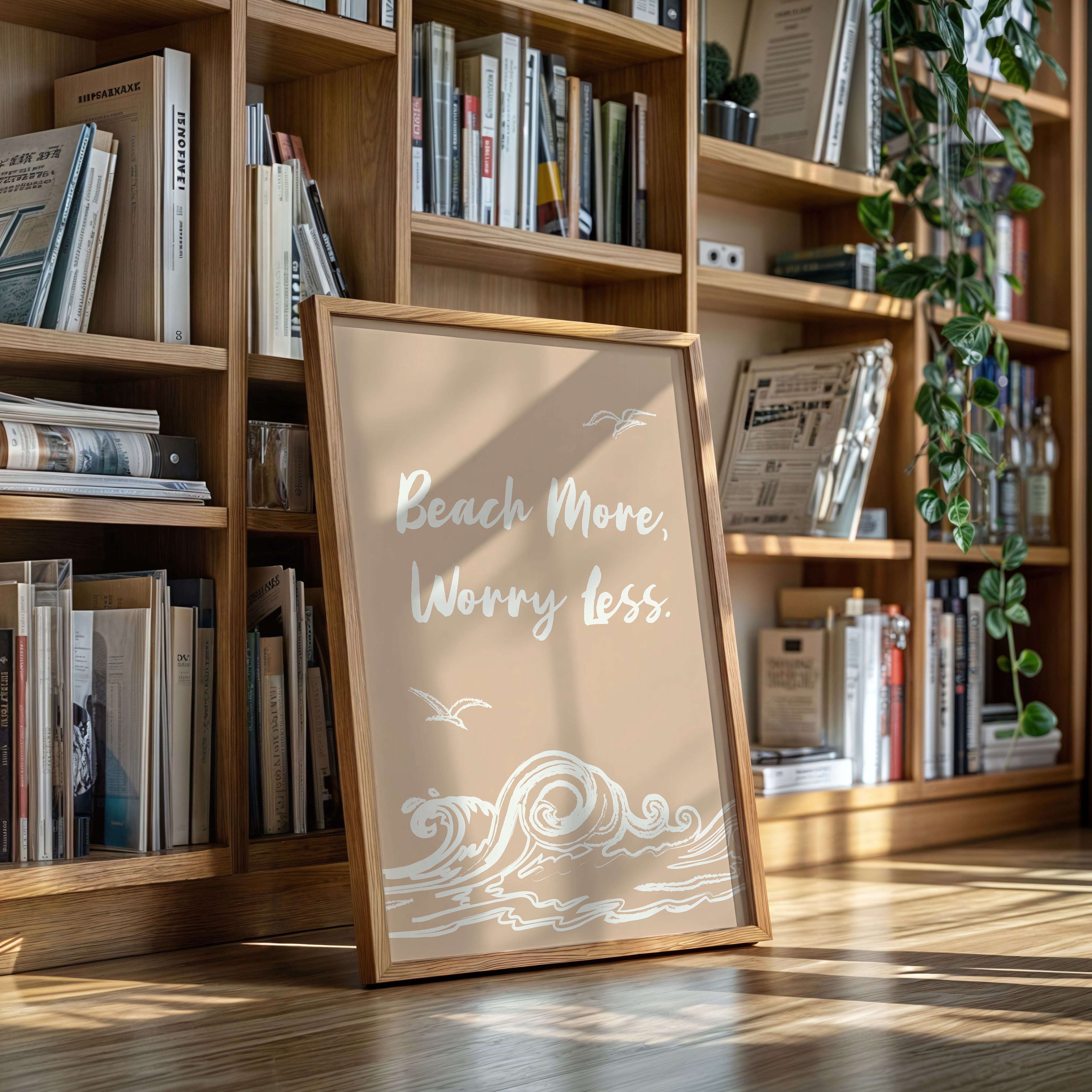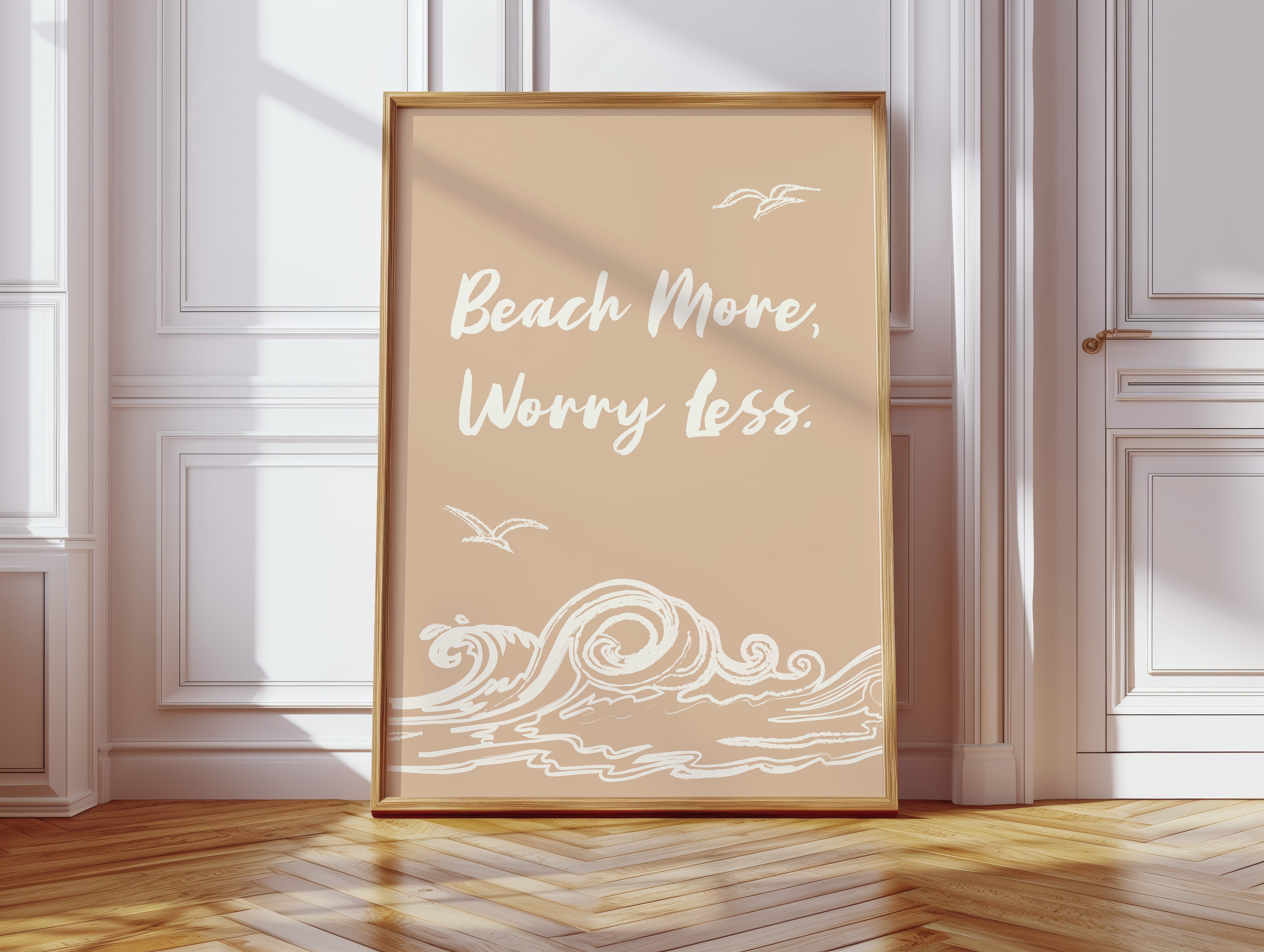 Gentle waves sketch their wisdom across warm sand, while seabirds trace lazy circles in a rose-gold sky. This piece from our Contemporary collection captures the laid-back philosophy of coastal living through minimalist design. White brushstrokes dance against a soothing nude backdrop, creating a rhythmic pattern that mirrors the ocean's endless motion. The simple yet profound message speaks to anyone seeking balance between life's responsibilities and simple pleasures. Perfect for bringing a sense of calm to a home office or bedroom sanctuary, where its peaceful presence can serve as a daily reminder to pause and breathe. Let this piece be your invitation to embrace life's simpler moments.