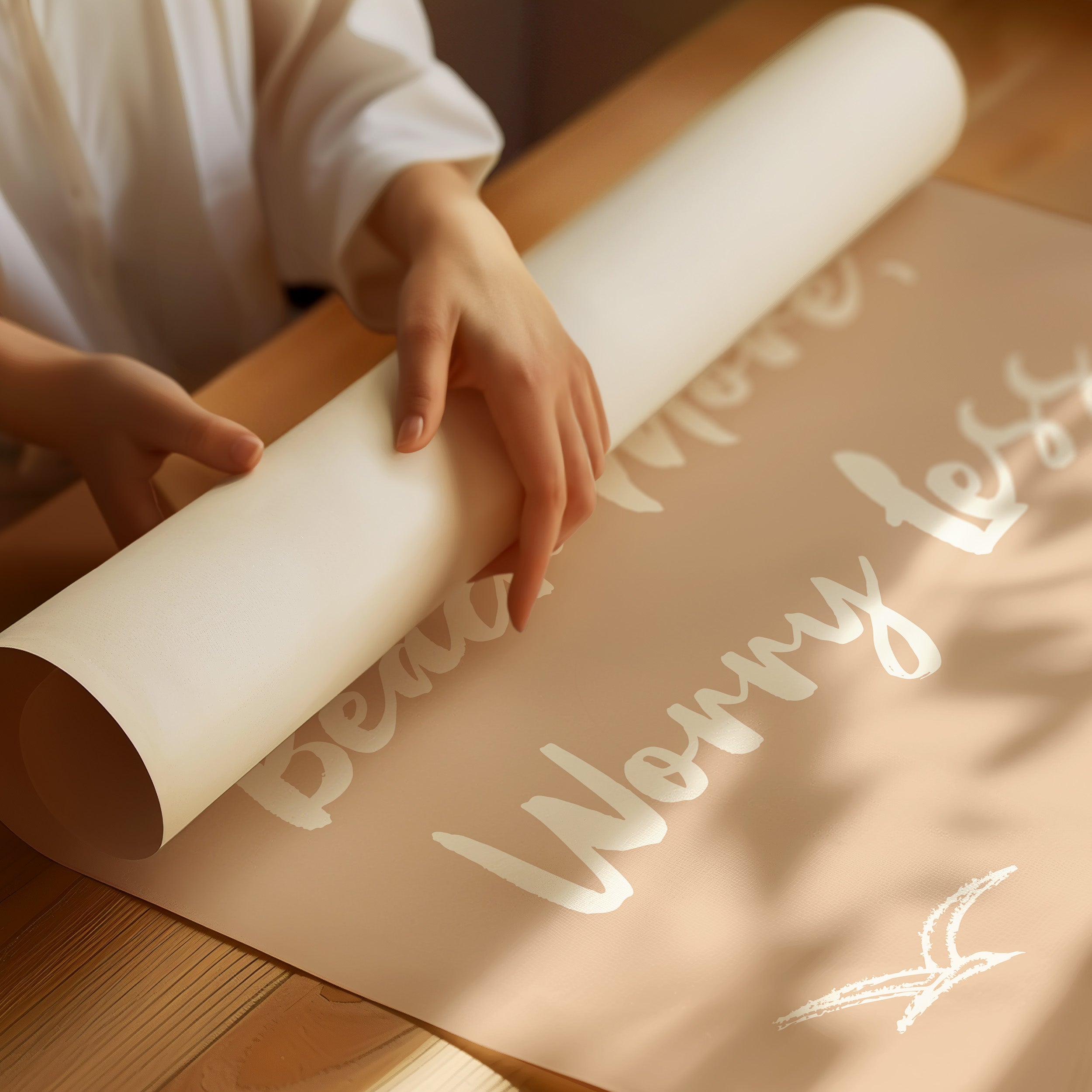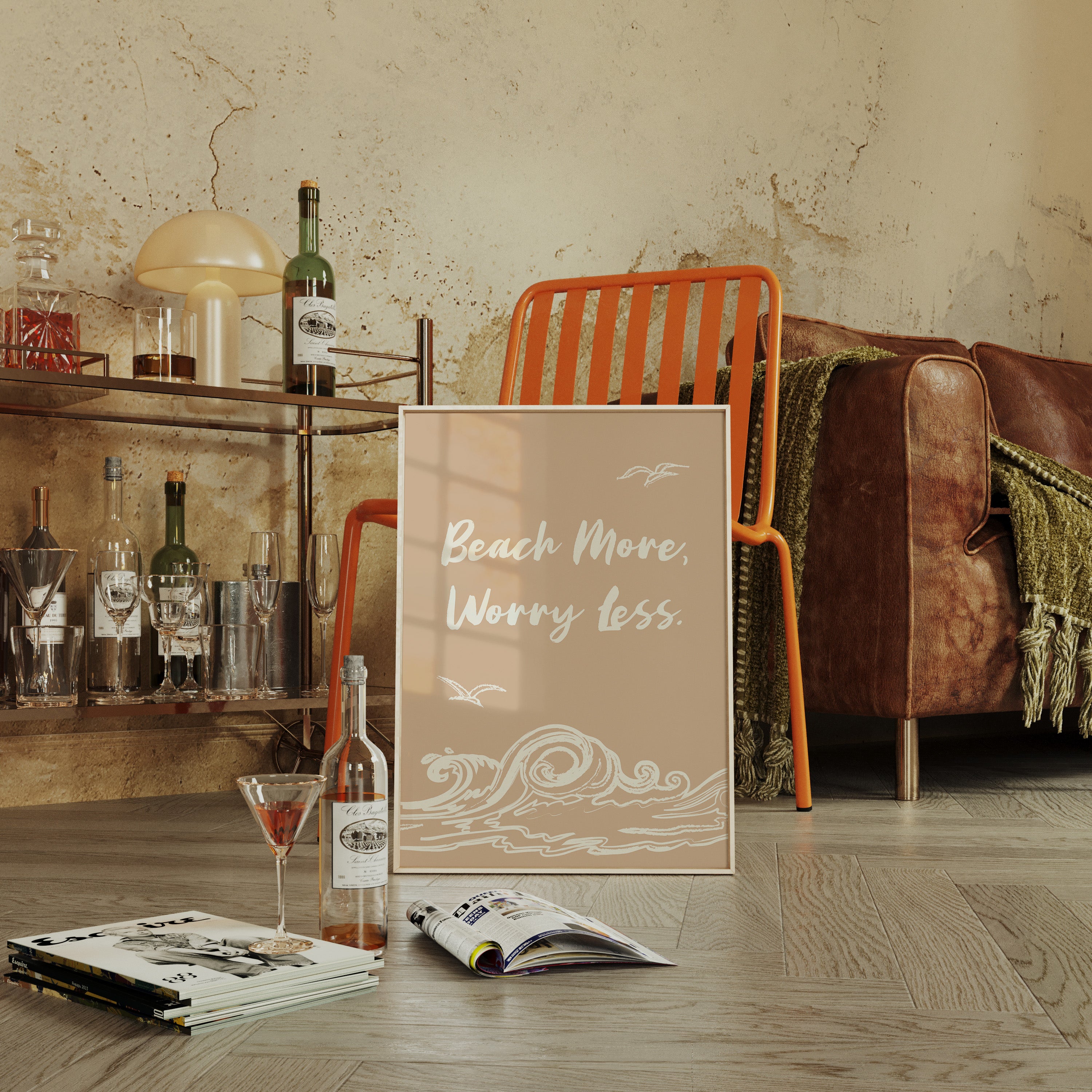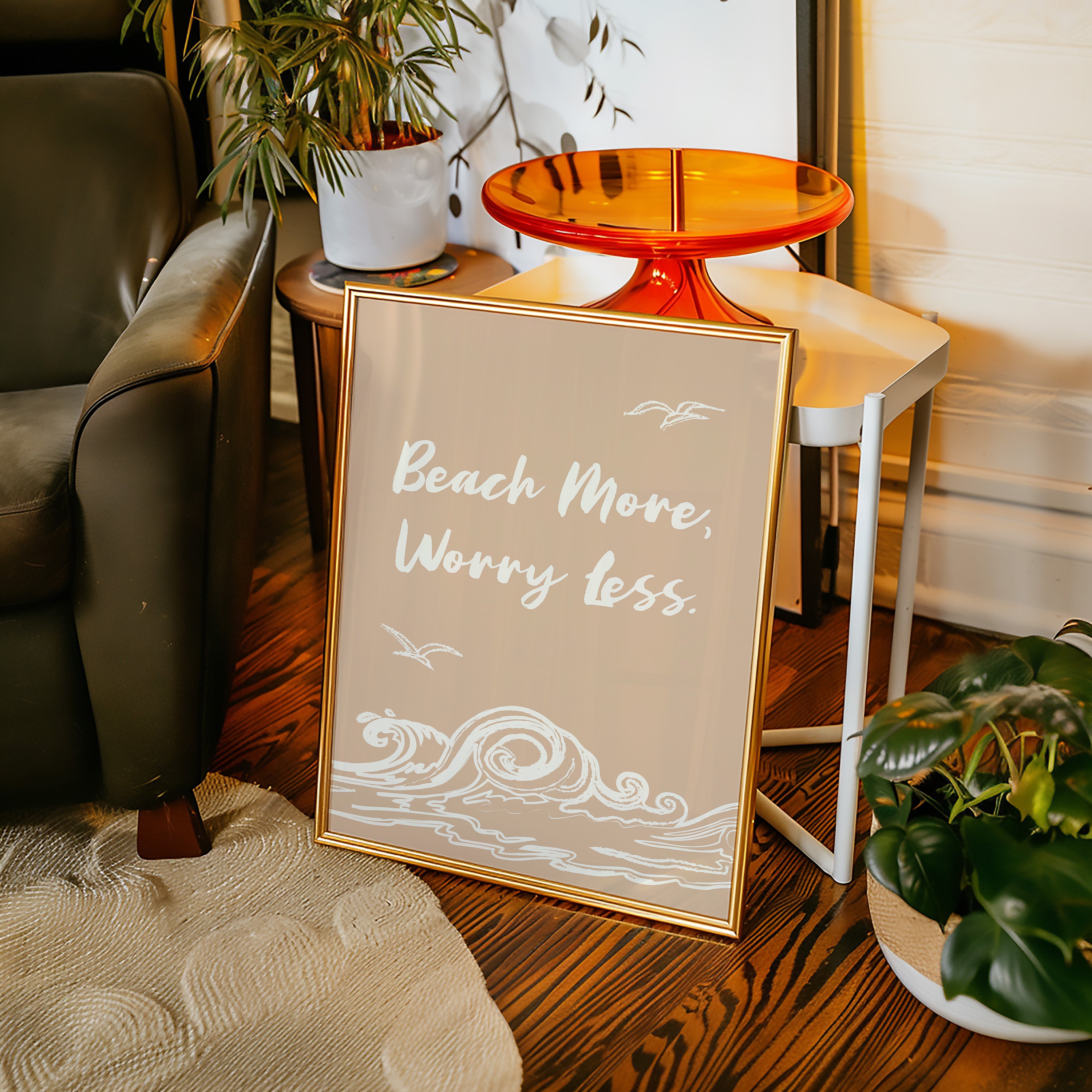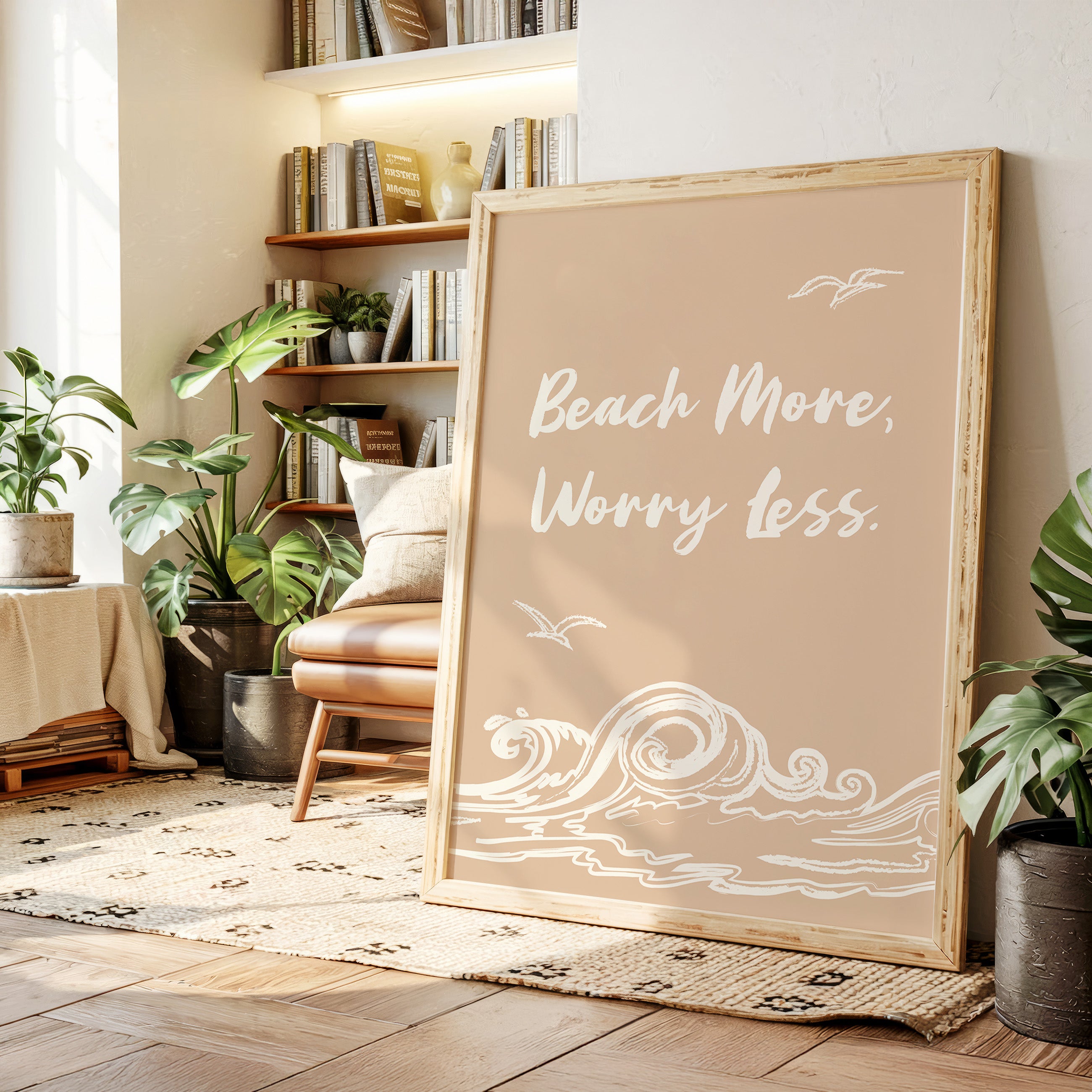 Gentle waves sketch their wisdom across warm sand, while seabirds trace lazy circles in a rose-gold sky. This piece from our Contemporary collection captures the laid-back philosophy of coastal living through minimalist design. White brushstrokes dance against a soothing nude backdrop, creating a rhythmic pattern that mirrors the ocean's endless motion. The simple yet profound message speaks to anyone seeking balance between life's responsibilities and simple pleasures. Perfect for bringing a sense of calm to a home office or bedroom sanctuary, where its peaceful presence can serve as a daily reminder to pause and breathe. Let this piece be your invitation to embrace life's simpler moments.
