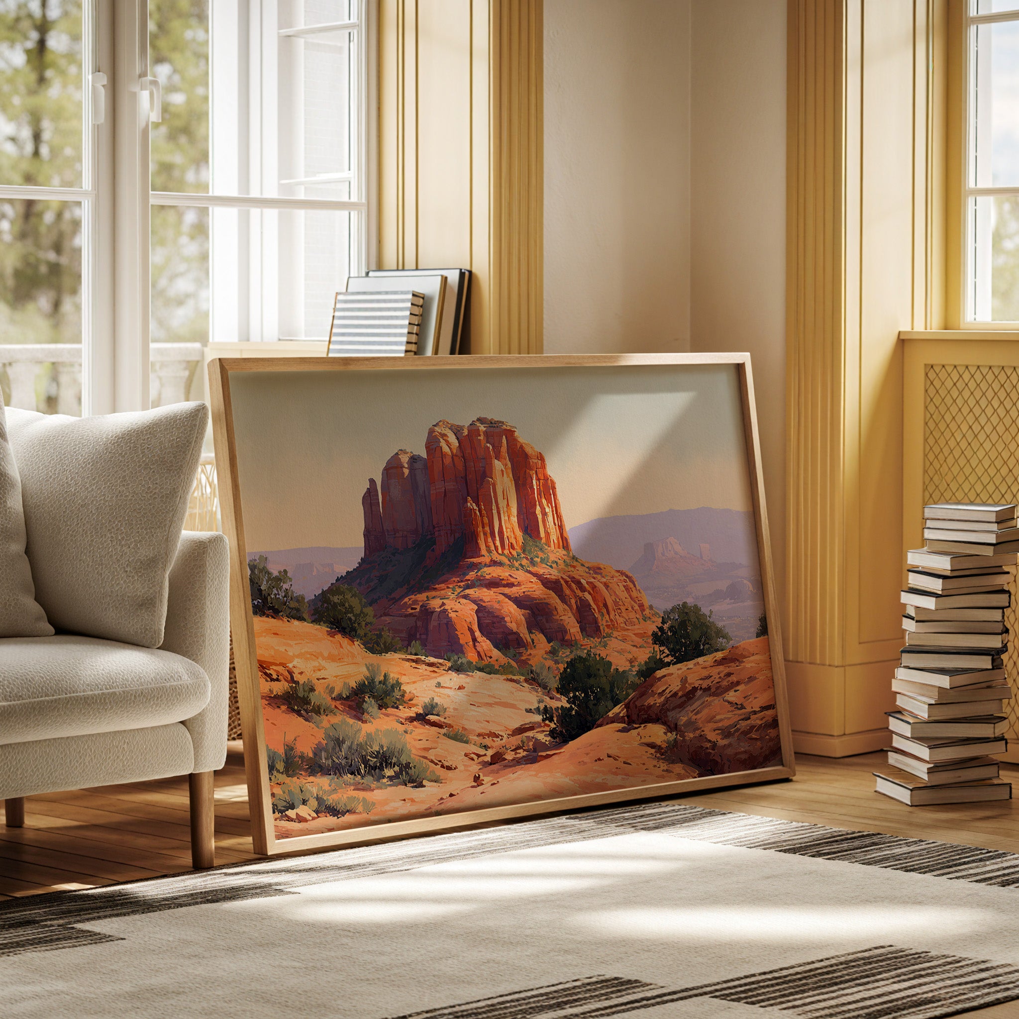 Morning light spills across ancient red rocks, painting the desert in hues of amber and rose. The massive sandstone formation stands like a sentinel against the pale sky, its weathered faces telling stories of millennia gone by. Delicate sage and juniper dot the foreground, their muted greens providing contrast to the bold orange cliffs that dominate the landscape. This piece captures the raw majesty of the American Southwest, where time moves at the pace of erosion and light dances across geological masterpieces. Perfect for spaces seeking to bring the dramatic energy of desert landscapes indoors, especially in great rooms or offices where its commanding presence can serve as a focal point.
